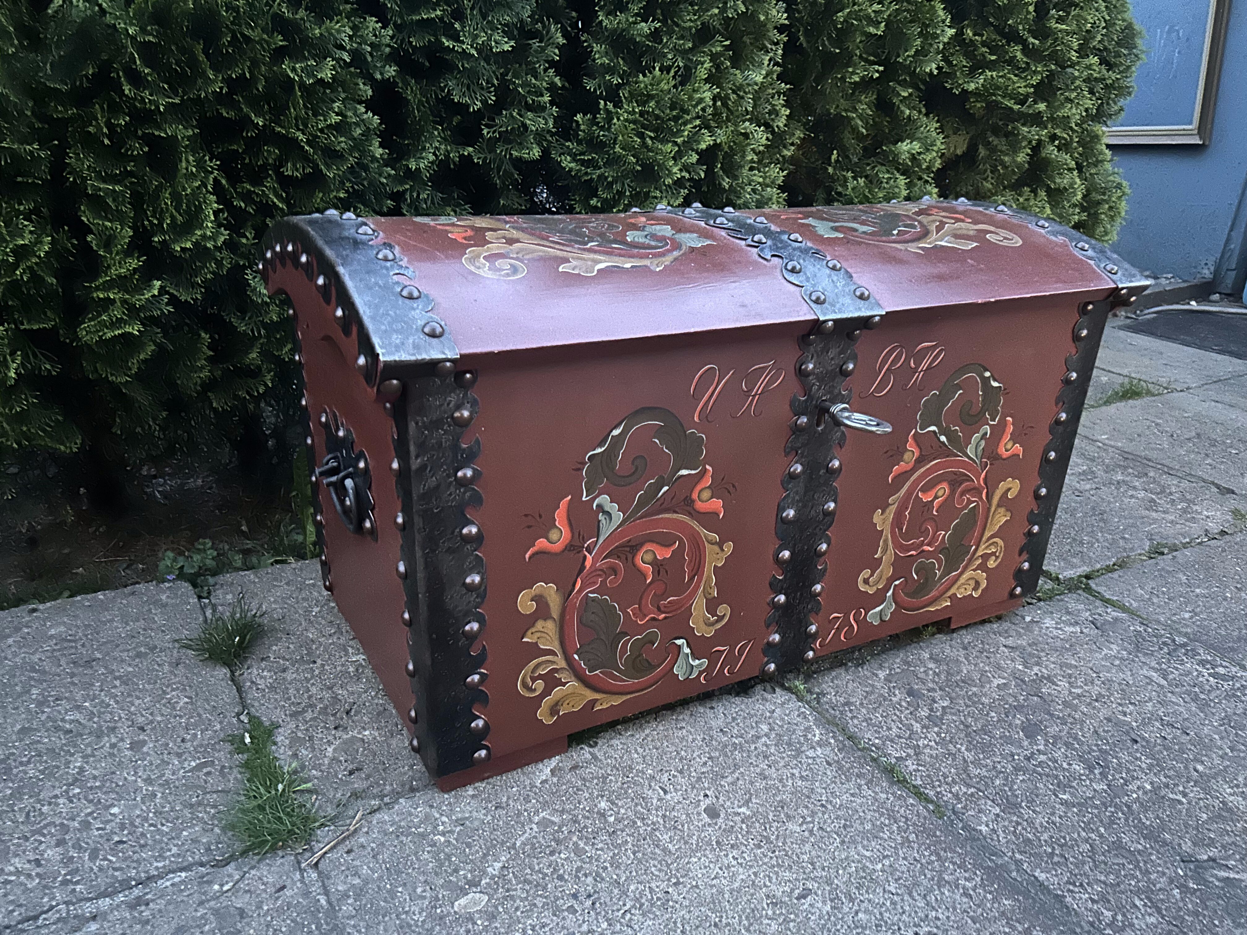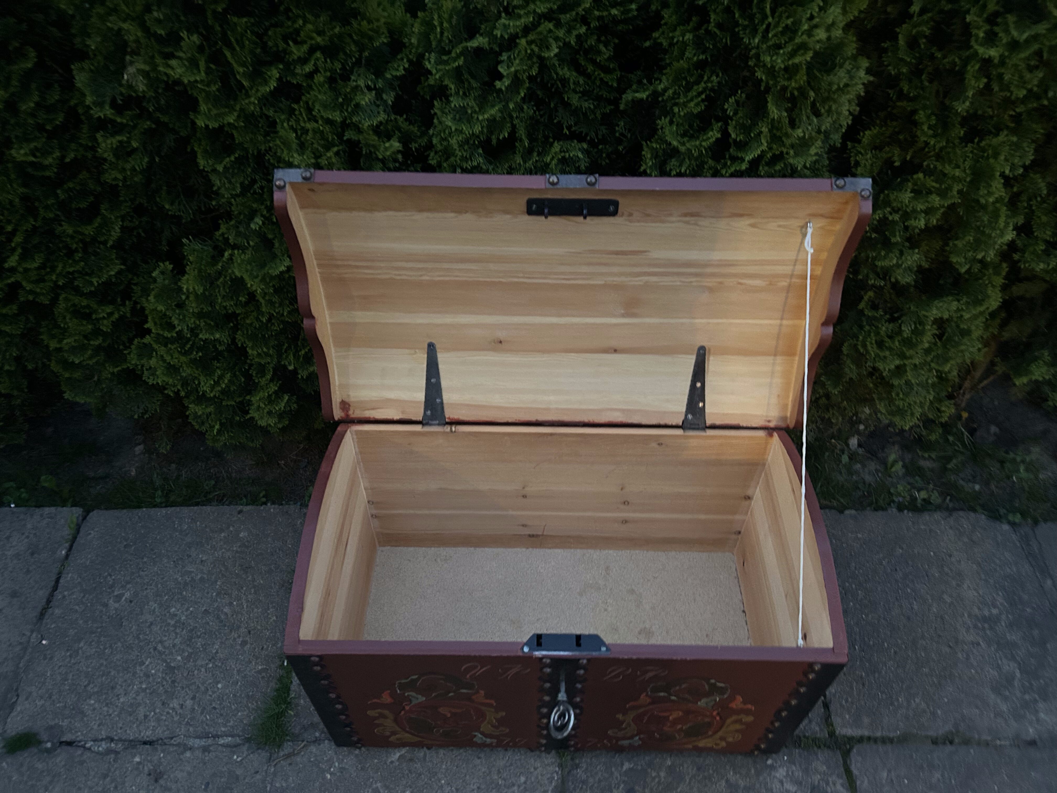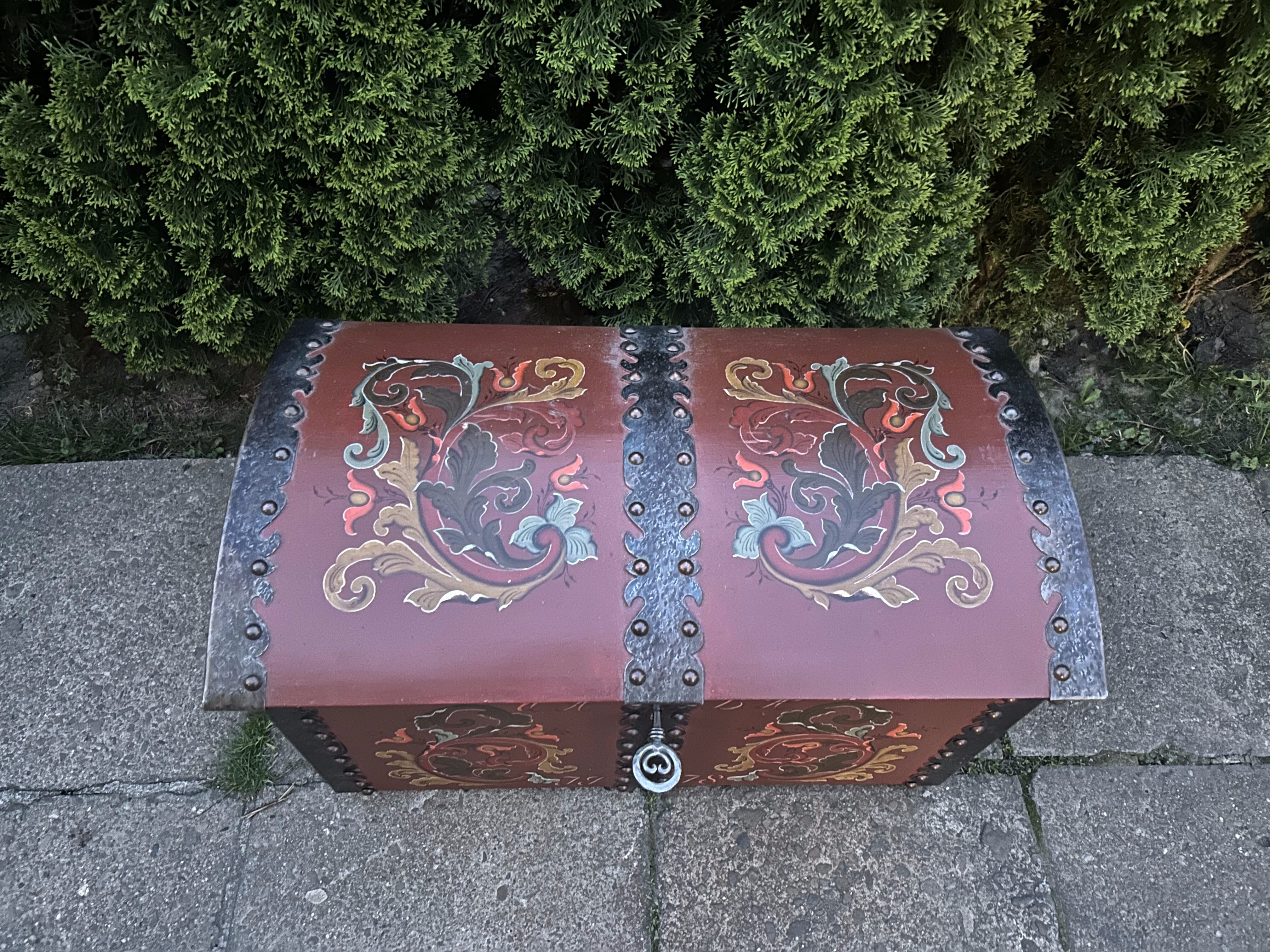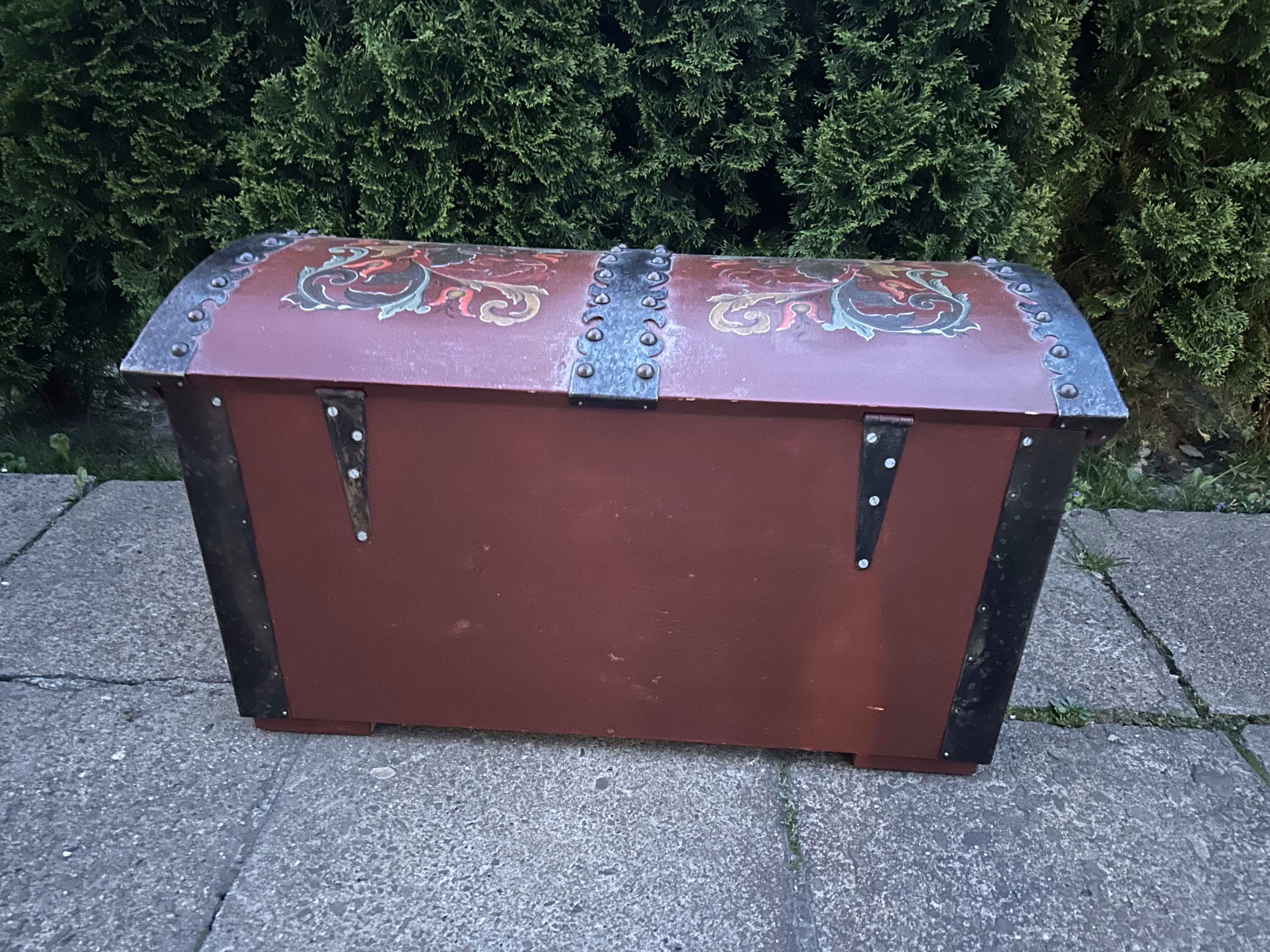 Wyjątkowy kufer drewniany utrzymany w tradycyjnym regionalnym stylu – ręcznie malowany wzór floralny, bordowa kolorystyka oraz solidne okucia i ćwieki tworzą unikalną całość o historycznym charakterze. Sygnowany rokiem 1978, wyposażony w sprawny zamek i oryginalny klucz. Może pełnić funkcję praktycznego schowka lub być efektowną ozdobą w domu w stylu rustykalnym, góralskim lub skandynawskim.