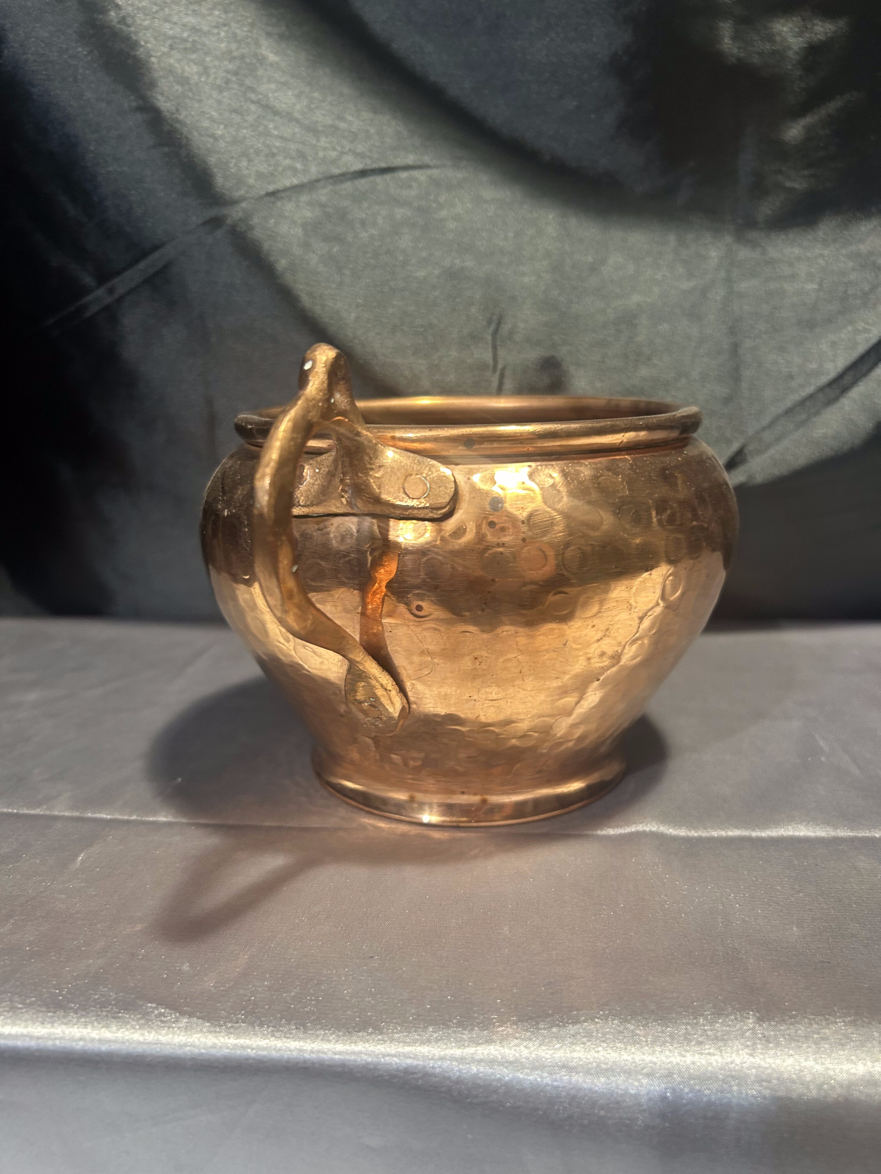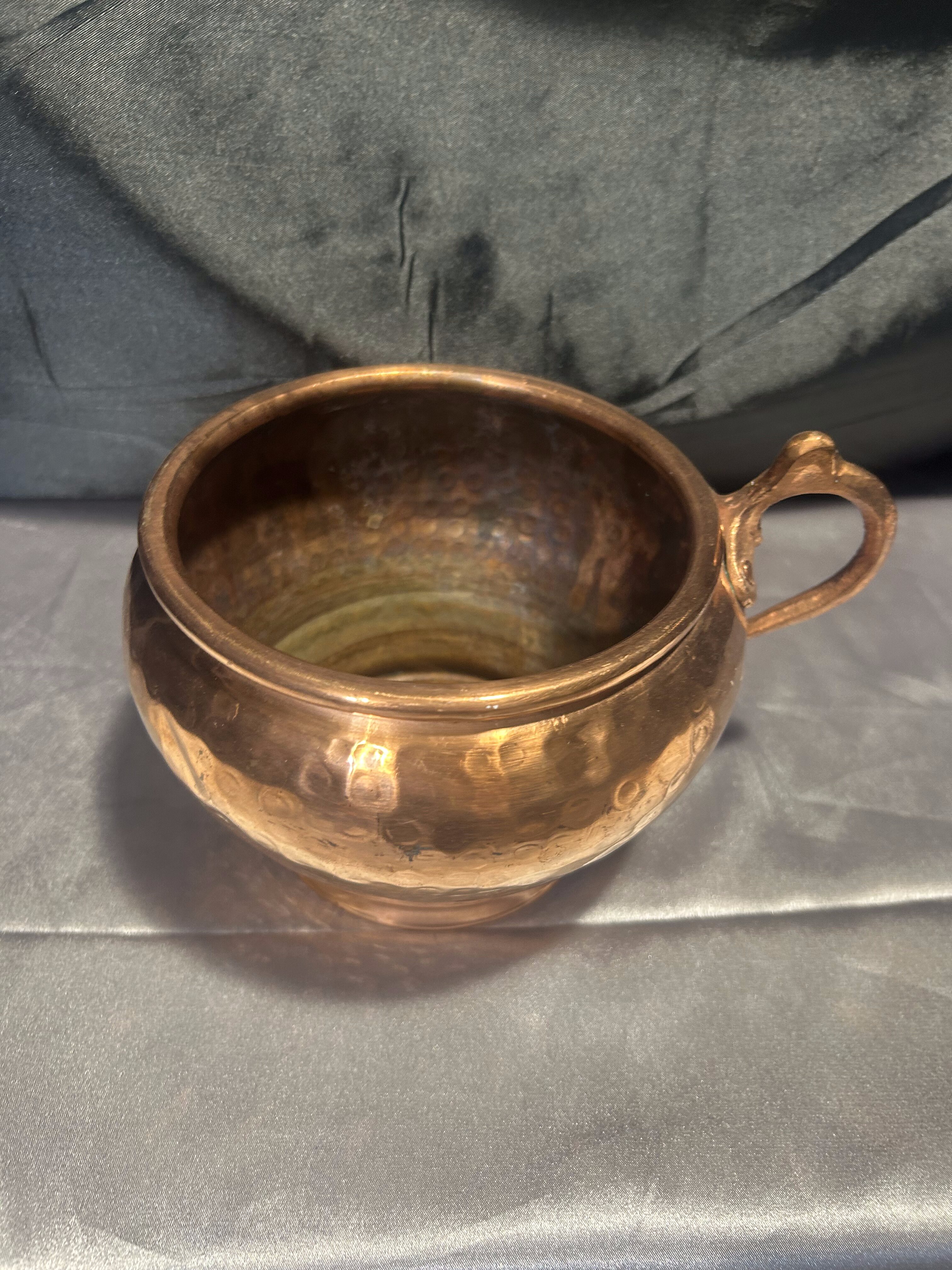 Na sprzedaż dekoracyjny kwietnik wykonany z miedzi, o oryginalnym kształcie przypominającym kubek z jednym uchem. Powierzchnia zdobiona klasycznym młotkowaniem, które dodaje mu surowego uroku i rękodzielniczego charakteru. Pięknie prezentuje się jako osłonka na kwiaty lub samodzielna dekoracja.