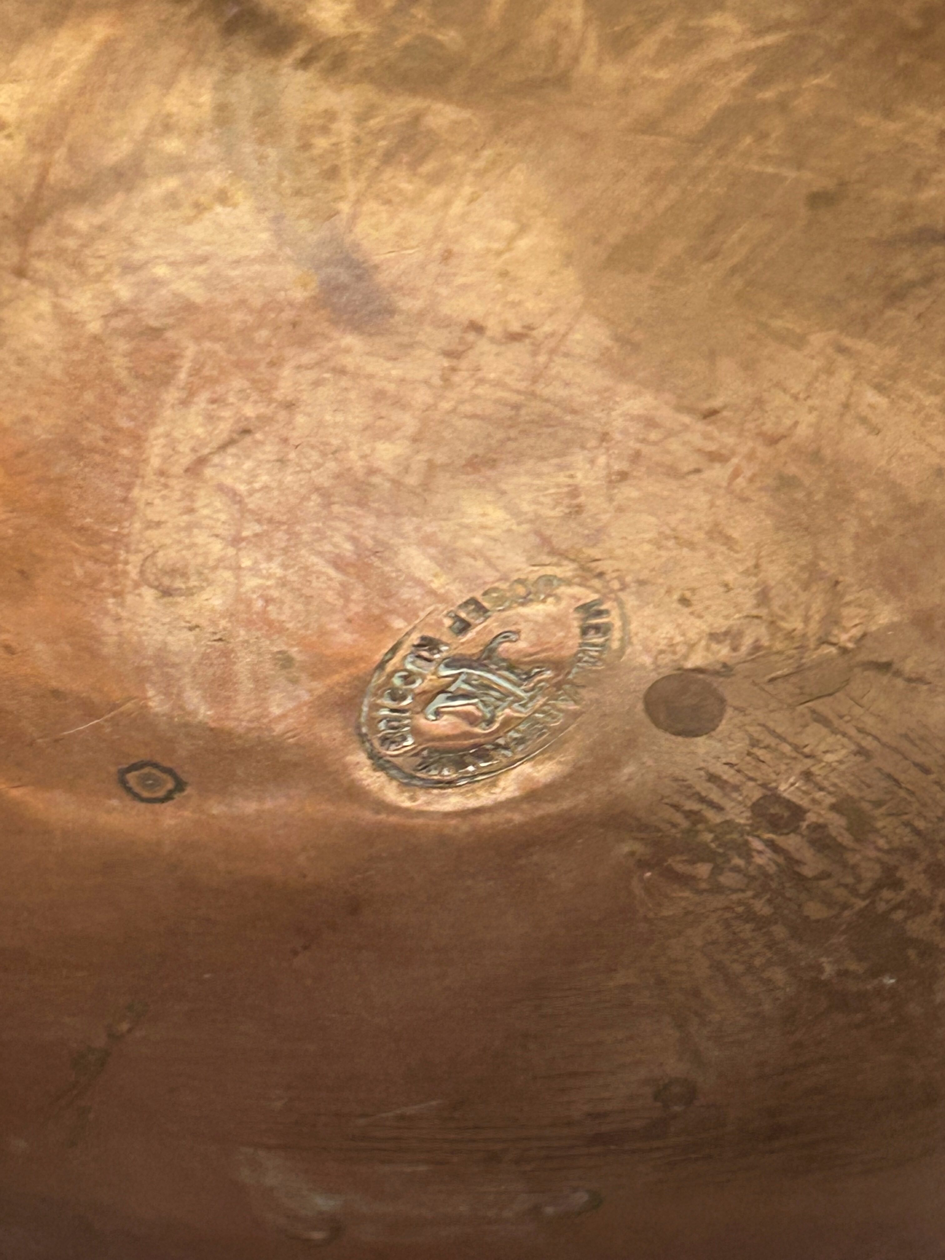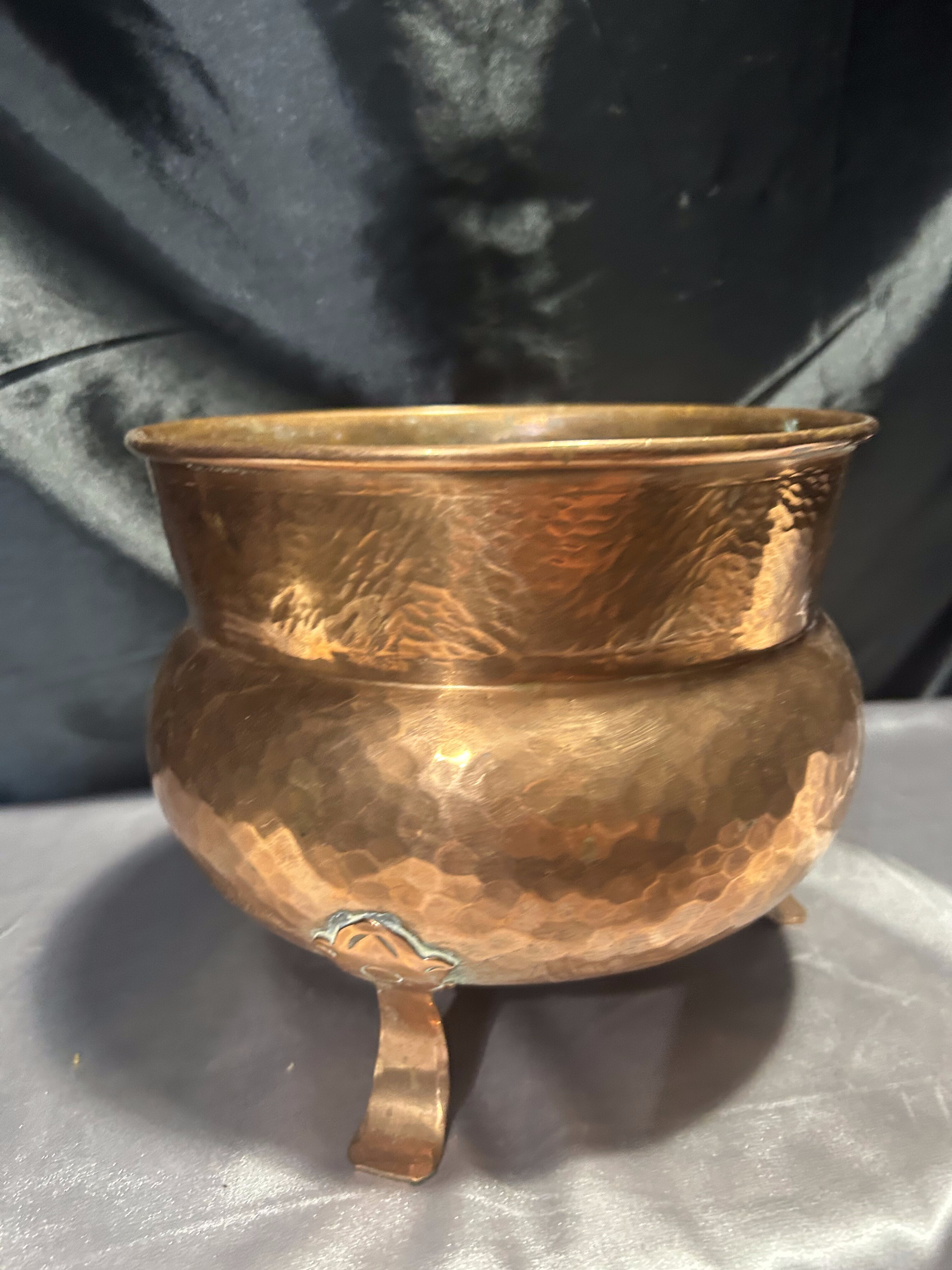 Stylowy kwietnik z miedzi, wykonany z dbałością o detale, osadzony na trzech elegancko wygiętych nogach. Całość wykończona młotkowaną fakturą, co dodaje mu wyjątkowego charakteru i szlachetnego połysku. Sygnowany egzemplarz, który będzie wspaniałym uzupełnieniem wnętrza w stylu vintage, rustykalnym lub klasycznym.