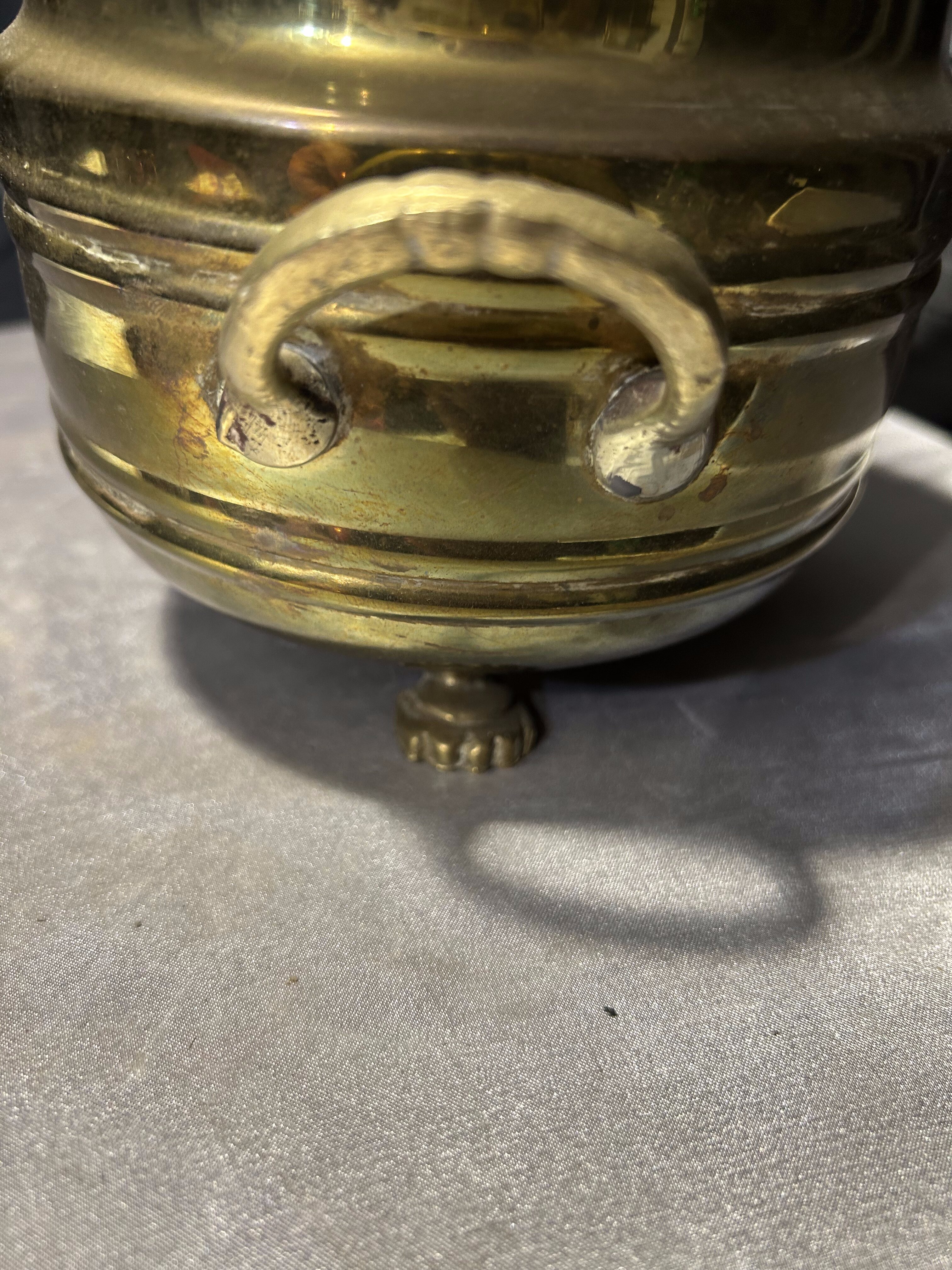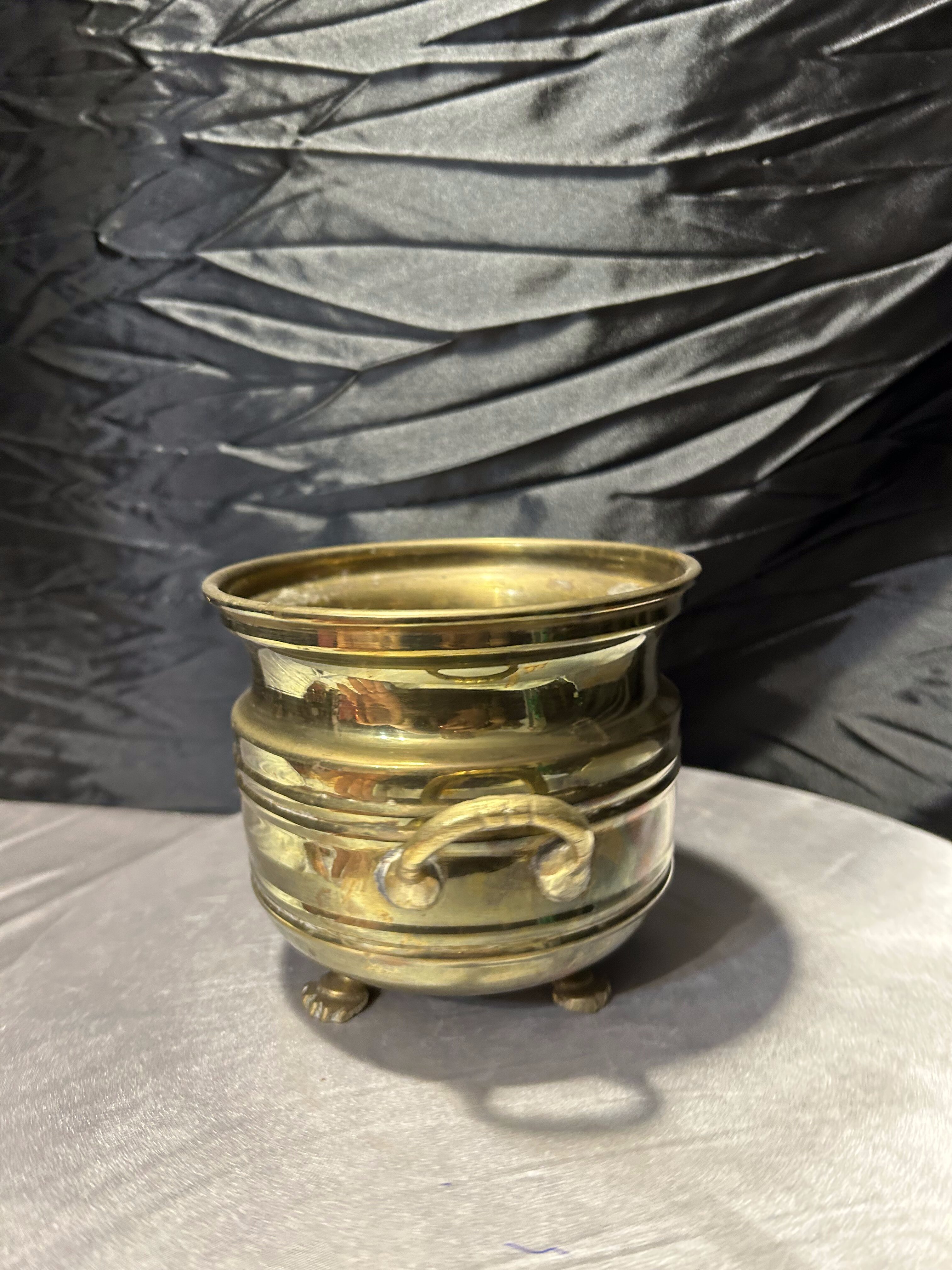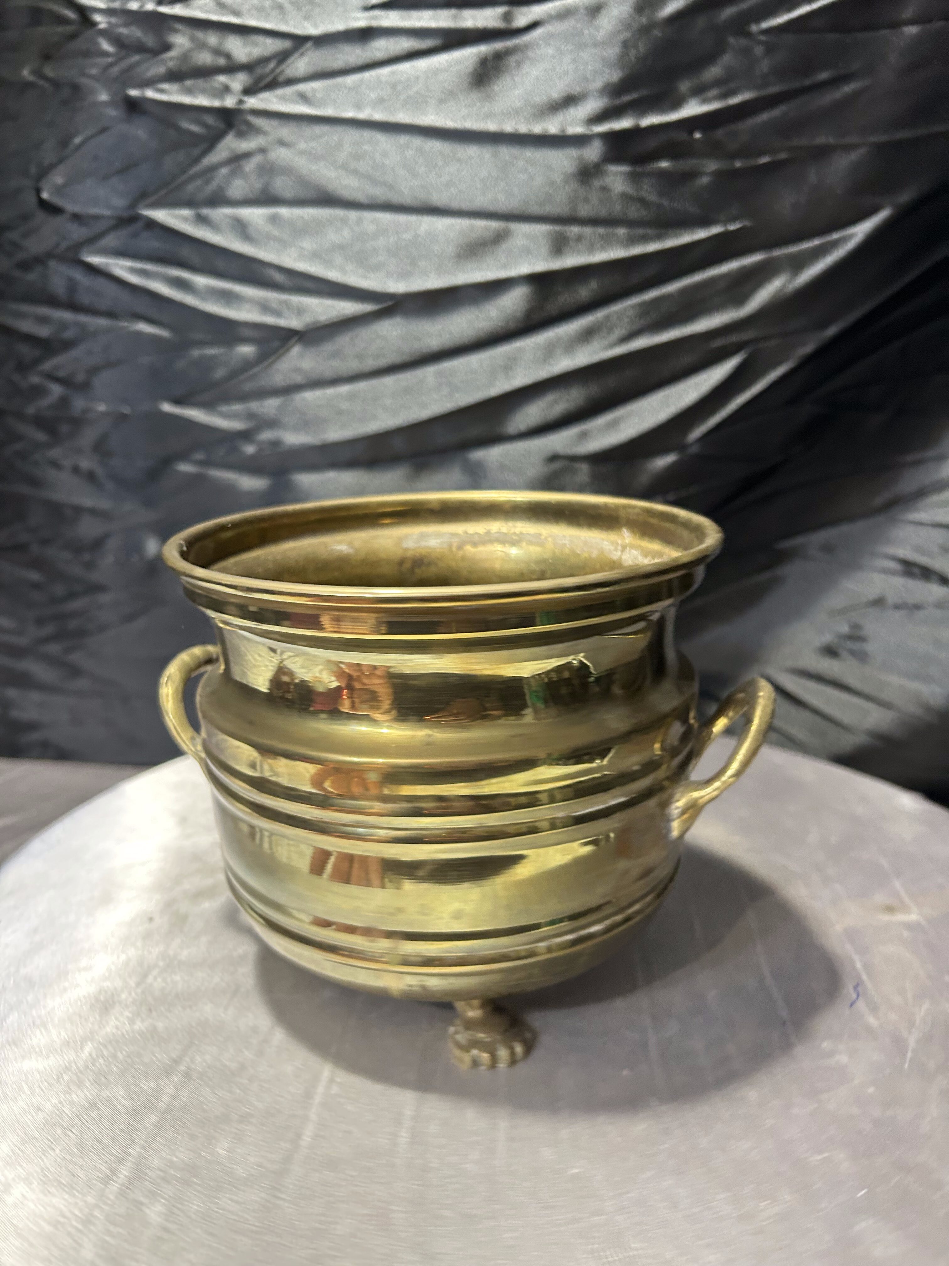 Elegancki kwietnik wykonany z mosiądzu w klasycznej, dekoracyjnej formie. Naczynie osadzone jest na ozdobnych nóżkach, a po bokach posiada dwa stylowe uchwyty, które nadają całości charakteru dawnych naczyń dekoracyjnych.