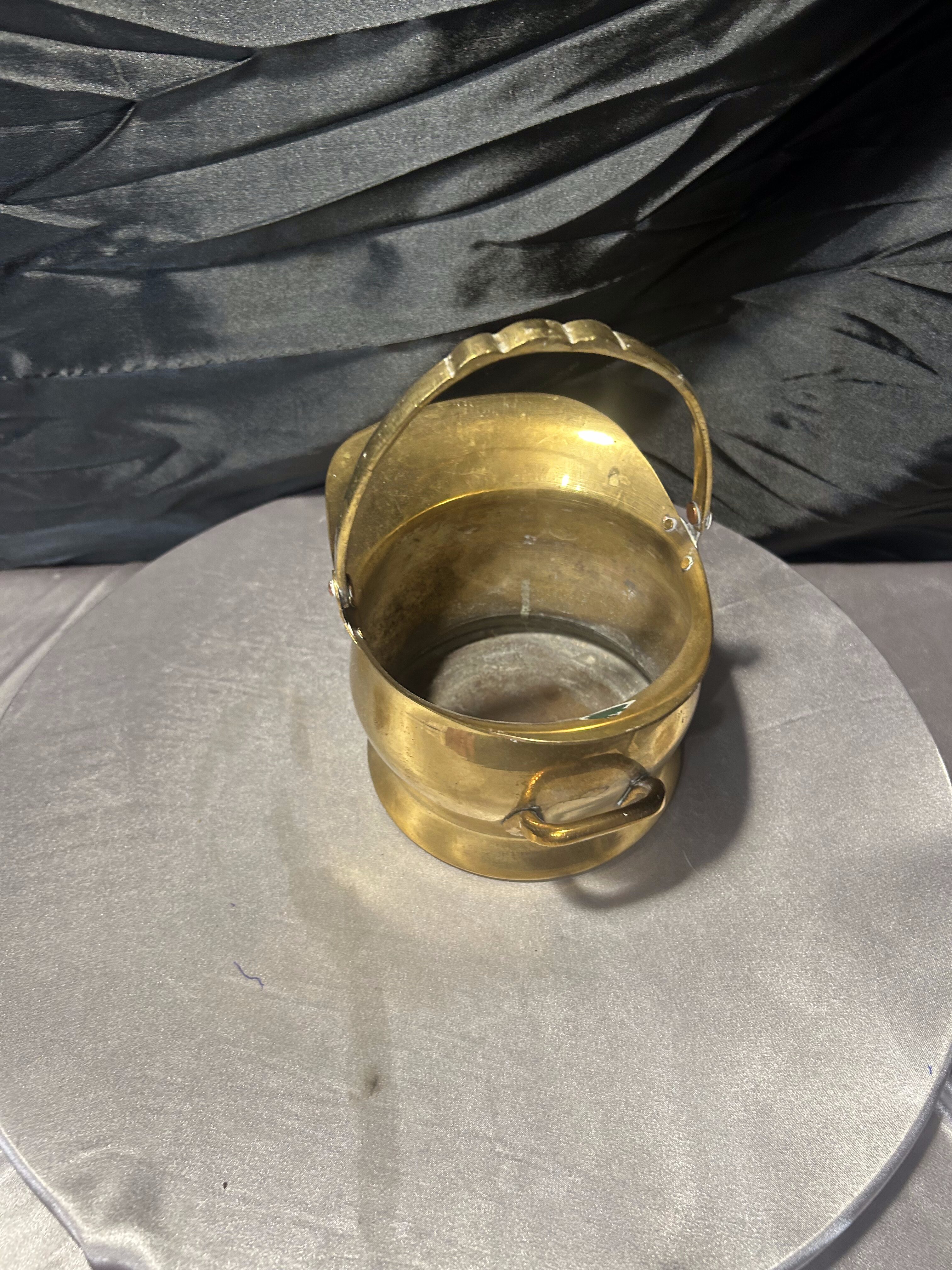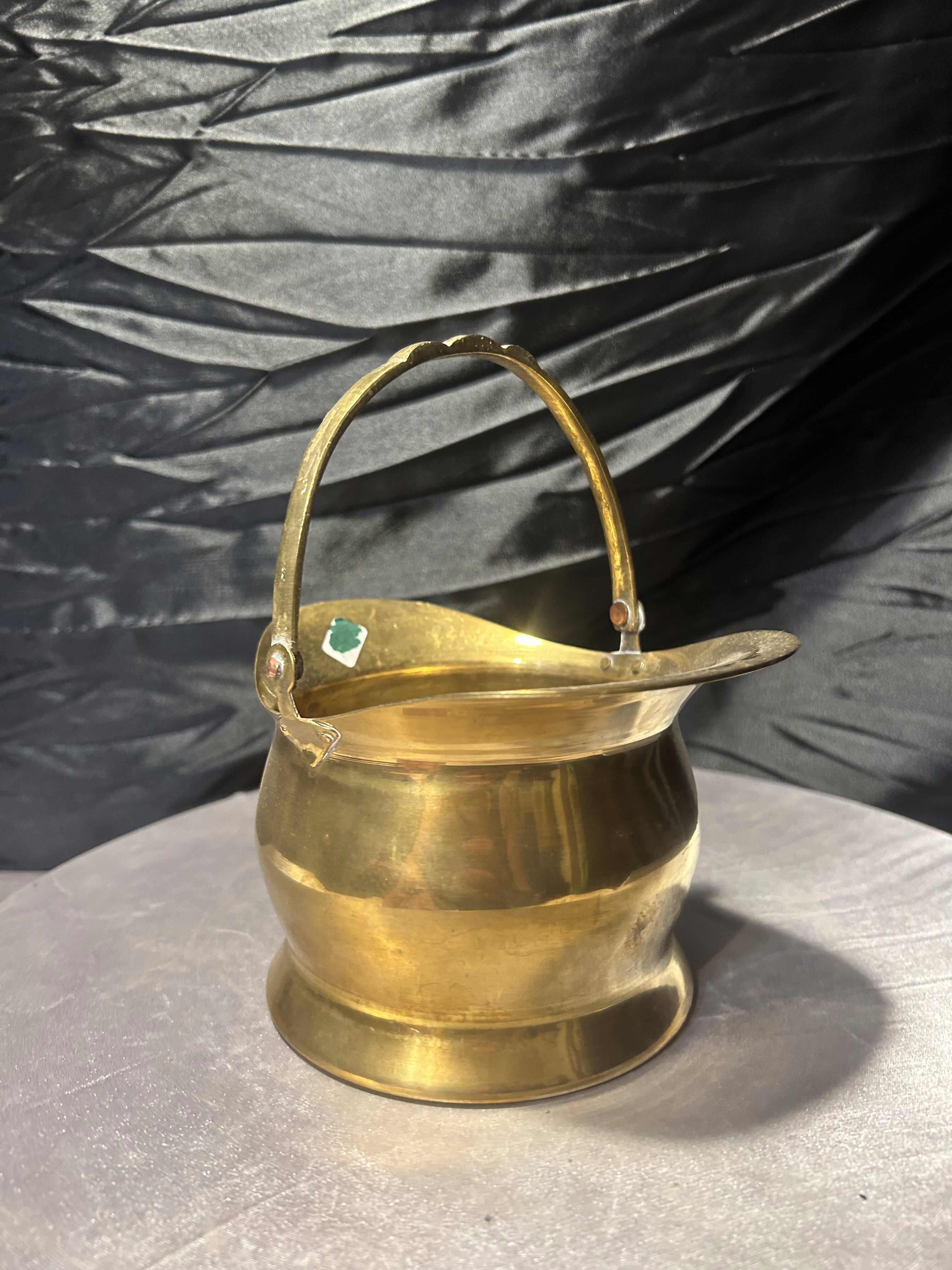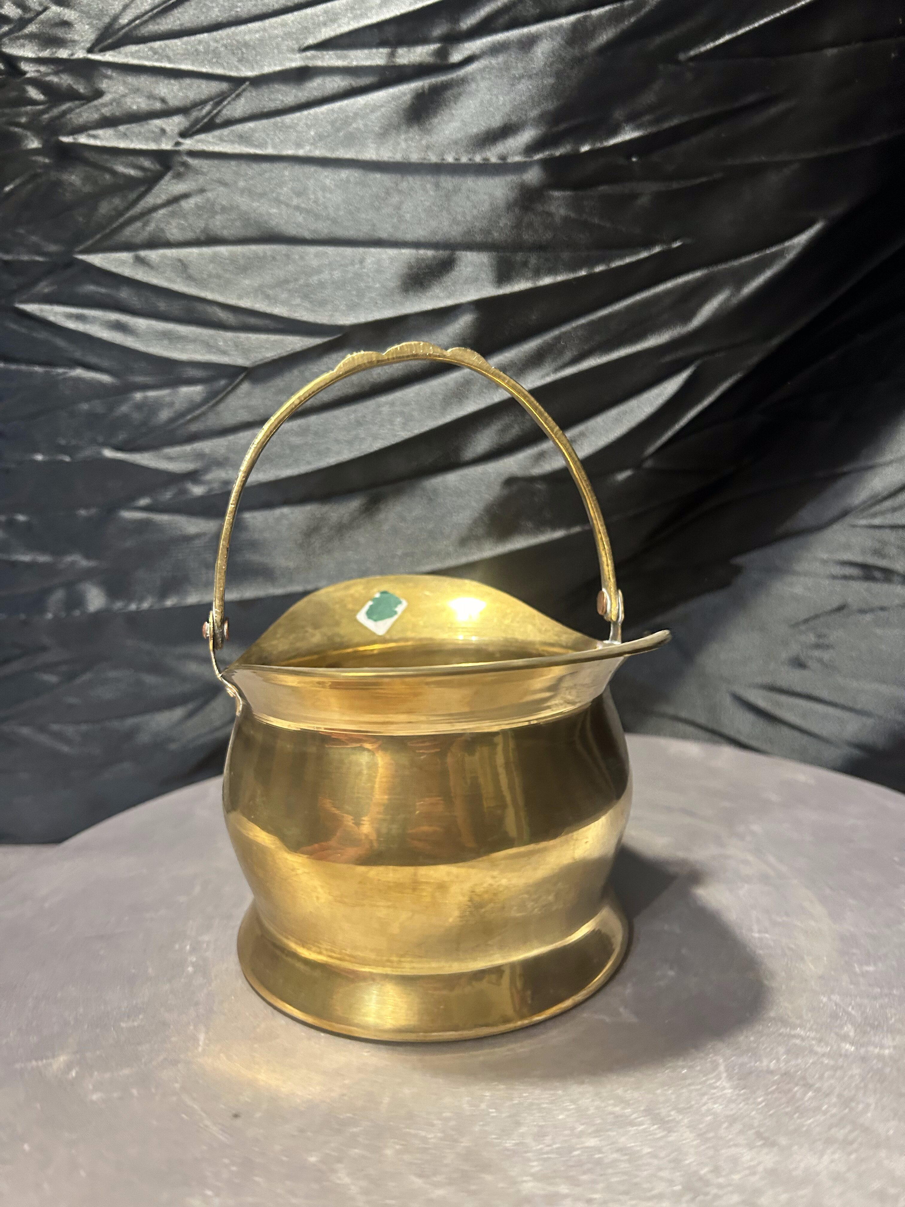 Charakterystyczny kształt z wywiniętym rantem oraz ruchomą rączką nadaje całości eleganckiego, vintage charakteru. Ciepły odcień mosiądzu oraz naturalna patyna metalu podkreślają autentyczność przedmiotu i jego dekoracyjny styl.