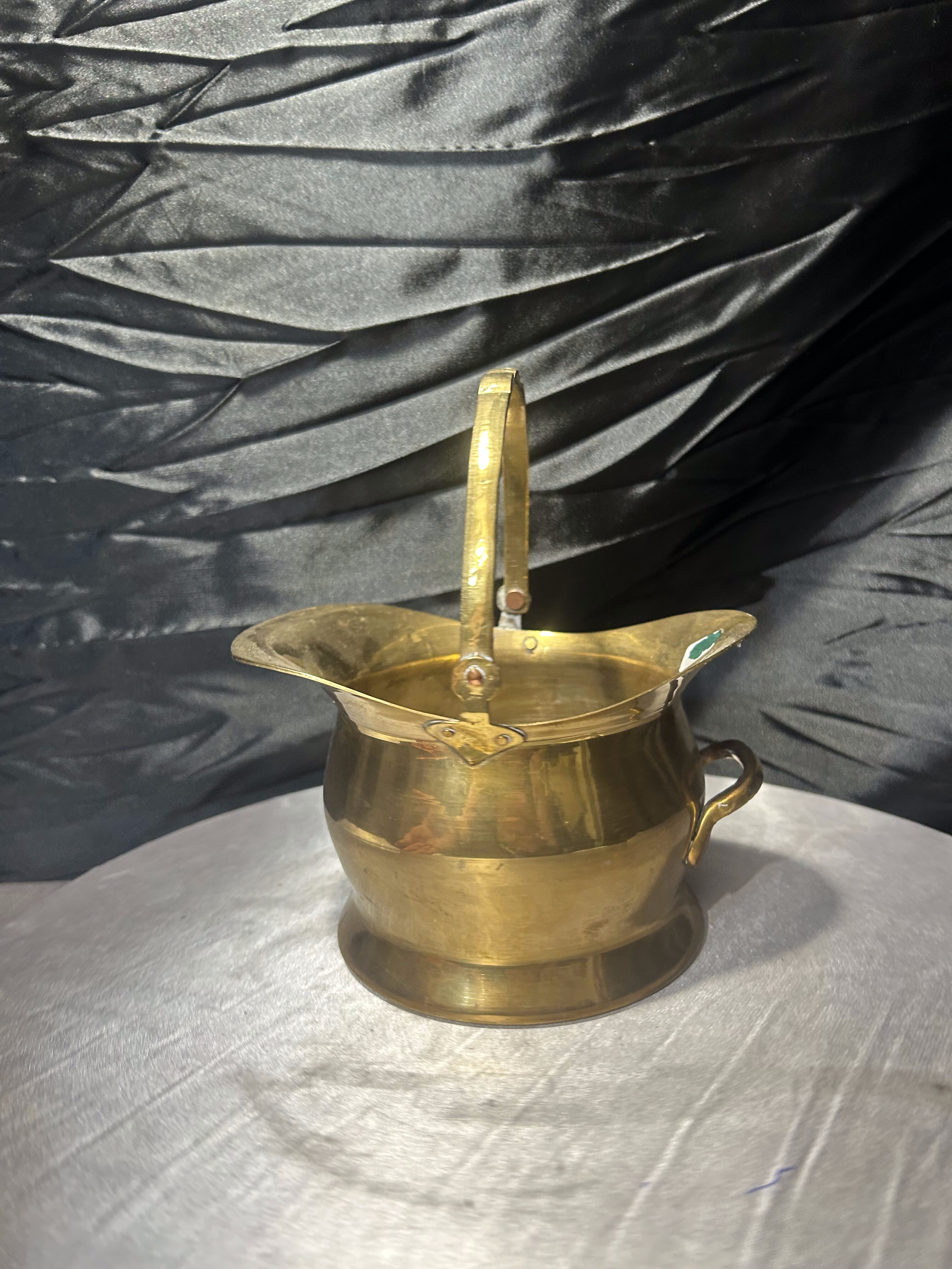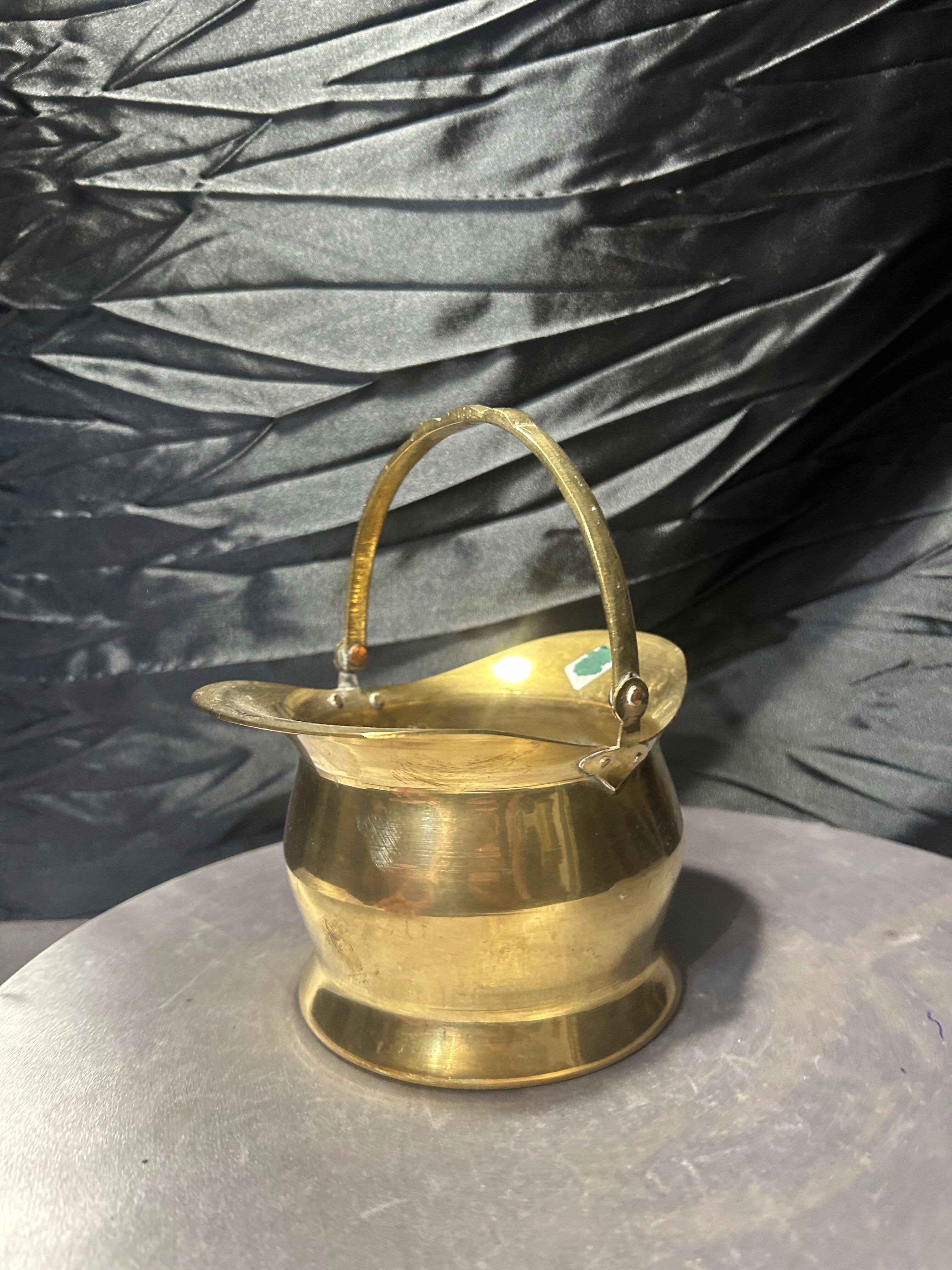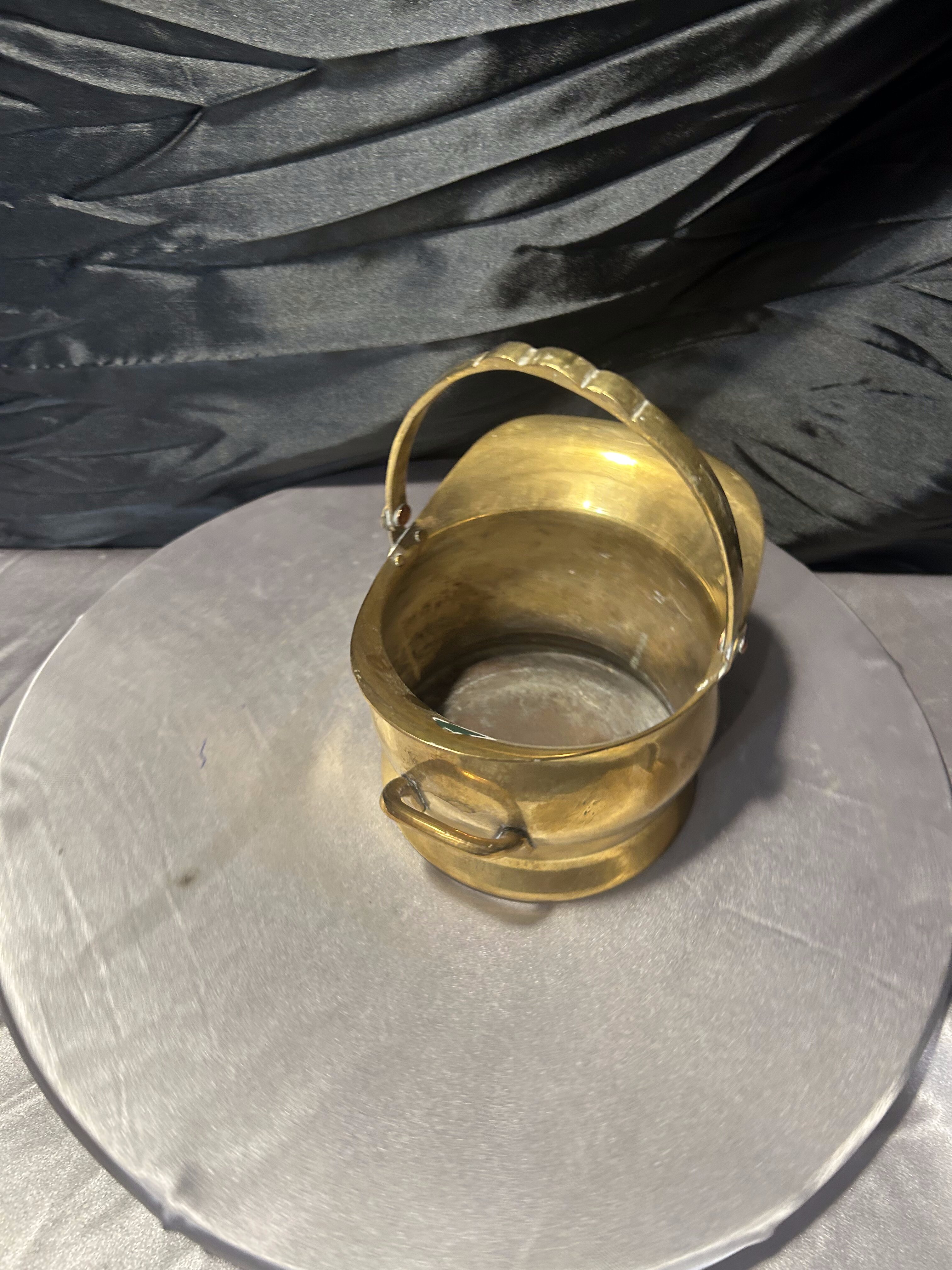 Charakterystyczny kształt z wywiniętym rantem oraz ruchomą rączką nadaje całości eleganckiego, vintage charakteru. Ciepły odcień mosiądzu oraz naturalna patyna metalu podkreślają autentyczność przedmiotu i jego dekoracyjny styl.