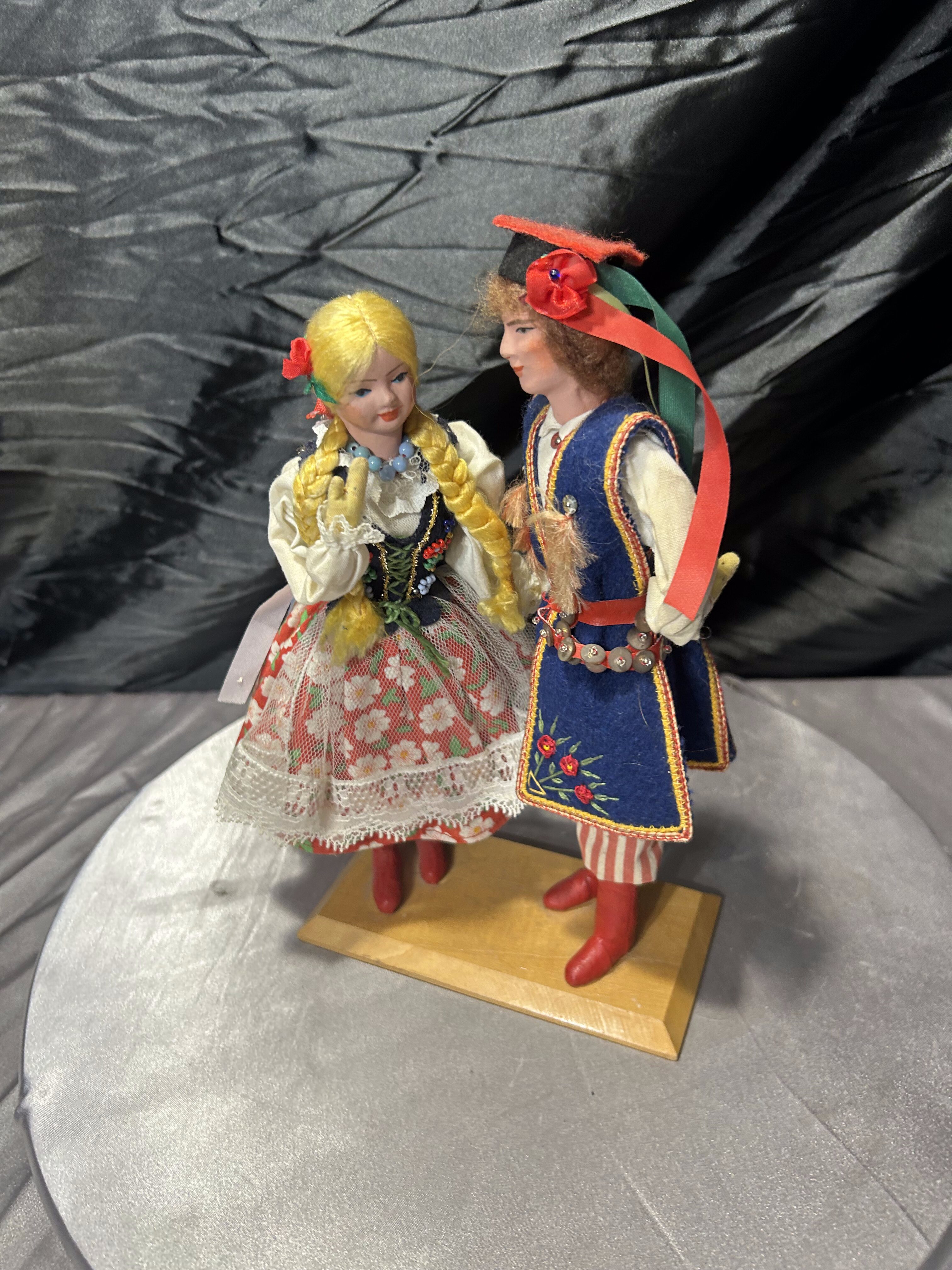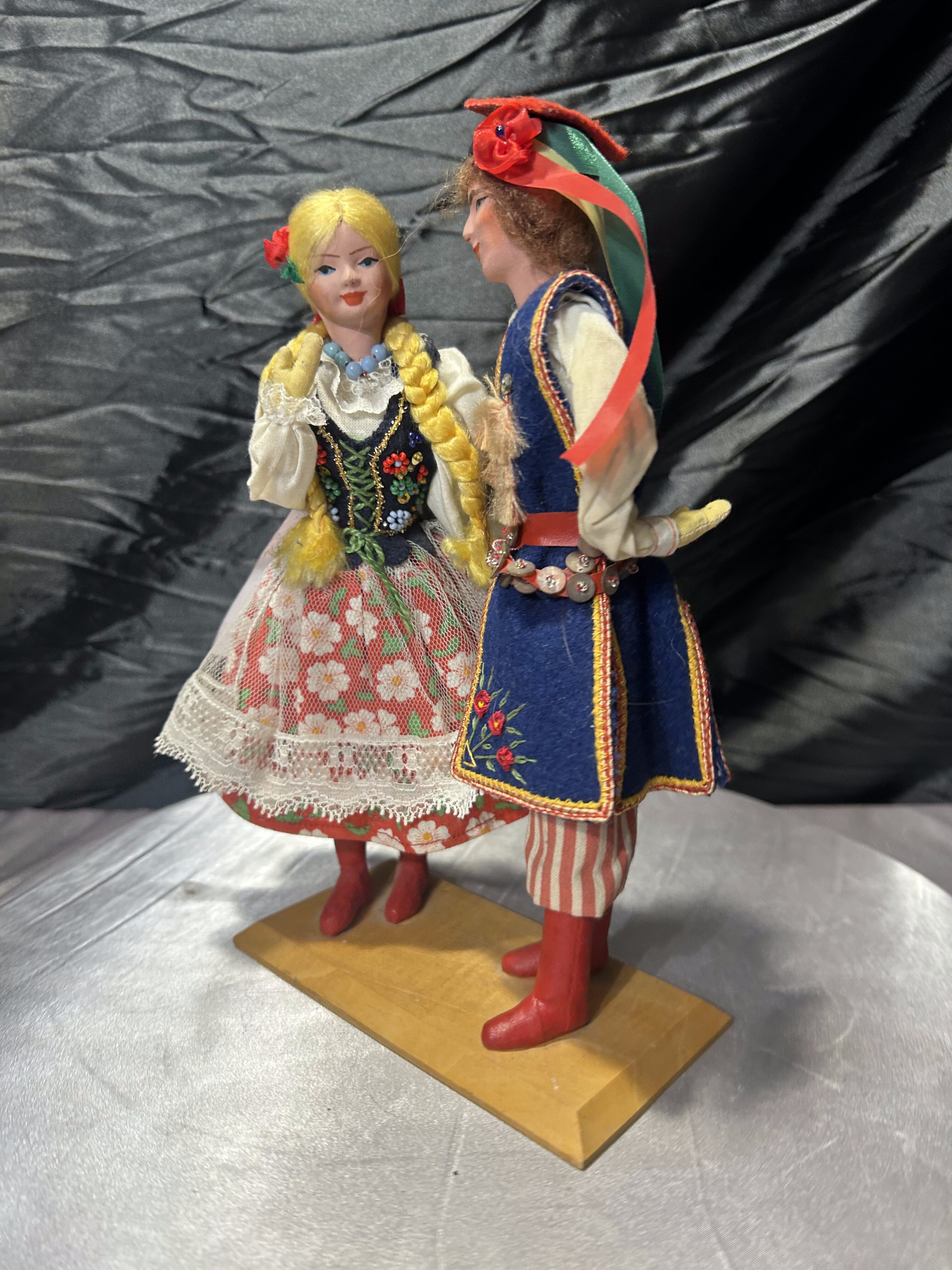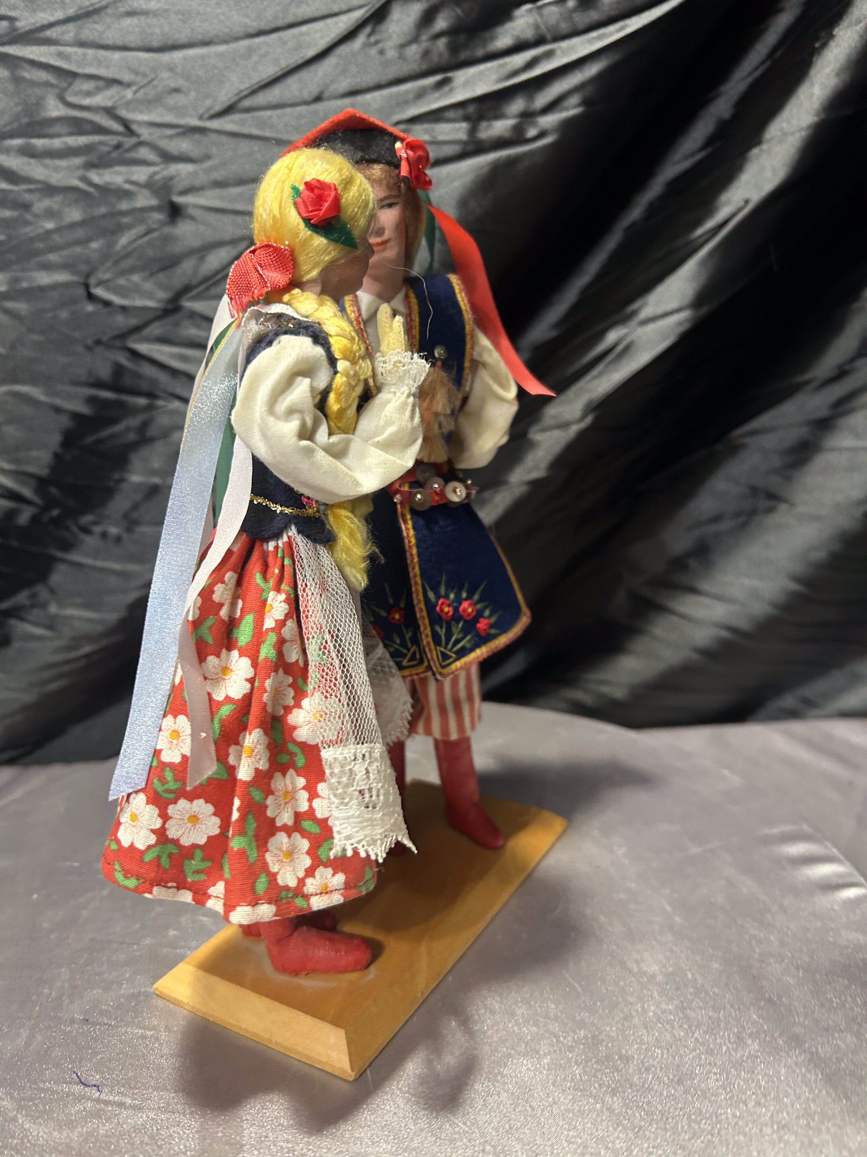 Para dekoracyjnych laleczek przedstawiających kobietę i mężczyznę w tradycyjnych polskich strojach ludowych, charakterystycznych dla regionu krakowskiego. To piękny przykład rękodzieła, nawiązującego do folkloru i dawnych tradycji. Stroje są bogato zdobione – z haftami, koronkami, typowymi kolorami i detalami (warkocze, krakuska, kwiatowe wzory). Idealne jako dekoracja, element kolekcji lub prezent dla miłośników kultury polskiej.