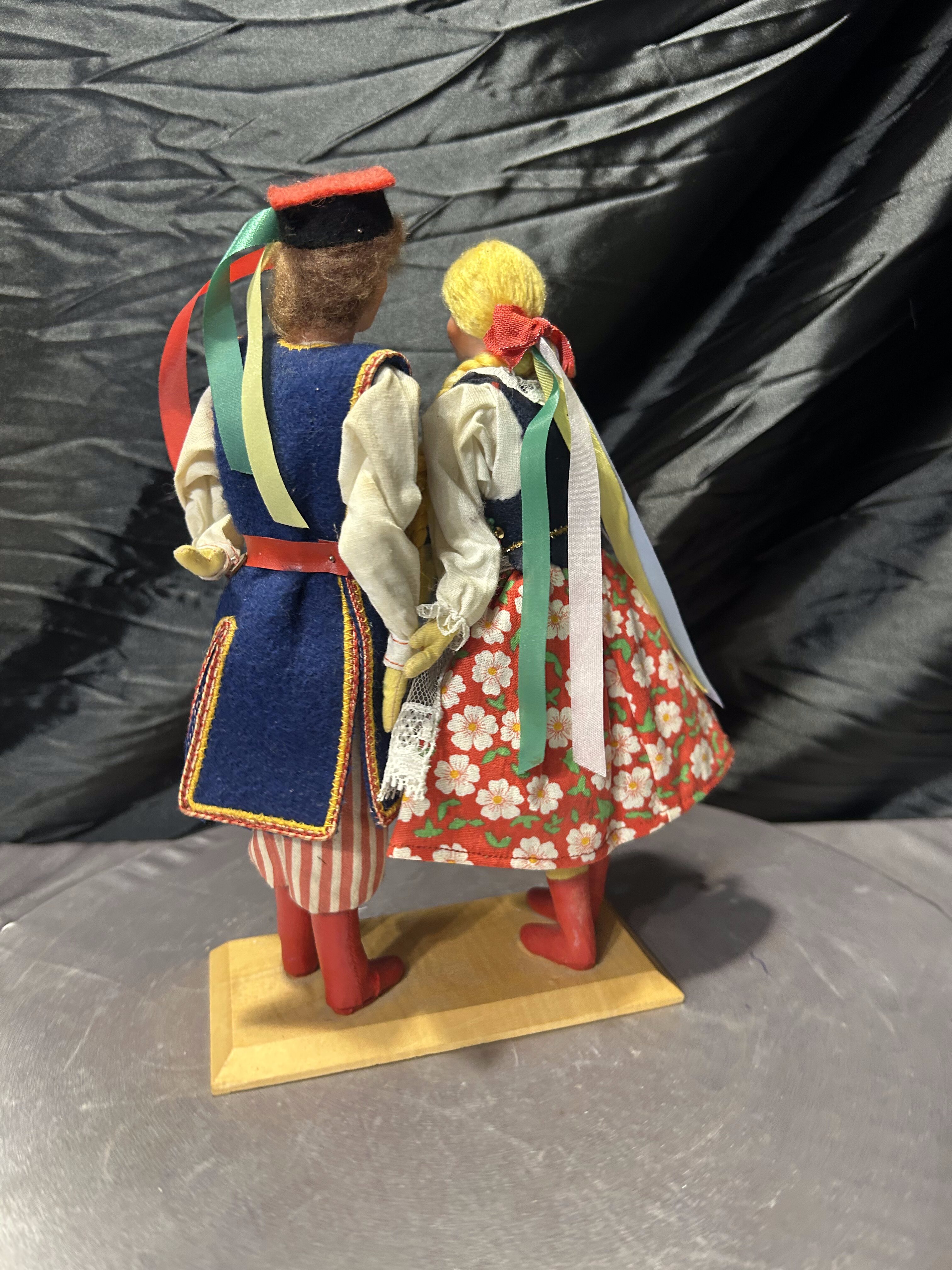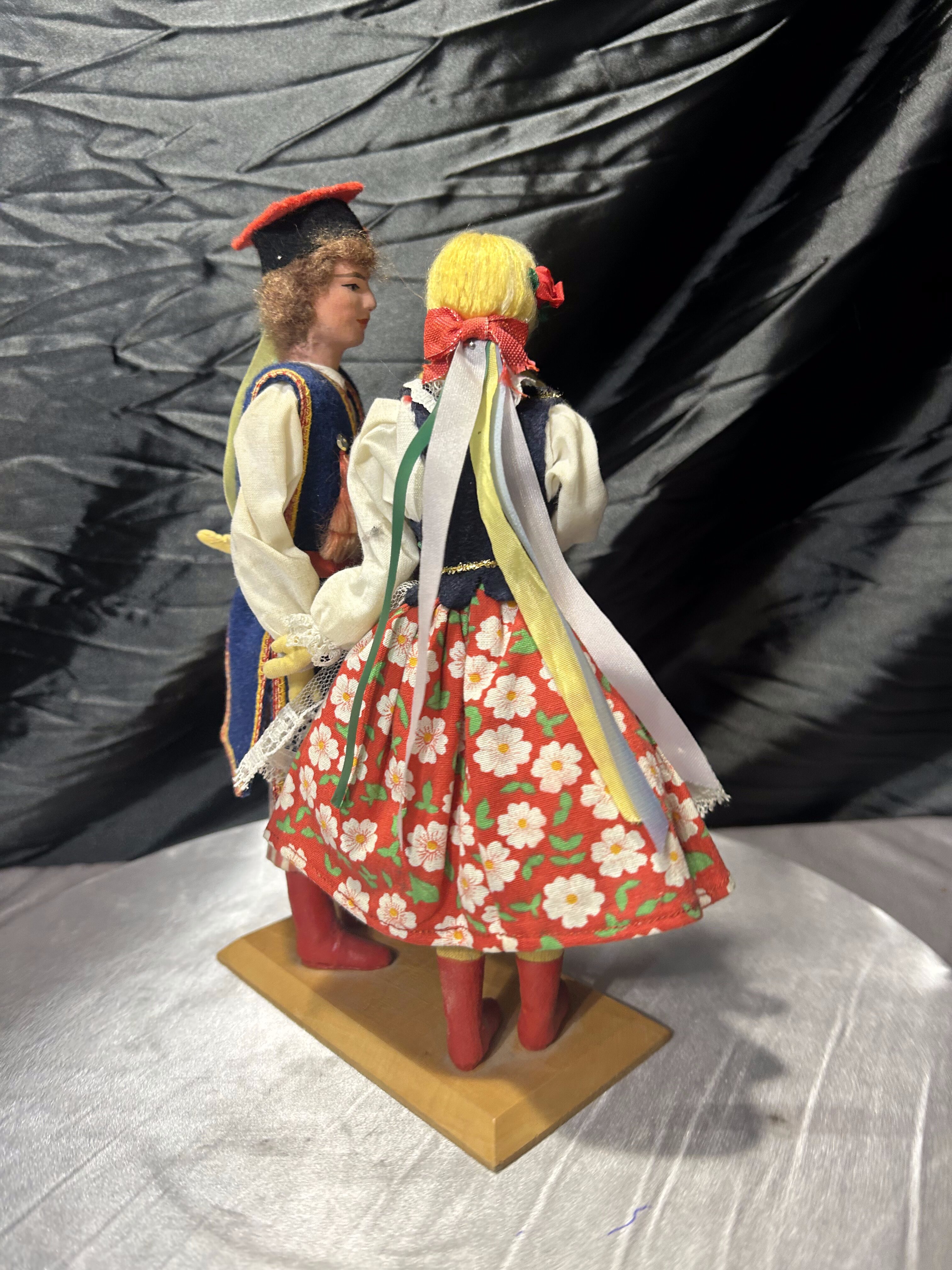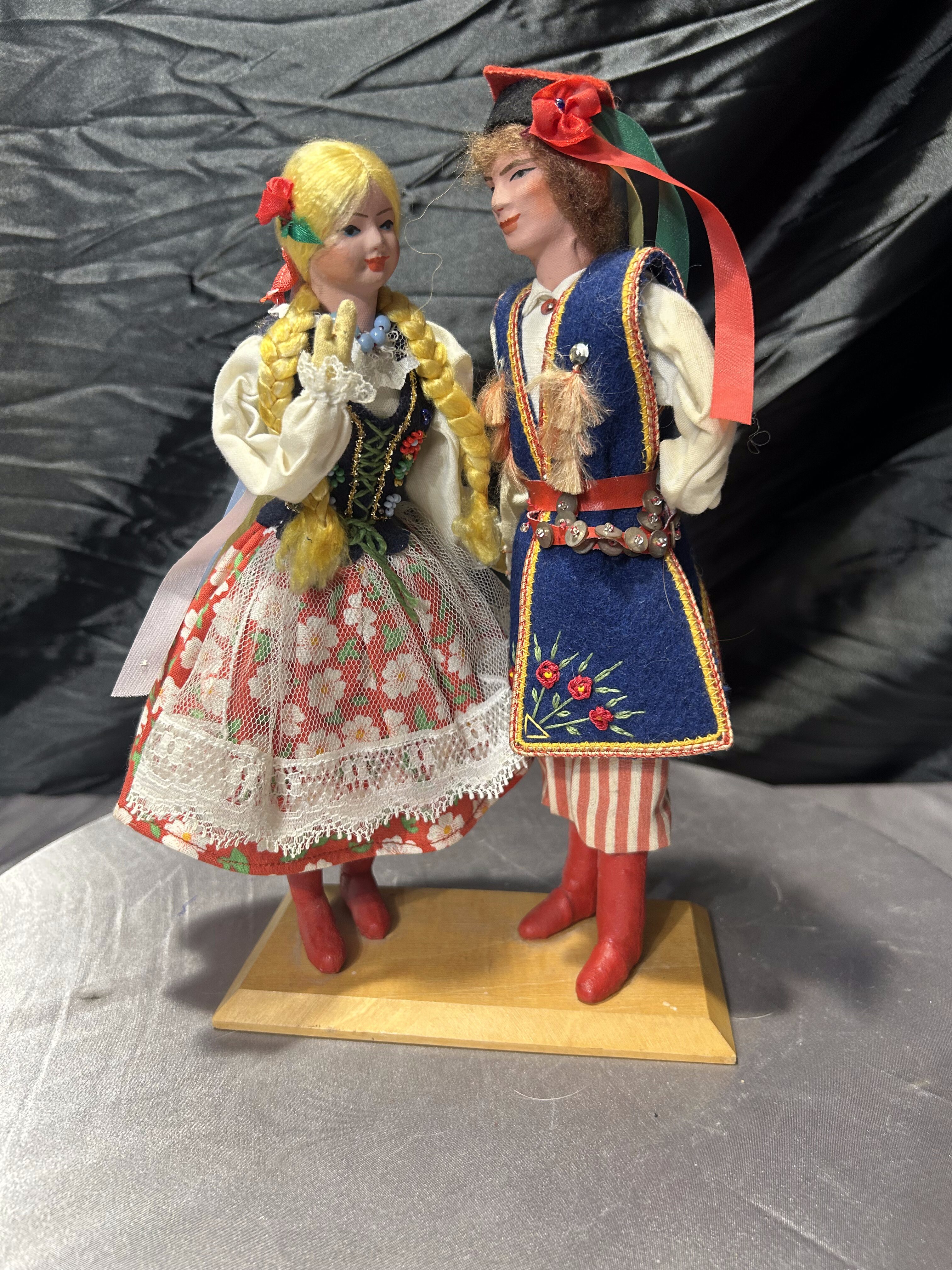 Para dekoracyjnych laleczek przedstawiających kobietę i mężczyznę w tradycyjnych polskich strojach ludowych, charakterystycznych dla regionu krakowskiego. To piękny przykład rękodzieła, nawiązującego do folkloru i dawnych tradycji. Stroje są bogato zdobione – z haftami, koronkami, typowymi kolorami i detalami (warkocze, krakuska, kwiatowe wzory). Idealne jako dekoracja, element kolekcji lub prezent dla miłośników kultury polskiej.