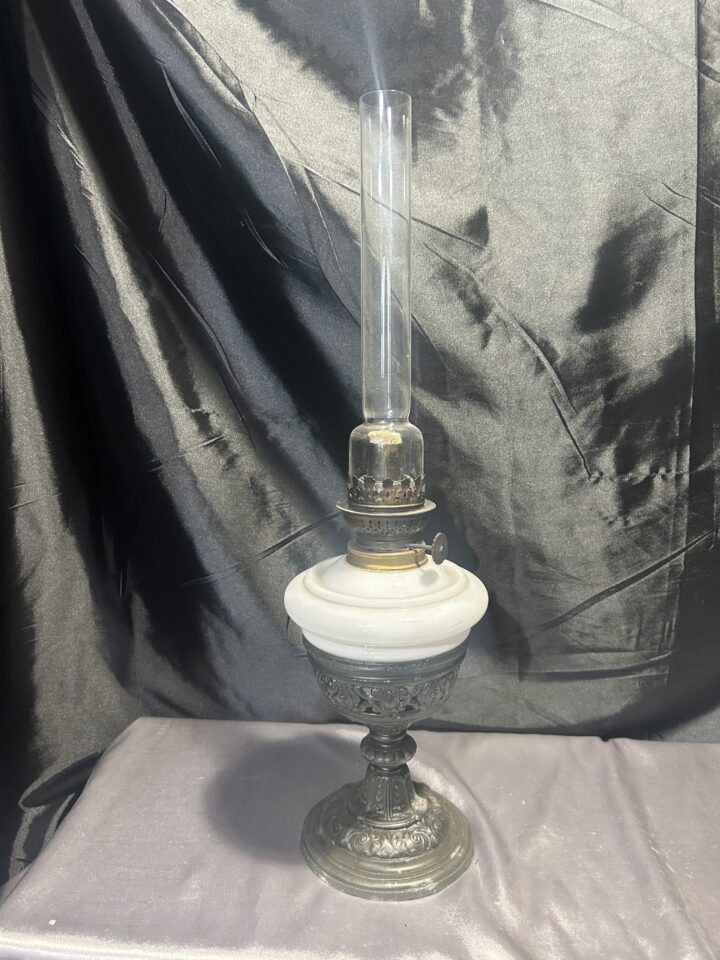 Lampa Naftowa – Biały Pojemnik, Zdobiona Noga, Sprawna