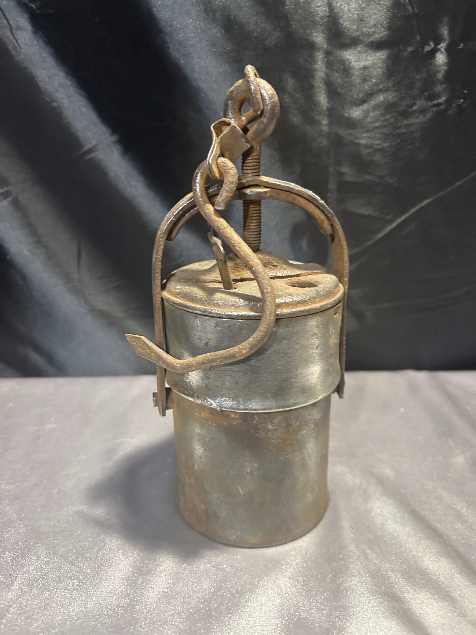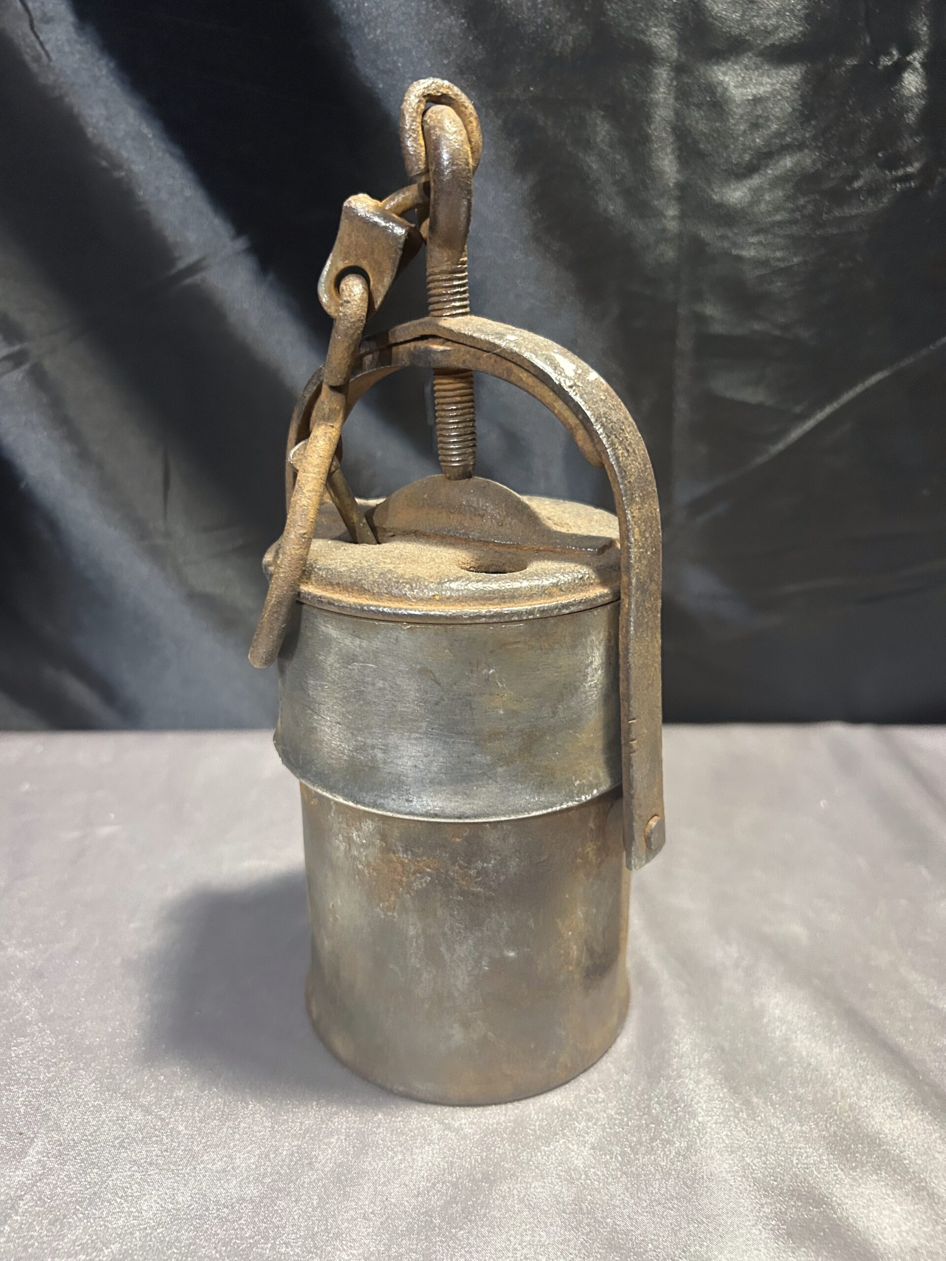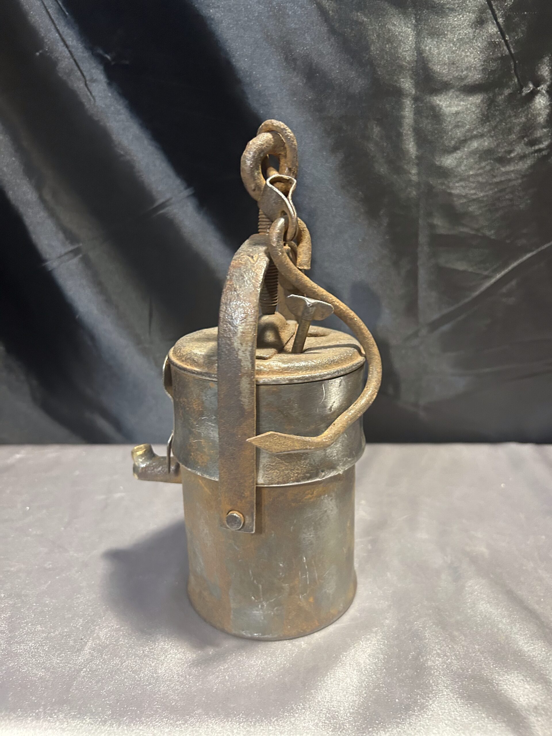 Prezentujemy oryginalną górniczą lampę karbidową, wykonaną z żeliwa, przeznaczoną zarówno do powieszenia, jak i postawienia. Ten solidny egzemplarz nosi widoczne ślady upływu czasu, co świadczy o jego autentycznym, historycznym charakterze.