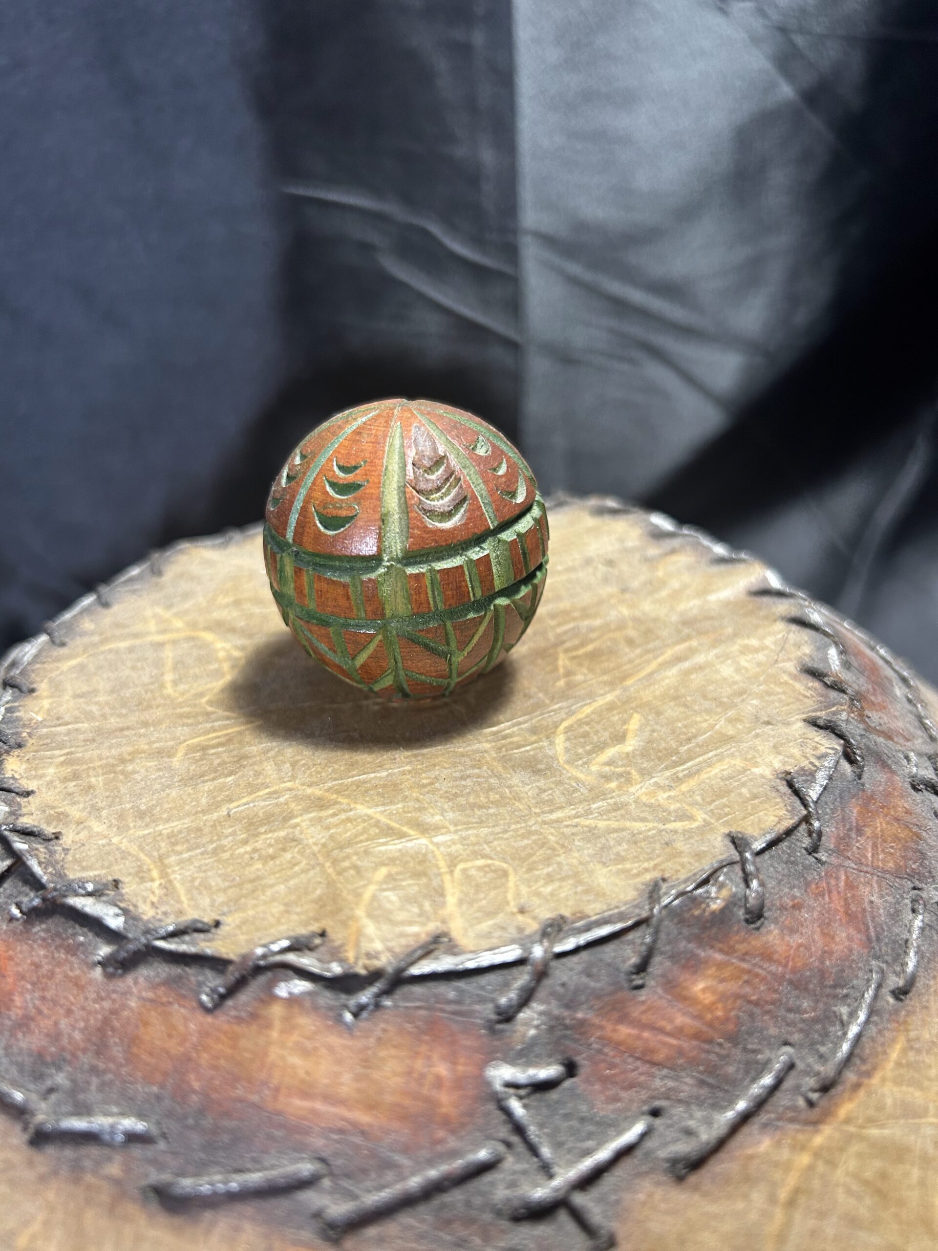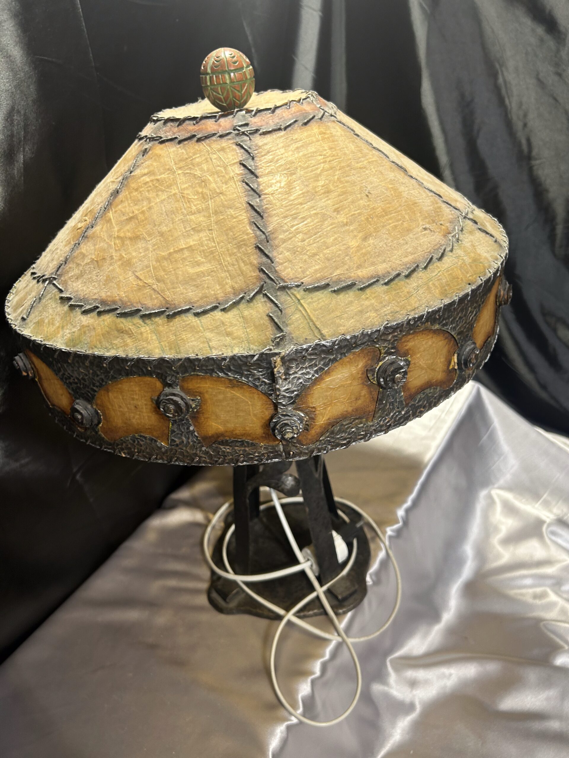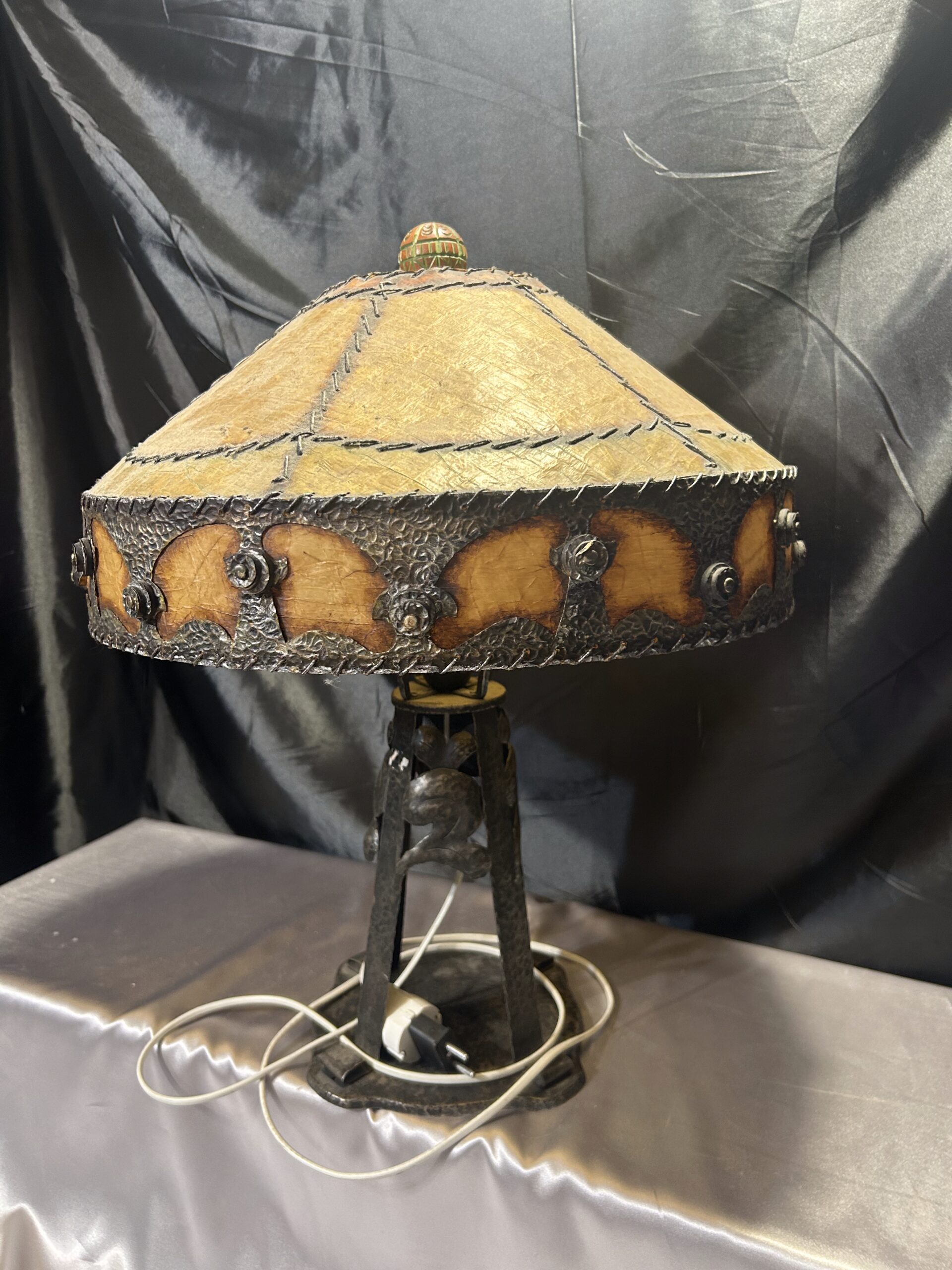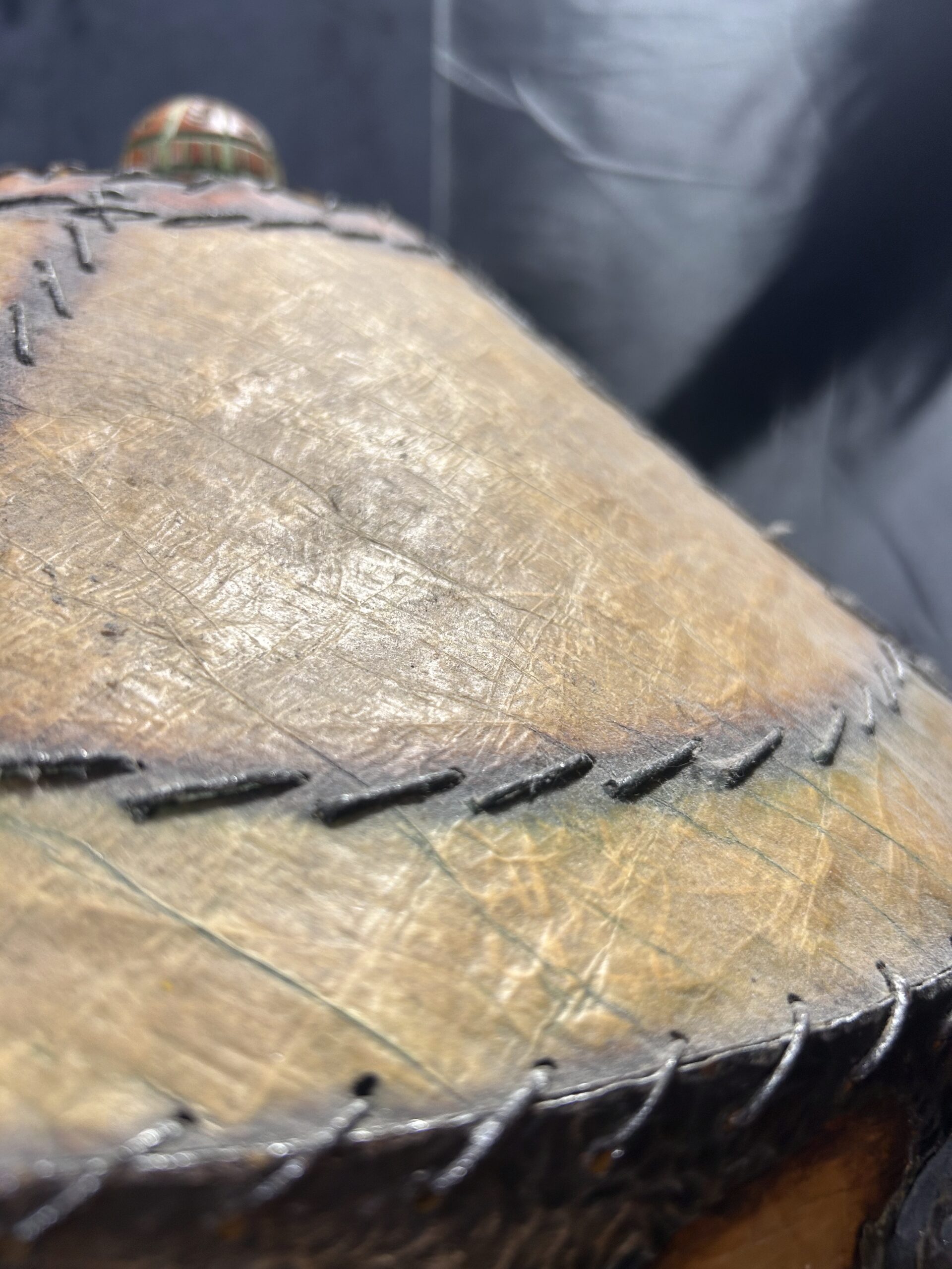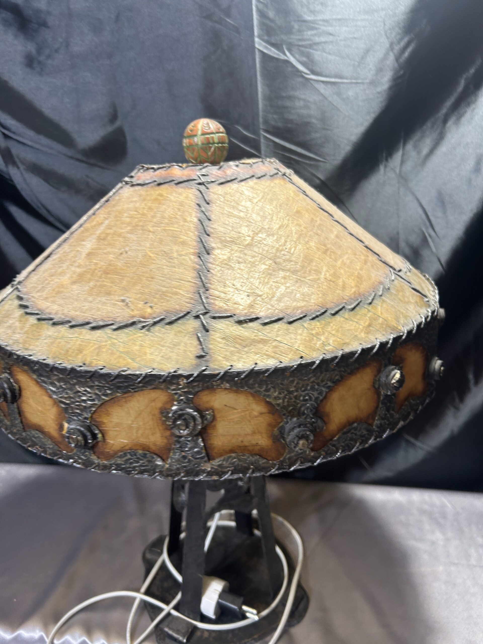Elegancka lampa kuta, starannie wykonana w stylu vintage, która wprowadza do wnętrza niepowtarzalny klimat. Widoczne efekty po włączeniu światła dodają uroku, a abażur wykonany z materiału przypominającego wyprawioną skórę, szyty grubymi nićmi, podkreśla jej wyjątkowy charakter. Zwieńczenie lampy stanowi drewniana, rzeźbiona kula, która dodaje rustykalnego uroku.