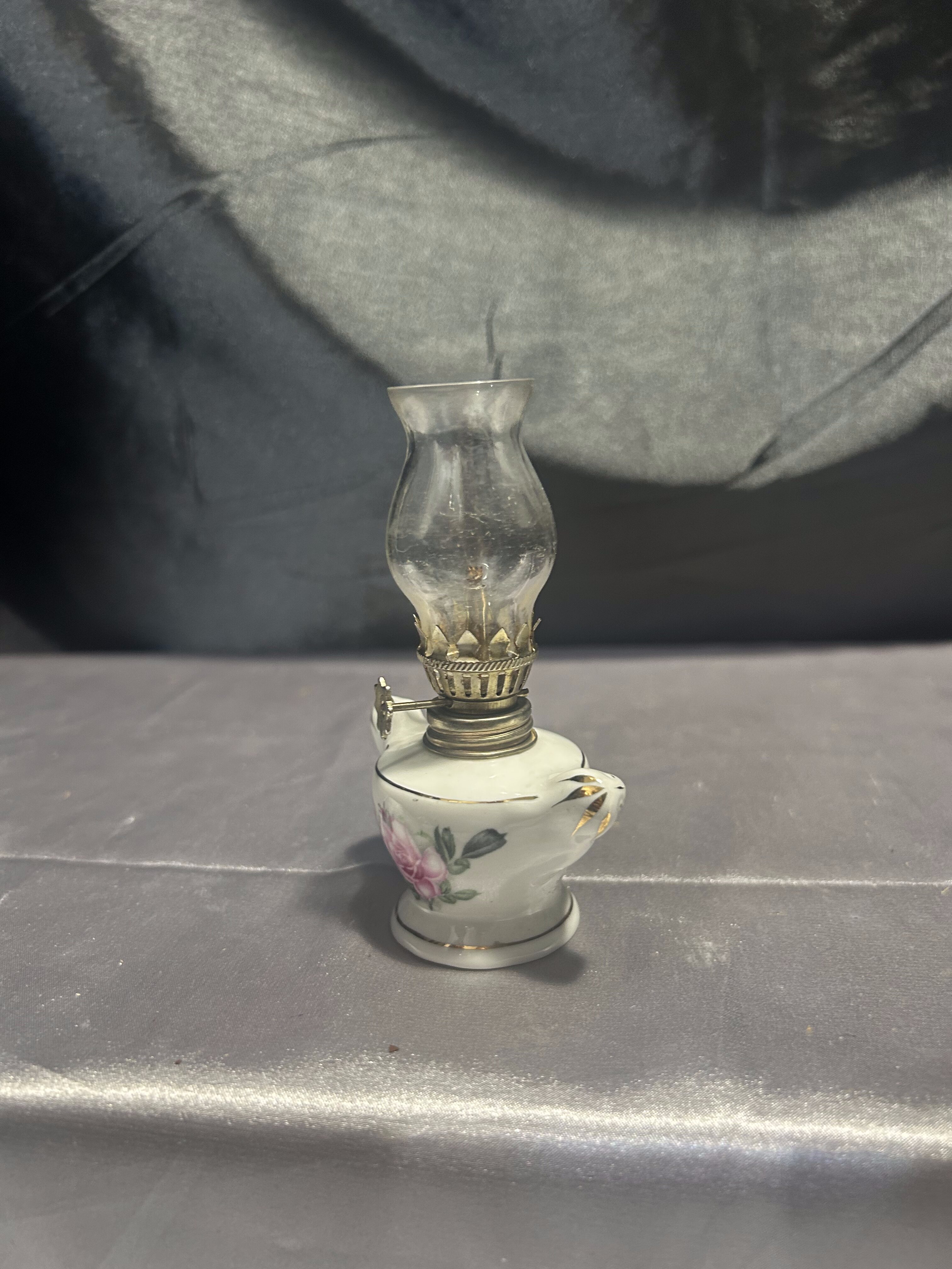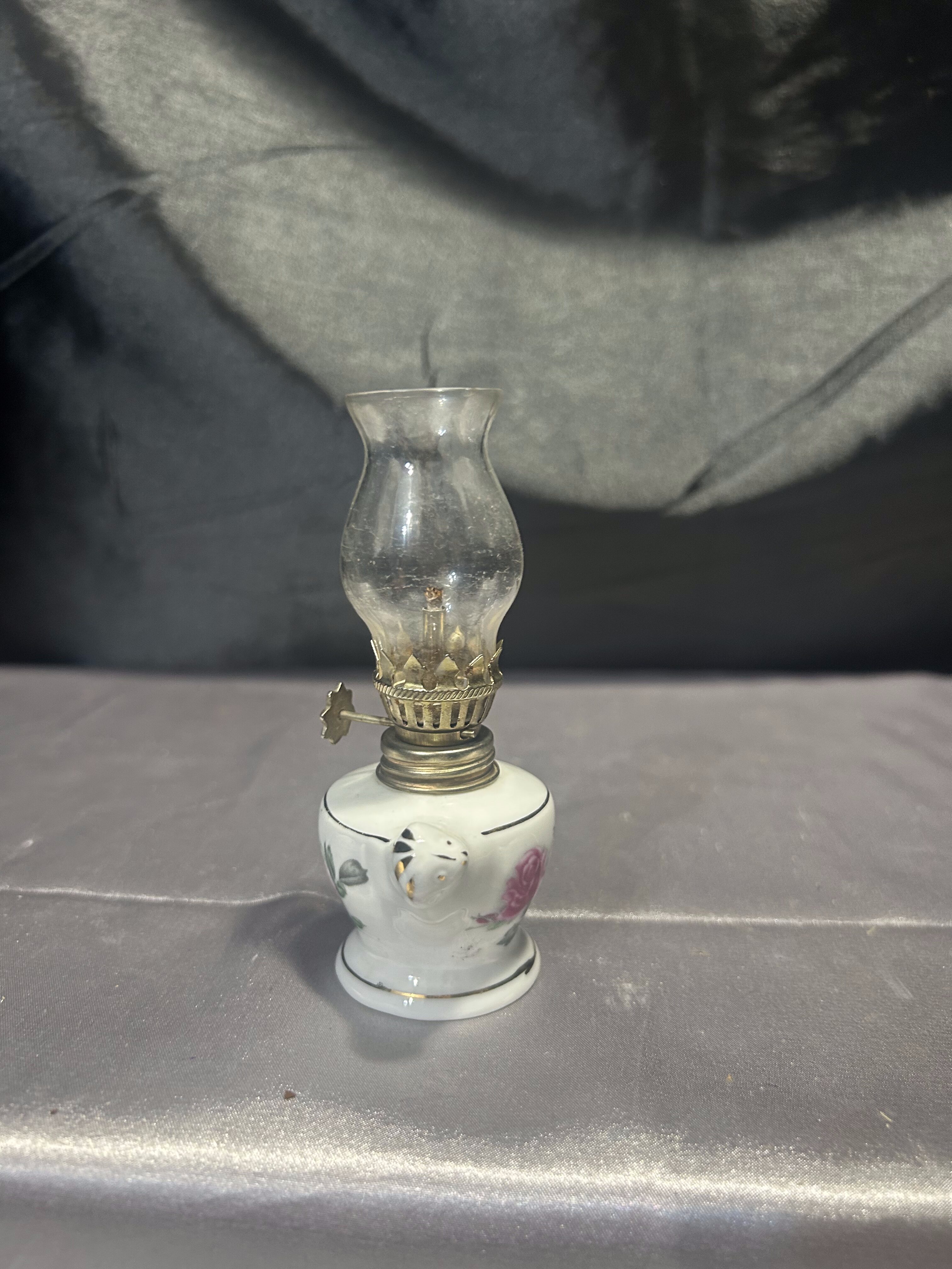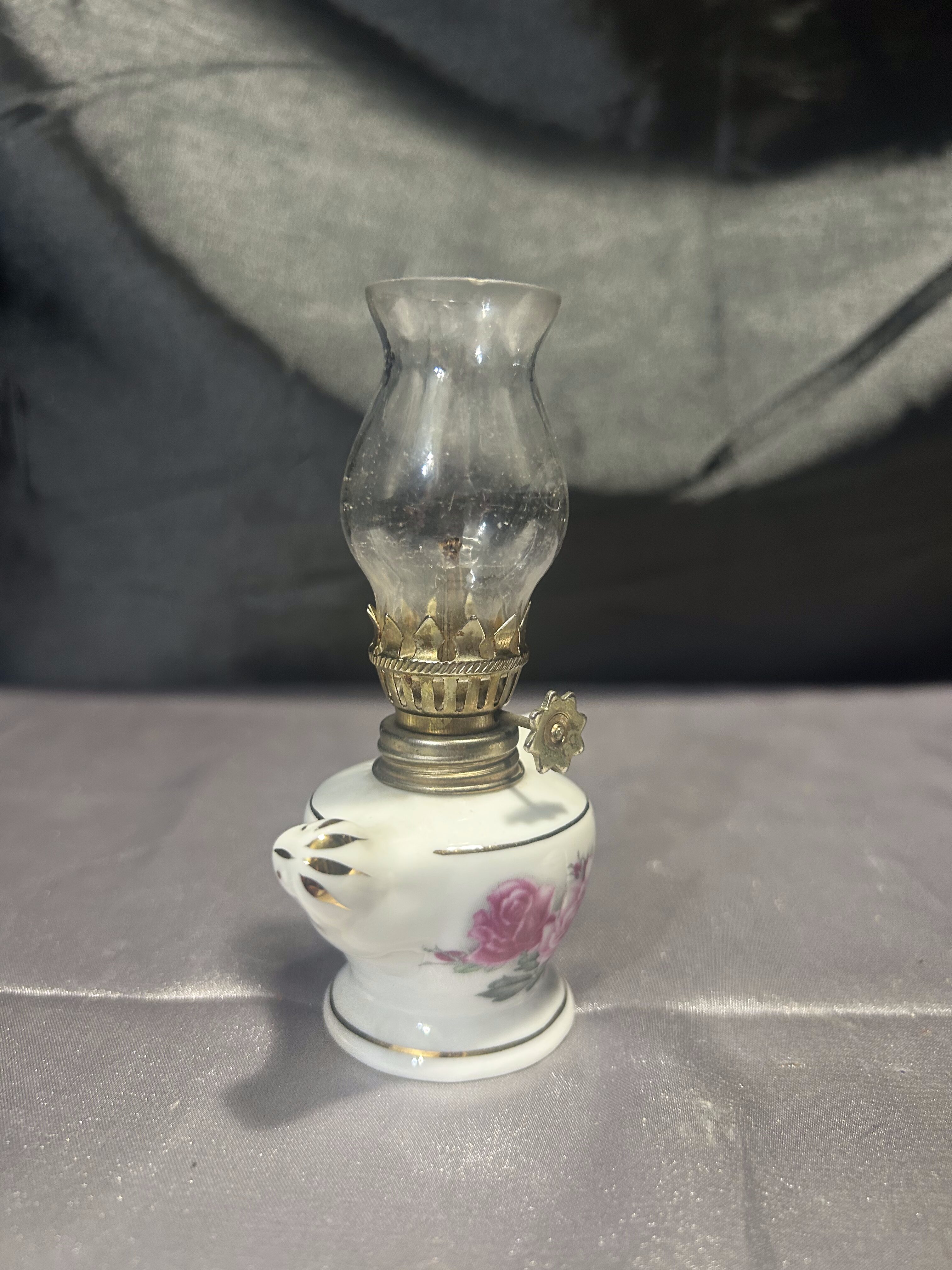 Na sprzedaż urokliwa, mała lampa naftowa w kolorze białym, ozdobiona ręcznie malowanymi różami oraz złotymi detalami. Wyposażona w przeźroczysty, szklany komin i nowy knot, gotowa do użytku. Delikatna forma i klasyczny charakter sprawiają, że idealnie wkomponuje się w wnętrza w stylu romantycznym, shabby chic lub vintage.