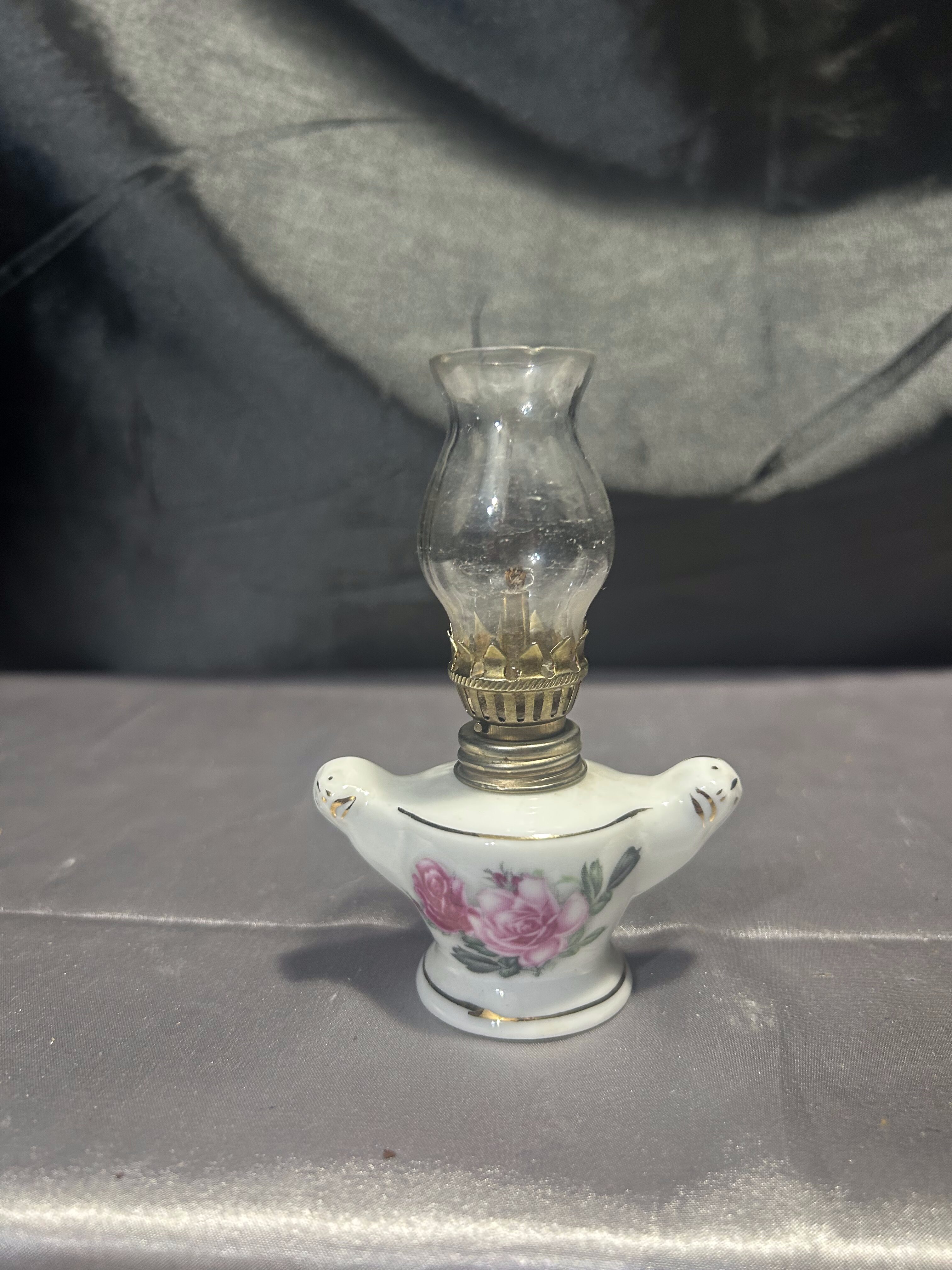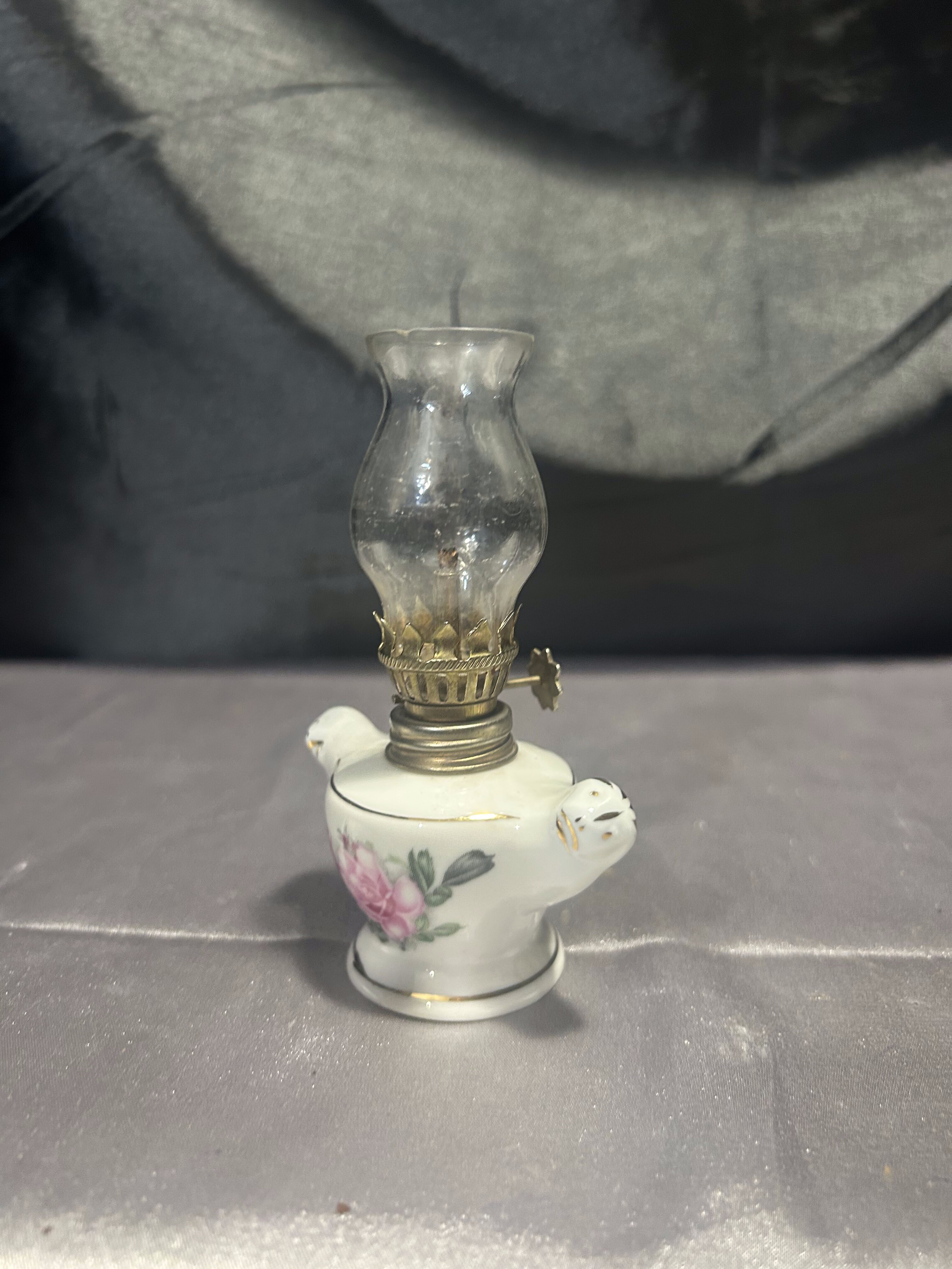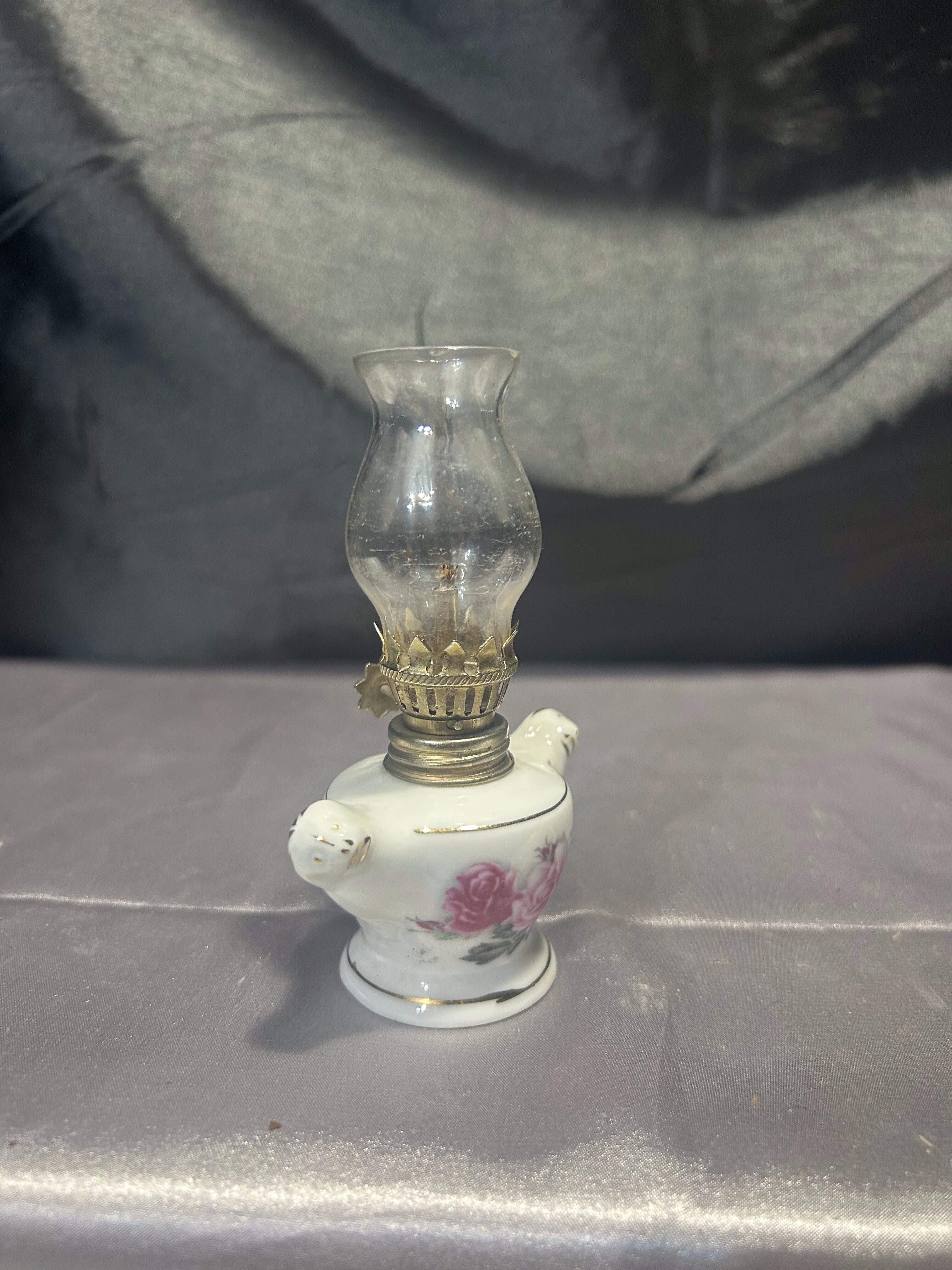 Na sprzedaż urokliwa, mała lampa naftowa w kolorze białym, ozdobiona ręcznie malowanymi różami oraz złotymi detalami. Wyposażona w przeźroczysty, szklany komin i nowy knot, gotowa do użytku. Delikatna forma i klasyczny charakter sprawiają, że idealnie wkomponuje się w wnętrza w stylu romantycznym, shabby chic lub vintage.