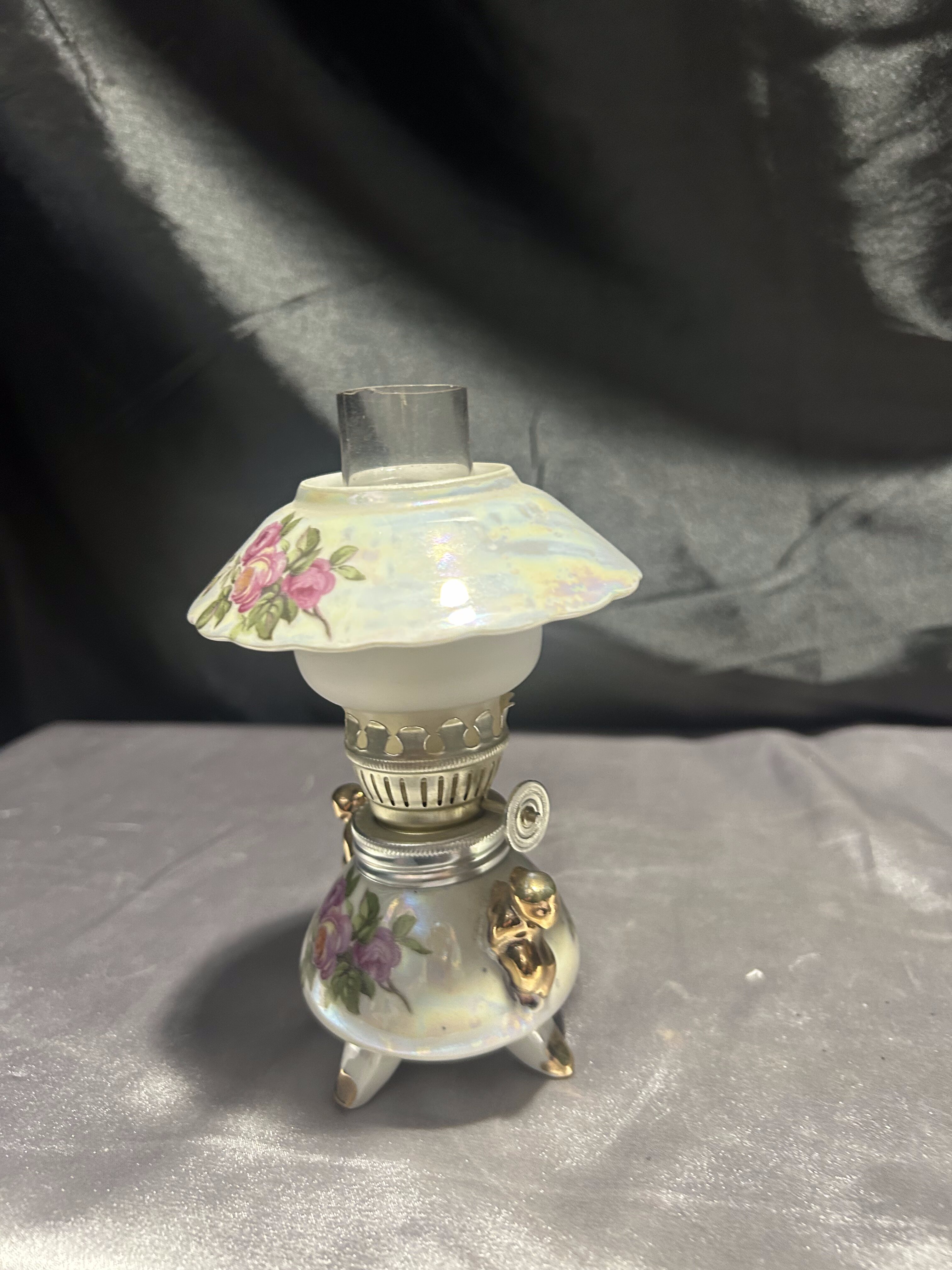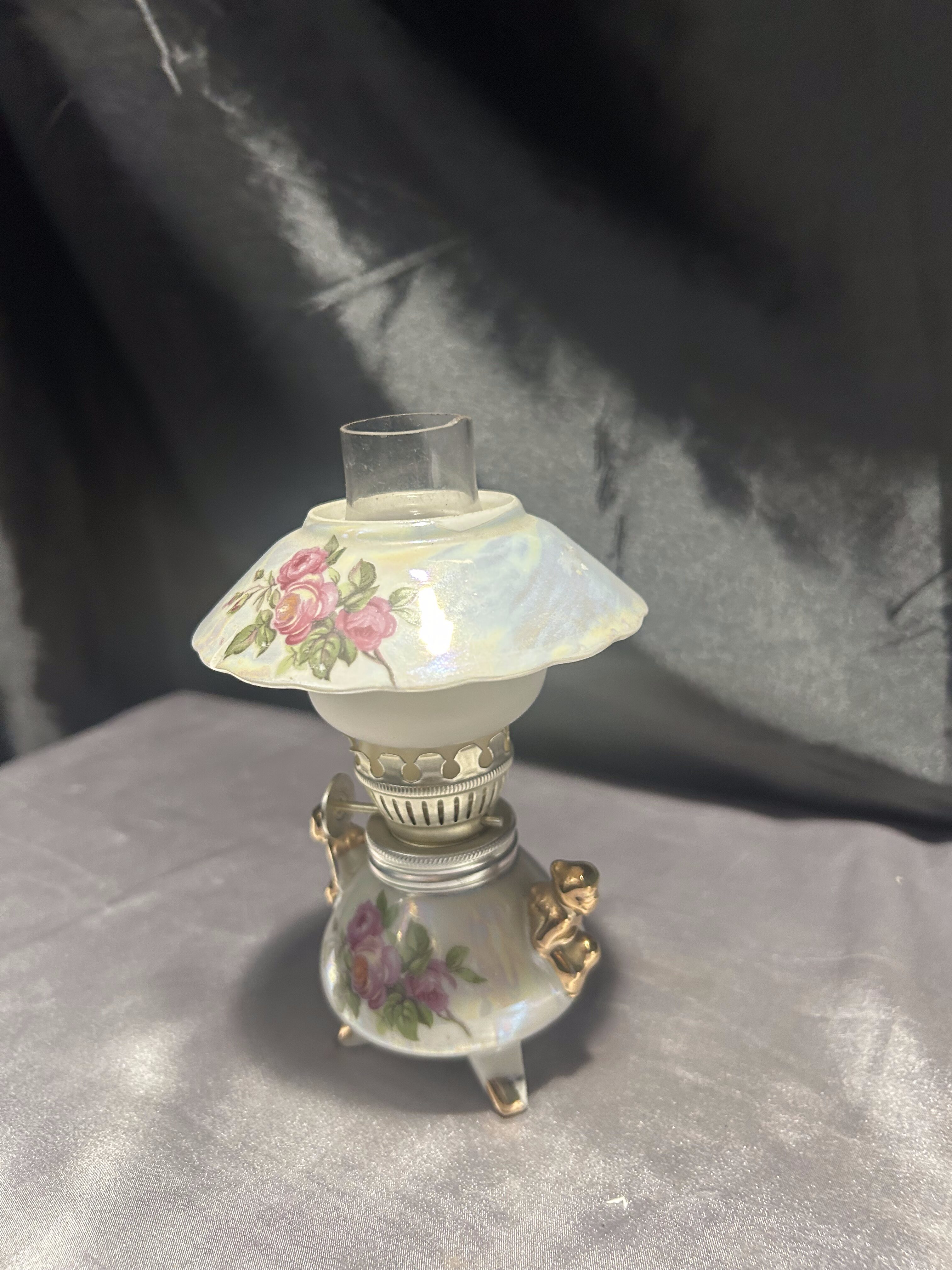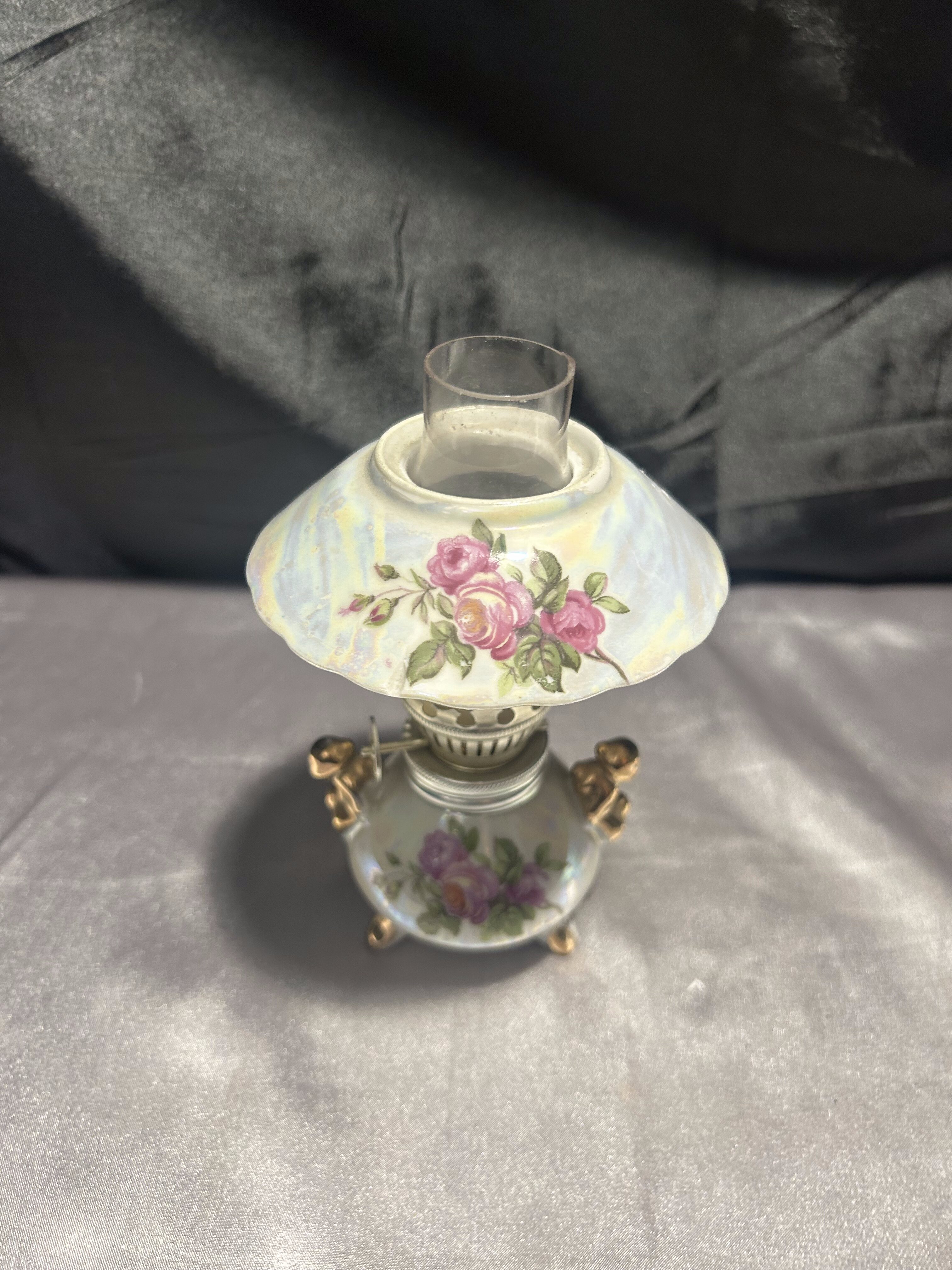 Urocza, w pełni sprawna lampa naftowa wykonana z ceramiki, ozdobiona kwiatowym wzorem w romantycznym stylu. Klosz w formie szerokiego daszka z różanym motywem subtelnie rozprasza światło, a złocone detale dodają elegancji i klasycznego uroku.