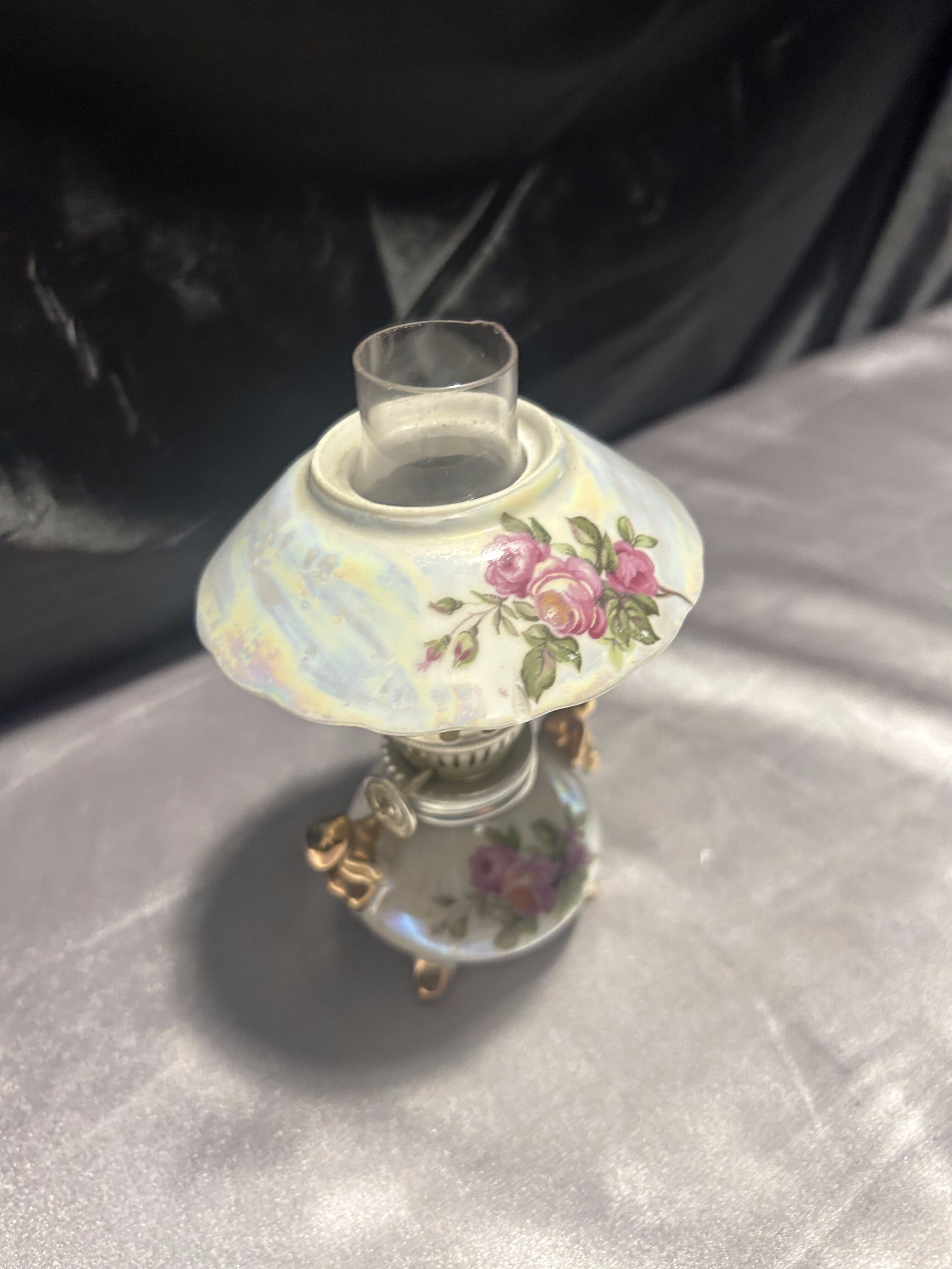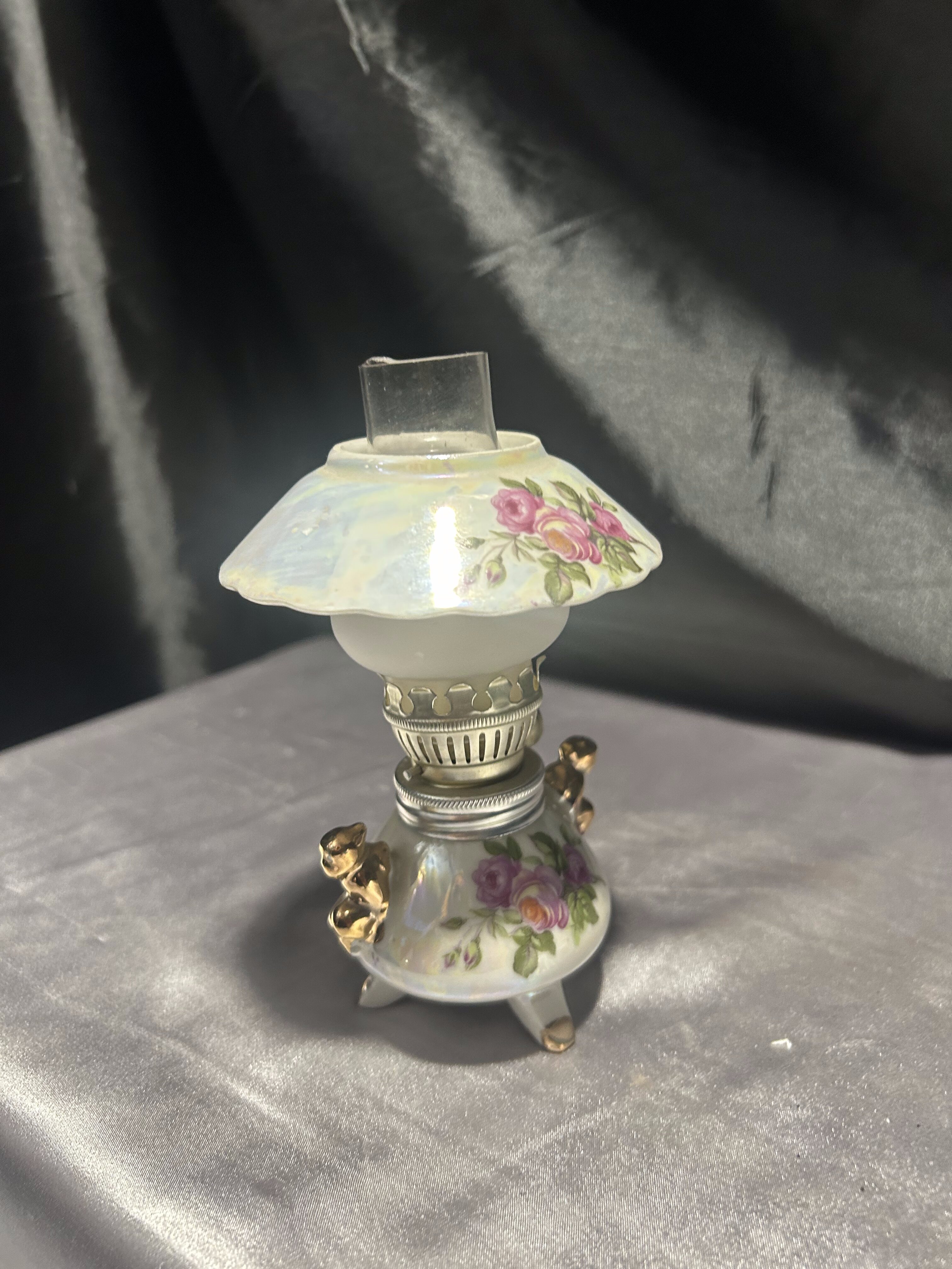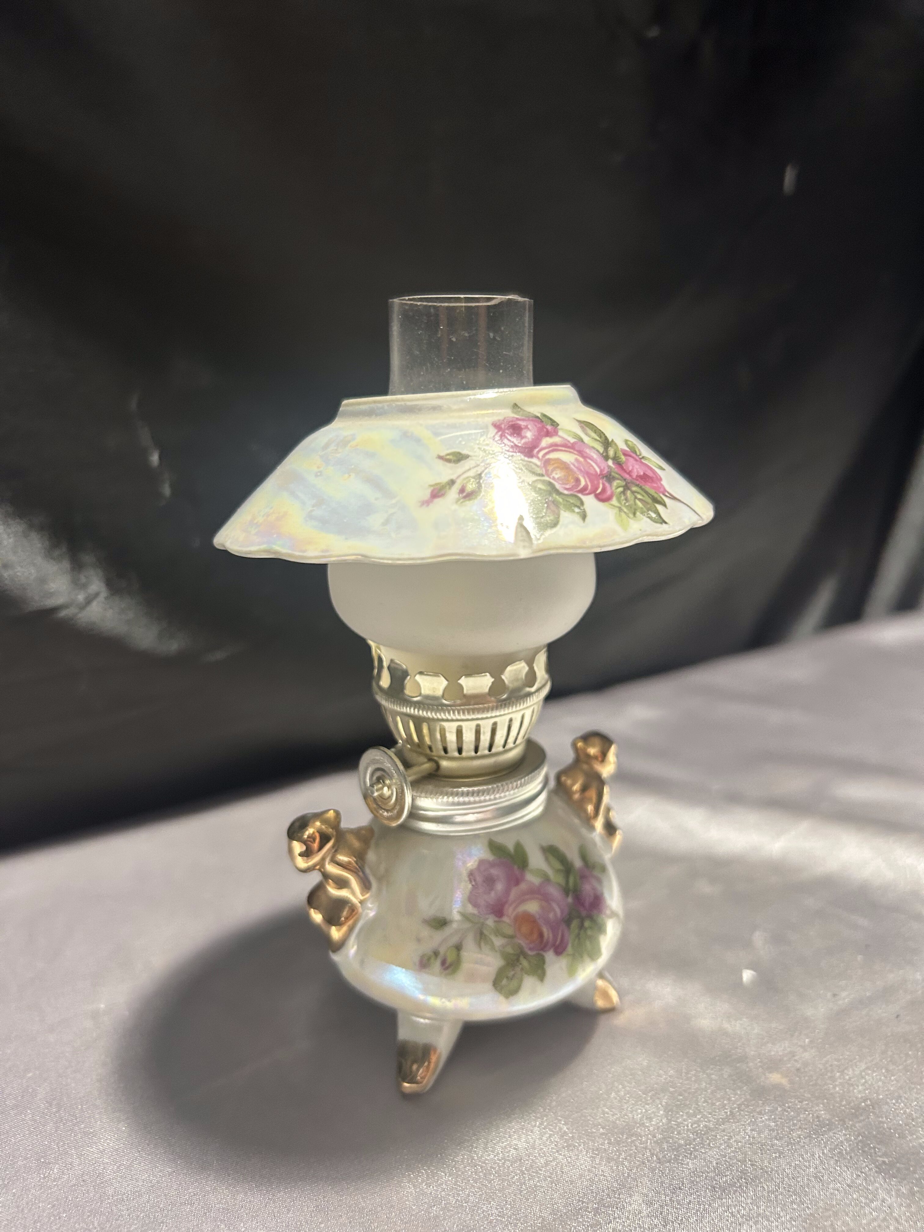 Urocza, w pełni sprawna lampa naftowa wykonana z ceramiki, ozdobiona kwiatowym wzorem w romantycznym stylu. Klosz w formie szerokiego daszka z różanym motywem subtelnie rozprasza światło, a złocone detale dodają elegancji i klasycznego uroku.