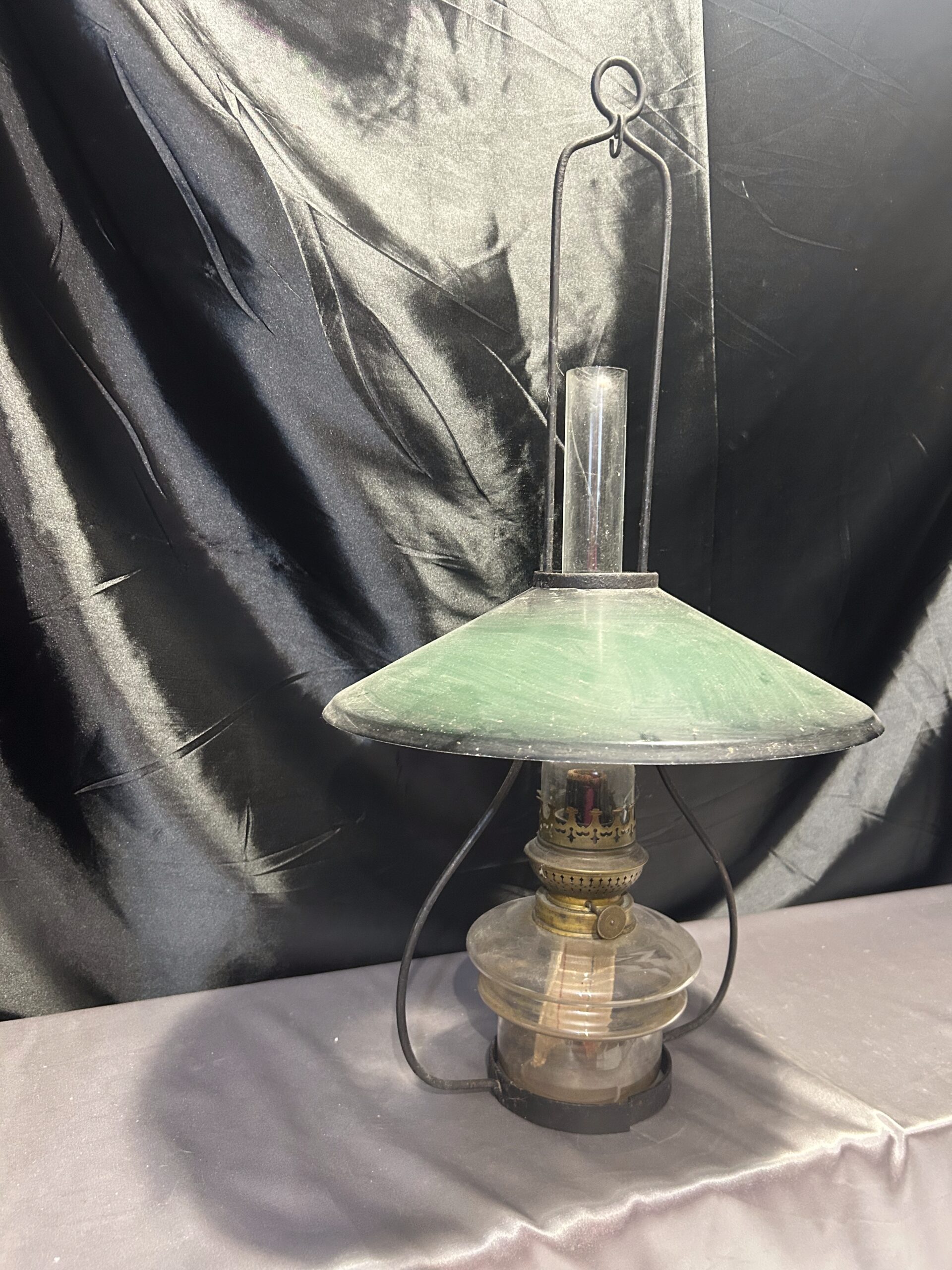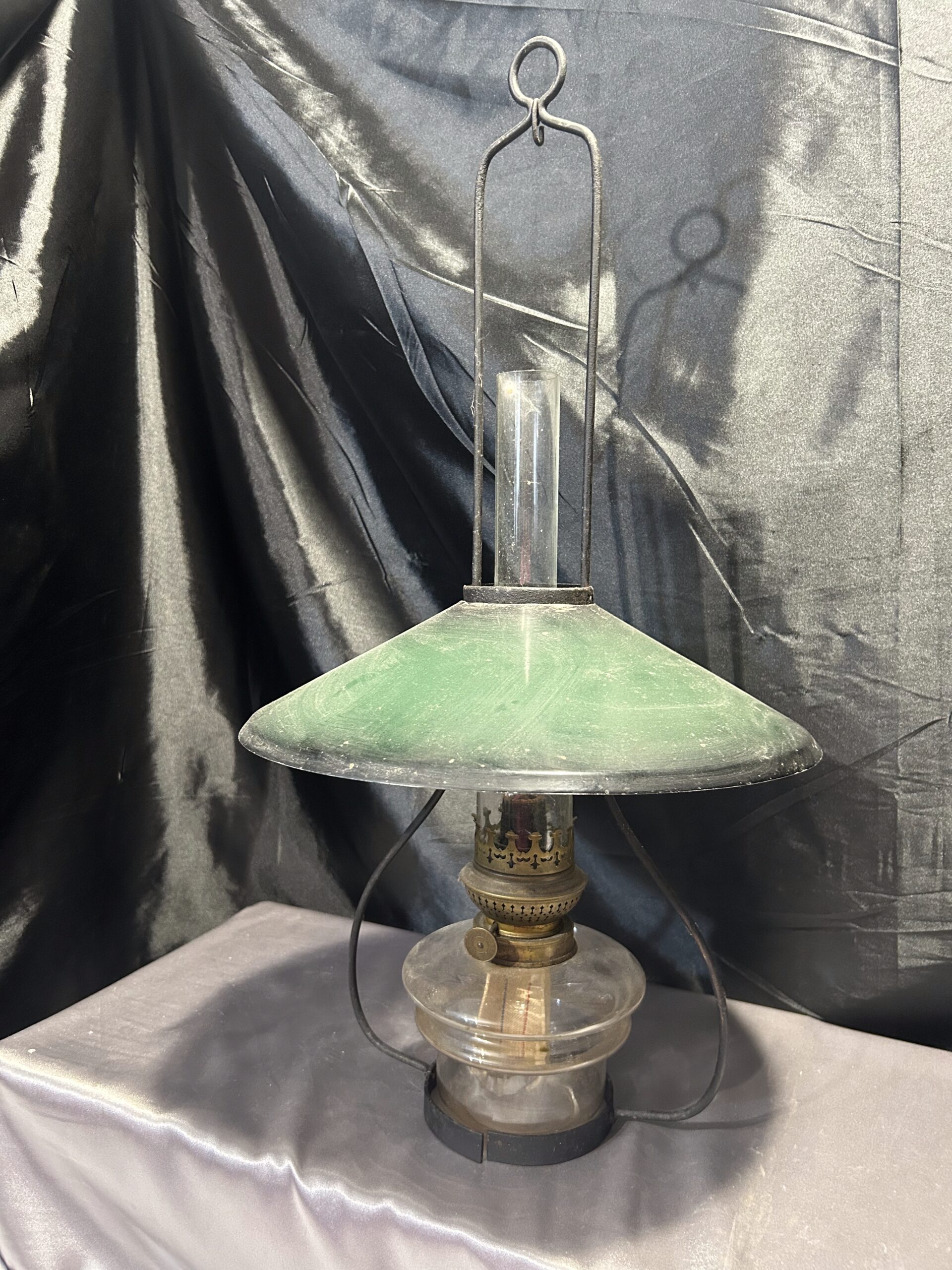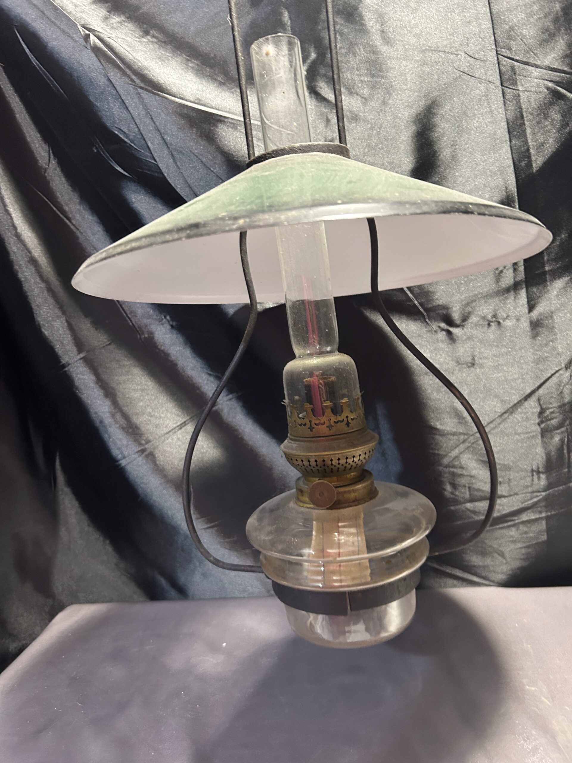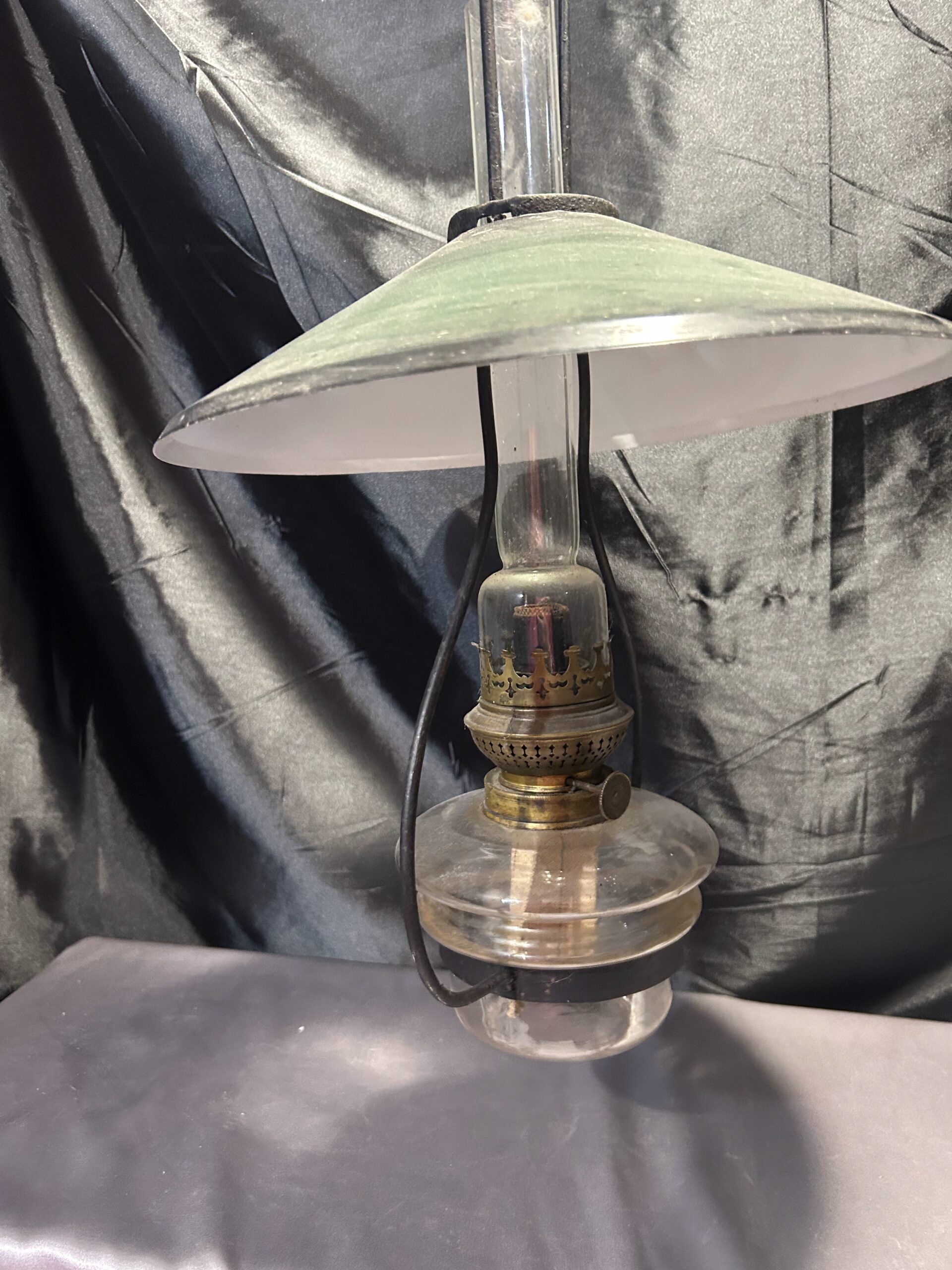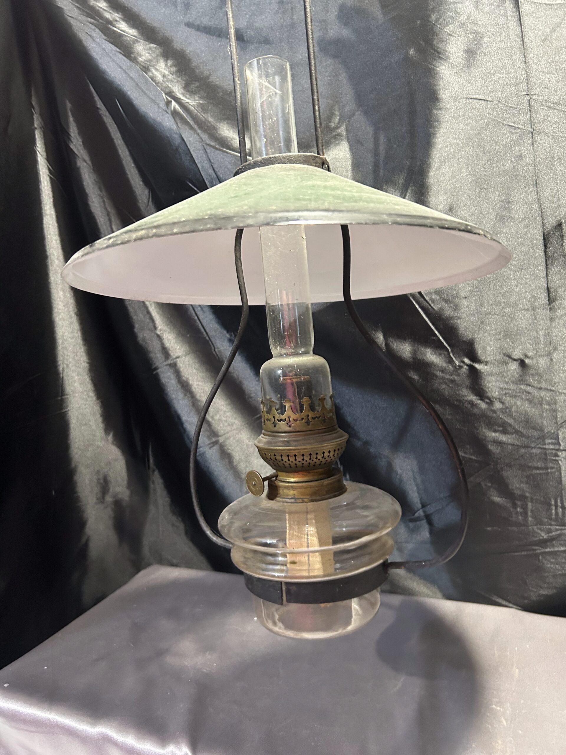 Wyjątkowa lampa naftowa przeznaczona do powieszenia pod sufitem. Posiada charakterystyczny kapelusz w kolorze butelkowej zieleni (od góry) i białym (od spodu), co zapewnia lepsze rozpraszanie światła. Lampa wyposażona jest w duży pojemnik na naftę oraz nowy knot, dzięki czemu jest w pełni sprawna i gotowa do użytku. Klasyczny design podkreśla szklany pojemnik i klosz.