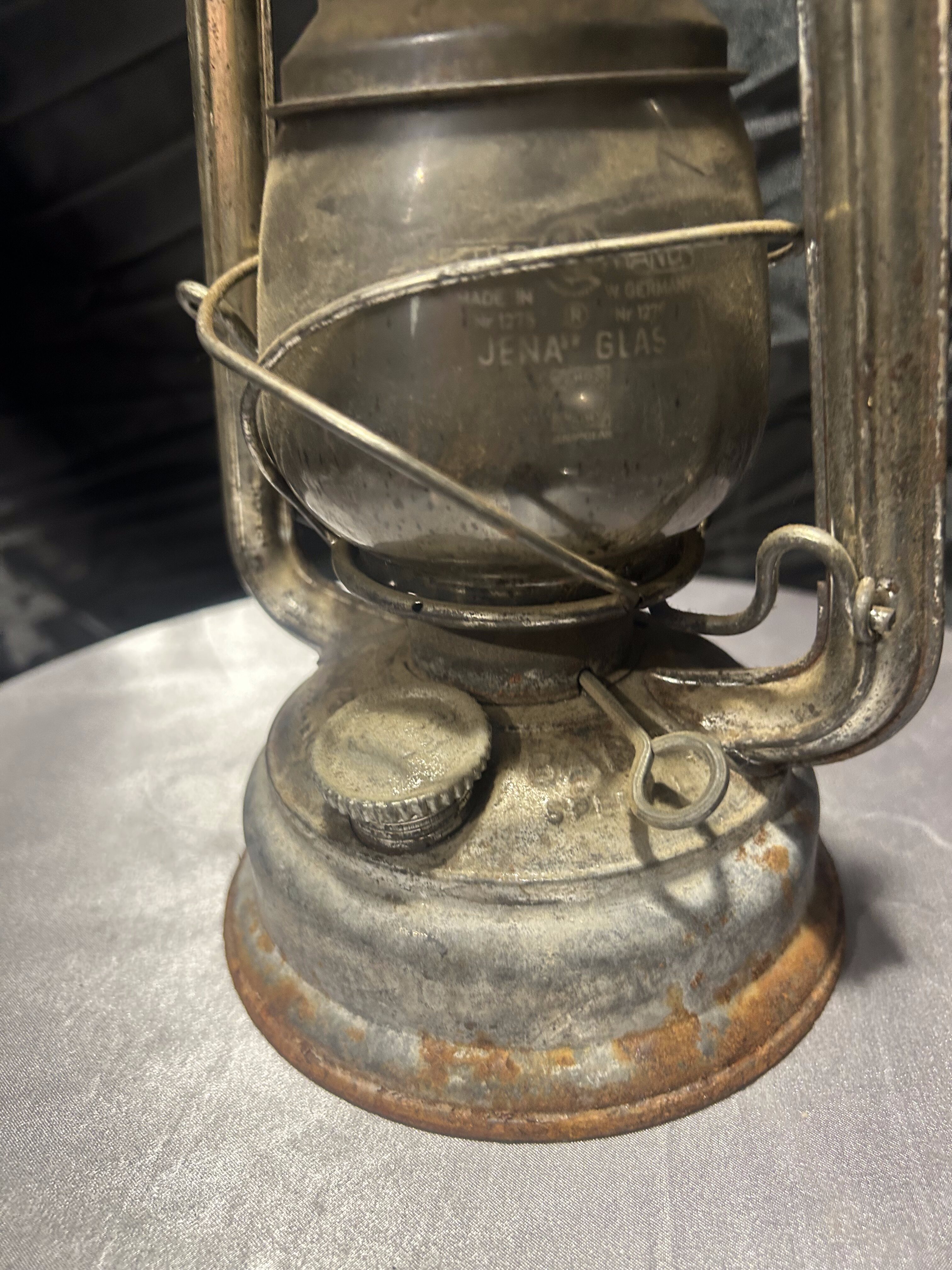Oryginalna lampa naftowa renomowanej marki Feuerhand, wyprodukowana w Niemczech Zachodnich. Wyposażona w szkło Jena Glas sygnowane nazwą producenta, znane z wyjątkowej odporności i jakości. Lampa zachowana w oryginalnym stanie z widoczną patyną i śladami użytkowania, które nadają jej autentyczny, kolekcjonerski charakter. To klasyczny przykład solidnego niemieckiego rzemiosła z połowy XX wieku.