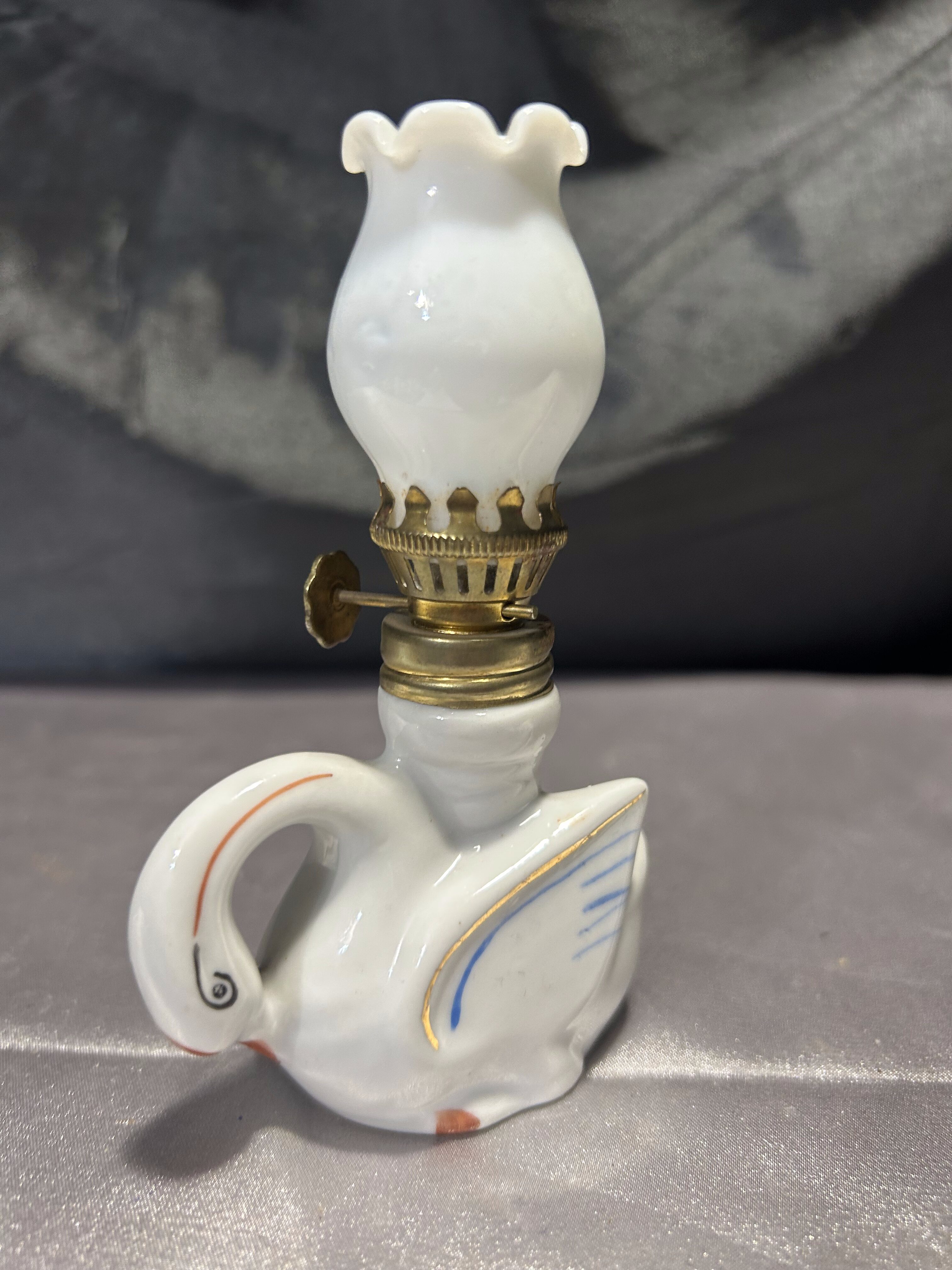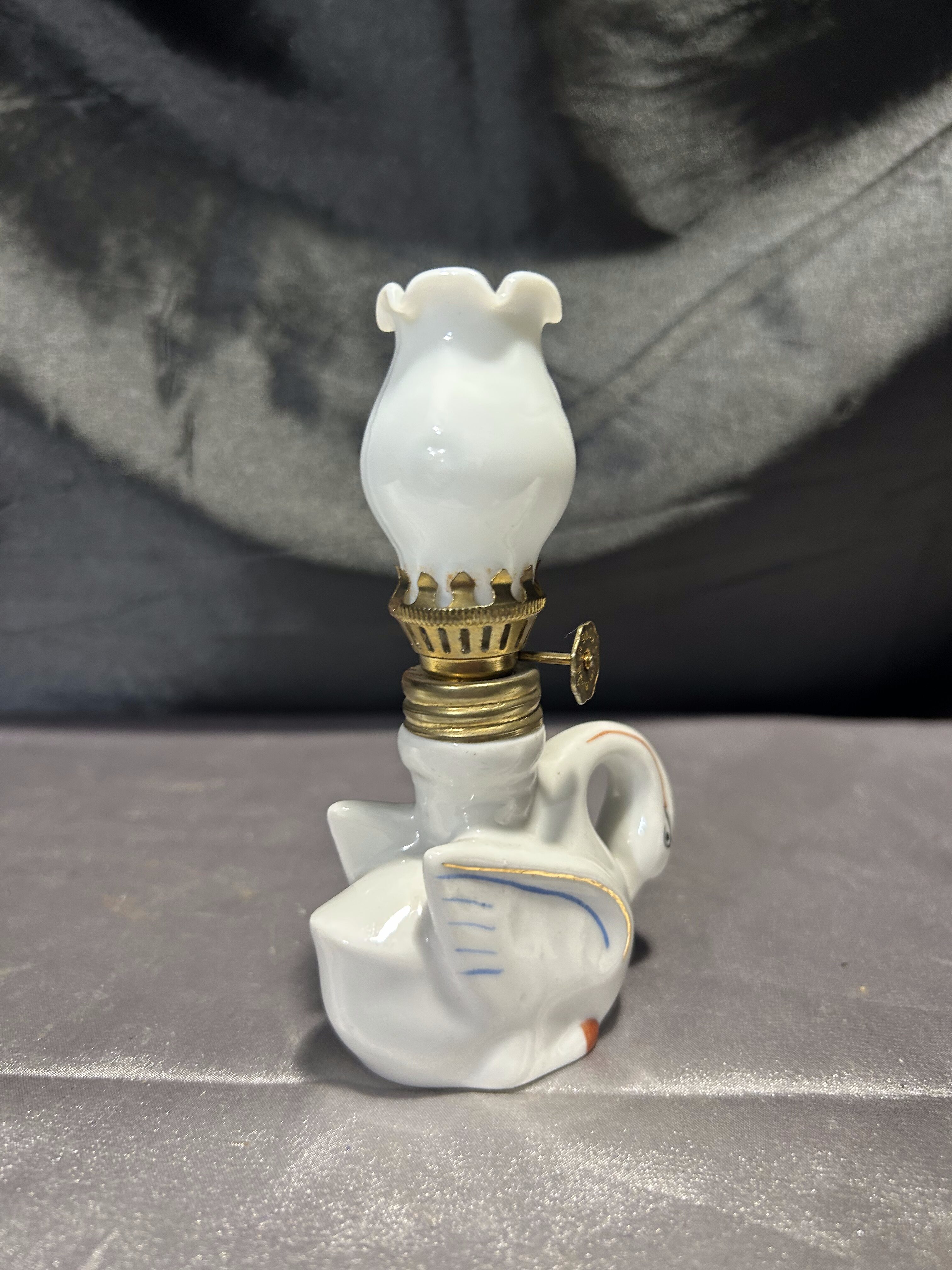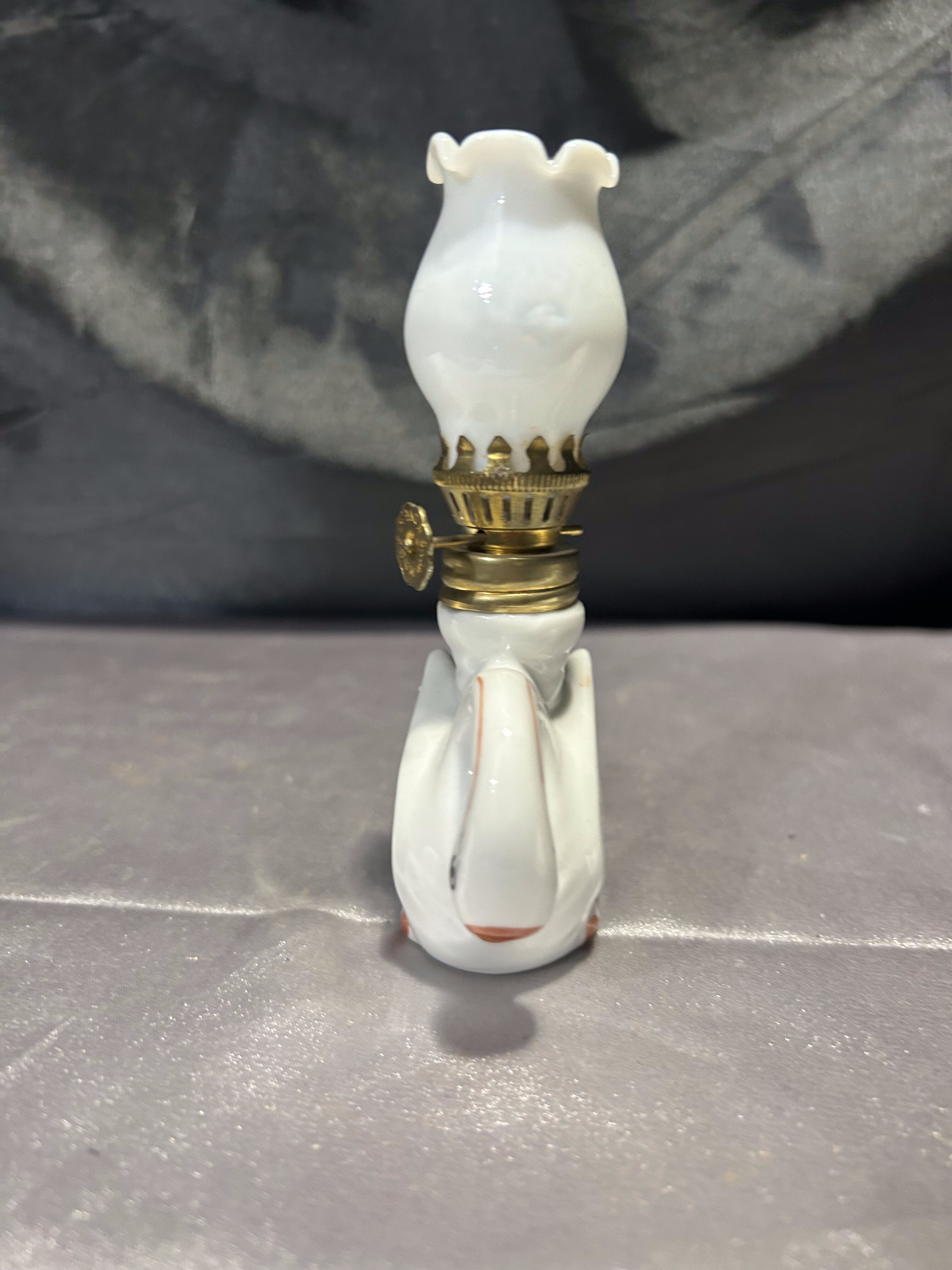- Lampa naftowa – Figurka łabędzia – Biały klosz z falbanką, sprawna
