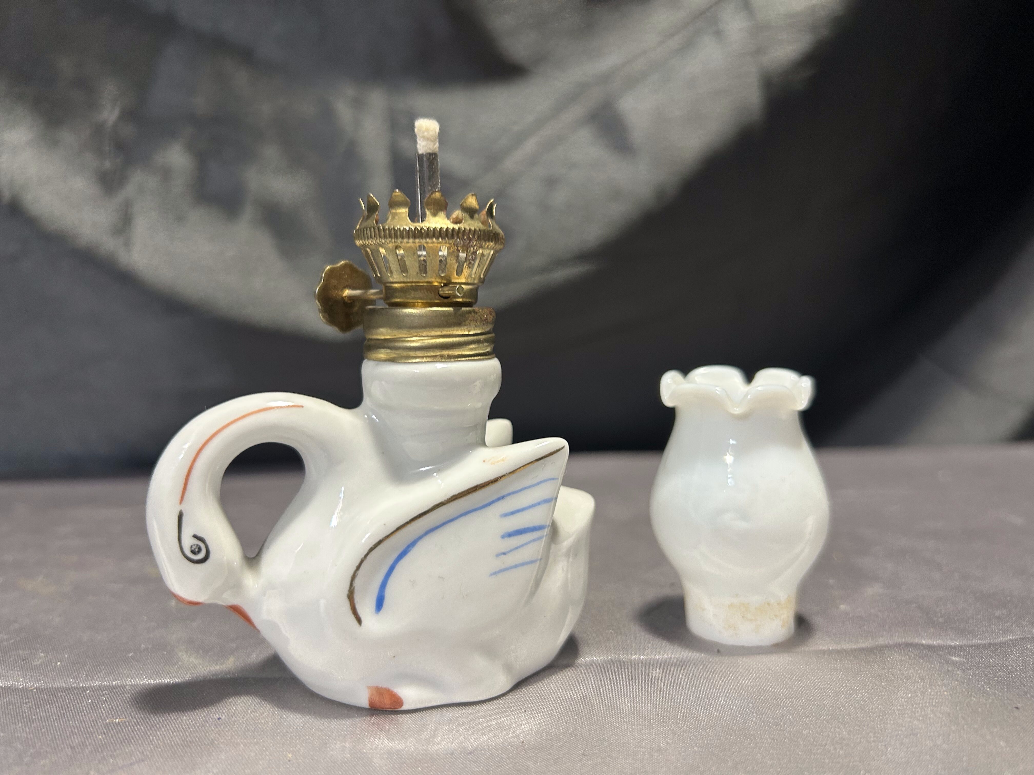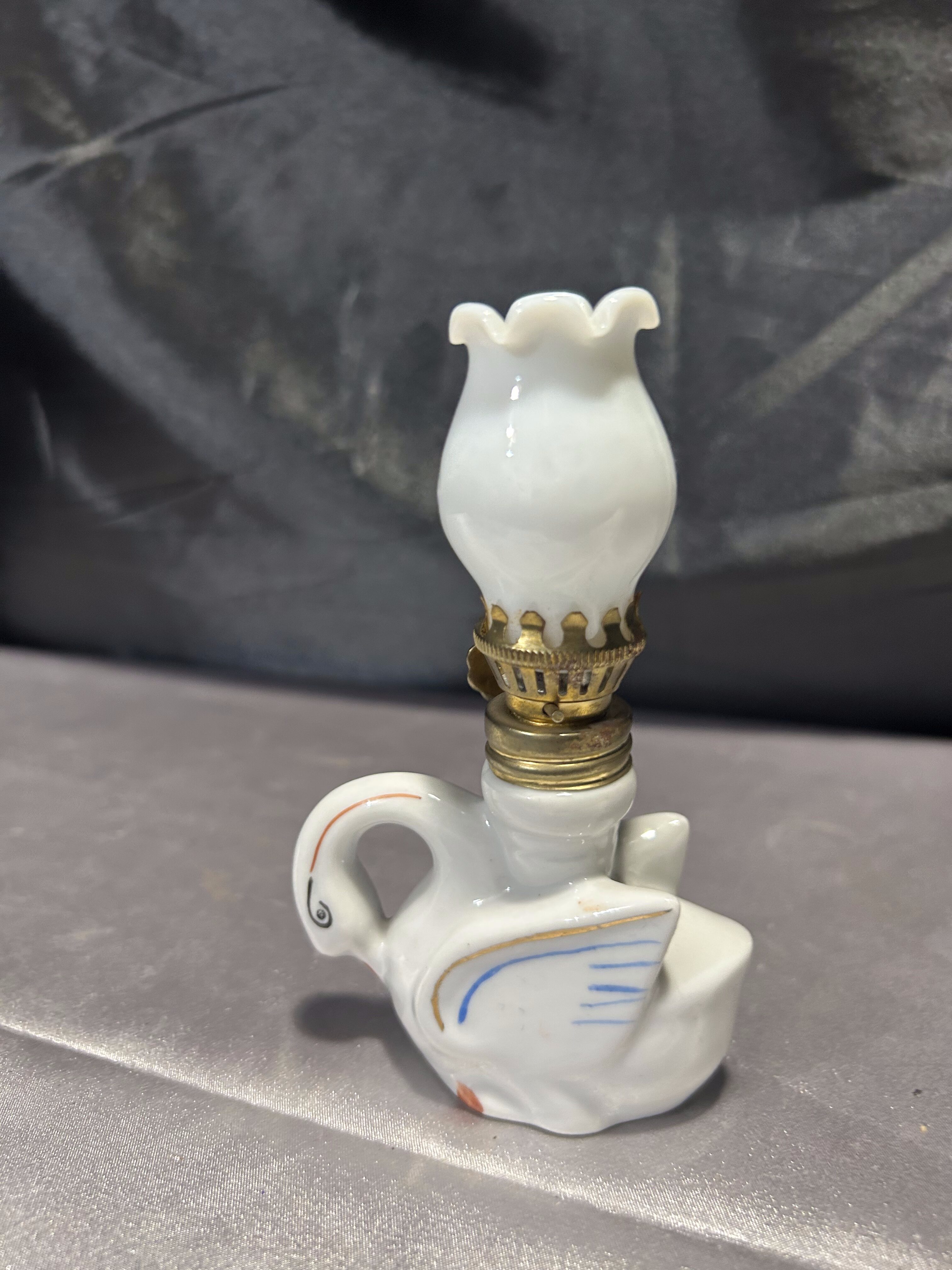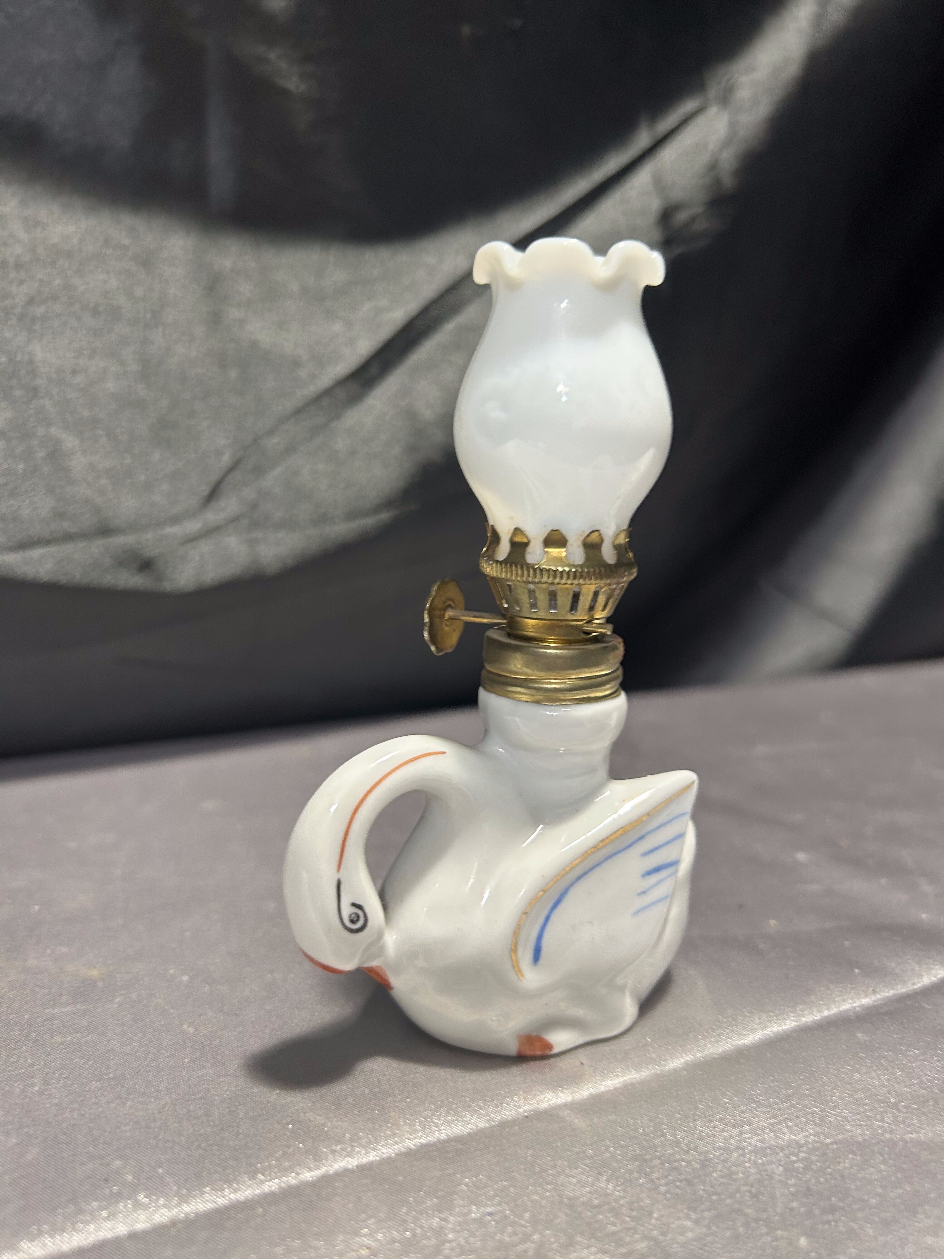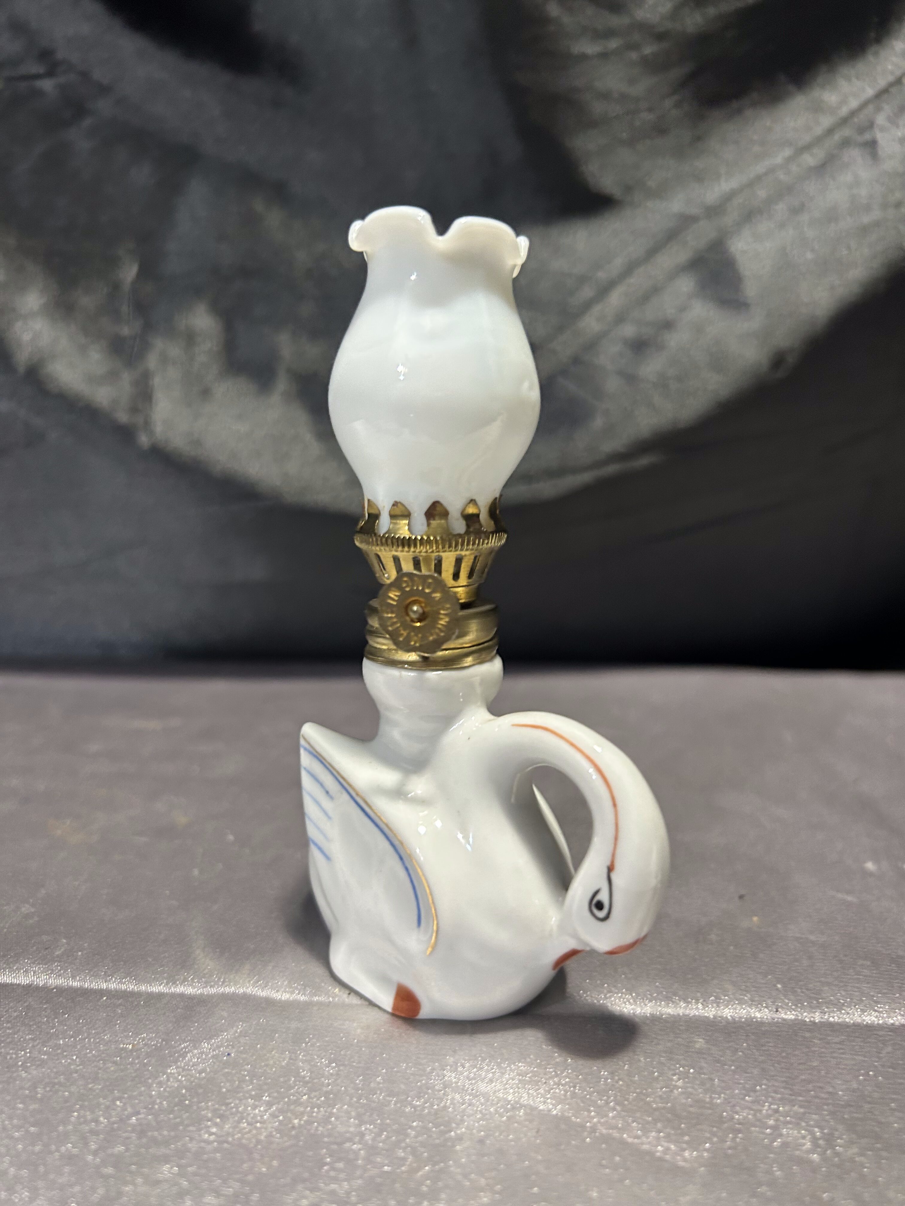 - Lampa naftowa – Figurka łabędzia – Biały klosz z falbanką, sprawna