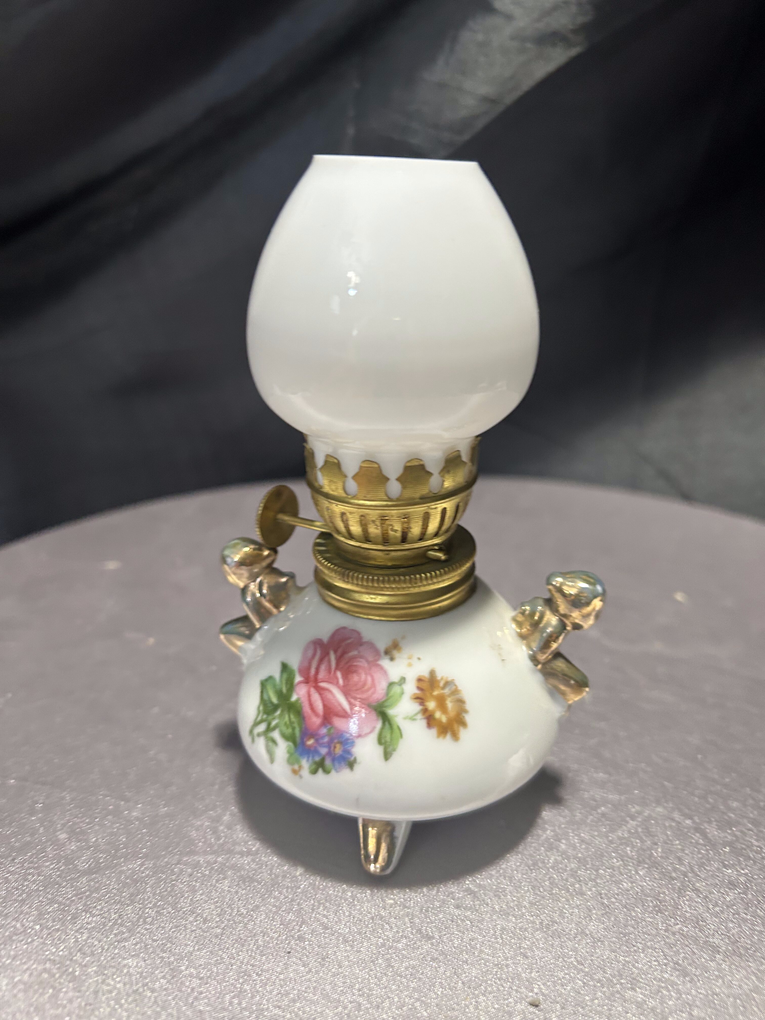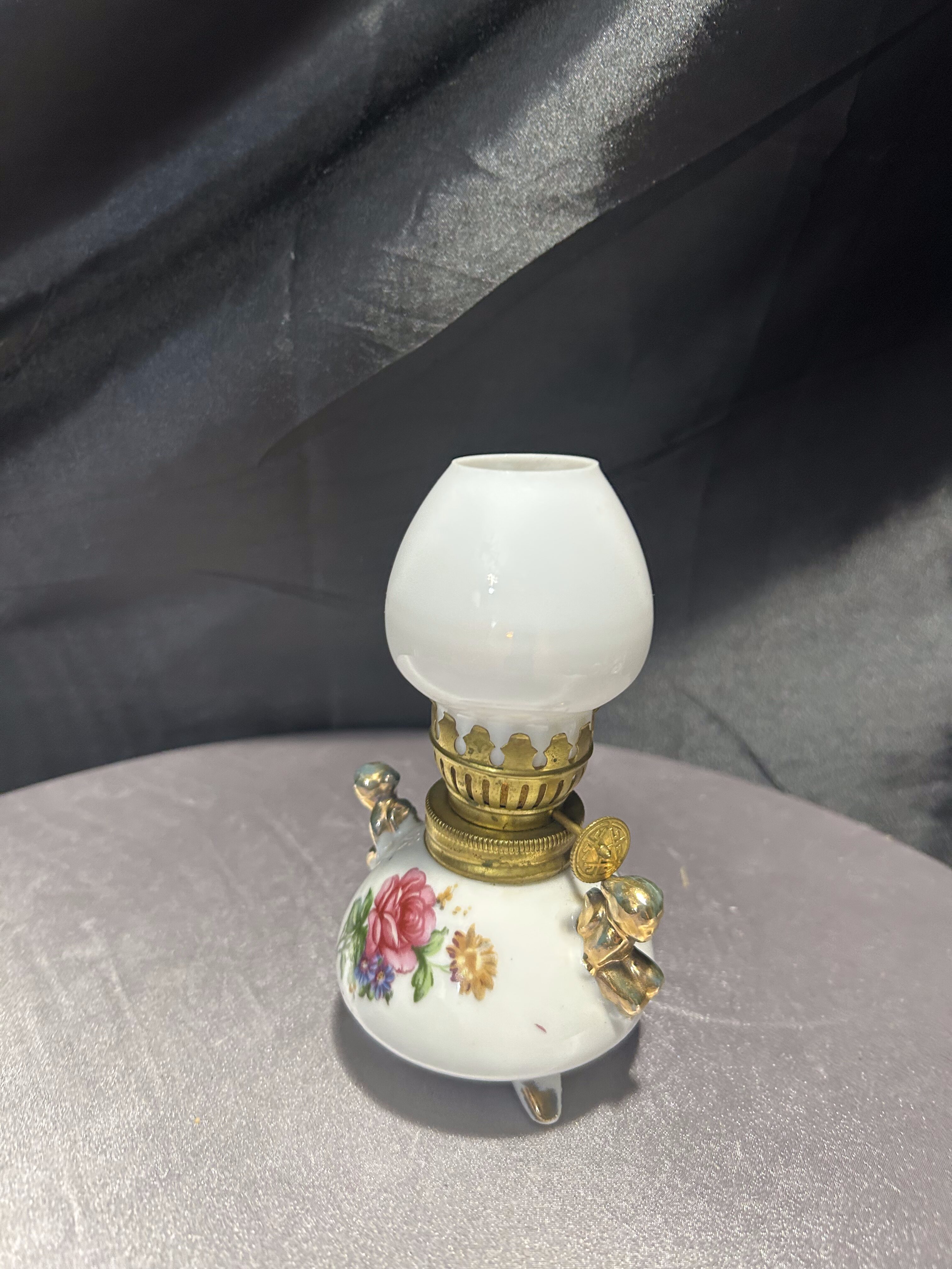 Lampa naftowa – kwiatowy motyw i złote akcenty – styl vintage