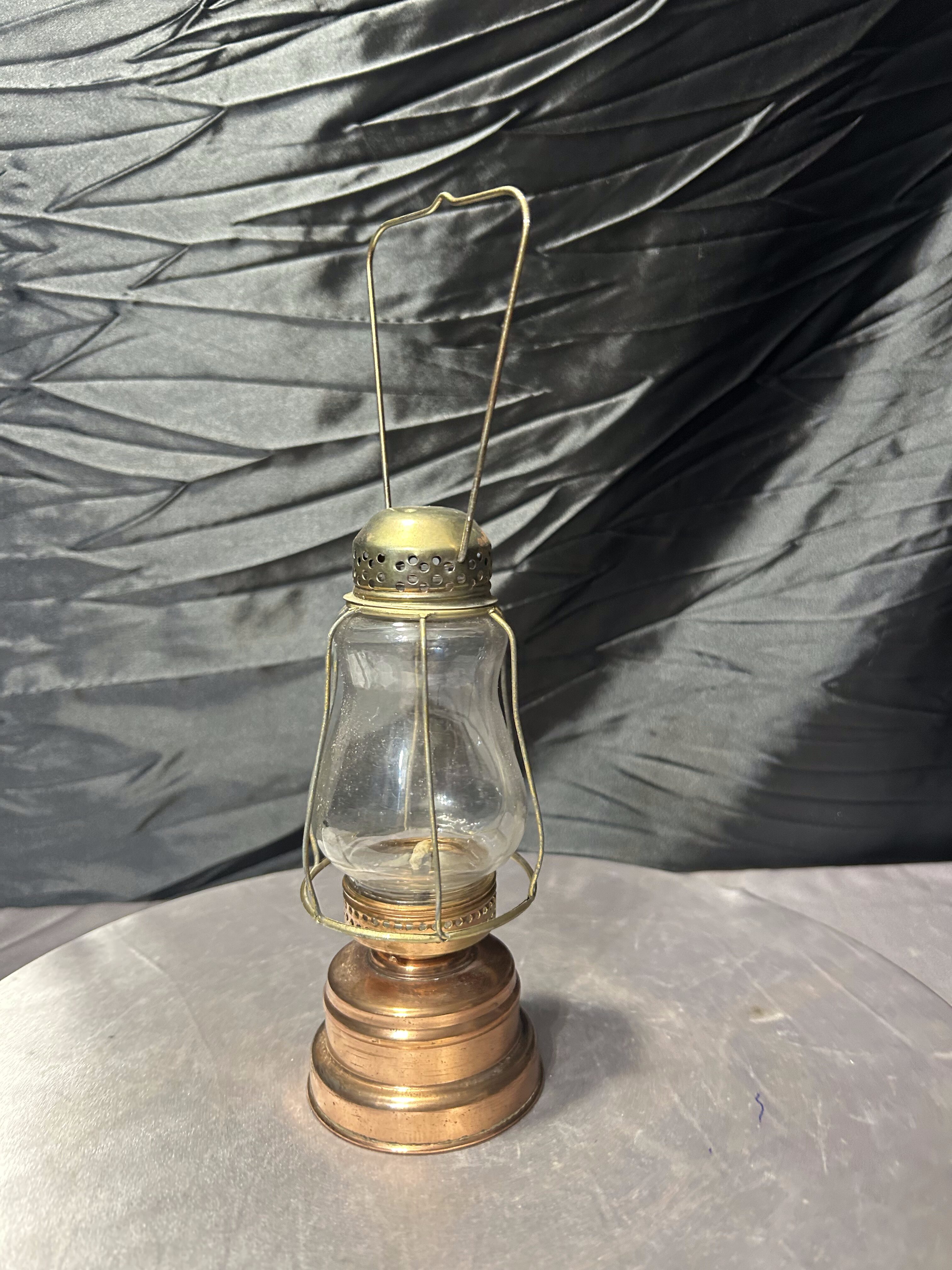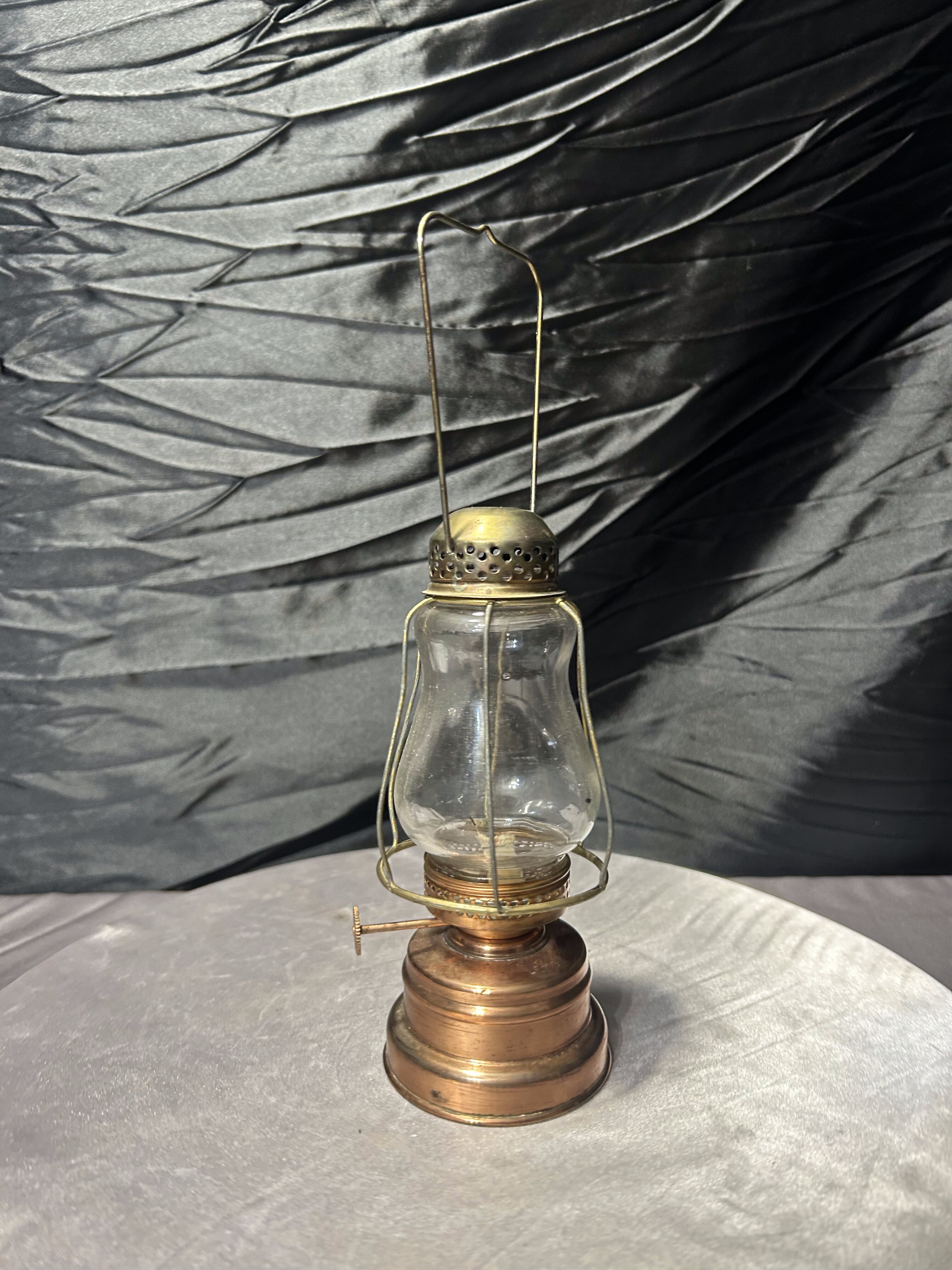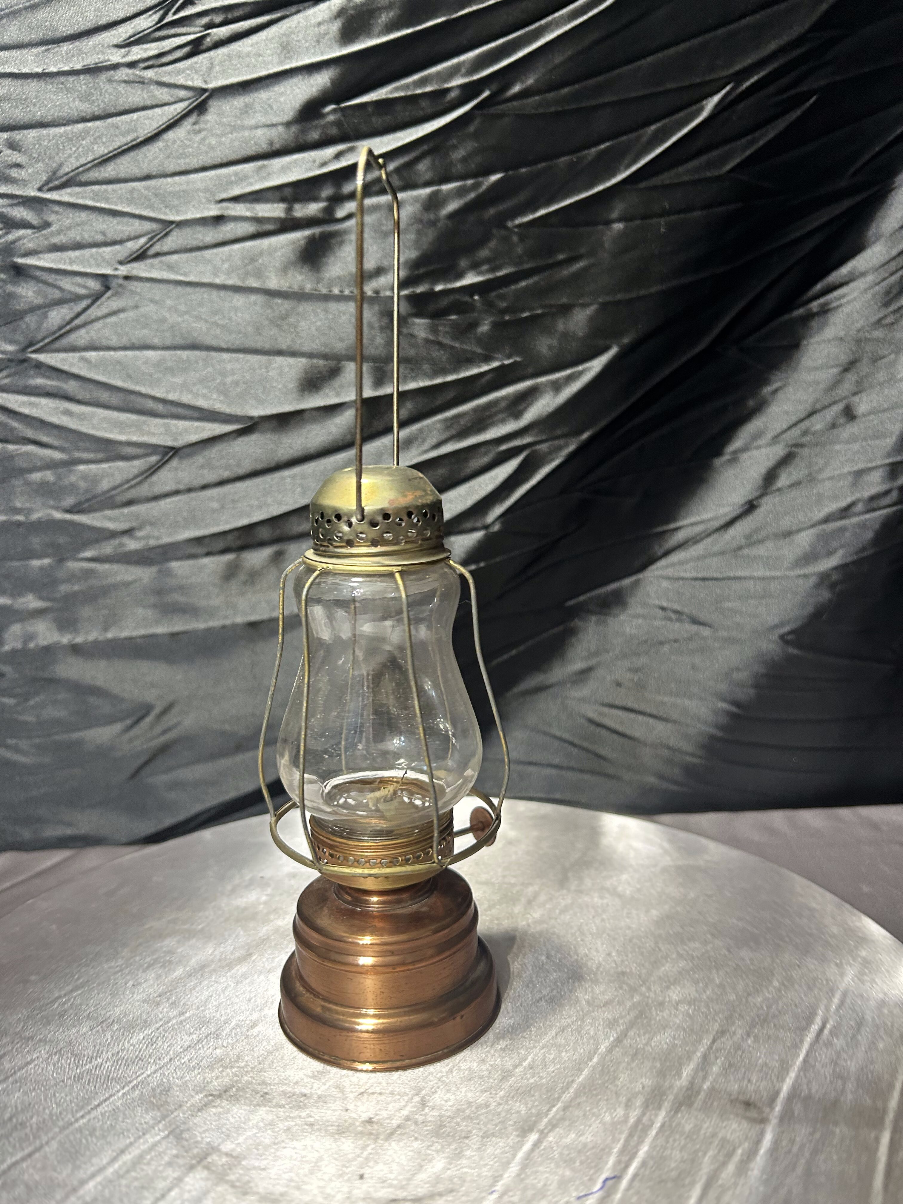 Oryginalna lampa naftowa wykonana z miedzi, o klasycznej, smukłej formie, wyposażona w metalowy uchwyt umożliwiający przenoszenie lub zawieszenie. Model z szklanym kloszem, osadzony na stabilnej, miedzianej podstawie. Zachowana w naturalnej patynie, która podkreśla jej autentyczny, vintage’owy charakter.