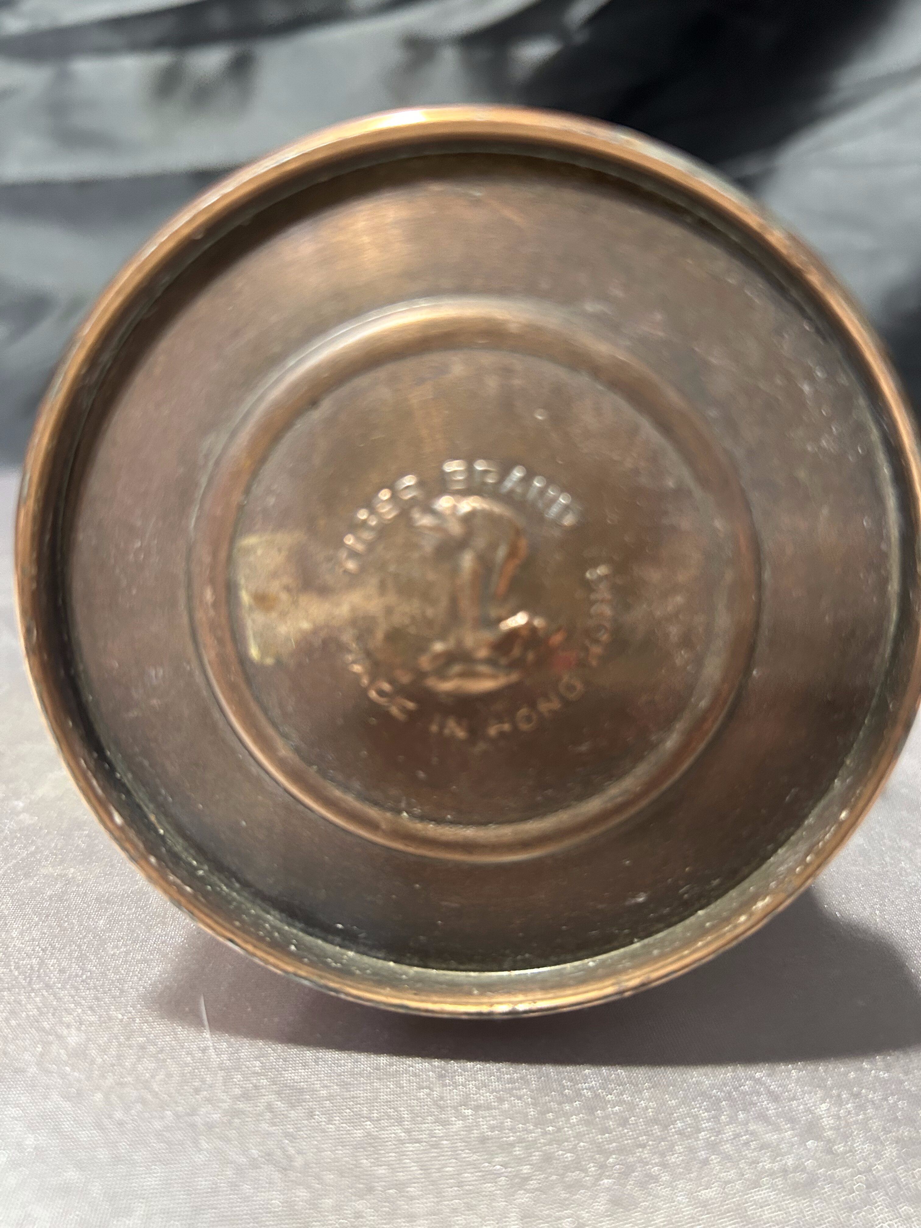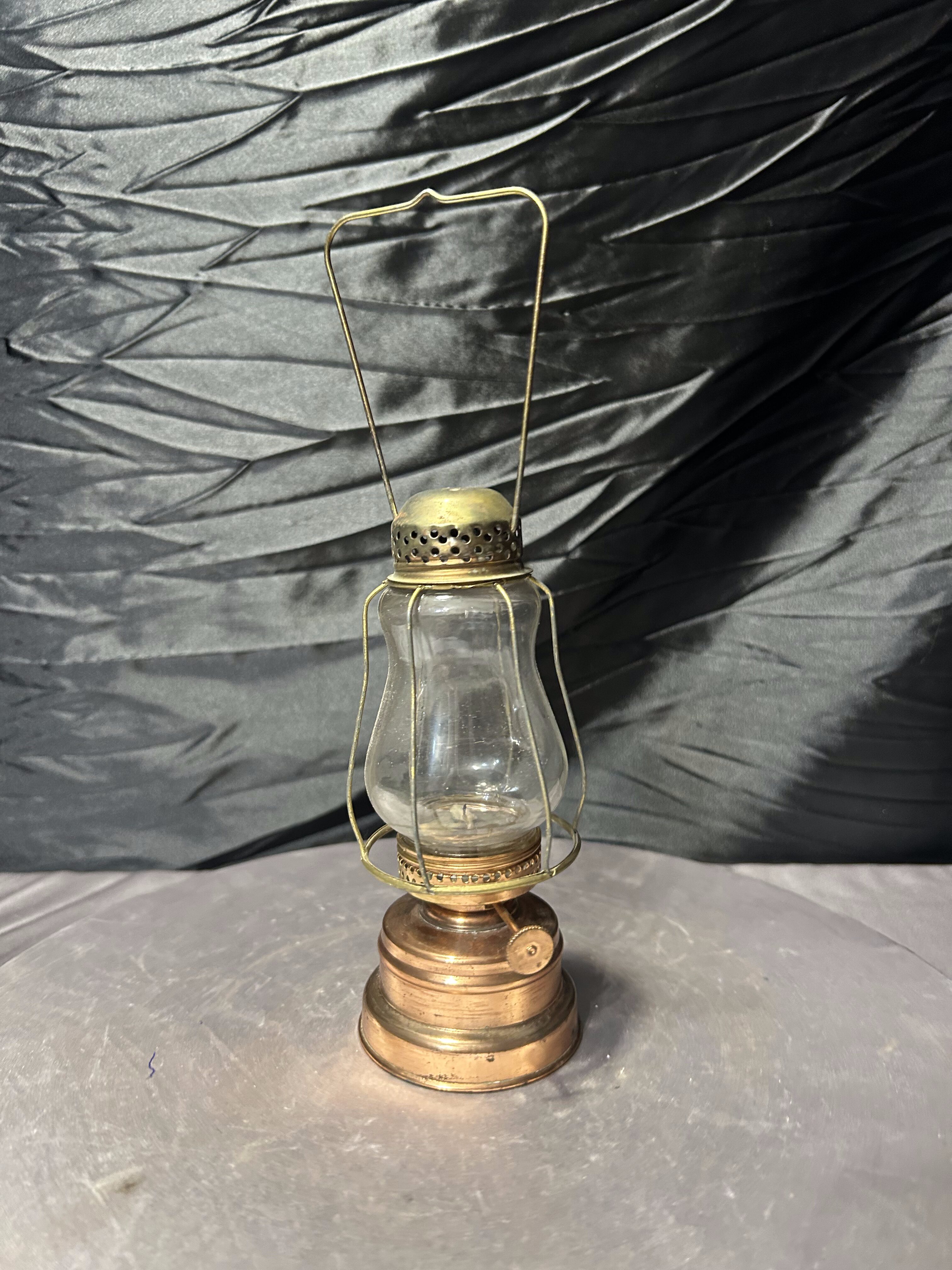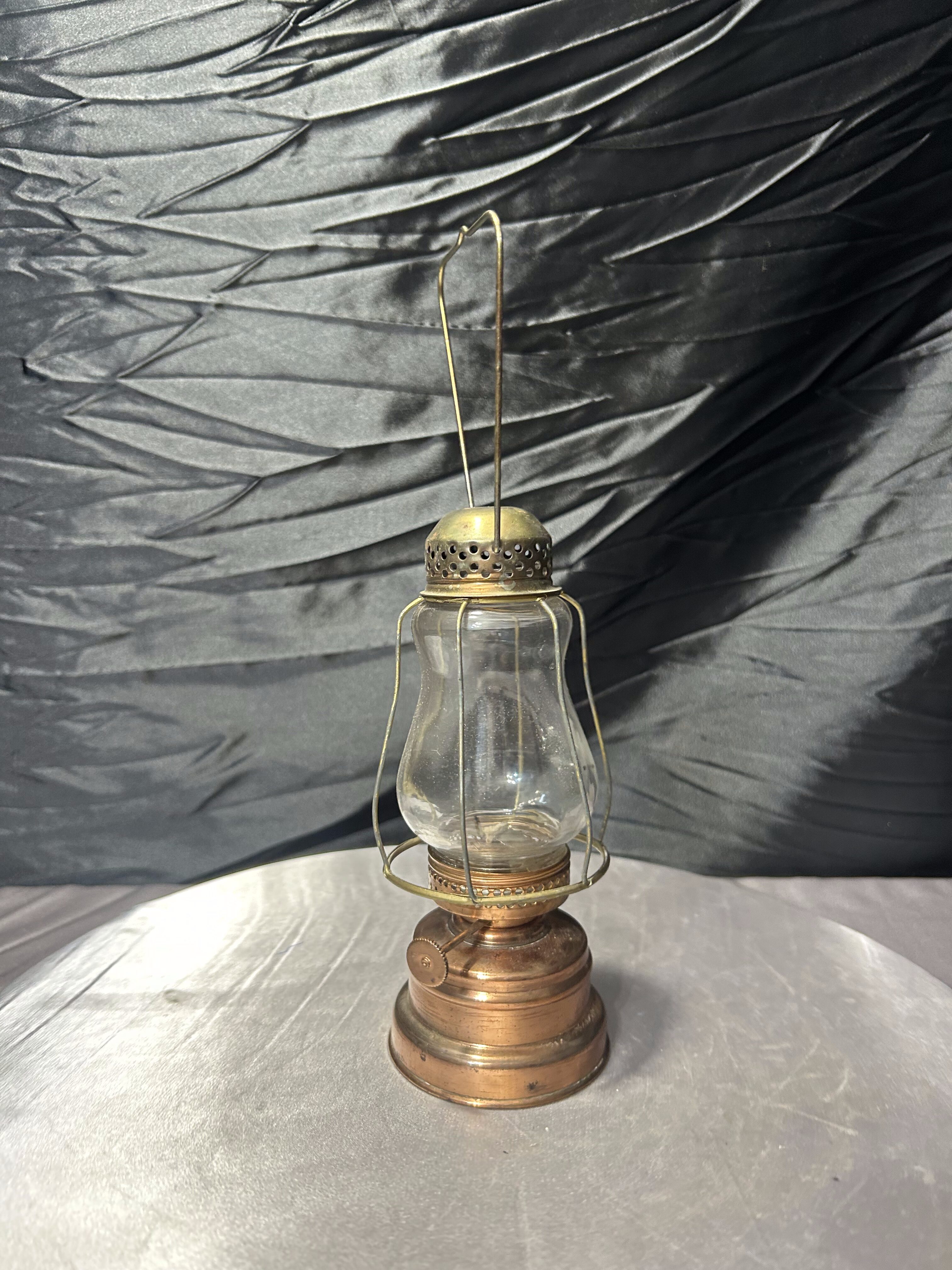 Oryginalna lampa naftowa wykonana z miedzi, o klasycznej, smukłej formie, wyposażona w metalowy uchwyt umożliwiający przenoszenie lub zawieszenie. Model z szklanym kloszem, osadzony na stabilnej, miedzianej podstawie. Zachowana w naturalnej patynie, która podkreśla jej autentyczny, vintage’owy charakter.