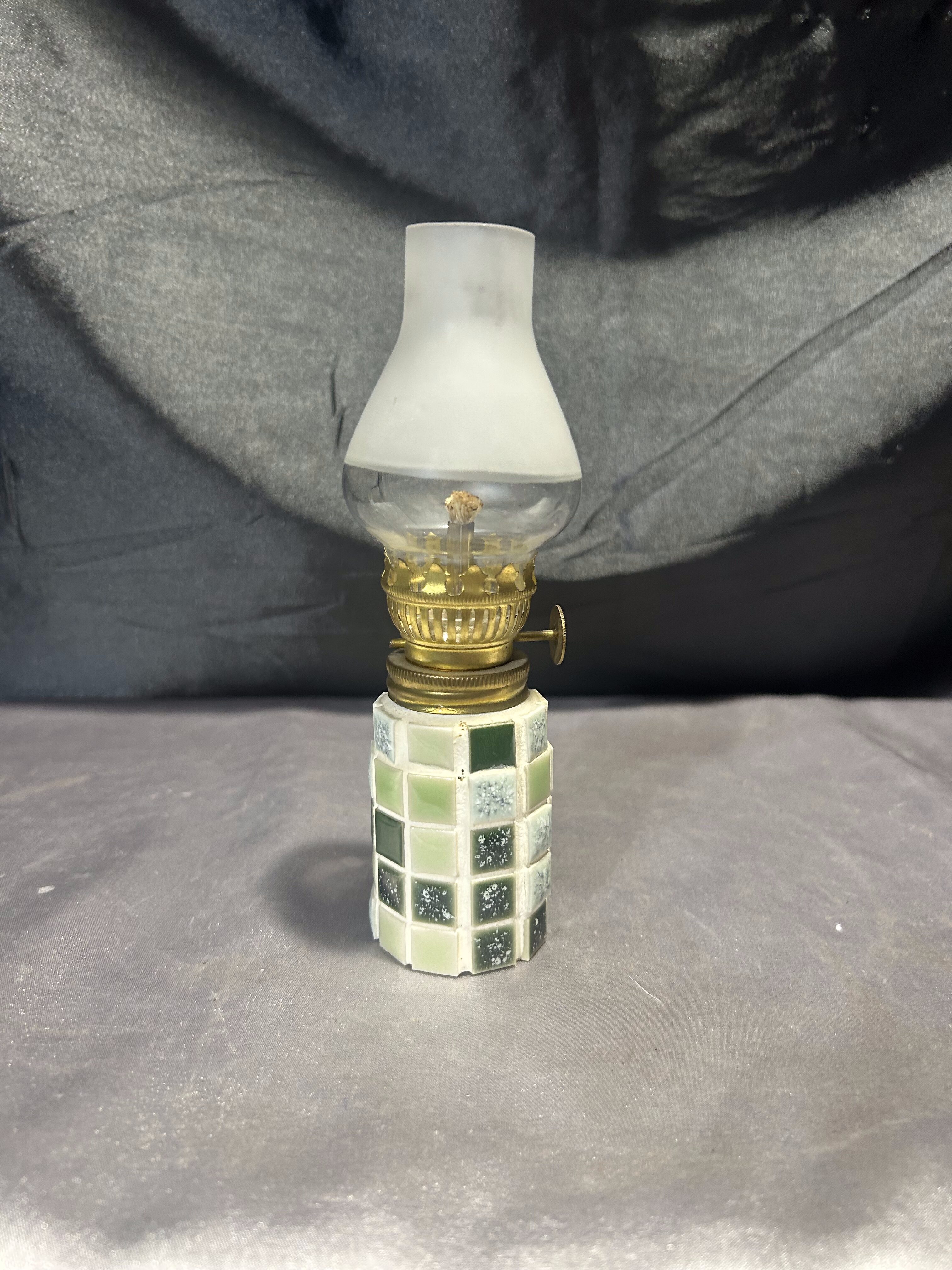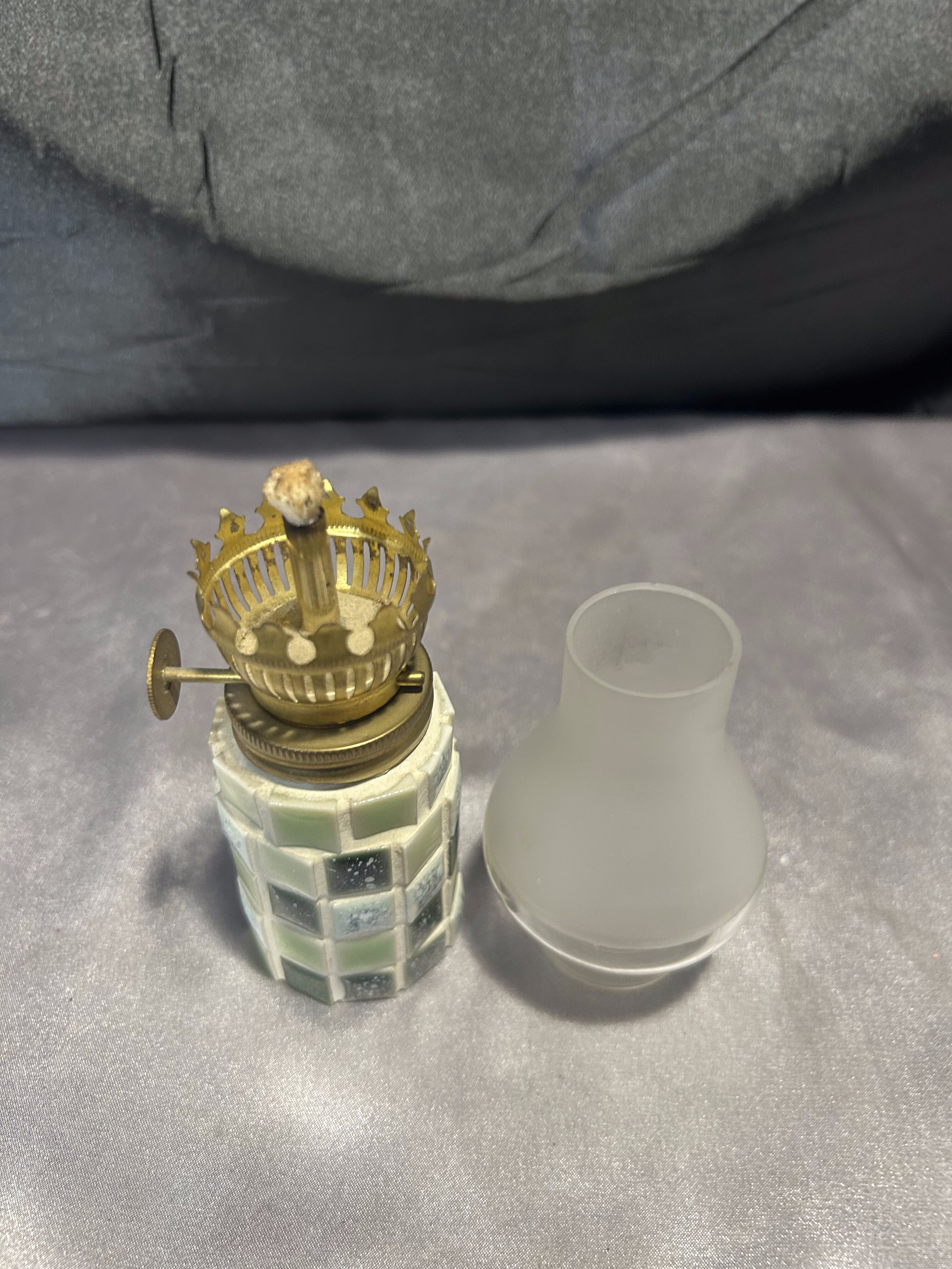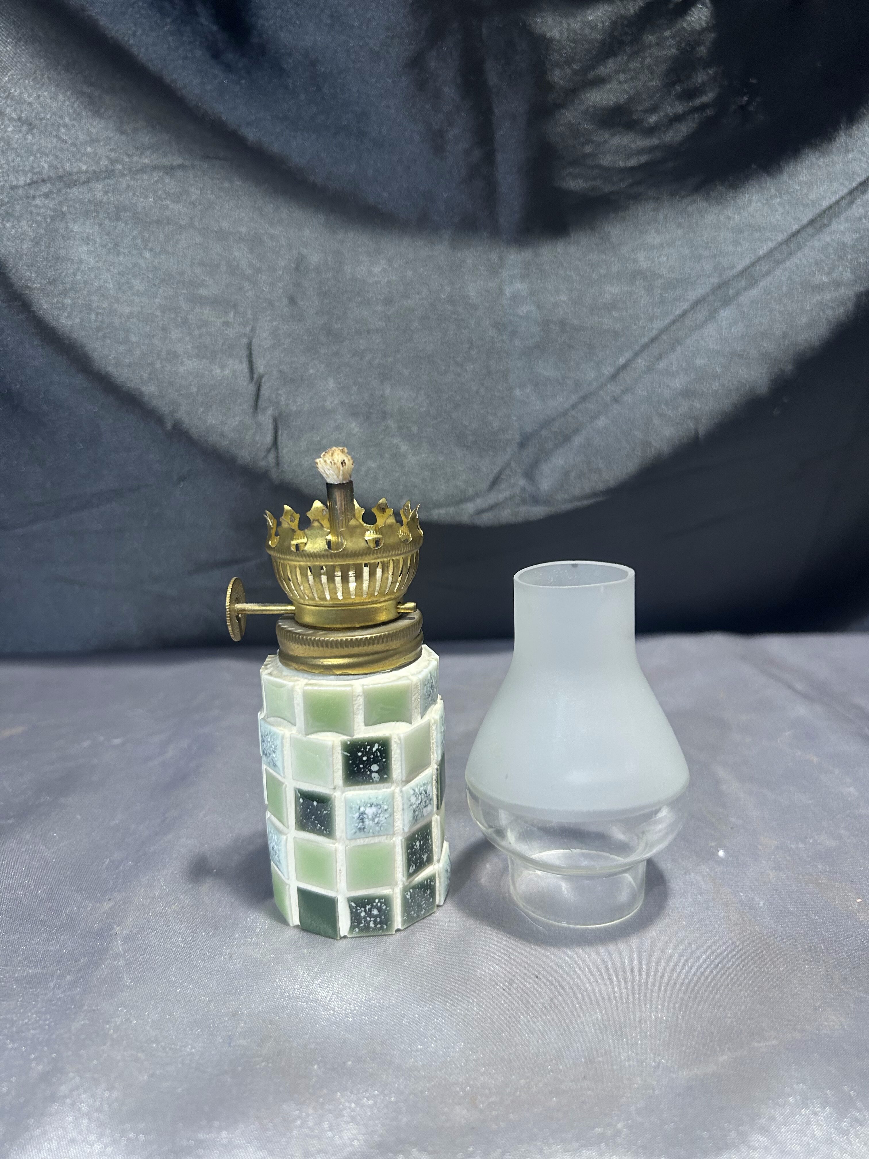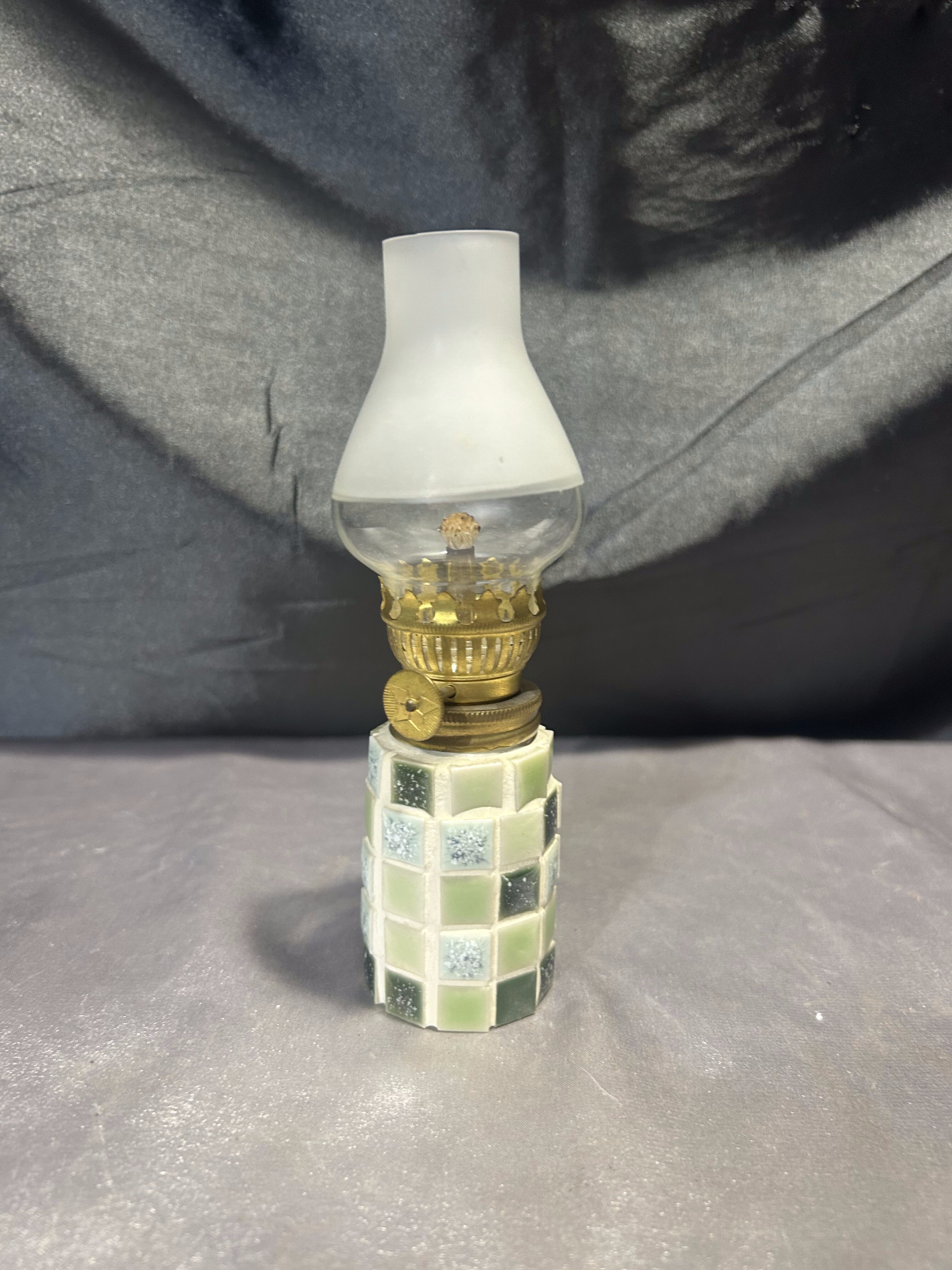 Na sprzedaż klasyczna, sprawna lampa naftowa, ozdobiona zielonymi szkiełkami, które nadają jej wyjątkowego uroku i subtelnego charakteru. Jej kompaktowe wymiary sprawiają, że świetnie sprawdzi się jako nastrojowe źródło światła lub dekoracyjny akcent w stylu retro, rustykalnym lub boho.