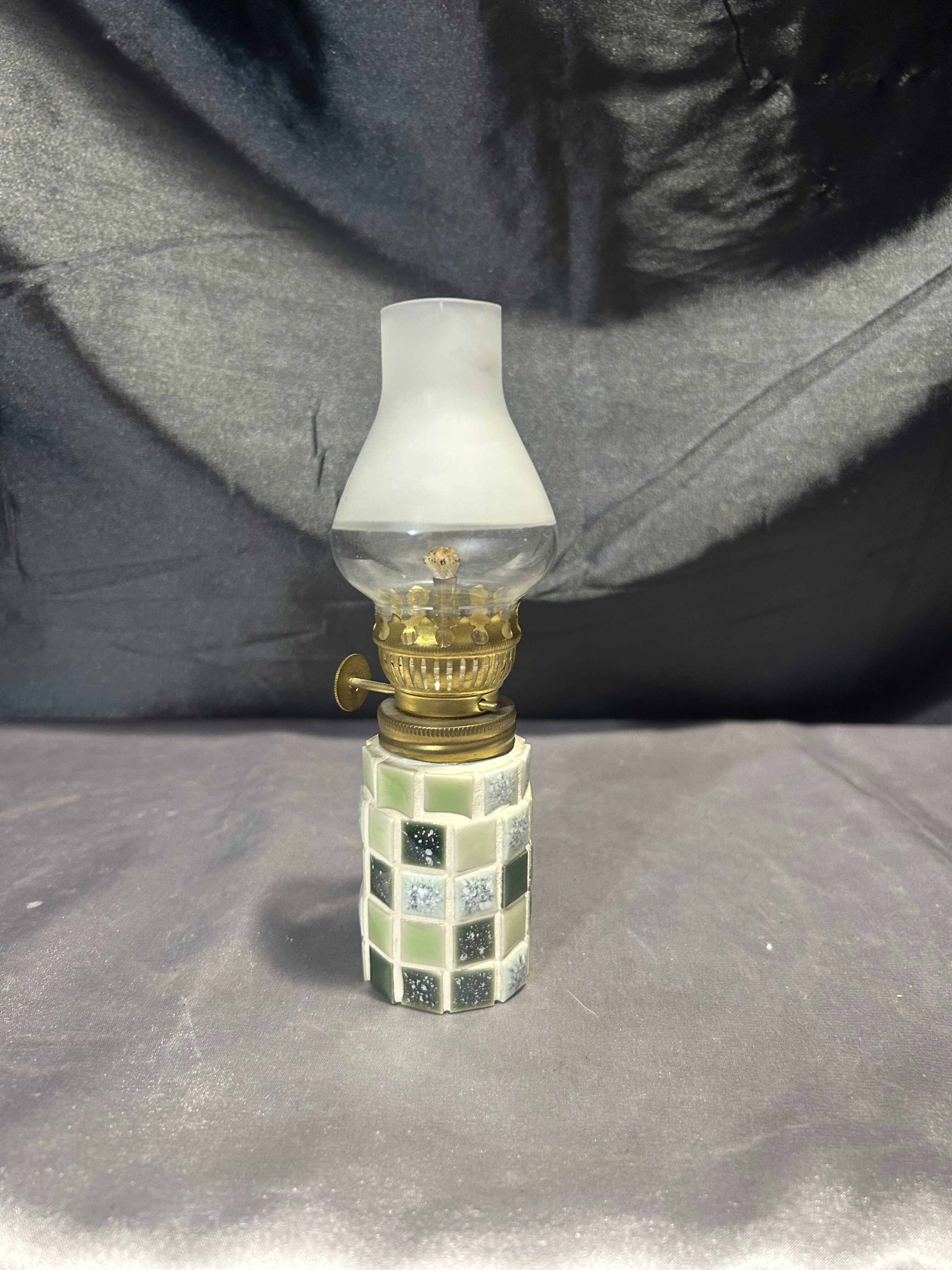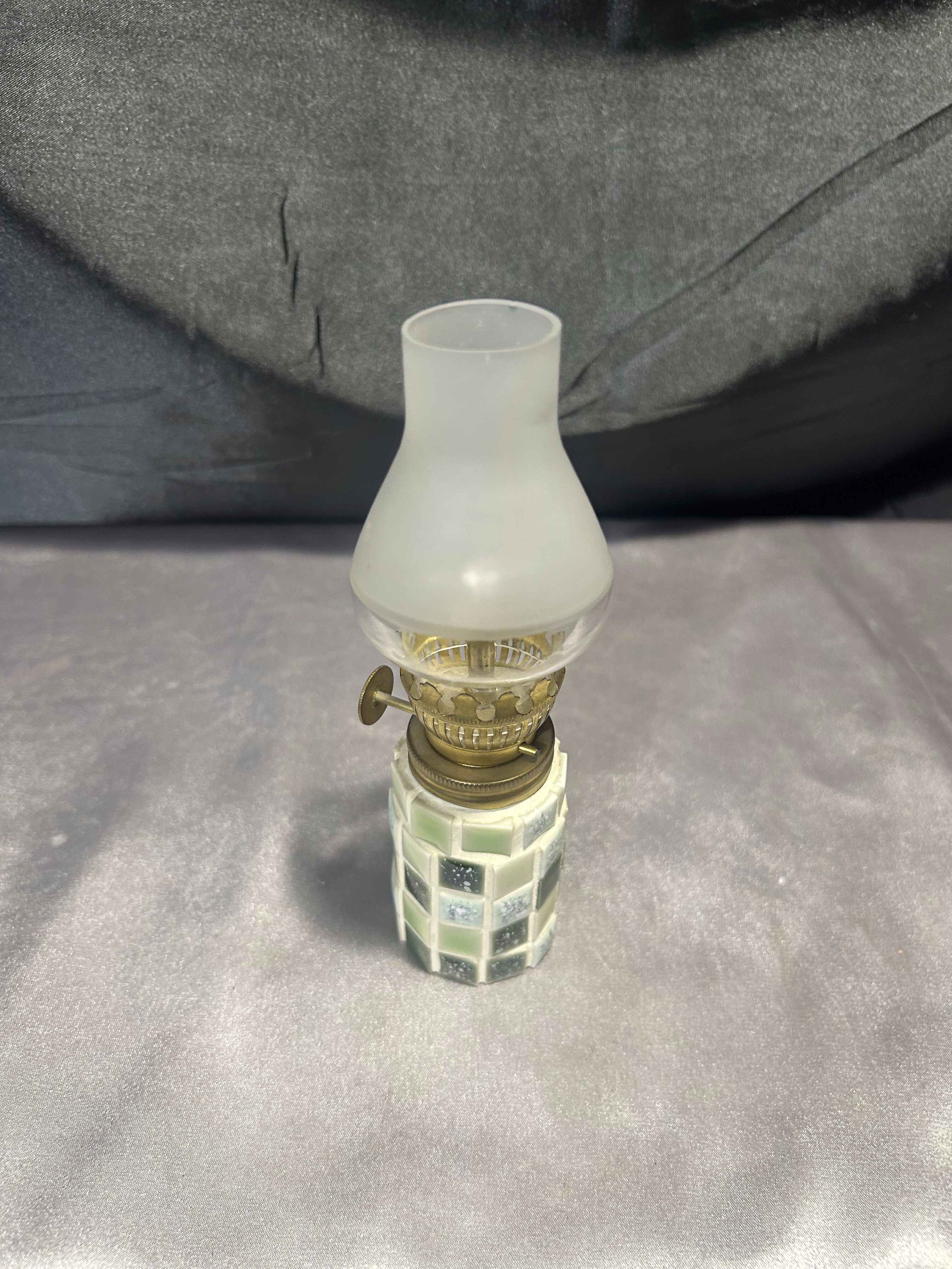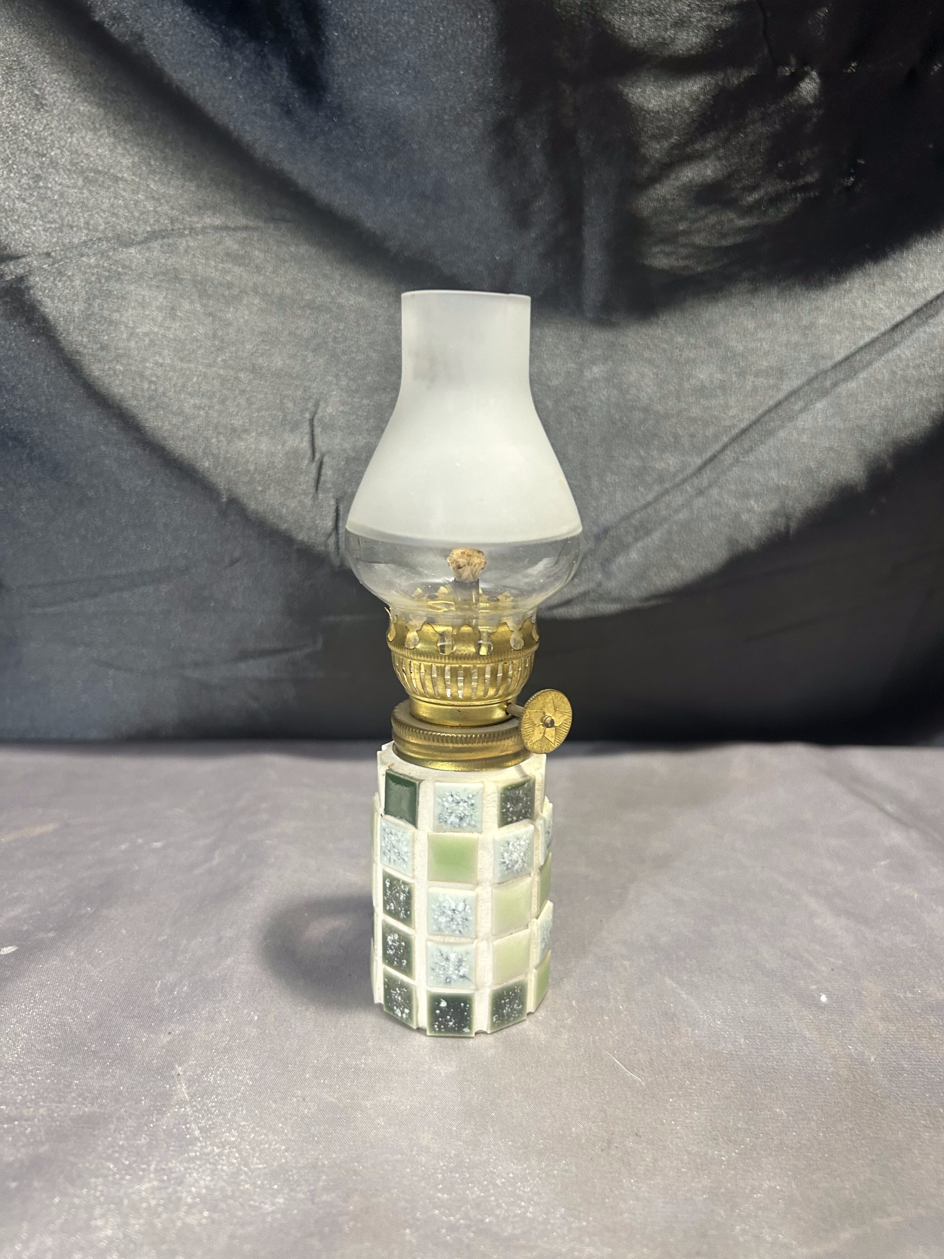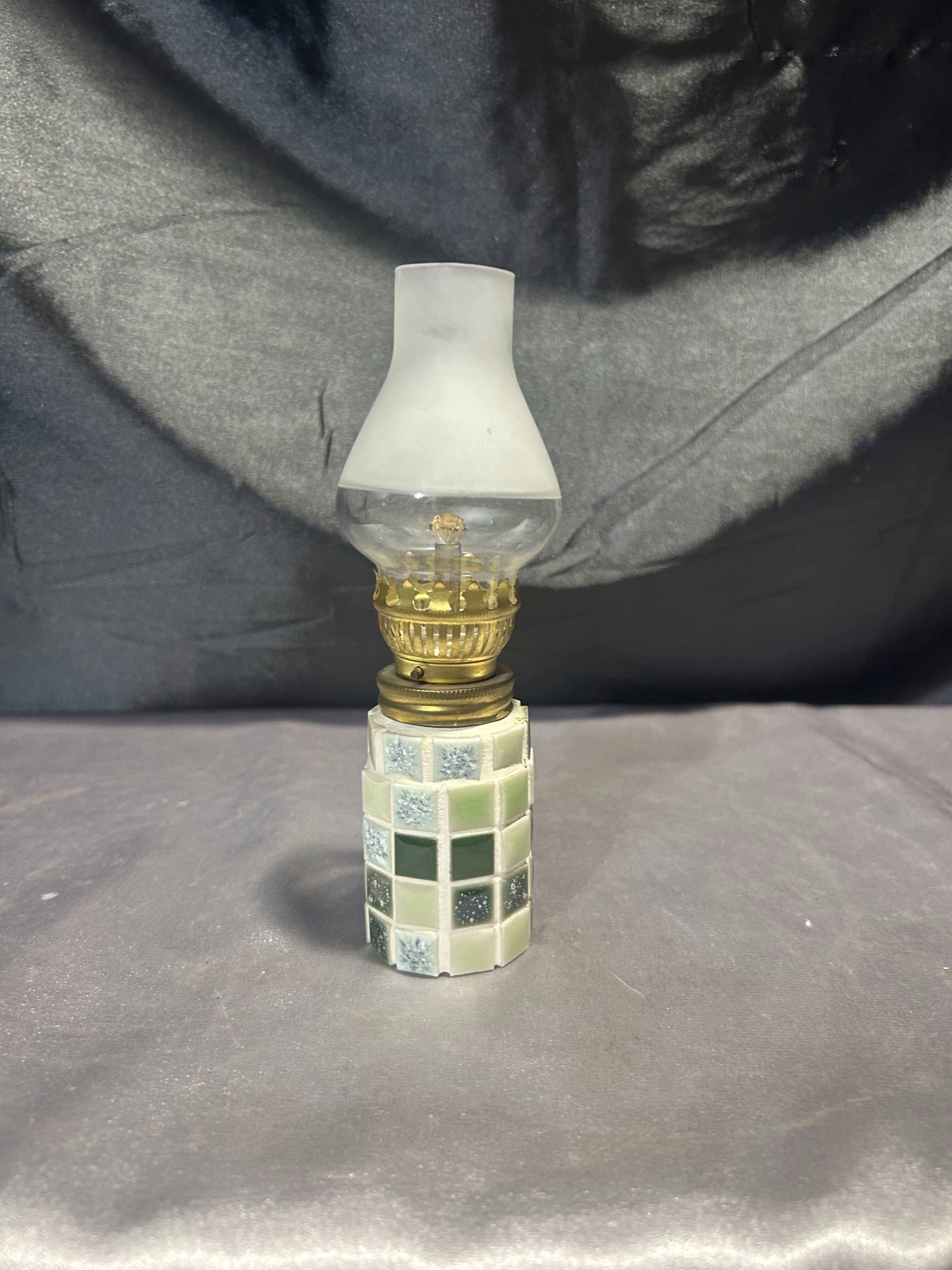 Na sprzedaż klasyczna, sprawna lampa naftowa, ozdobiona zielonymi szkiełkami, które nadają jej wyjątkowego uroku i subtelnego charakteru. Jej kompaktowe wymiary sprawiają, że świetnie sprawdzi się jako nastrojowe źródło światła lub dekoracyjny akcent w stylu retro, rustykalnym lub boho.