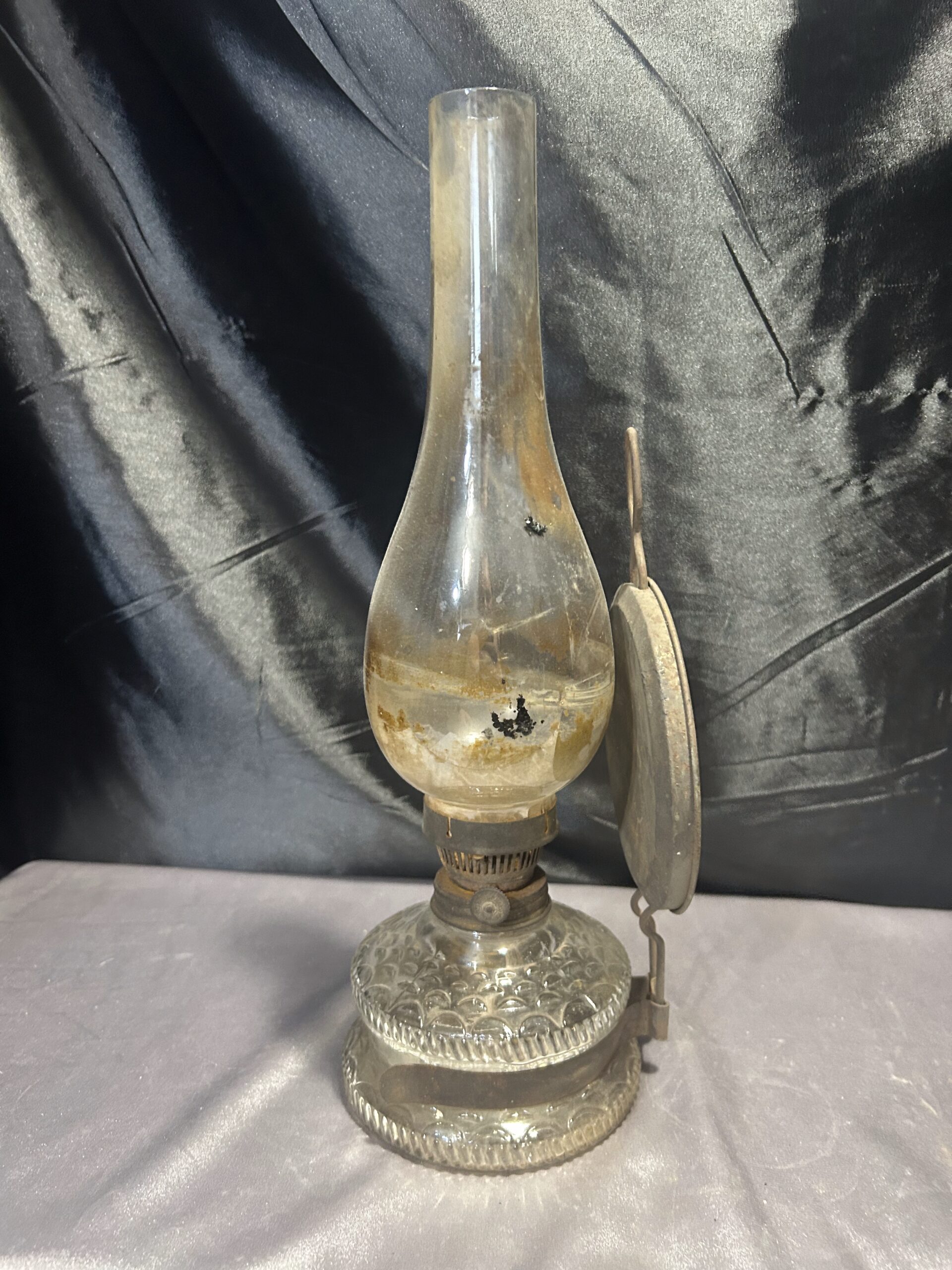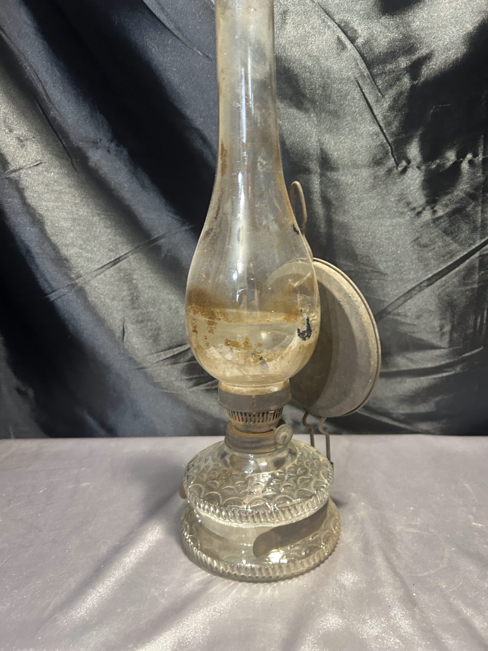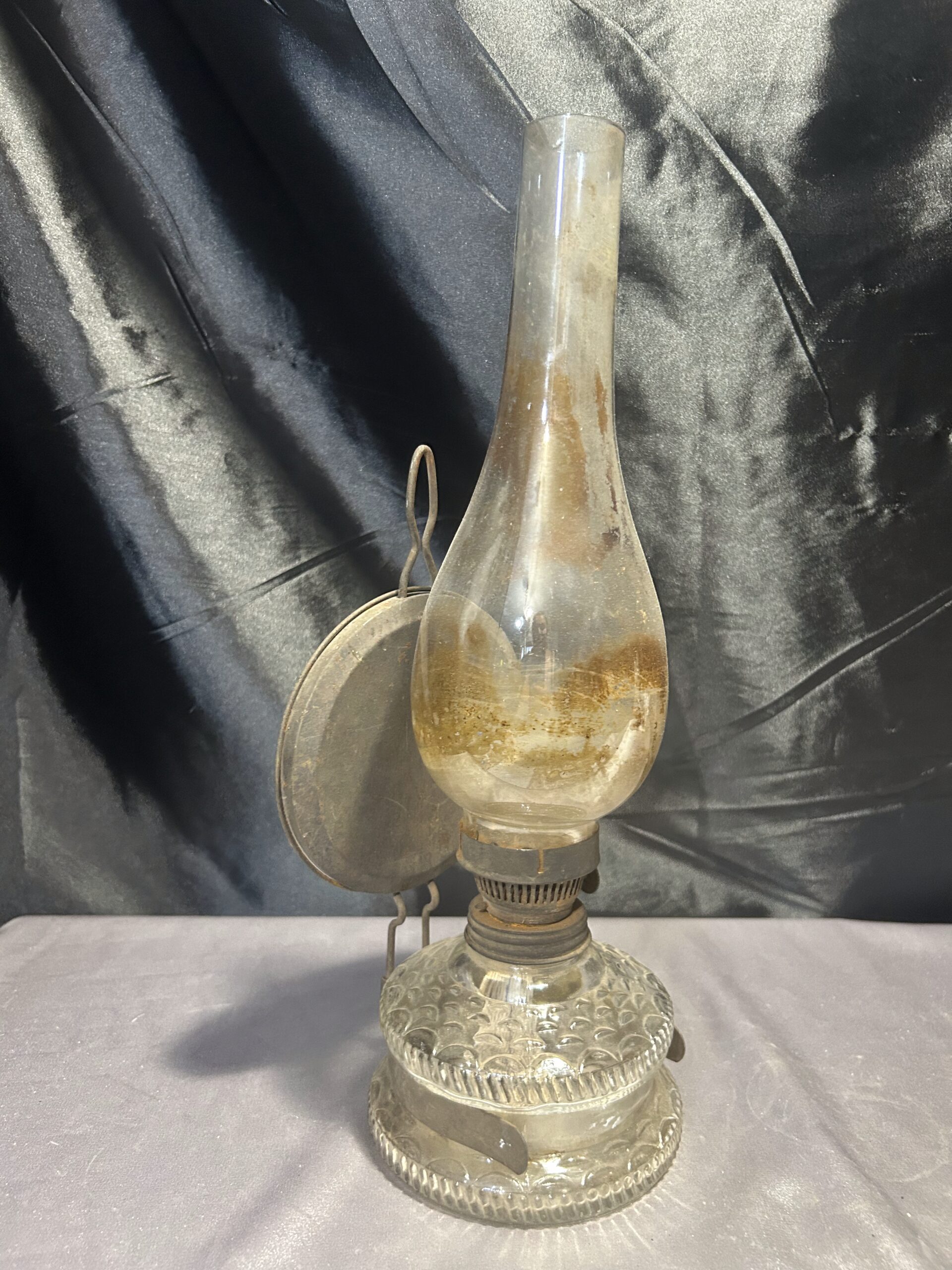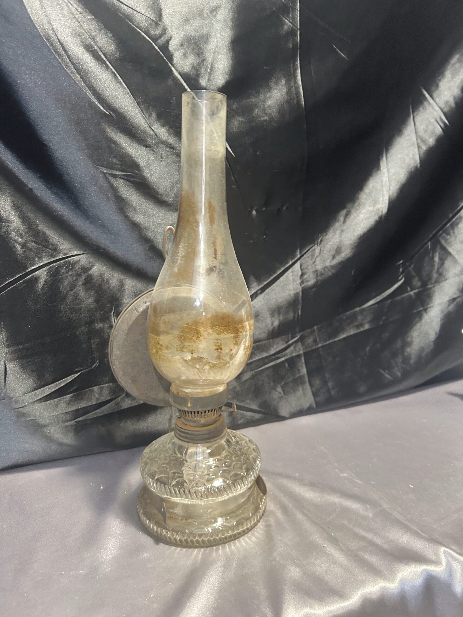 Funkcjonalna i elegancka lampa naftowa wykonana z transparentnego, zdobionego szkła. Wyposażona w metalowy talerz z tyłu, który zwiększa efektywność rozpraszania światła. Lampa była używana, co widoczne jest w postaci lekkiego osmolenia, dodającego jej autentycznego charakteru. W pełni sprawna, może być zarówno postawiona, jak i powieszona.