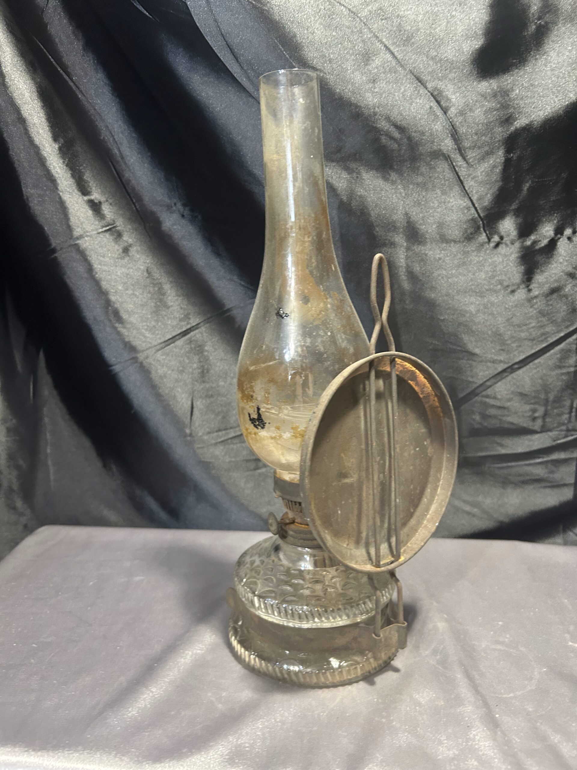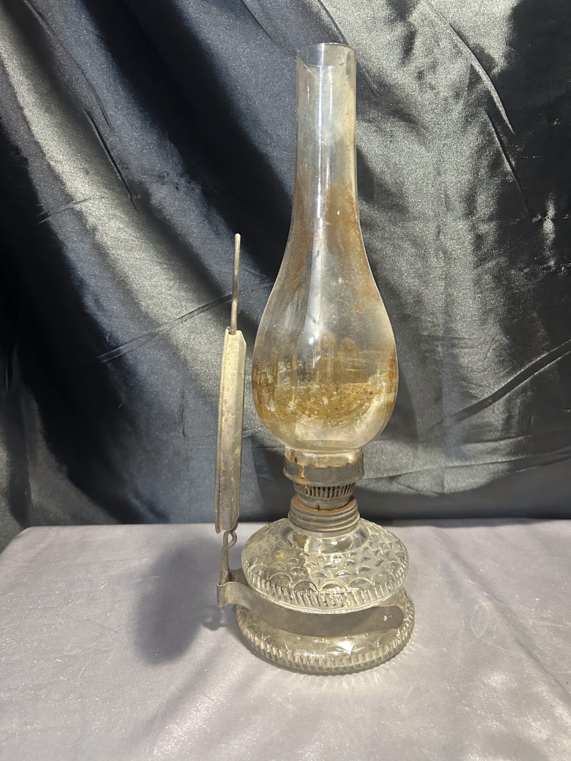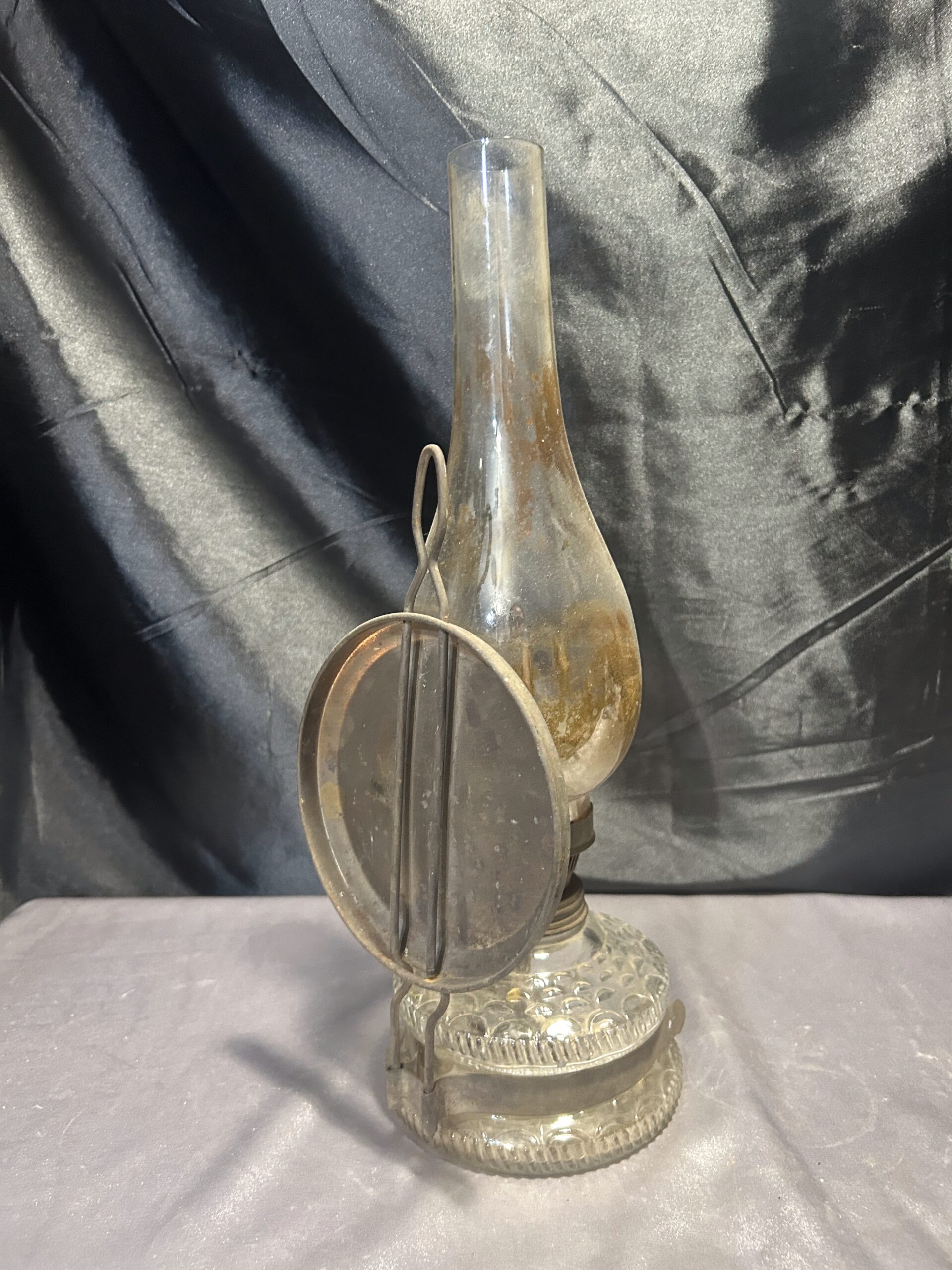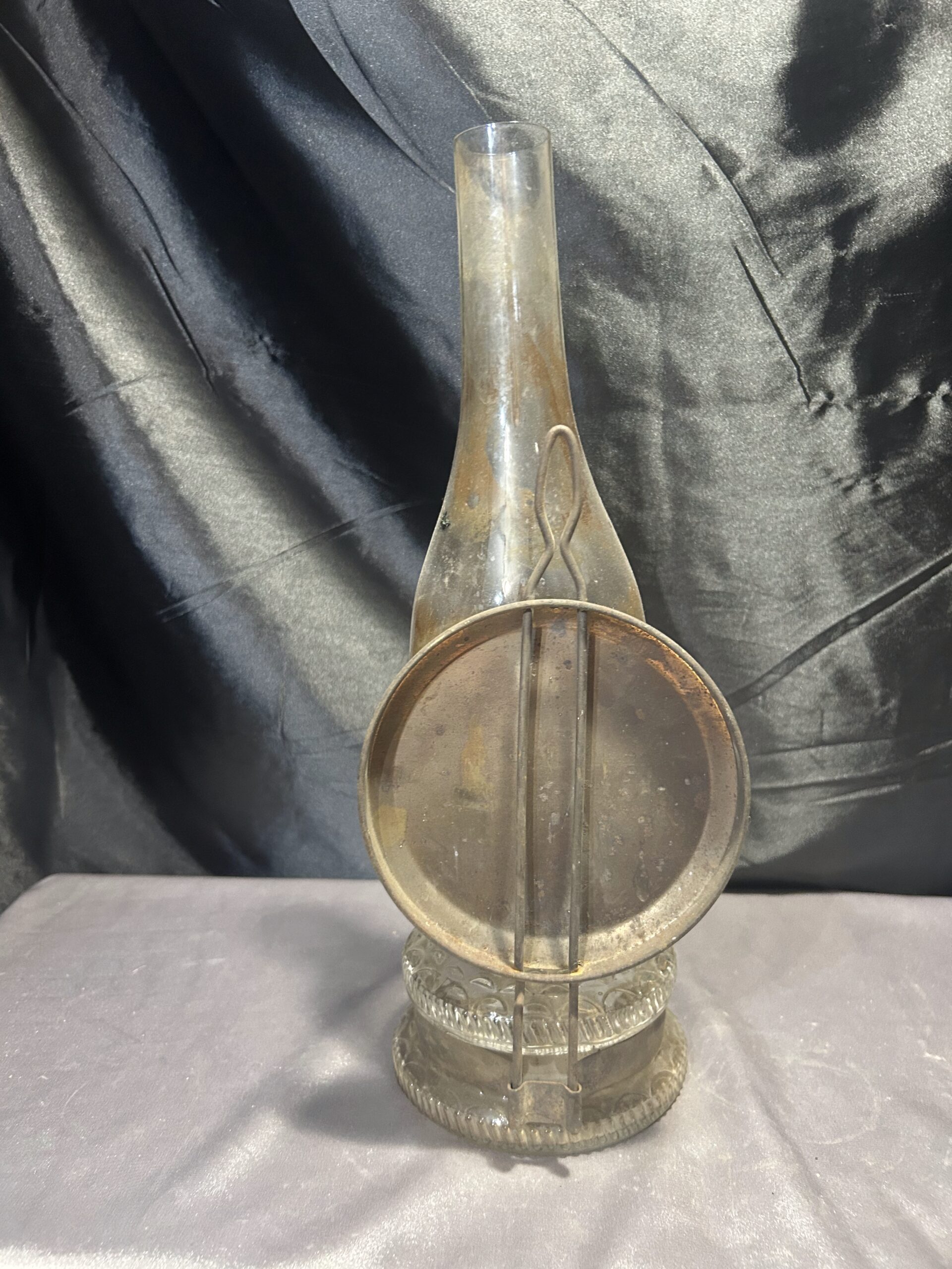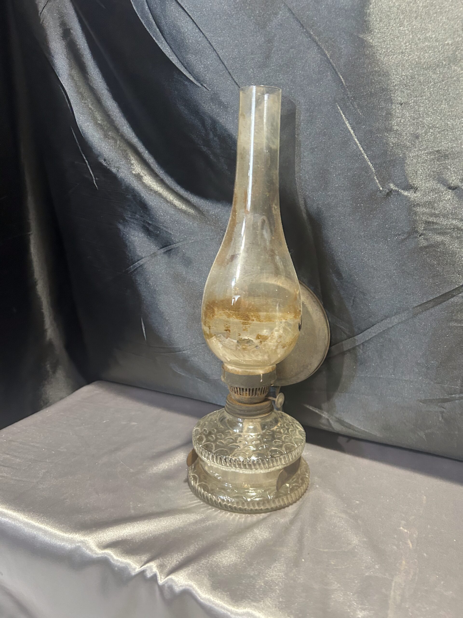Funkcjonalna i elegancka lampa naftowa wykonana z transparentnego, zdobionego szkła. Wyposażona w metalowy talerz z tyłu, który zwiększa efektywność rozpraszania światła. Lampa była używana, co widoczne jest w postaci lekkiego osmolenia, dodającego jej autentycznego charakteru. W pełni sprawna, może być zarówno postawiona, jak i powieszona.