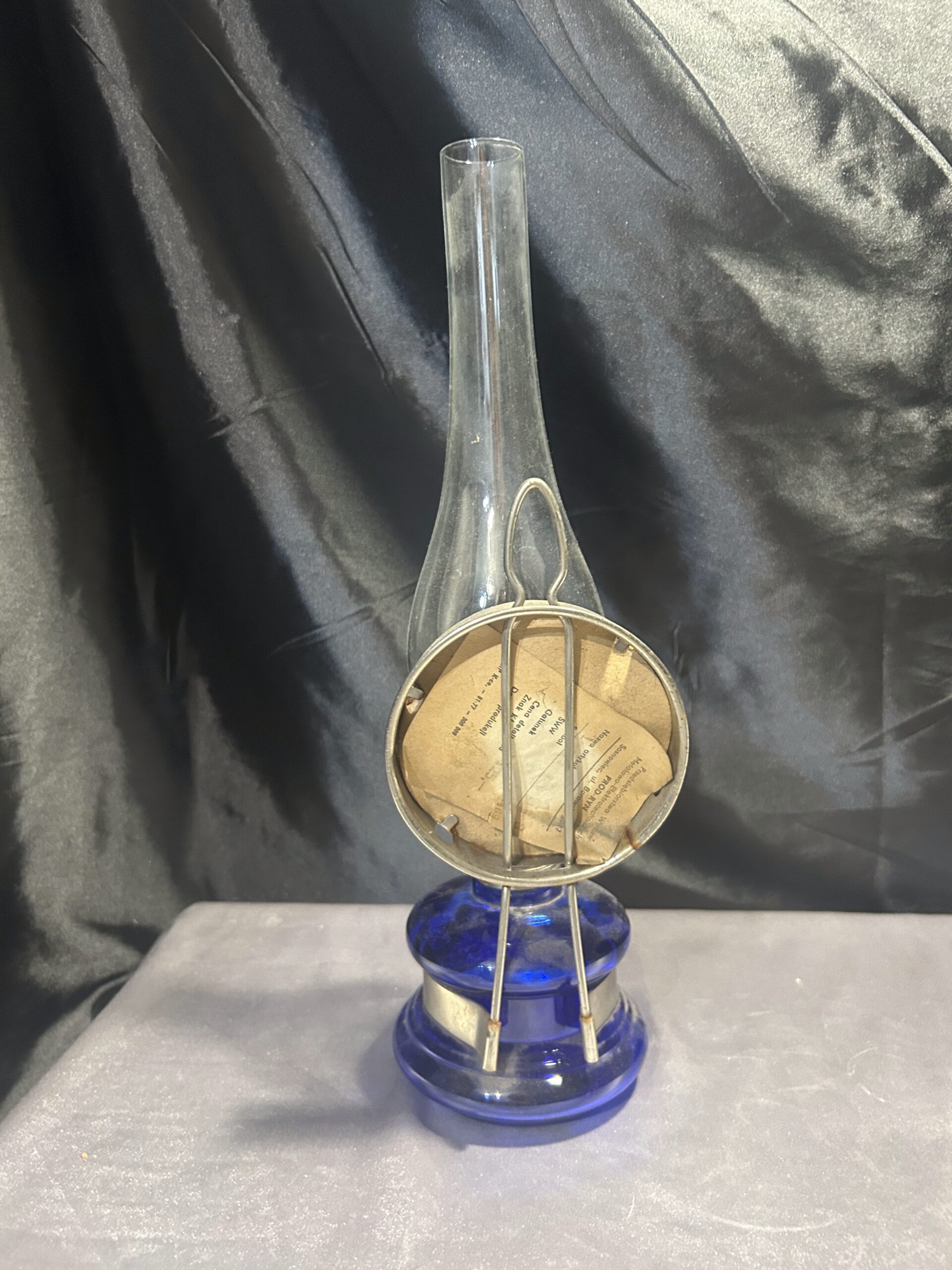 Piękna lampa naftowa wykonana z chabrowego szkła, ozdobiona lusterkiem, które podkreśla urok i funkcjonalność przedmiotu. Może być zarówno postawiona, jak i powieszona, co czyni ją wszechstronną dekoracją. Oferowana w cenie promocyjnej ze względu na brak knota.