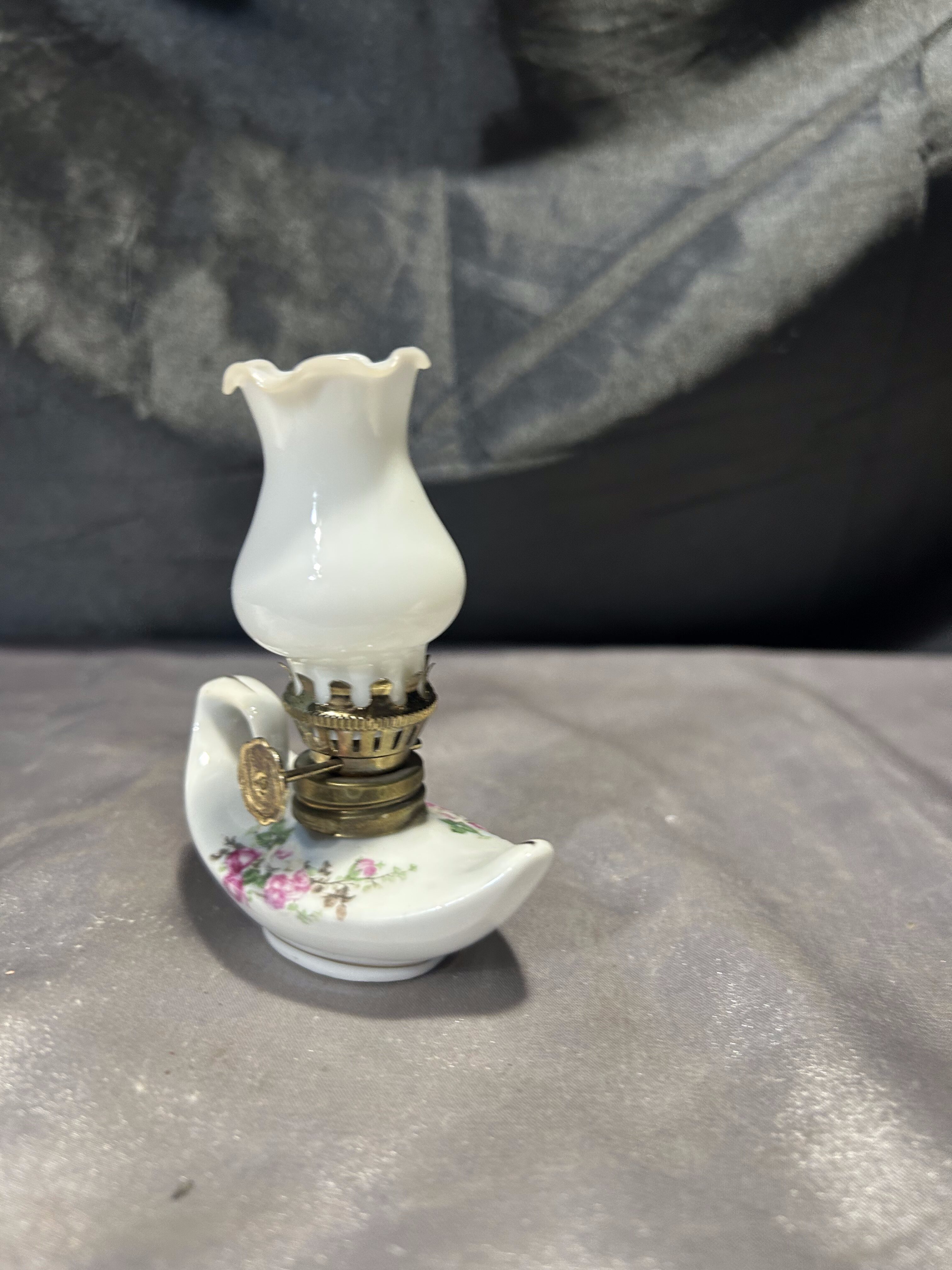 Na sprzedaż urocza lampa naftowa w stylu Alladyna, wykonana z białej ceramiki, ozdobiona ręcznie malowanymi, kolorowymi kwiatami. Posiada szklany, mlecznobiały klosz zakończony dekoracyjną falbanką. Lampa jest w pełni sprawna, wyposażona w nowy knot i gotowa do użytku lub ekspozycji.