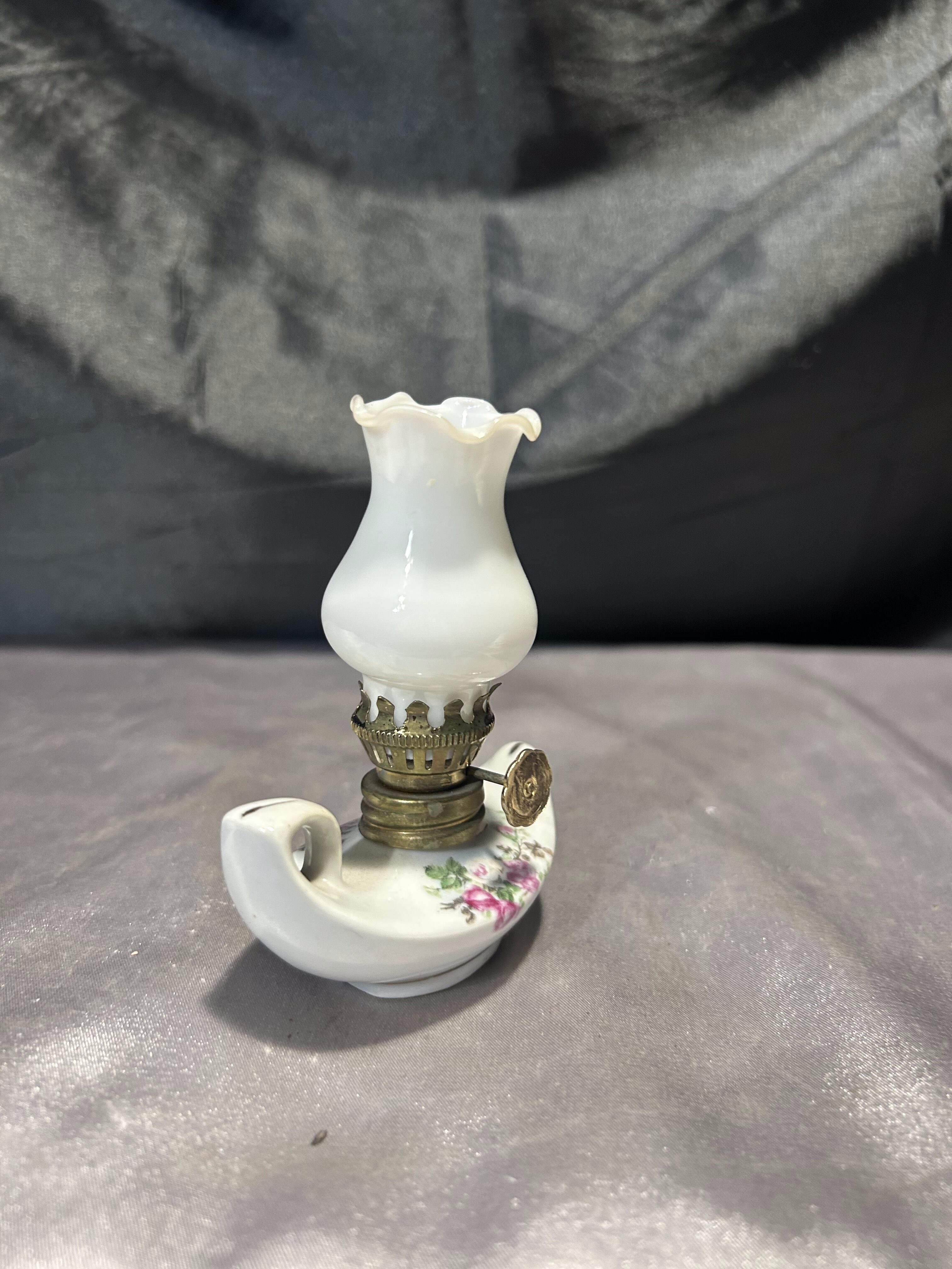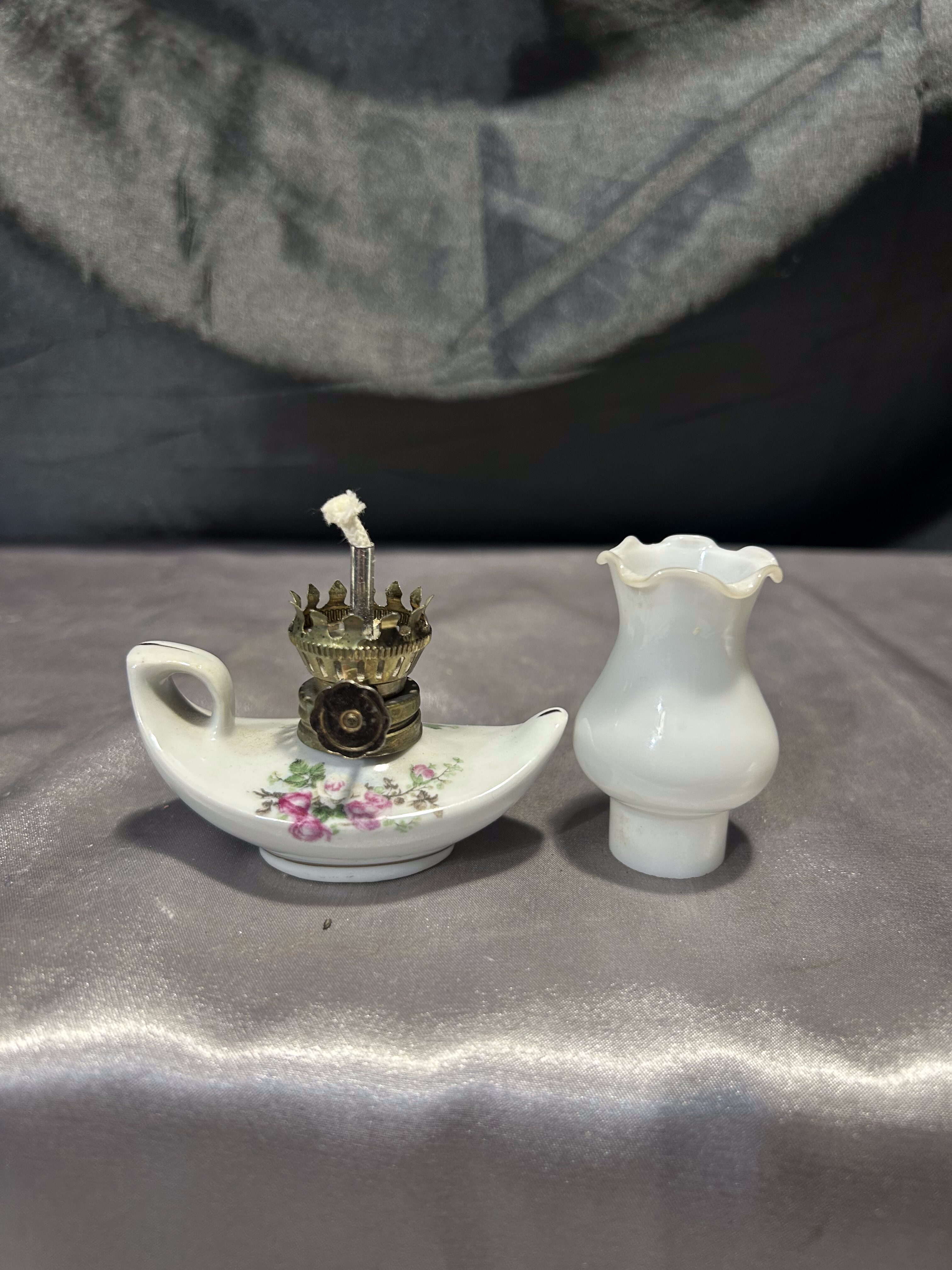 Lampa naftowa w stylu Alladyna – Biała z kwiatowym motywem – Sprawna i dekoracyjna