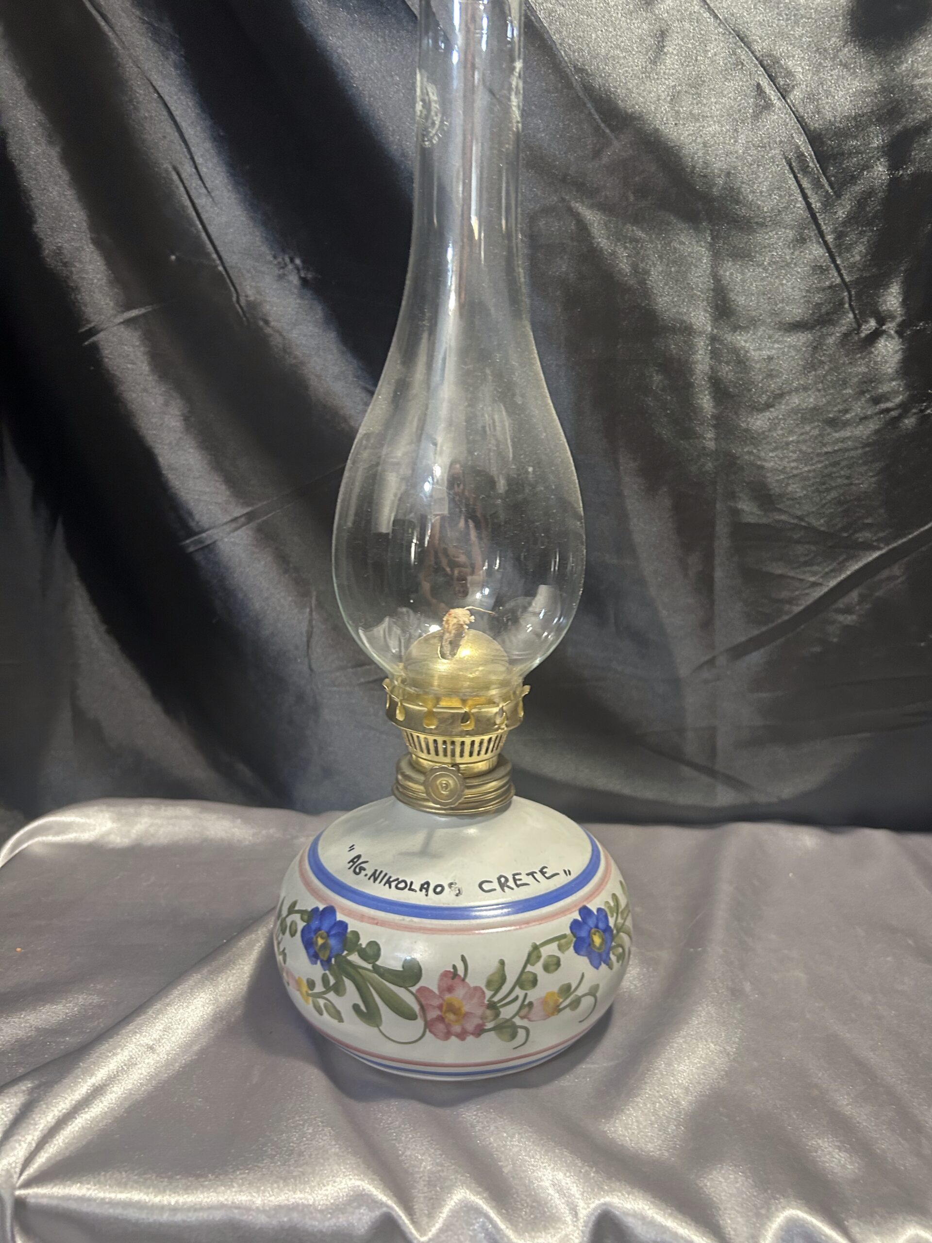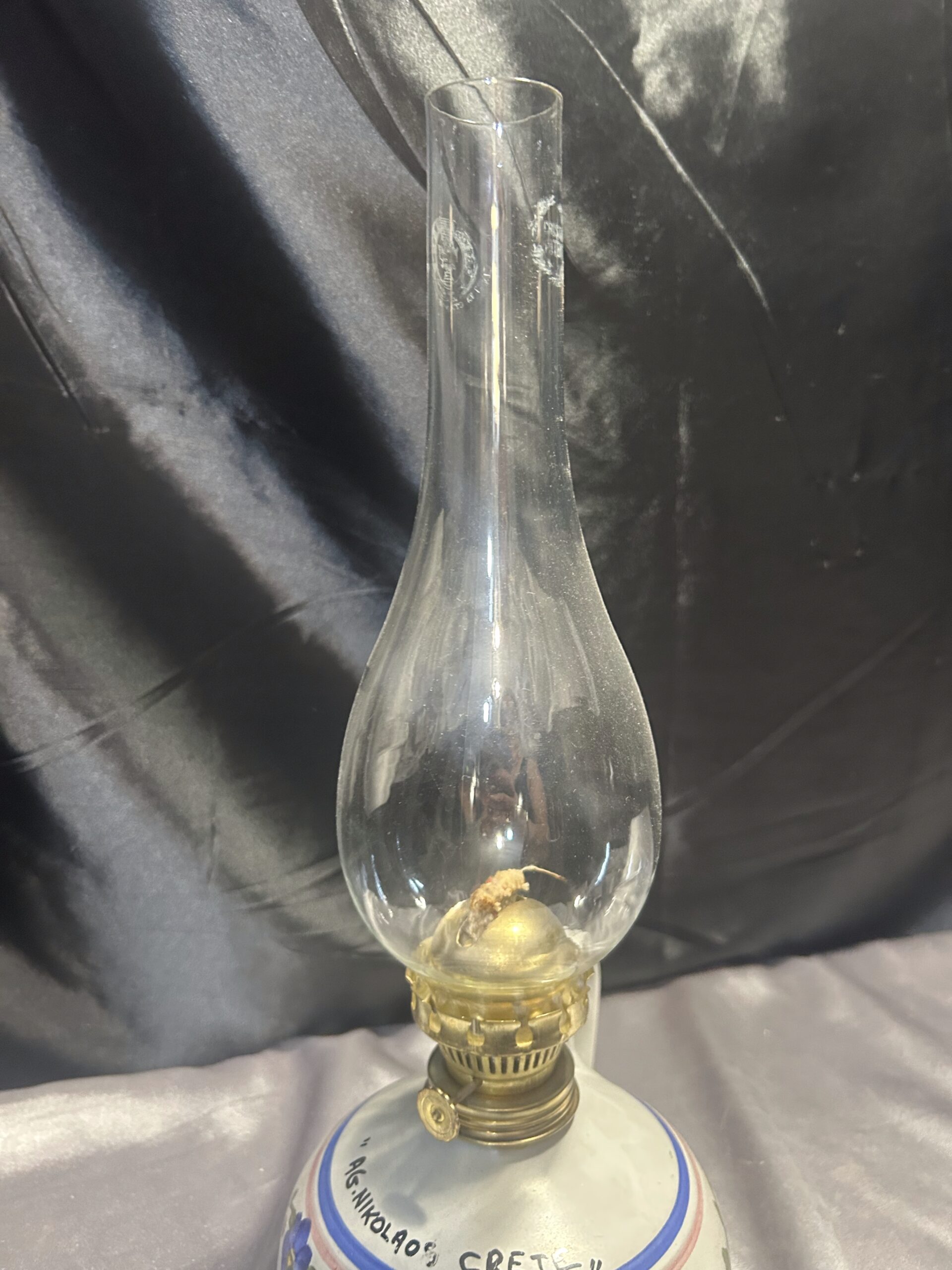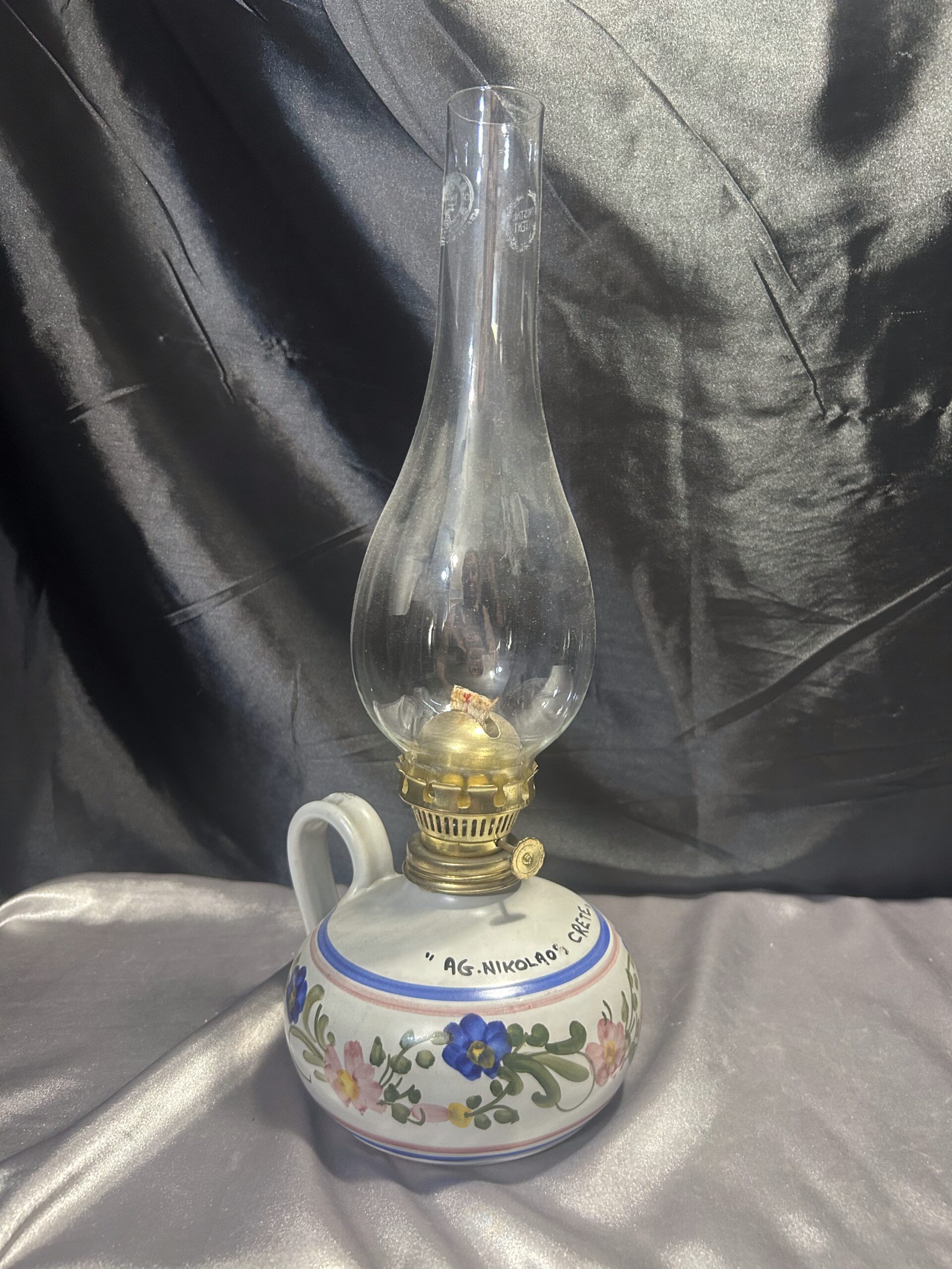 Przedstawiamy wyjątkową lampę naftową, która łączy w sobie funkcjonalność z artystycznym kunsztem wykonania. Ceramiczny pojemnik, wyposażony w poręczne ucho, został misternie ręcznie malowany, zdobiąc go subtelnymi wzorami z różowymi i niebieskimi kwiatami. Na powierzchni widnieje elegancki podpis: „AG. NIKOLAOS CRETE”, który nadaje całości niepowtarzalnego charakteru.