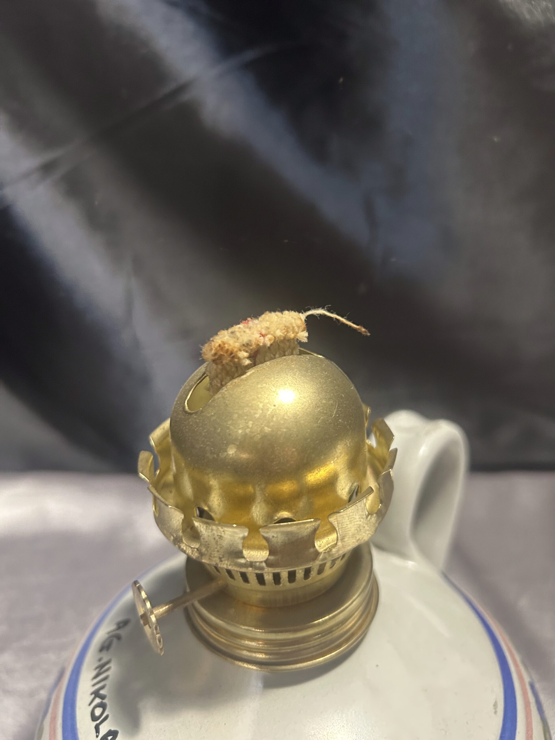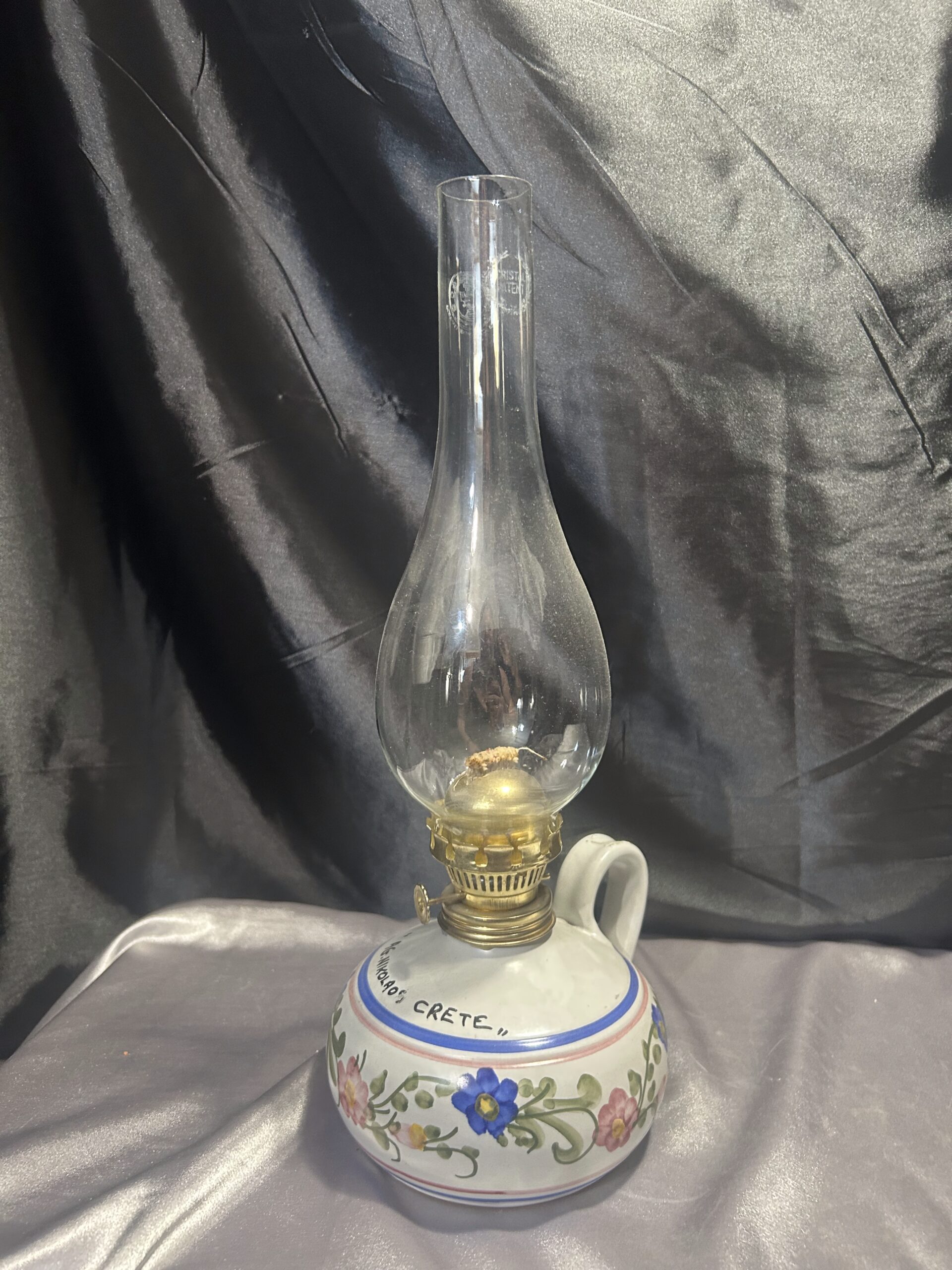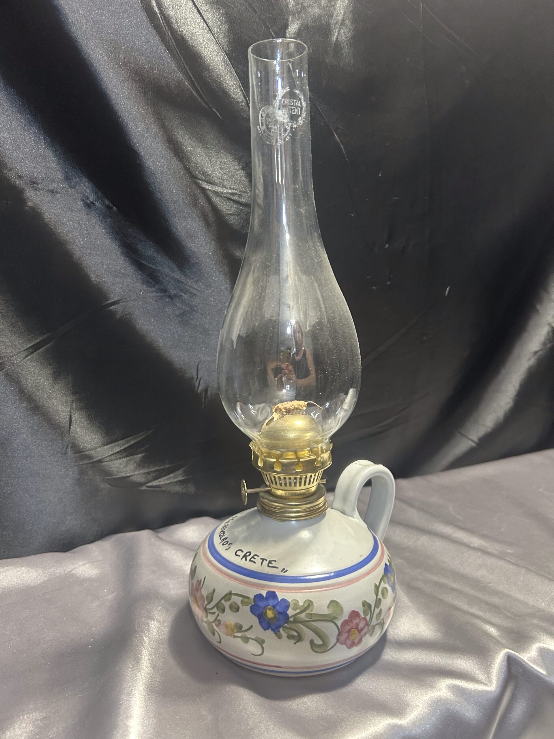Przedstawiamy wyjątkową lampę naftową, która łączy w sobie funkcjonalność z artystycznym kunsztem wykonania. Ceramiczny pojemnik, wyposażony w poręczne ucho, został misternie ręcznie malowany, zdobiąc go subtelnymi wzorami z różowymi i niebieskimi kwiatami. Na powierzchni widnieje elegancki podpis: „AG. NIKOLAOS CRETE”, który nadaje całości niepowtarzalnego charakteru.