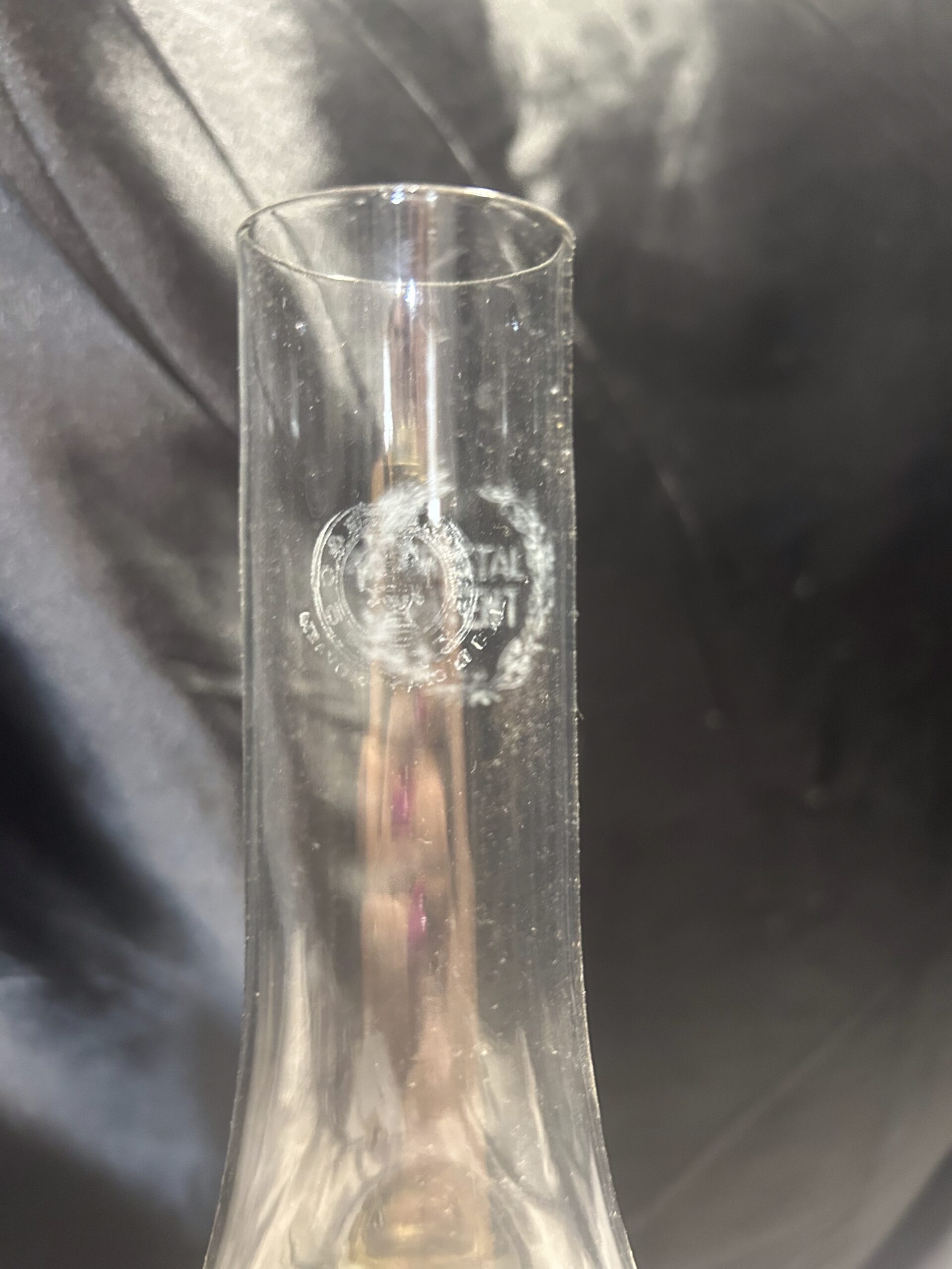 Dopełnieniem kompozycji jest szklany komin, starannie sygnowany, który harmonijnie współgra z resztą konstrukcji. Lampa jest w pełni sprawna, wyposażona w nowy knot, co gwarantuje jej niezawodne działanie oraz dodaje uroku podczas użytkowania.