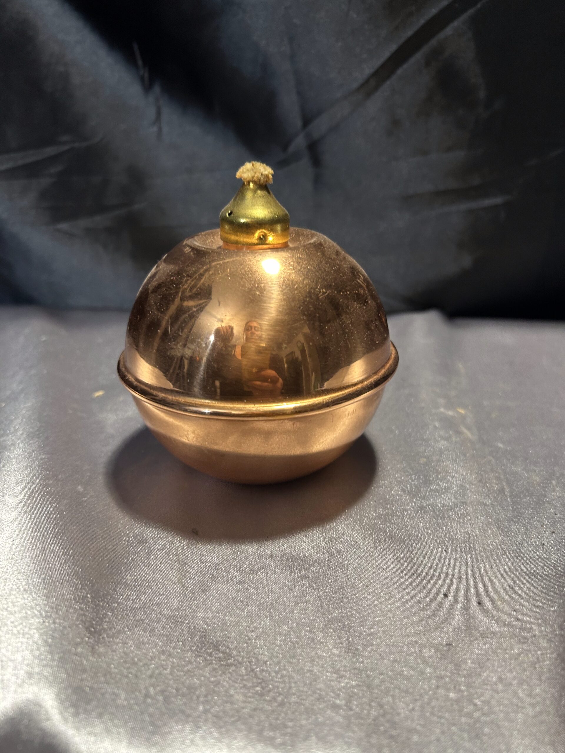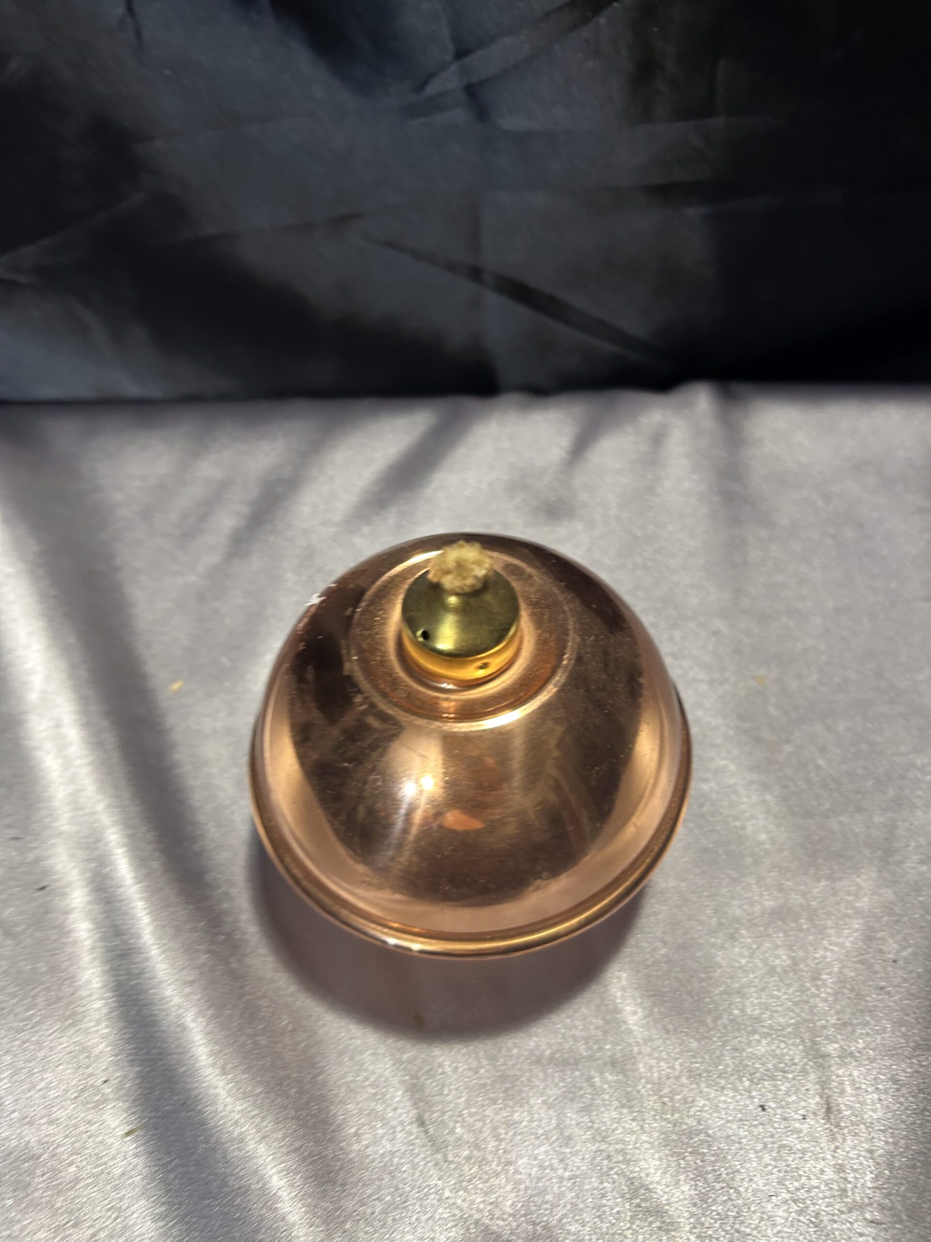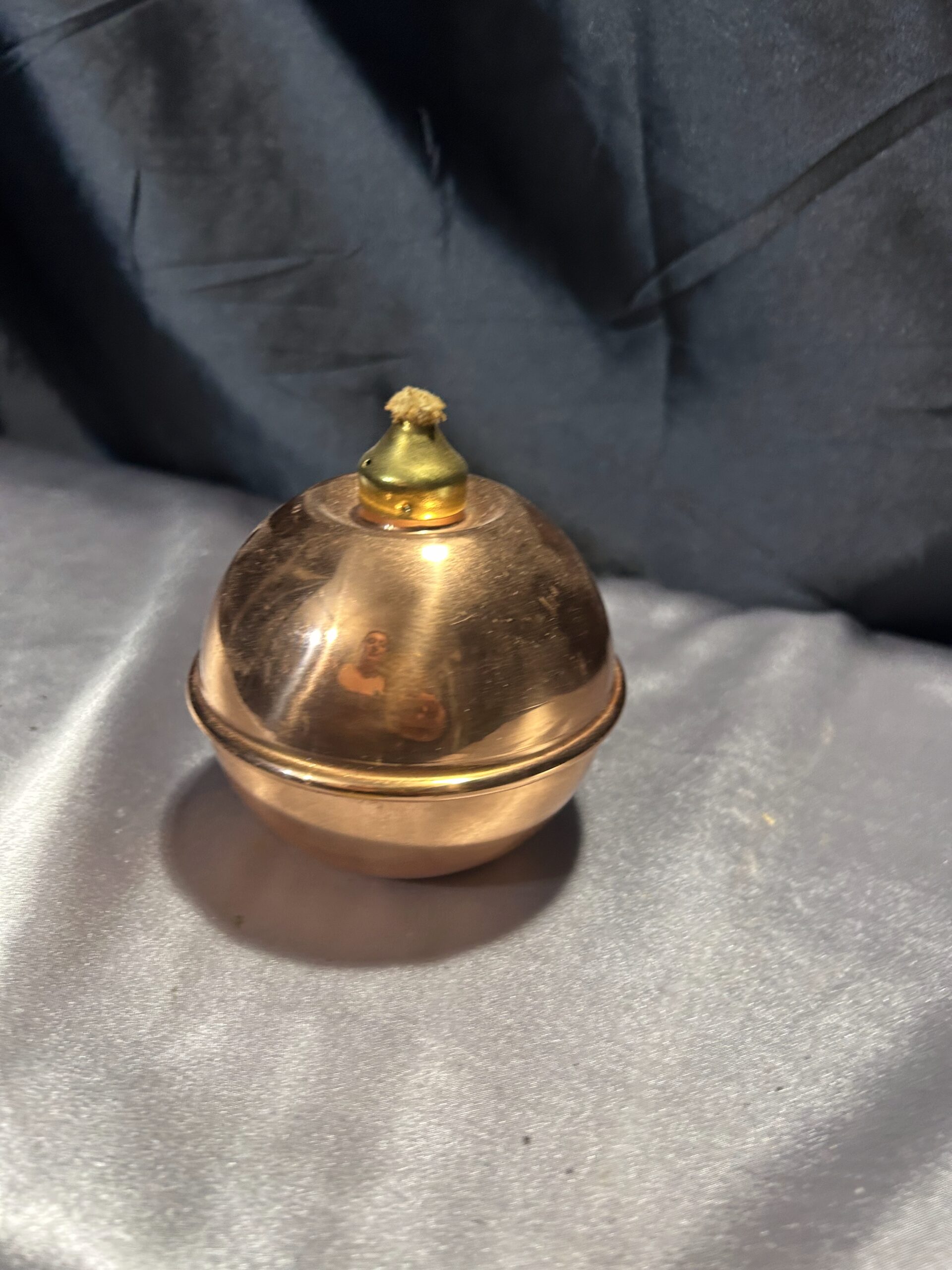 Unikatowa lampa naftowa wykonana z miedzi, o kształcie kuli. Sygnowana KROGARHUSET, stanowi wyjątkowy element dekoracyjny w stylu retro. Wyposażona w nowy knot, jest gotowa do użycia i doskonale wpisuje się w oryginalny i niepowtarzalny design.