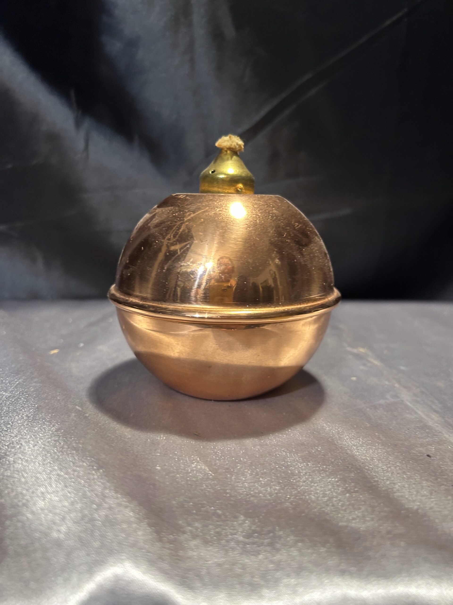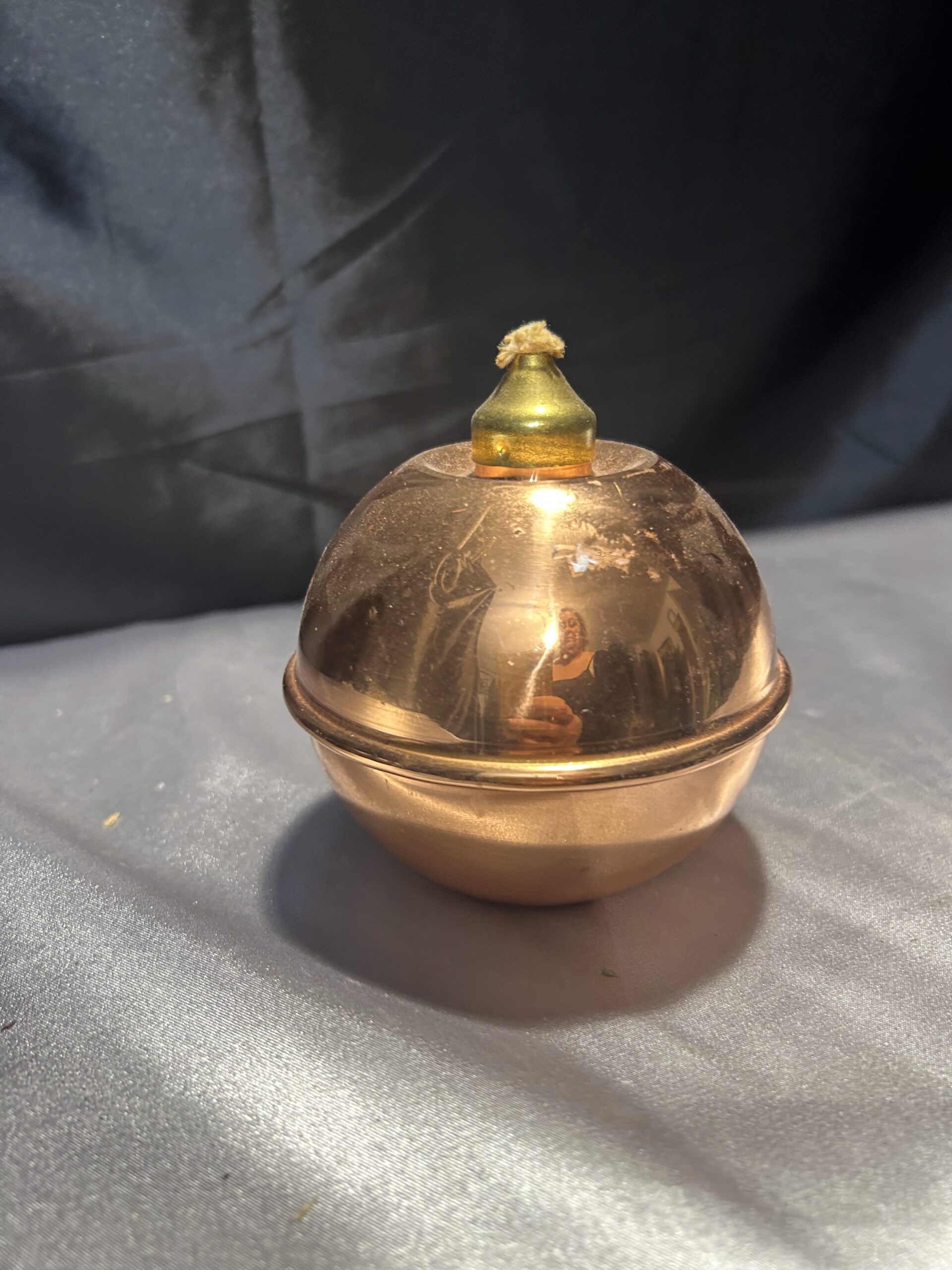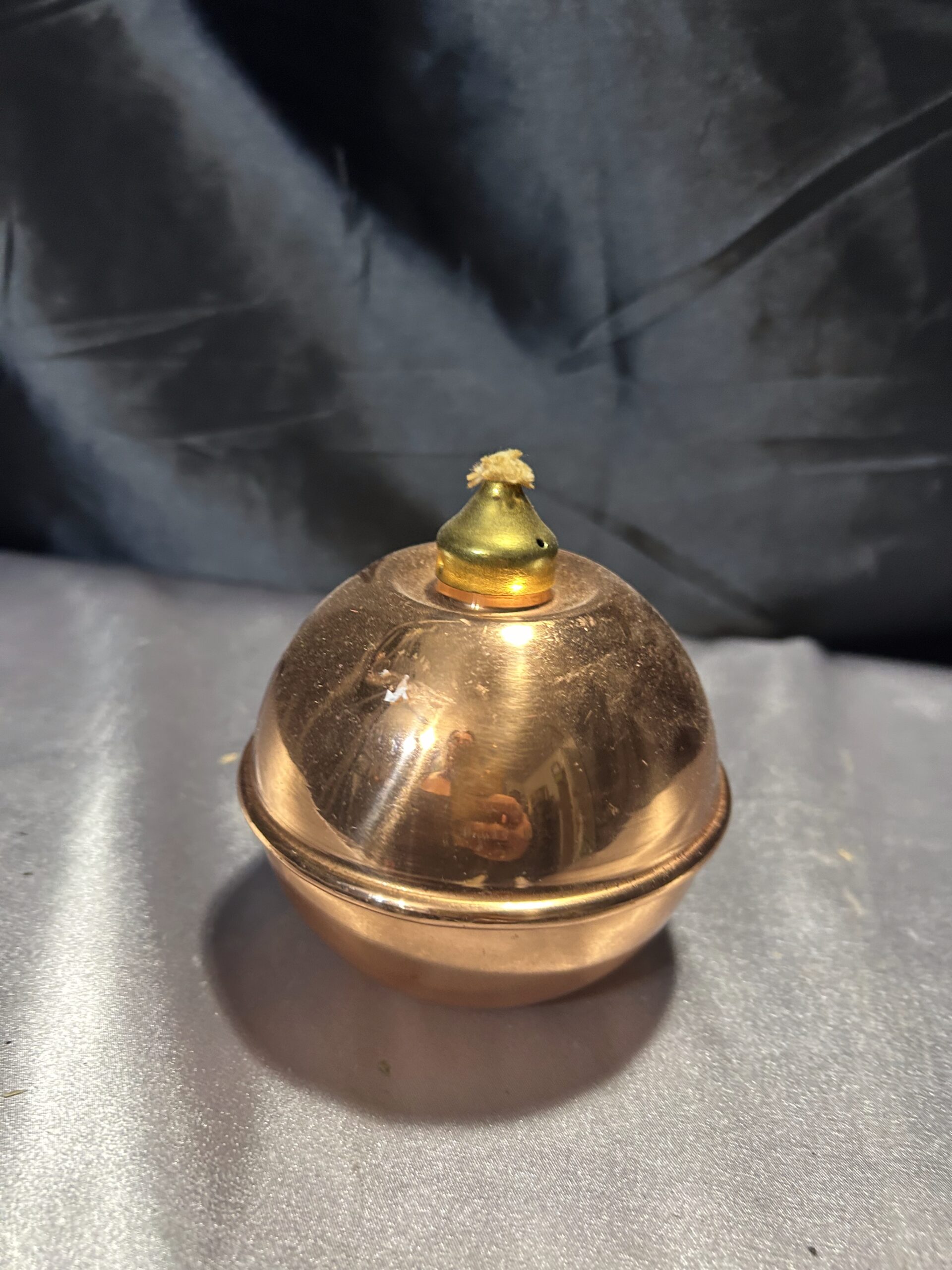 Unikatowa lampa naftowa wykonana z miedzi, o kształcie kuli. Sygnowana KROGARHUSET, stanowi wyjątkowy element dekoracyjny w stylu retro. Wyposażona w nowy knot, jest gotowa do użycia i doskonale wpisuje się w oryginalny i niepowtarzalny design.