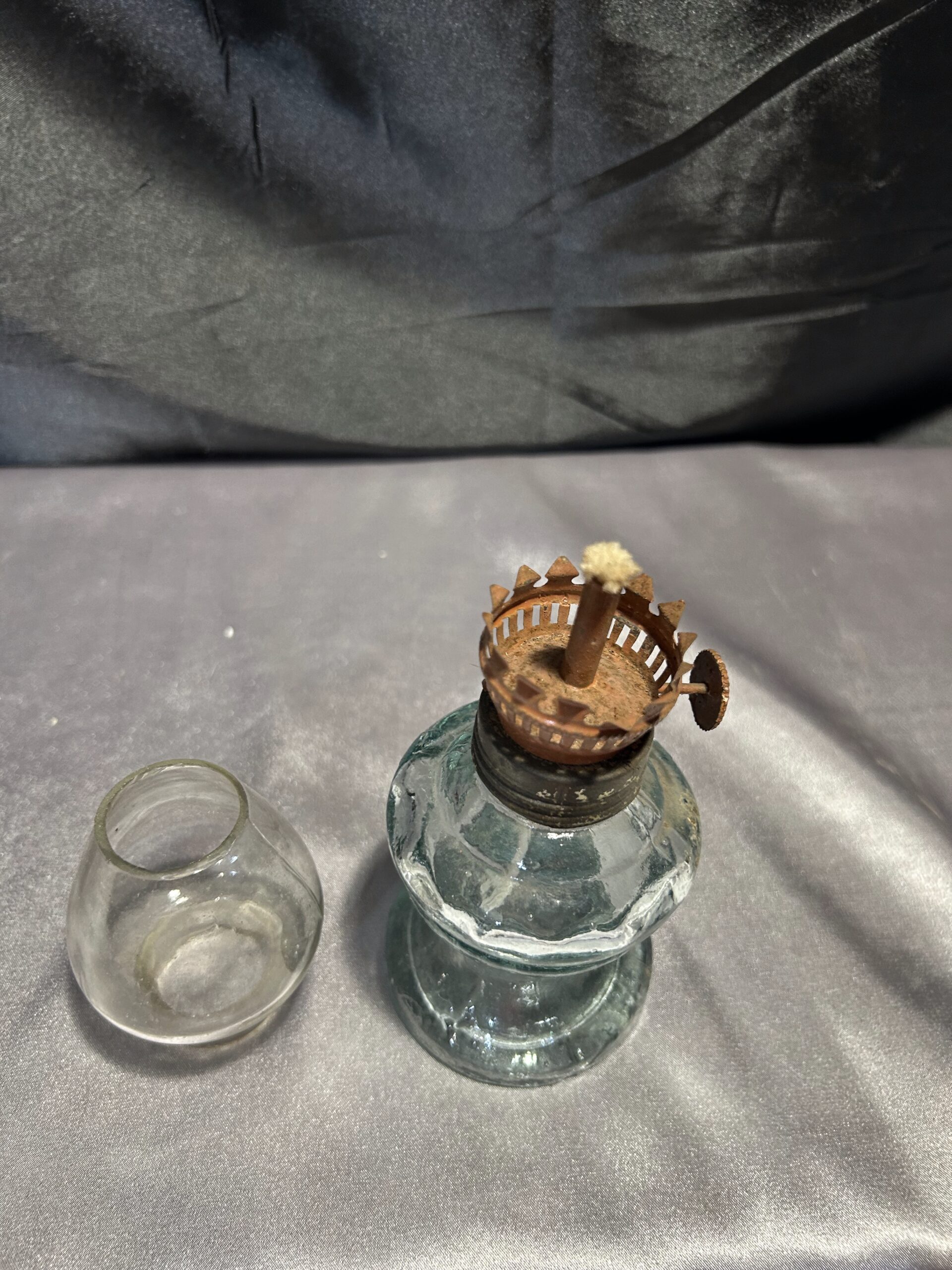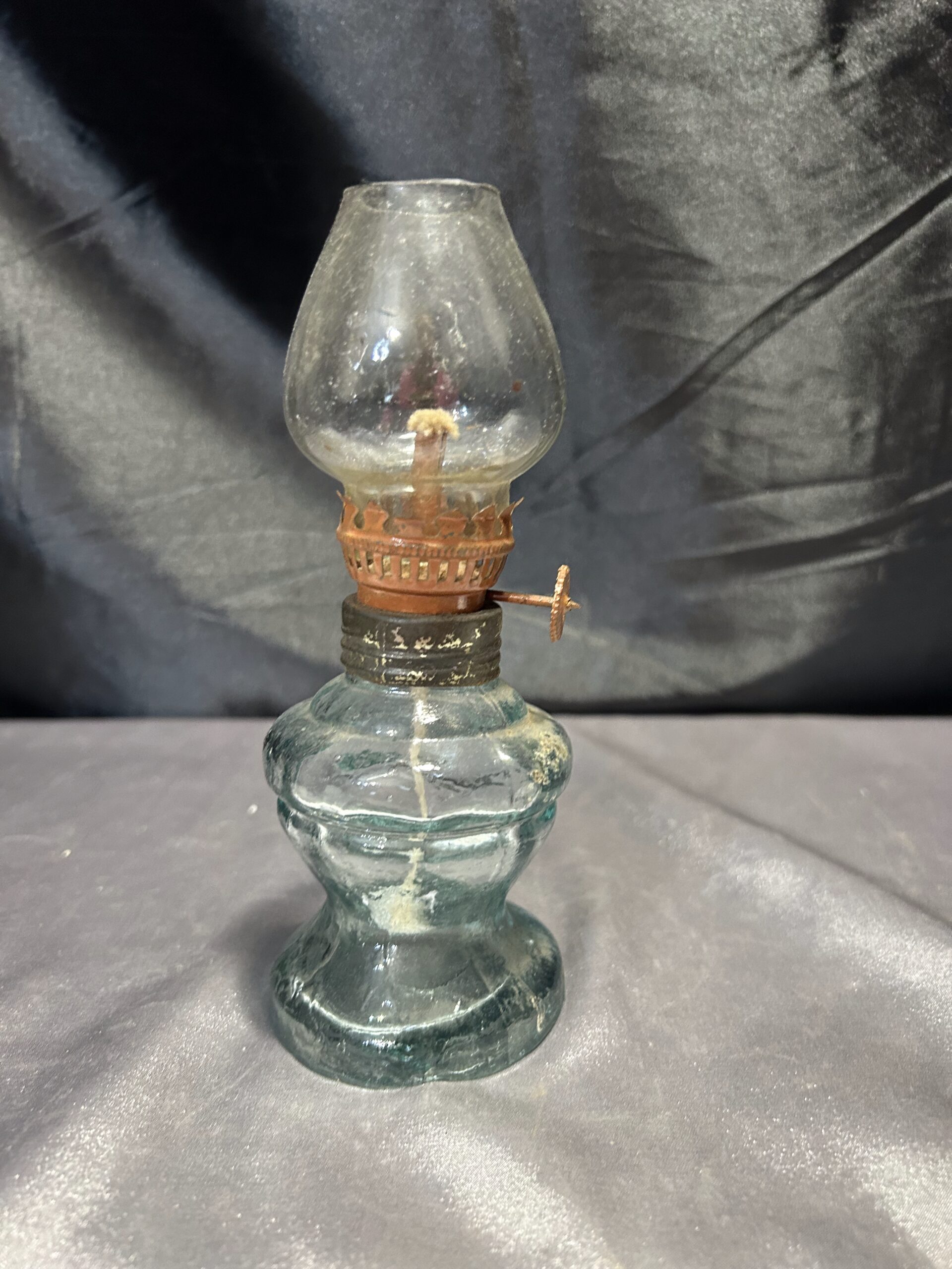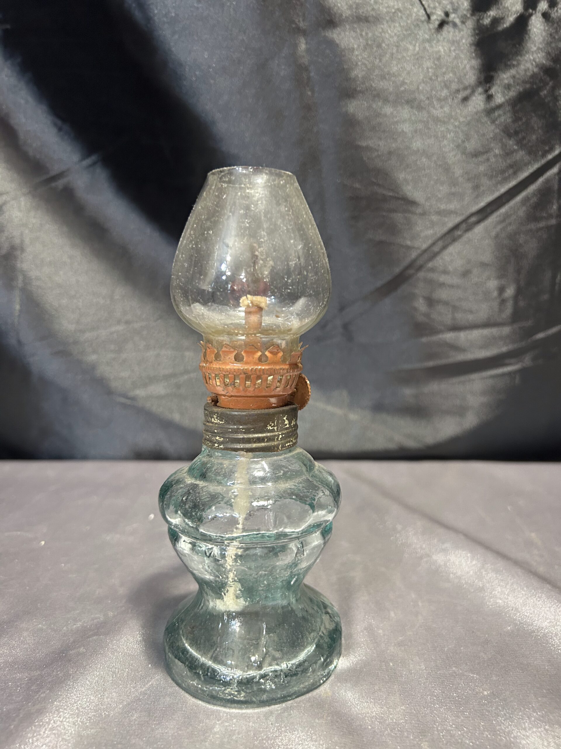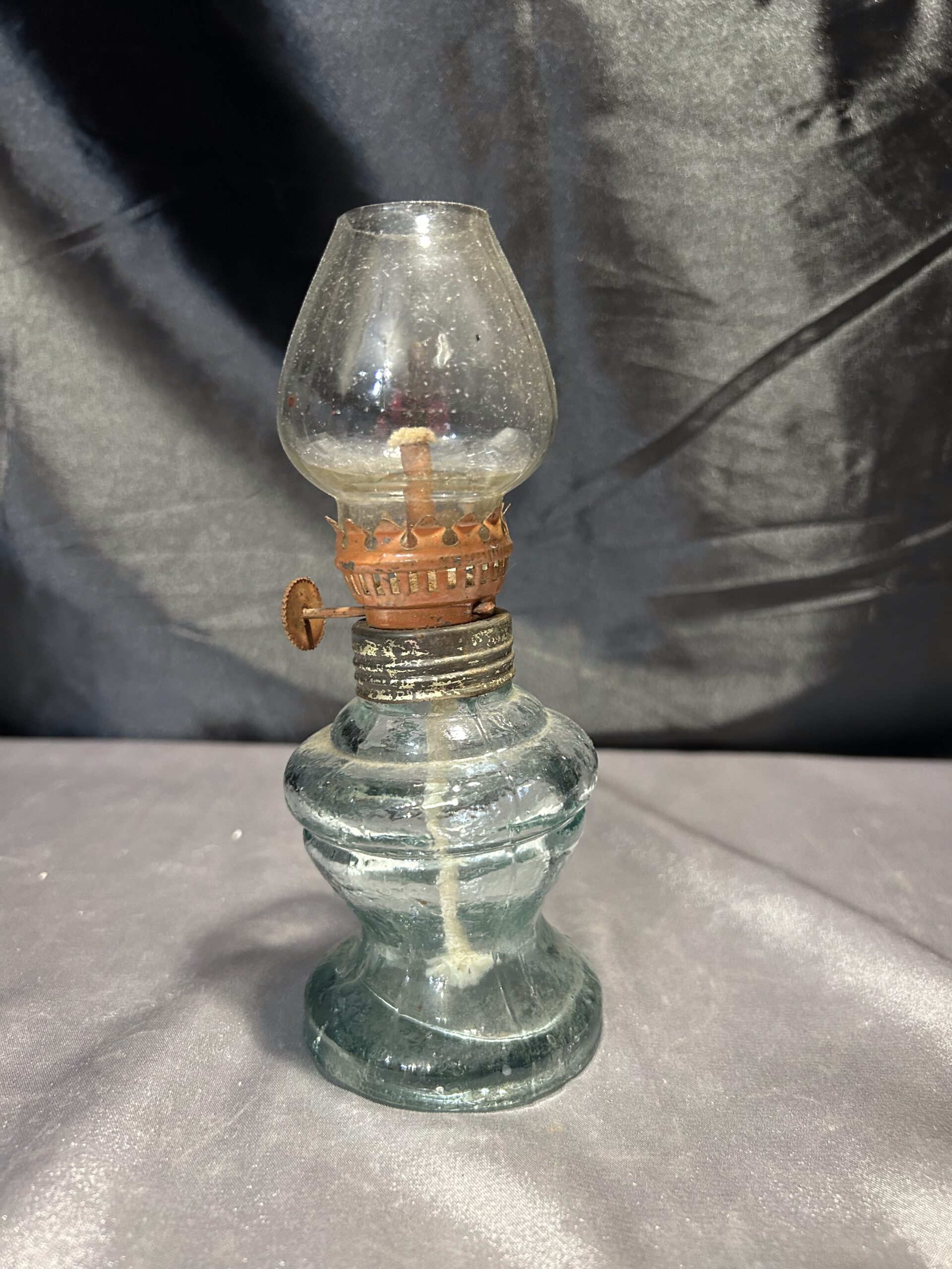 Oryginalna lampa naftowa wykonana z grubego, przeźroczystego szkła, która łączy w sobie prostotę i funkcjonalność. Jest w pełni sprawna, wyposażona w nowy knot, gotowa do użytku. Ze względu na lekkie uszczerbienie nogi (widoczne na zdjęciu), lampa oferowana jest w cenie promocyjnej.