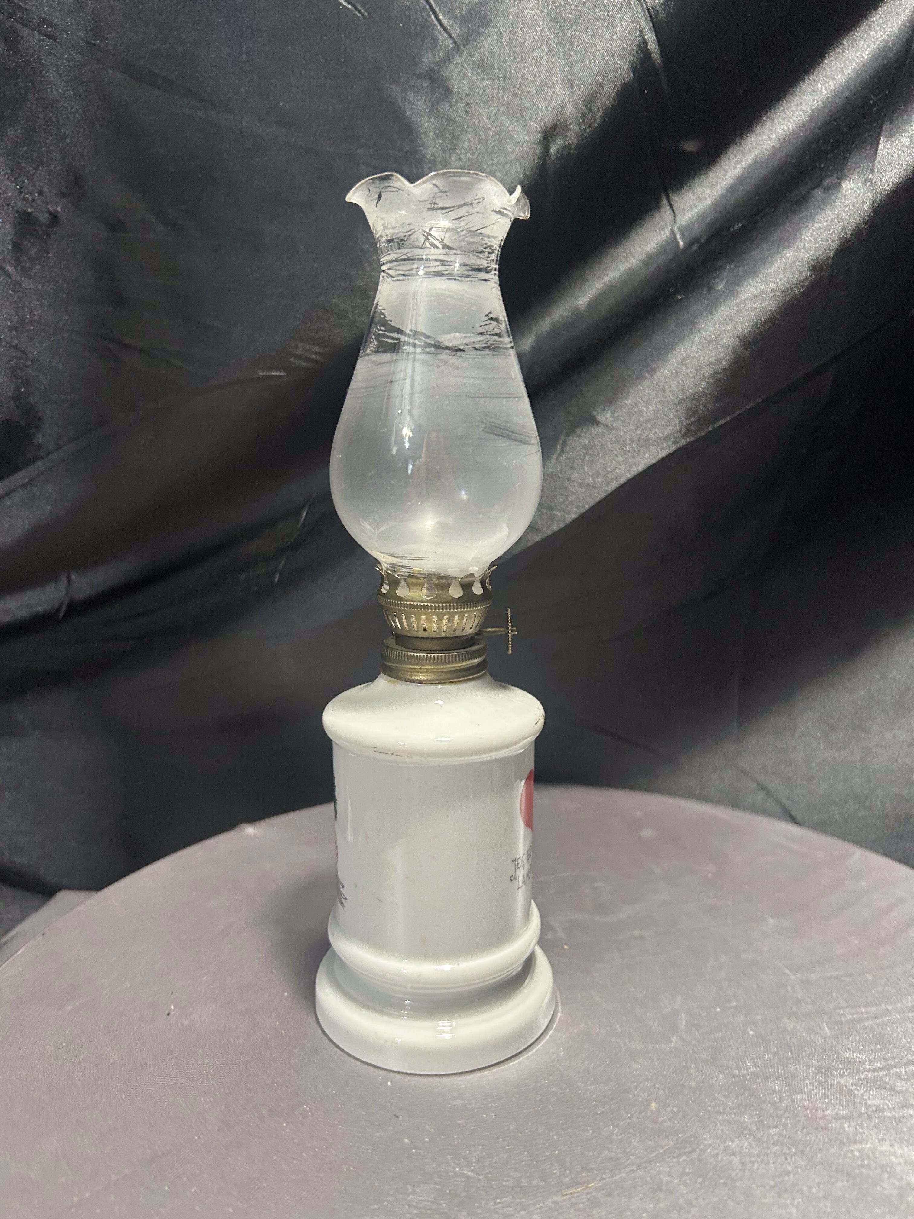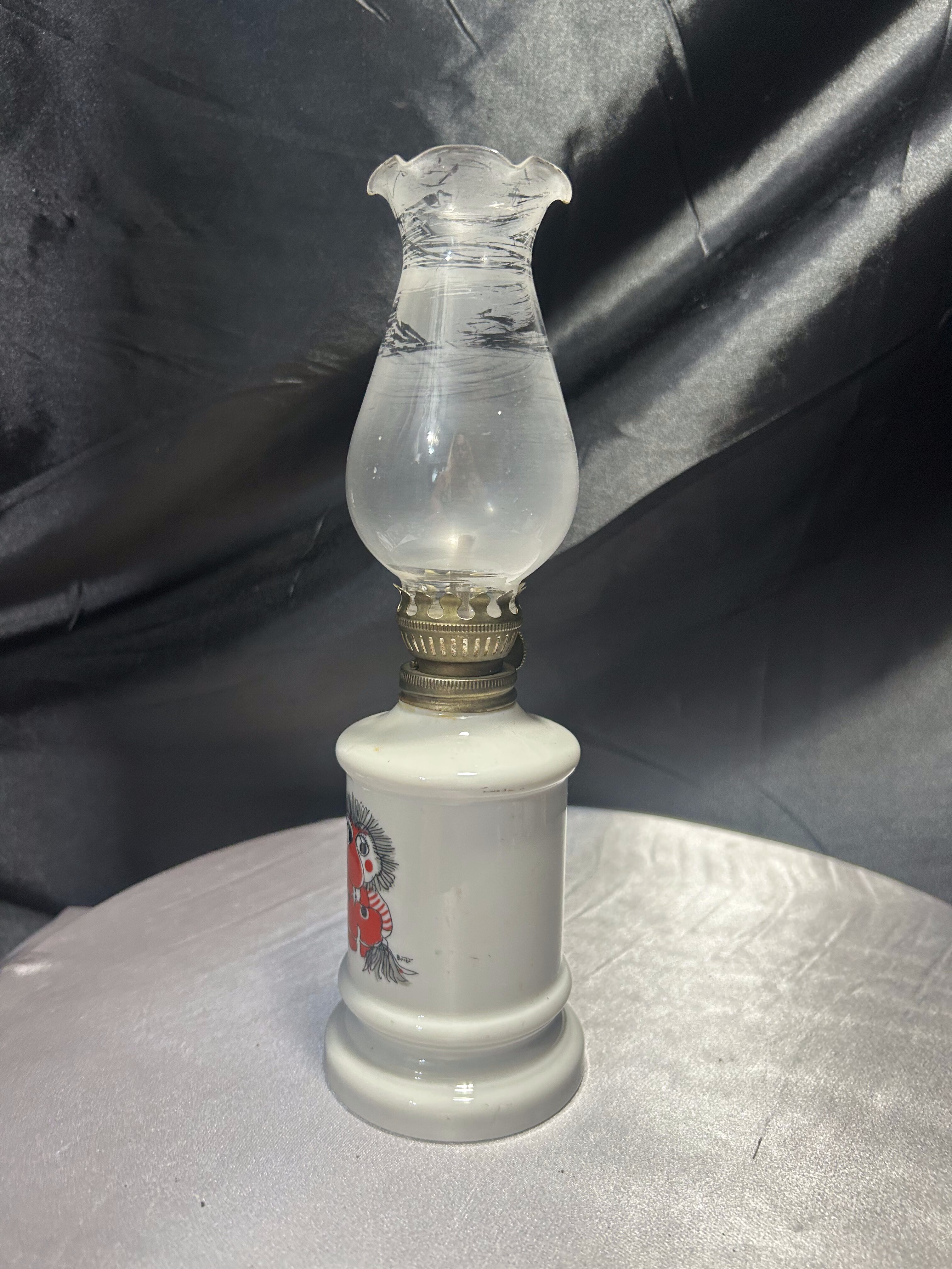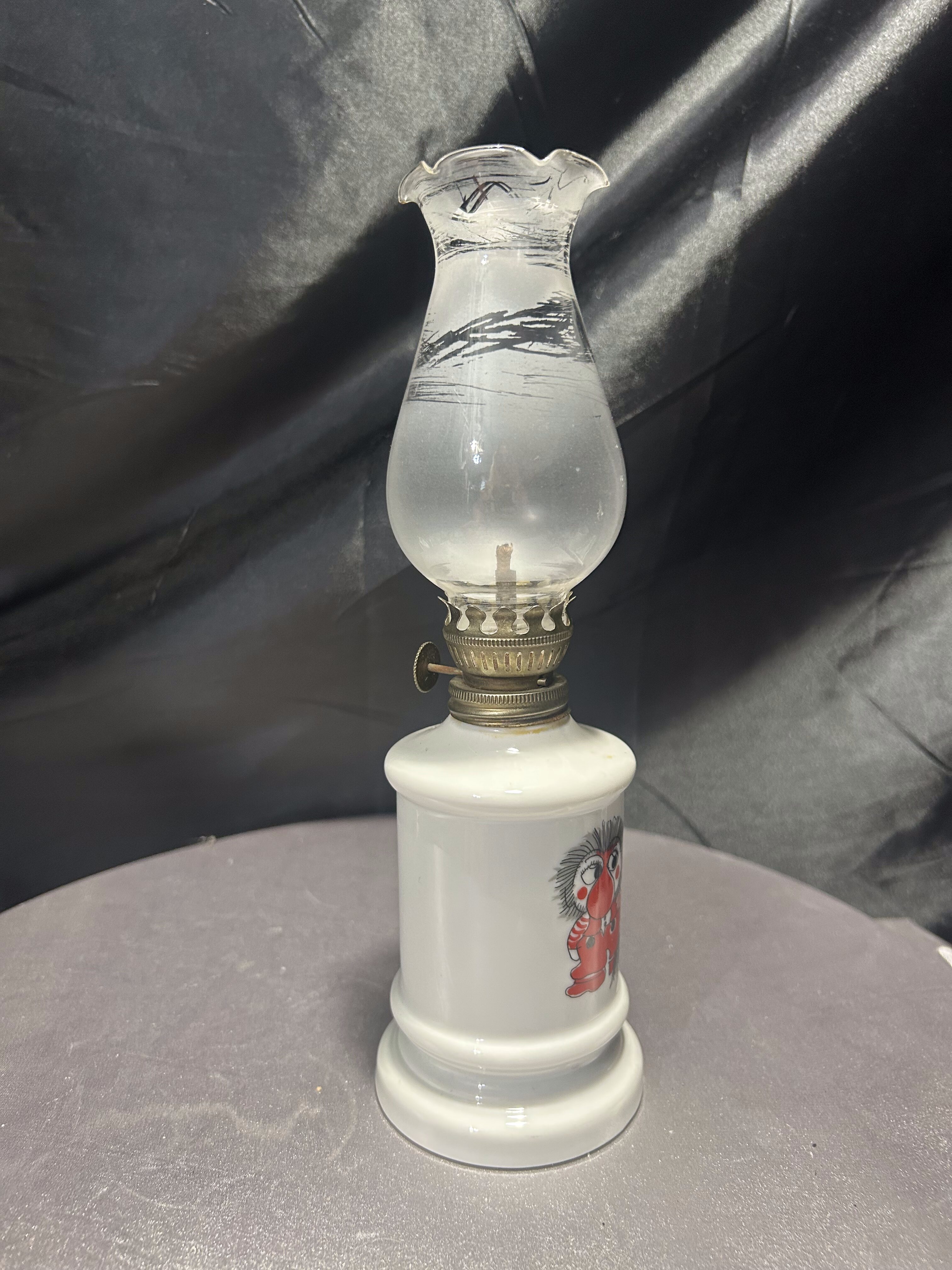 Lampa Naftowa Białe Szkło z Namalowanym Chłopczykiem i Kwiatowym Kloszem