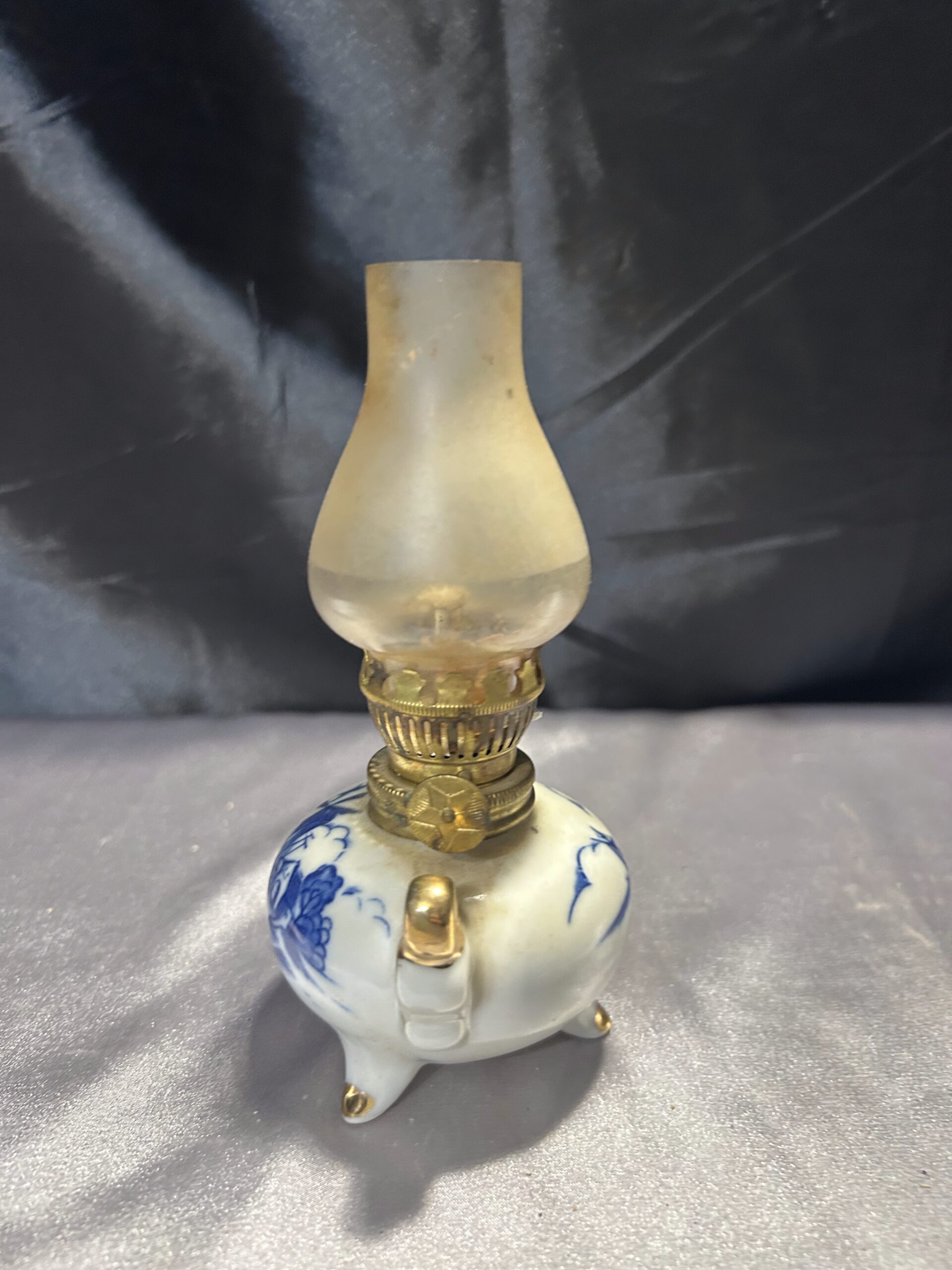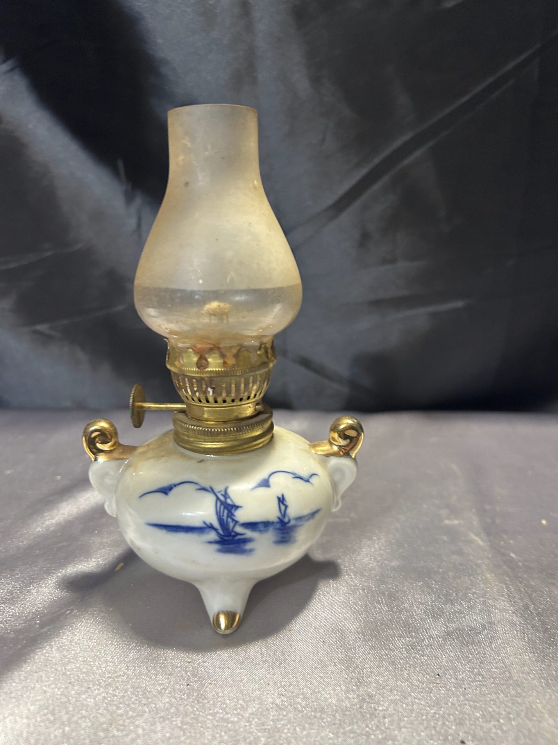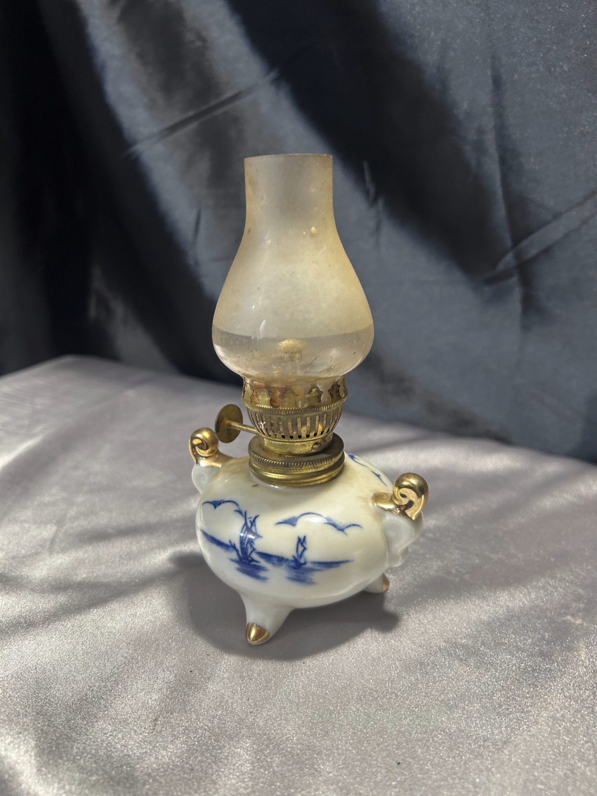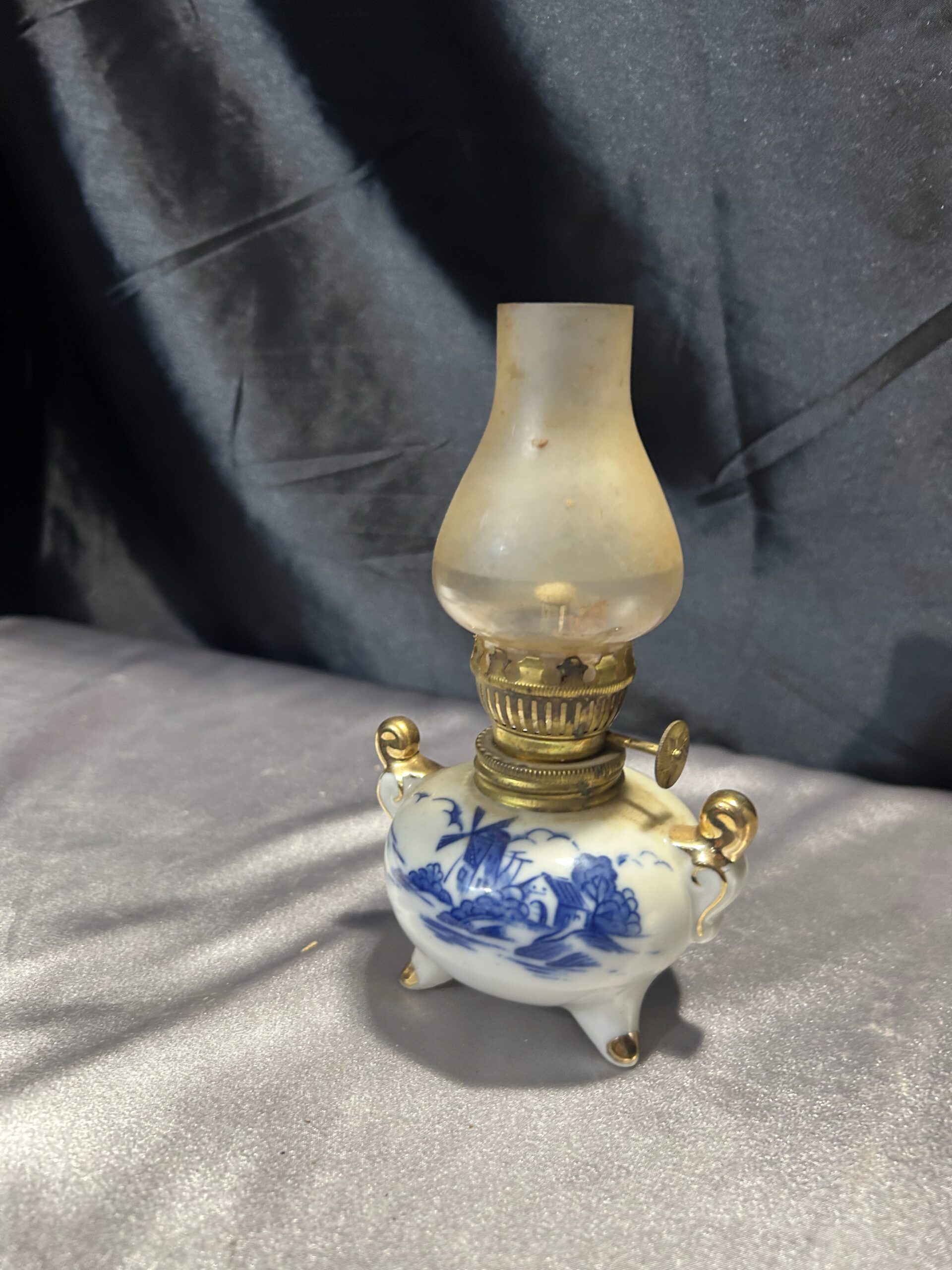 Urokliwa lampa naftowa w biało-niebieskiej kolorystyce, zdobiona motywem holenderskich wiatraków. Klasyczny design i subtelne wzory sprawiają, że jest to wyjątkowy element dekoracyjny, który doskonale wpisuje się w styl retro lub rustykalny.