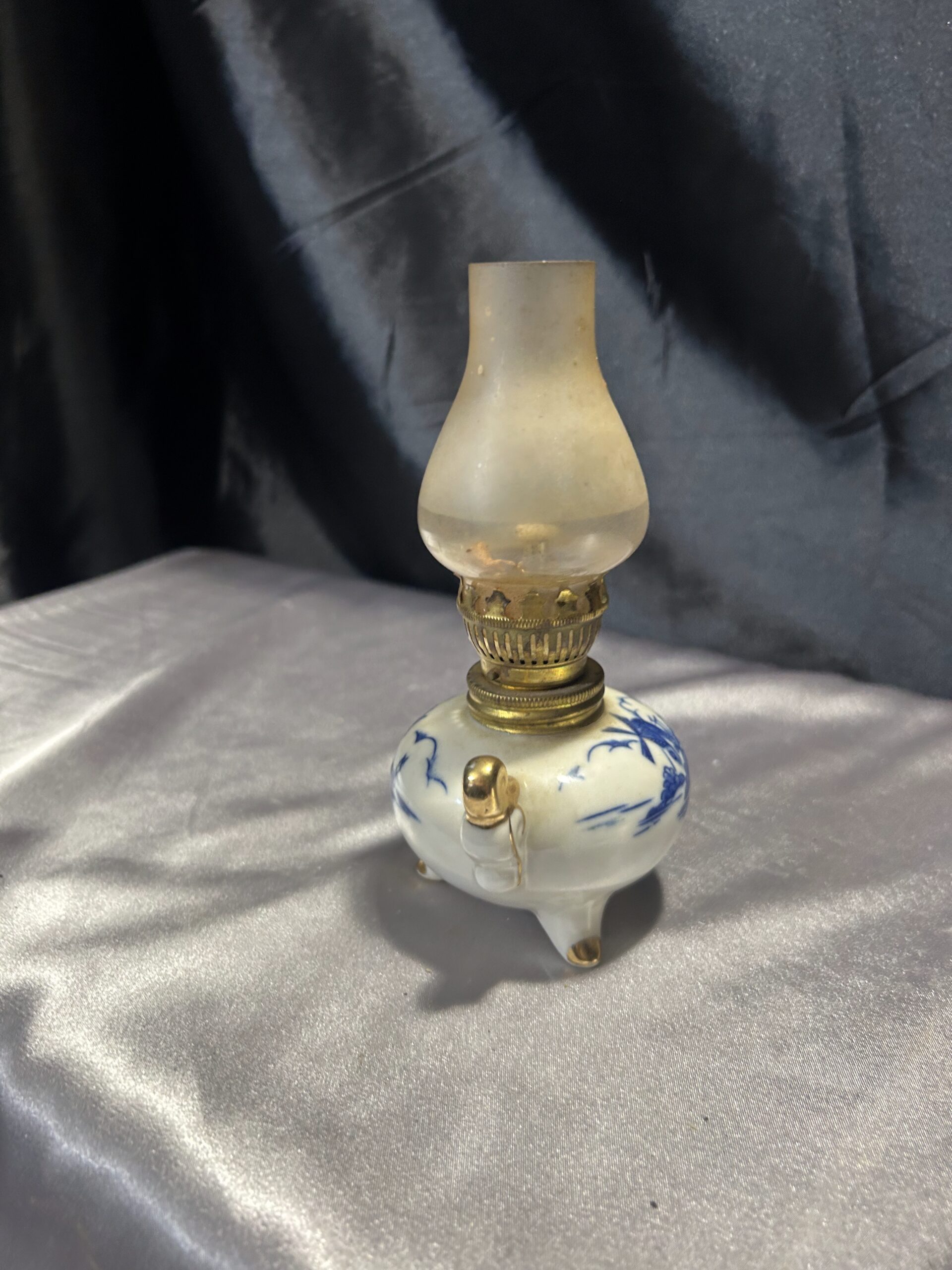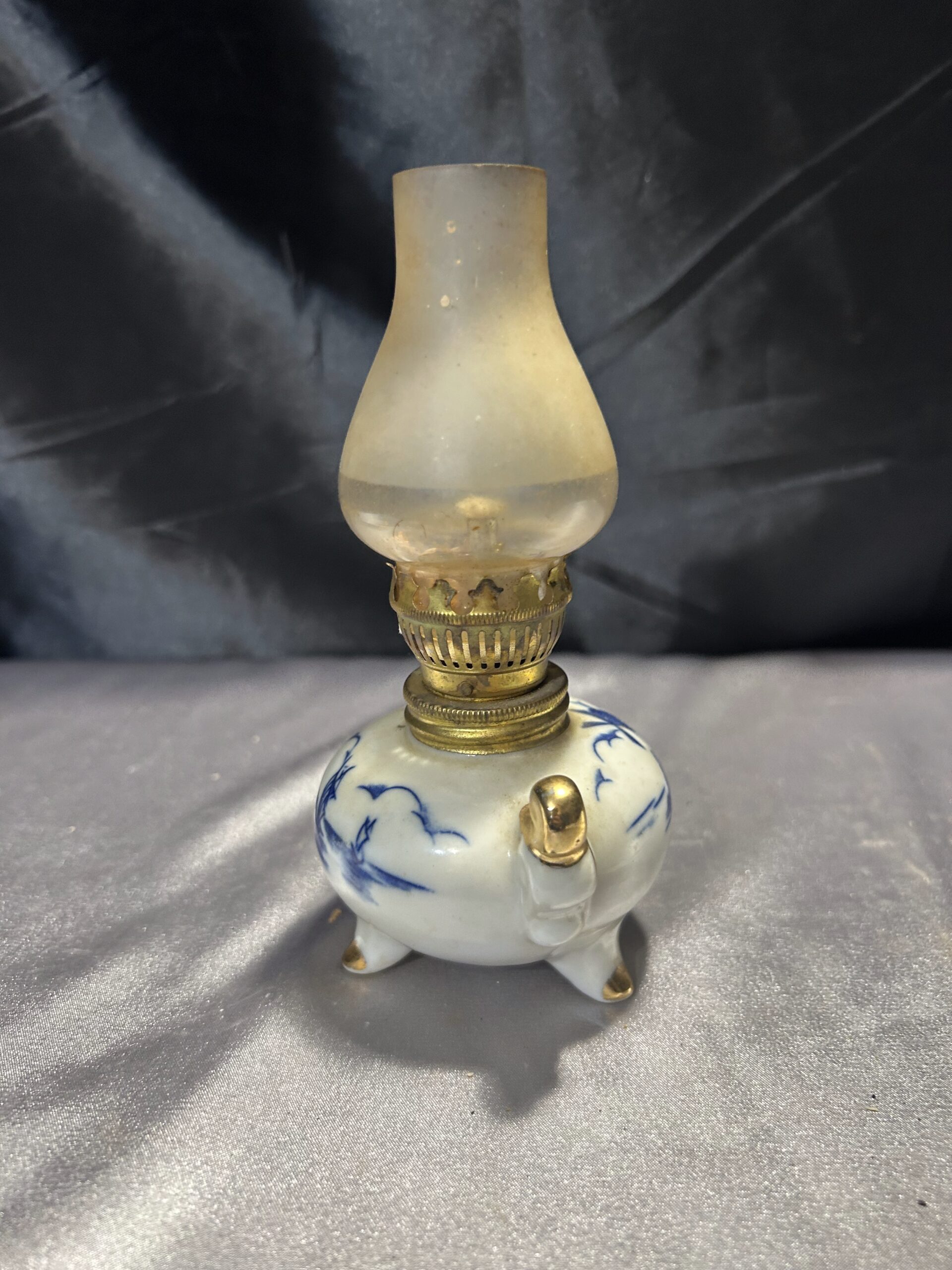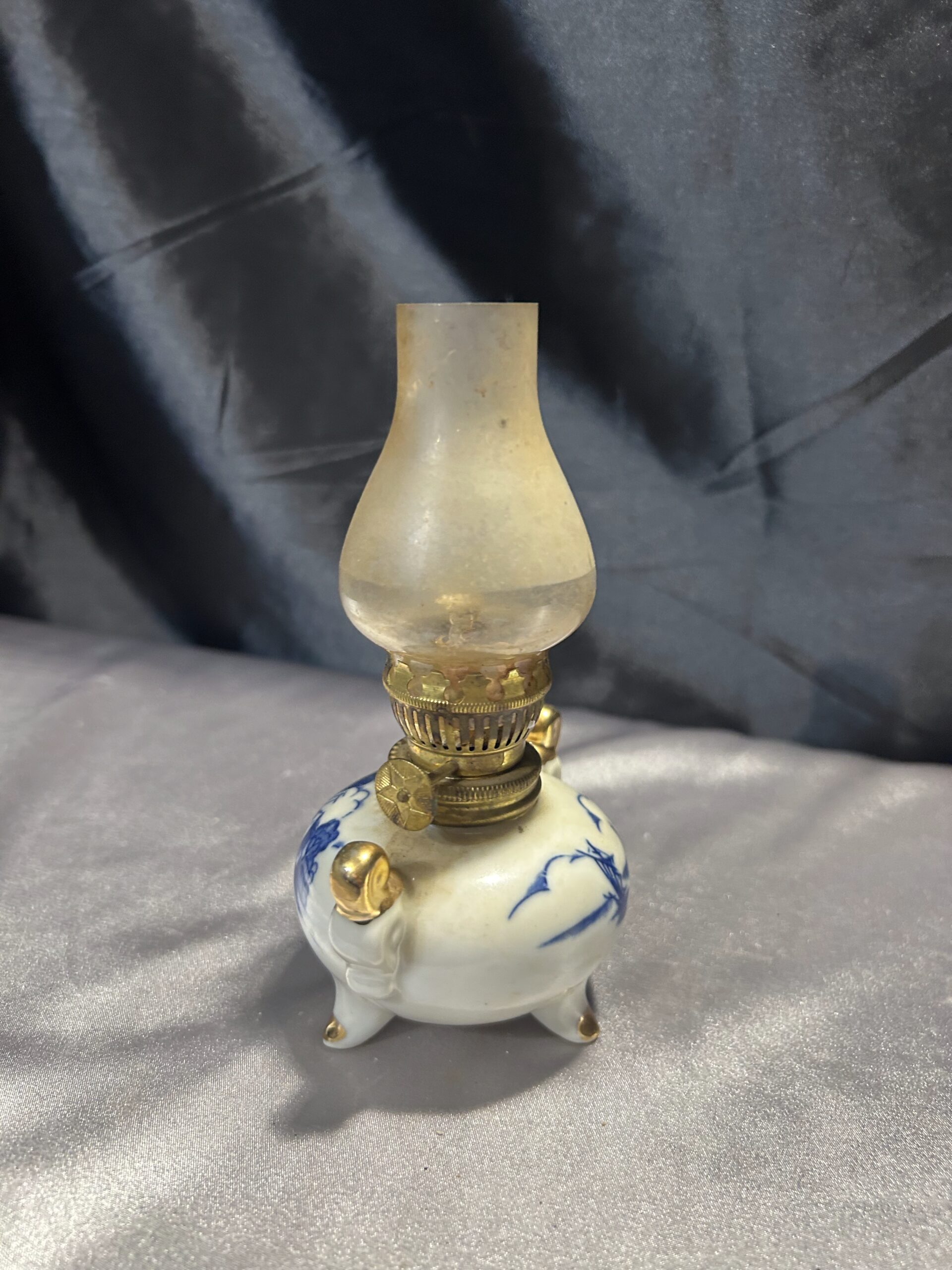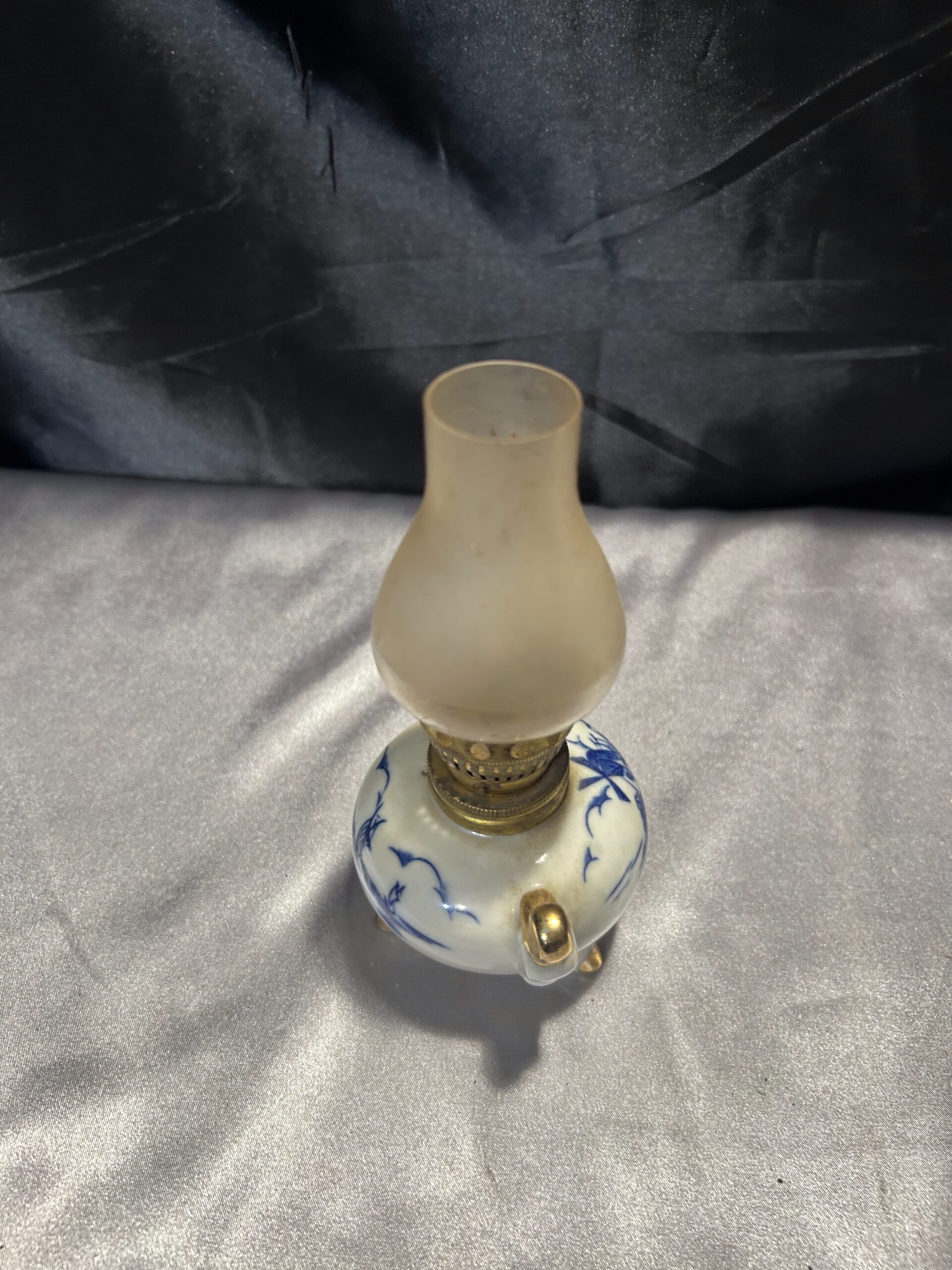 Urokliwa lampa naftowa w biało-niebieskiej kolorystyce, zdobiona motywem holenderskich wiatraków. Klasyczny design i subtelne wzory sprawiają, że jest to wyjątkowy element dekoracyjny, który doskonale wpisuje się w styl retro lub rustykalny.