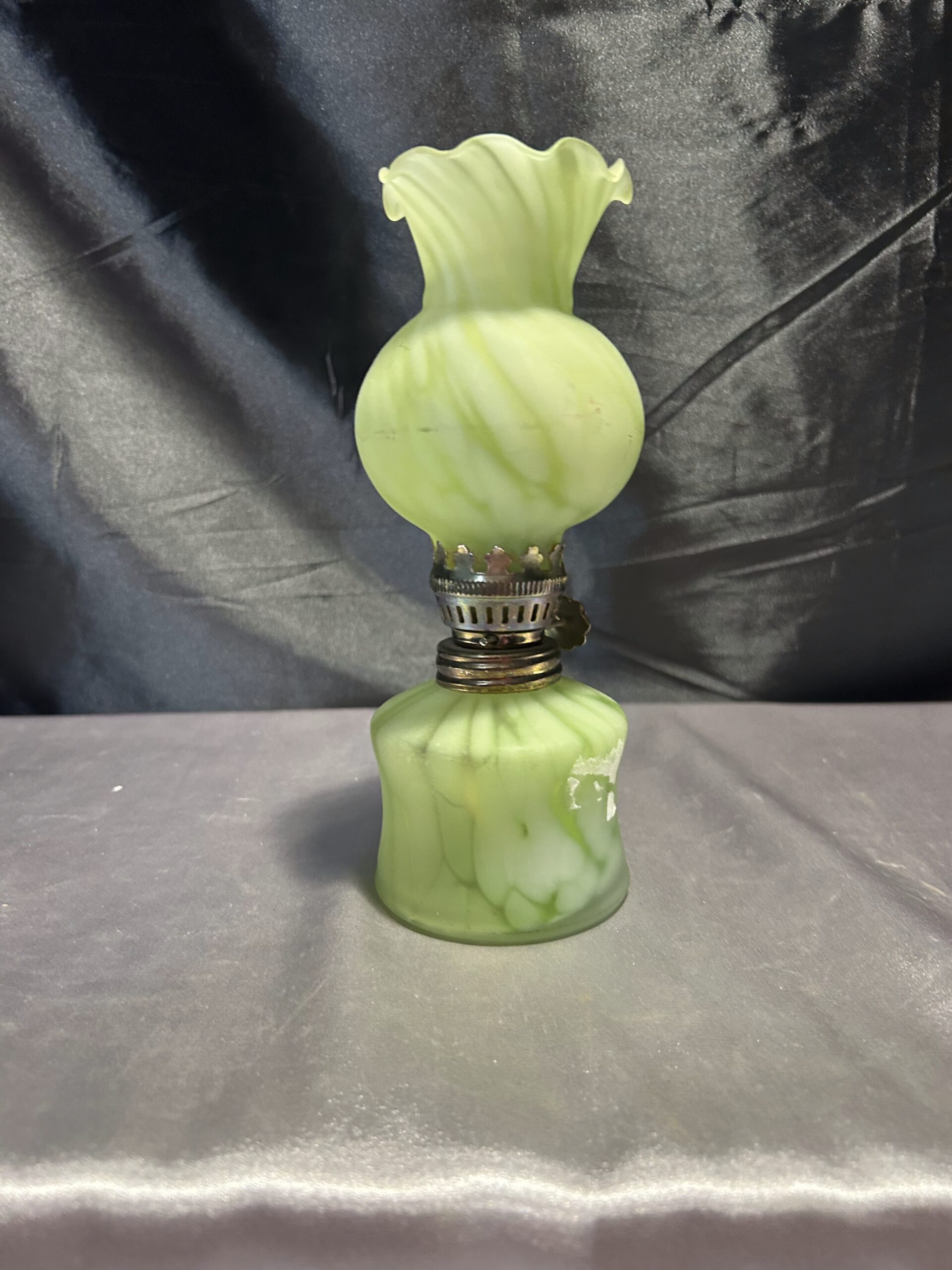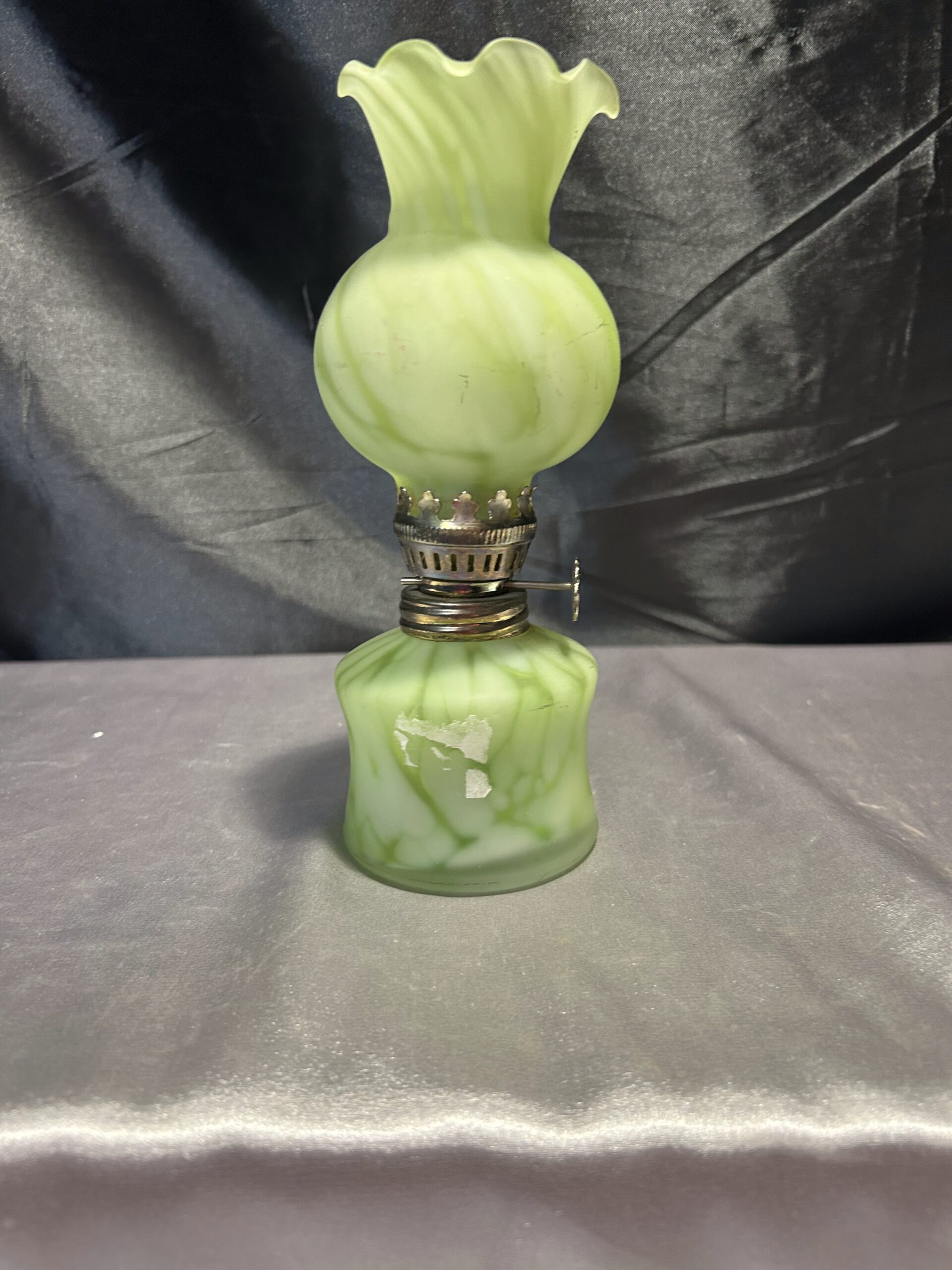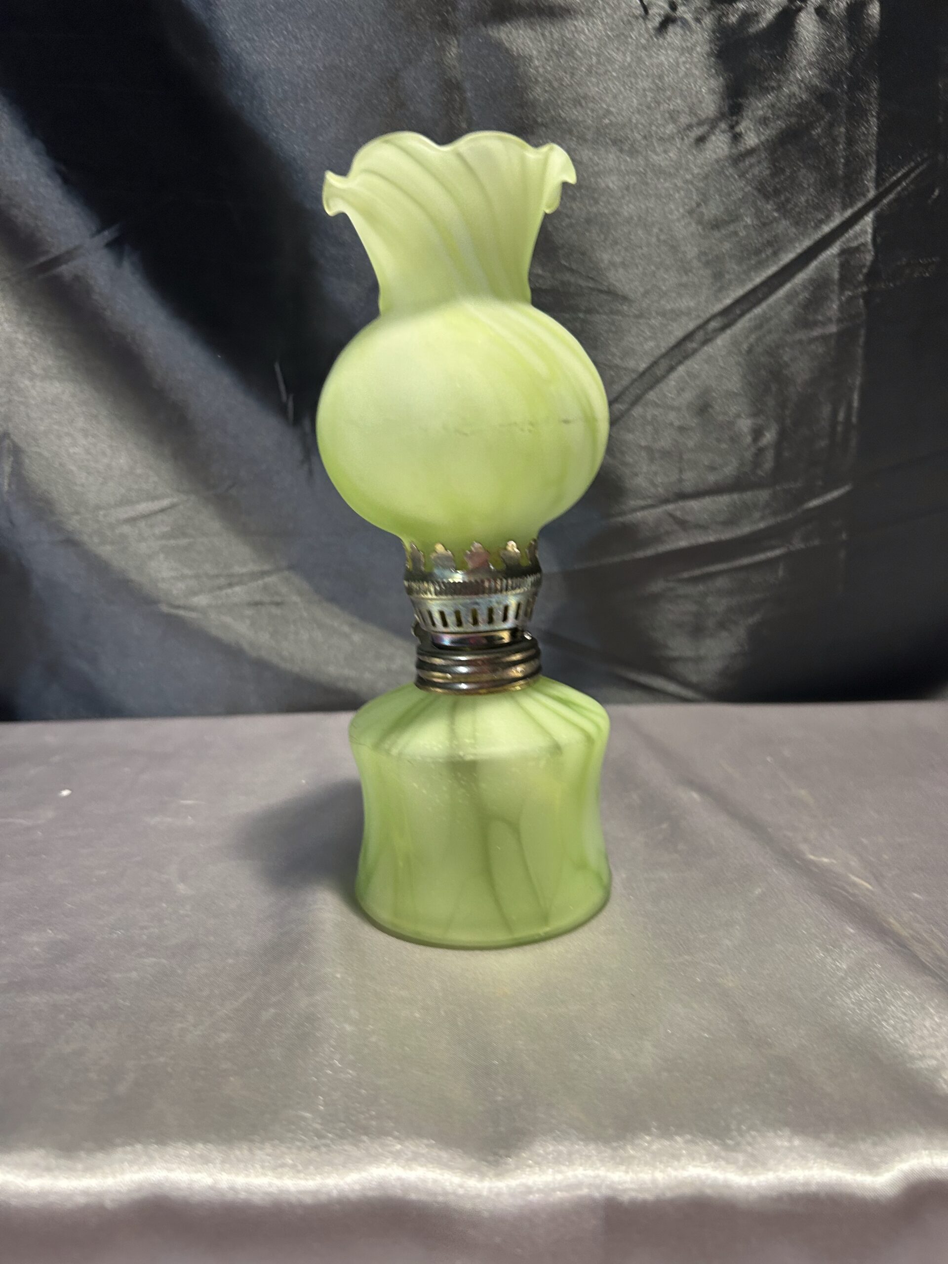 Wyjątkowa lampa naftowa o subtelnym zielonkawym odcieniu, wykonana z ręcznie dmuchanego szkła. Wyposażona w falbankę na zwieńczeniu klosza, co dodaje jej uroku i elegancji. Lampa jest w pełni sprawna, z nowym knotem, a szkło nie świeci w ultrafiolecie, co świadczy o jego naturalnej jakości.