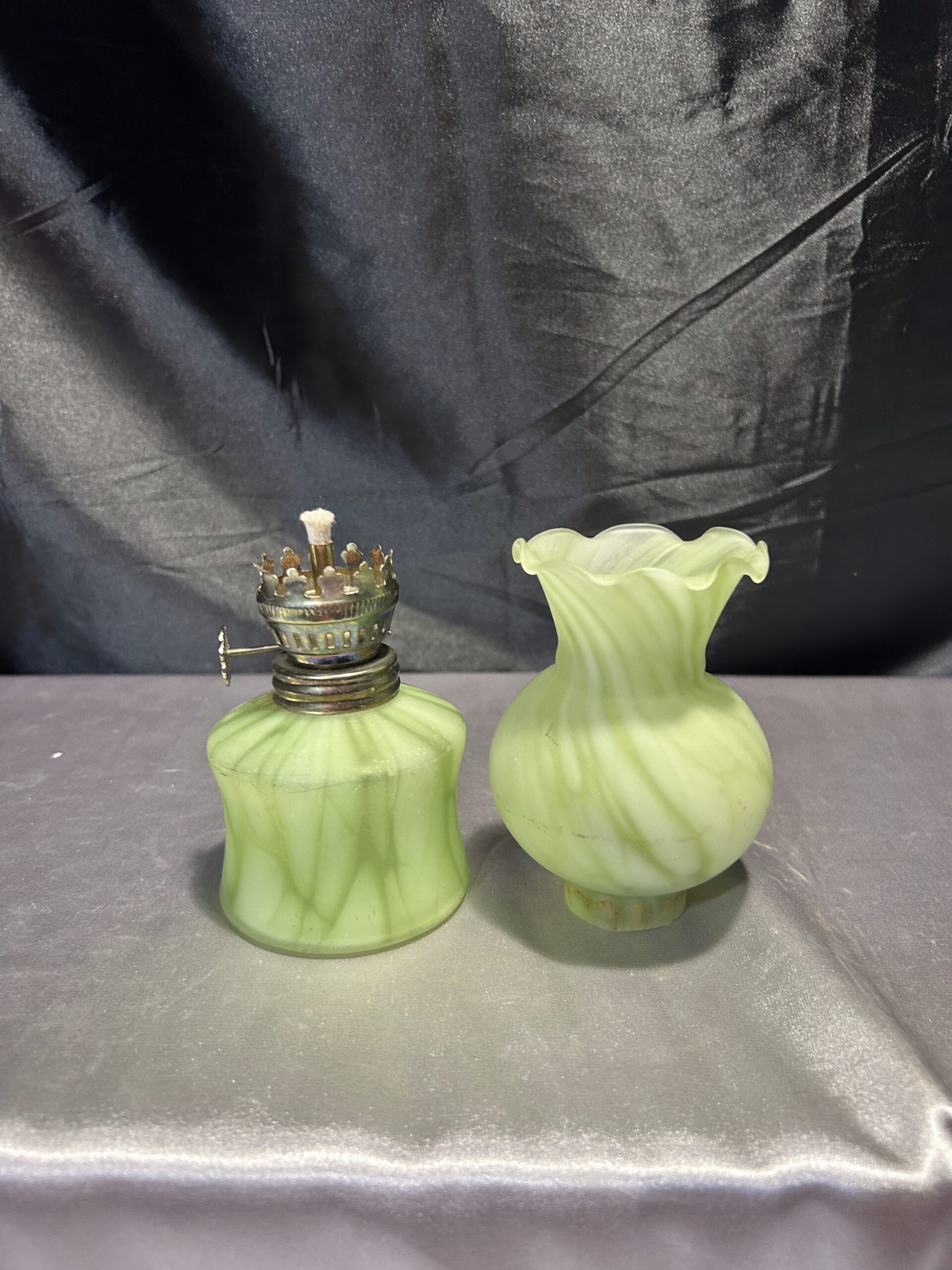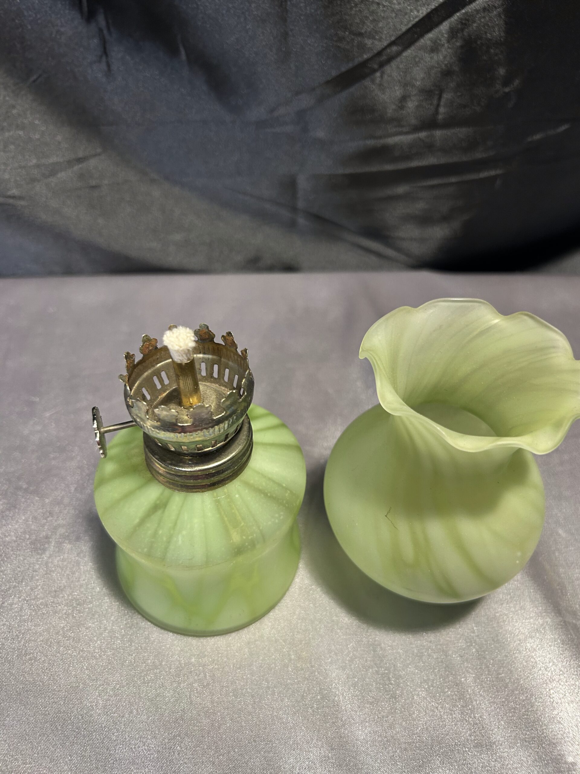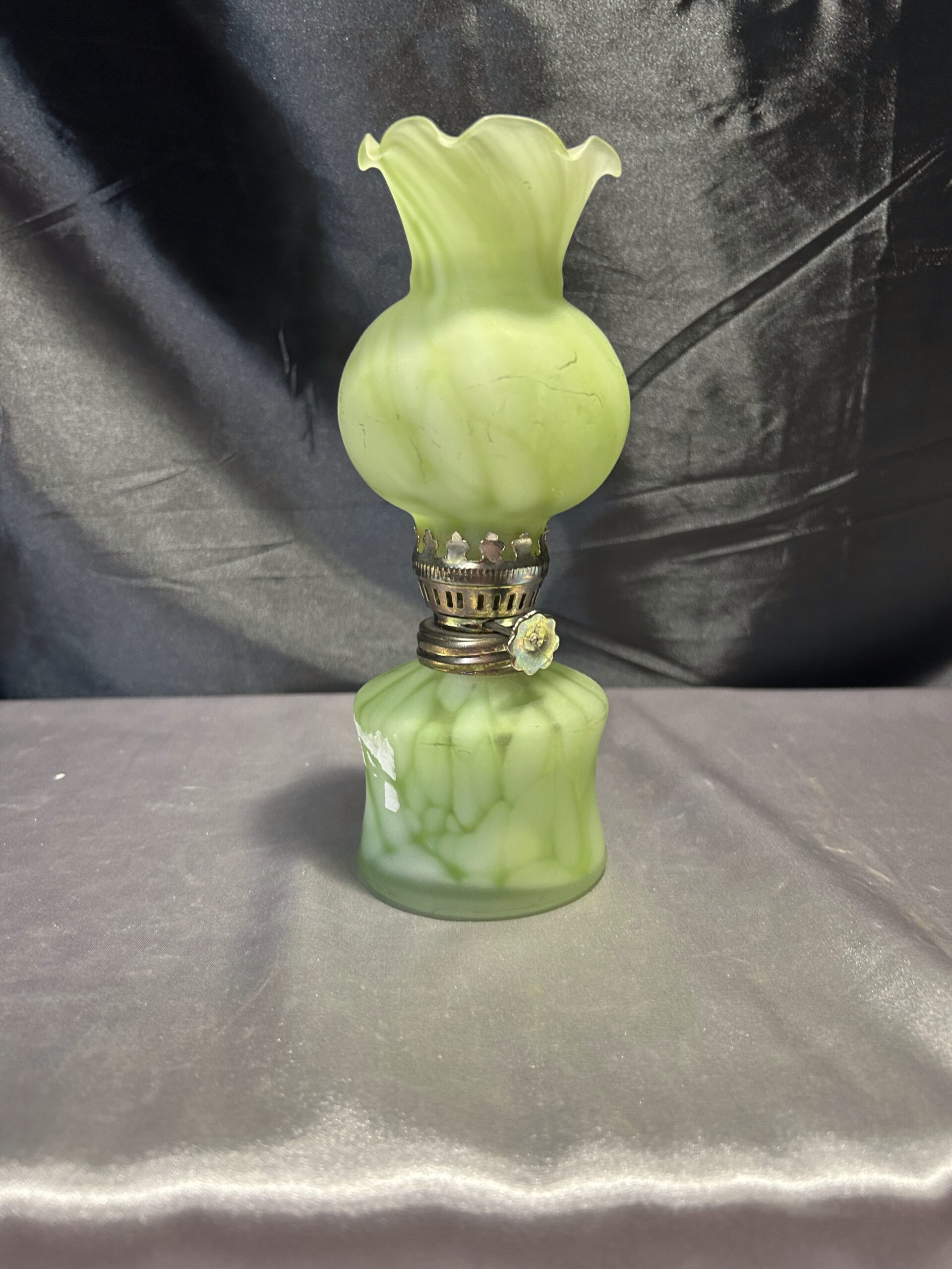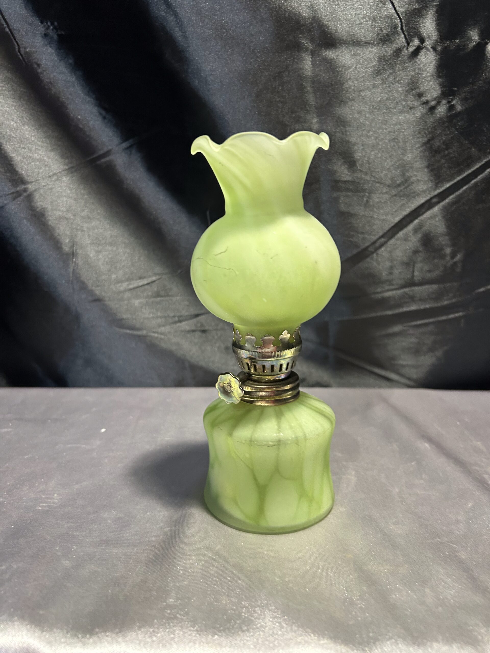 Wyjątkowa lampa naftowa o subtelnym zielonkawym odcieniu, wykonana z ręcznie dmuchanego szkła. Wyposażona w falbankę na zwieńczeniu klosza, co dodaje jej uroku i elegancji. Lampa jest w pełni sprawna, z nowym knotem, a szkło nie świeci w ultrafiolecie, co świadczy o jego naturalnej jakości.