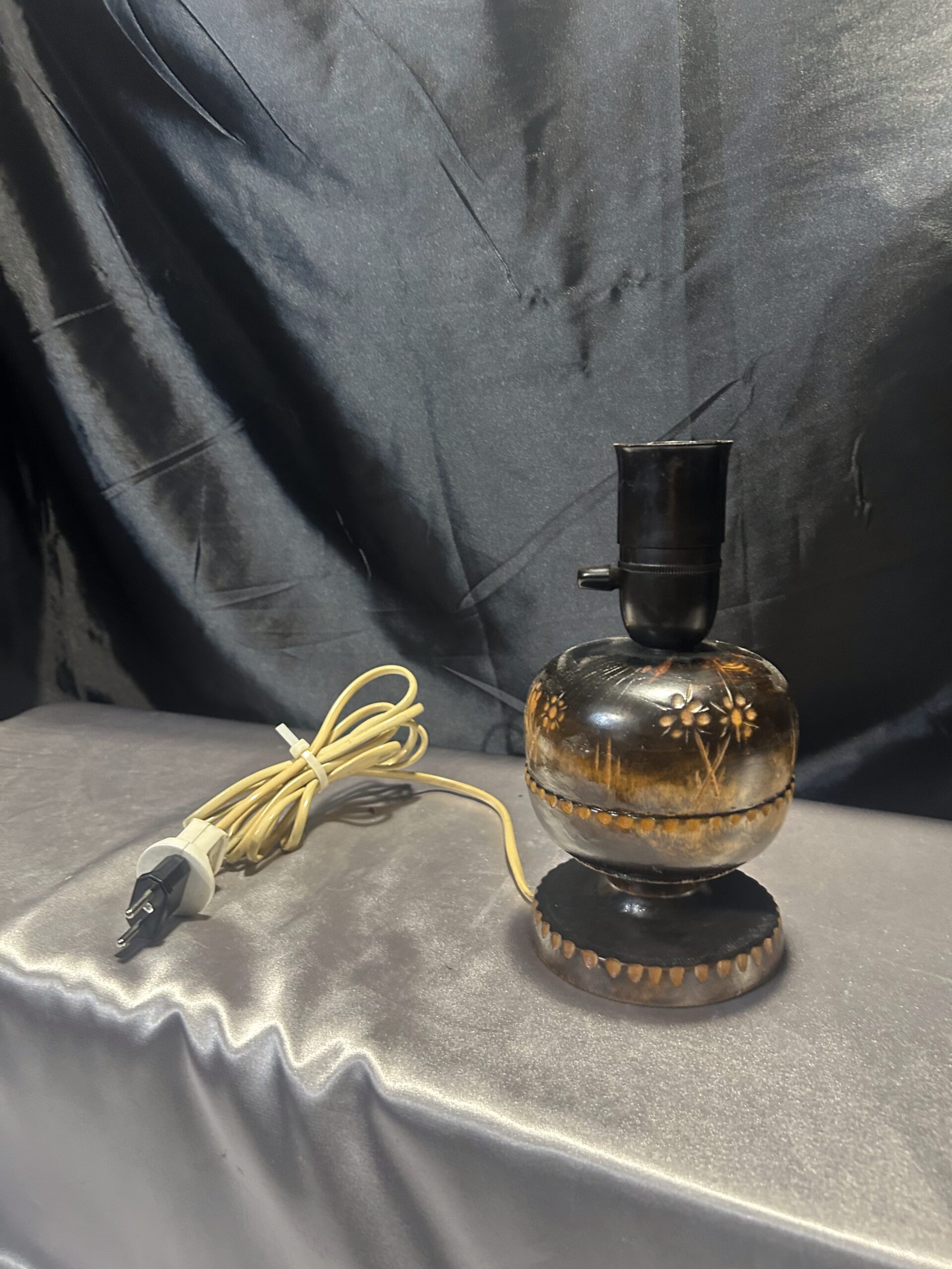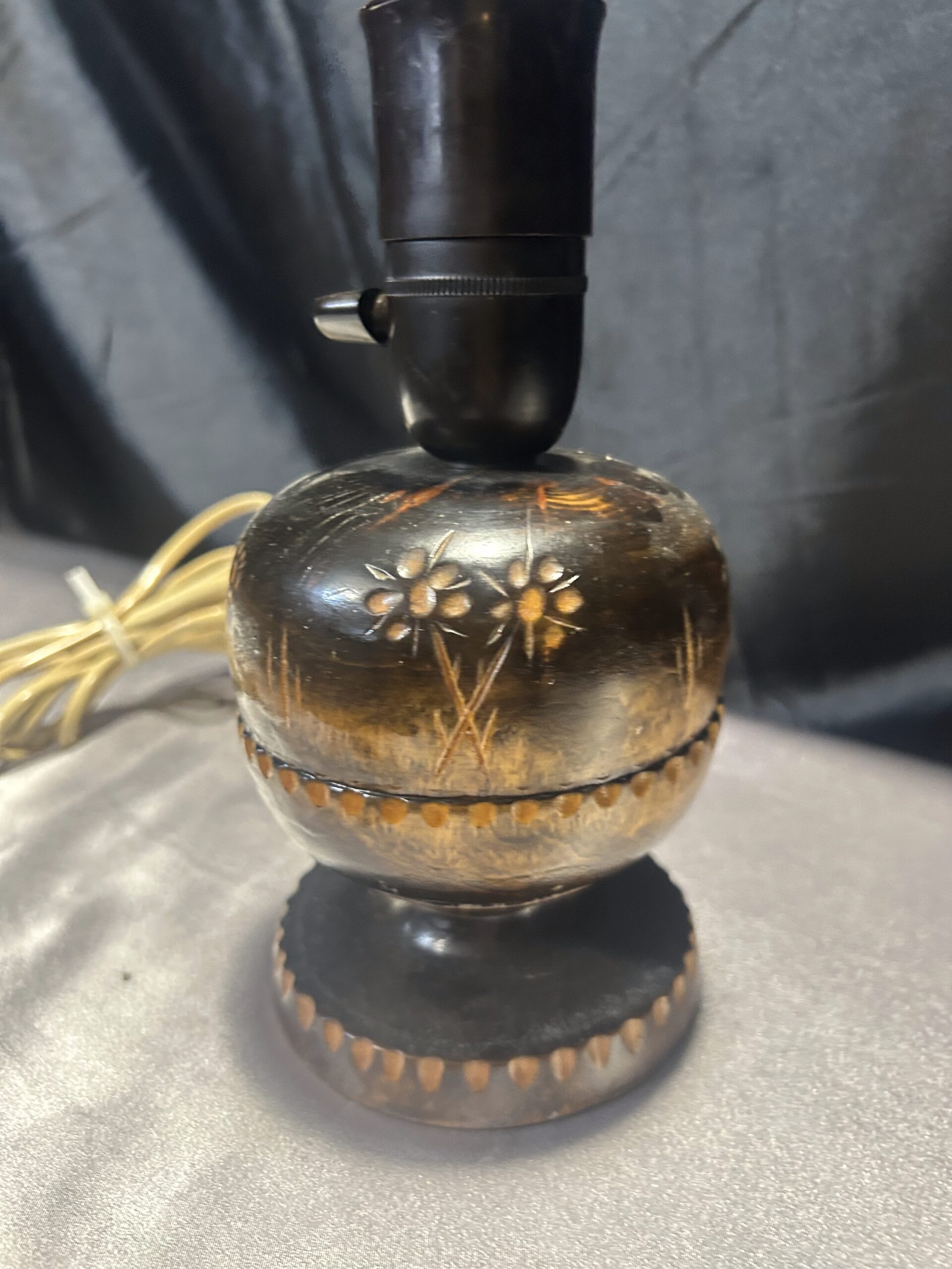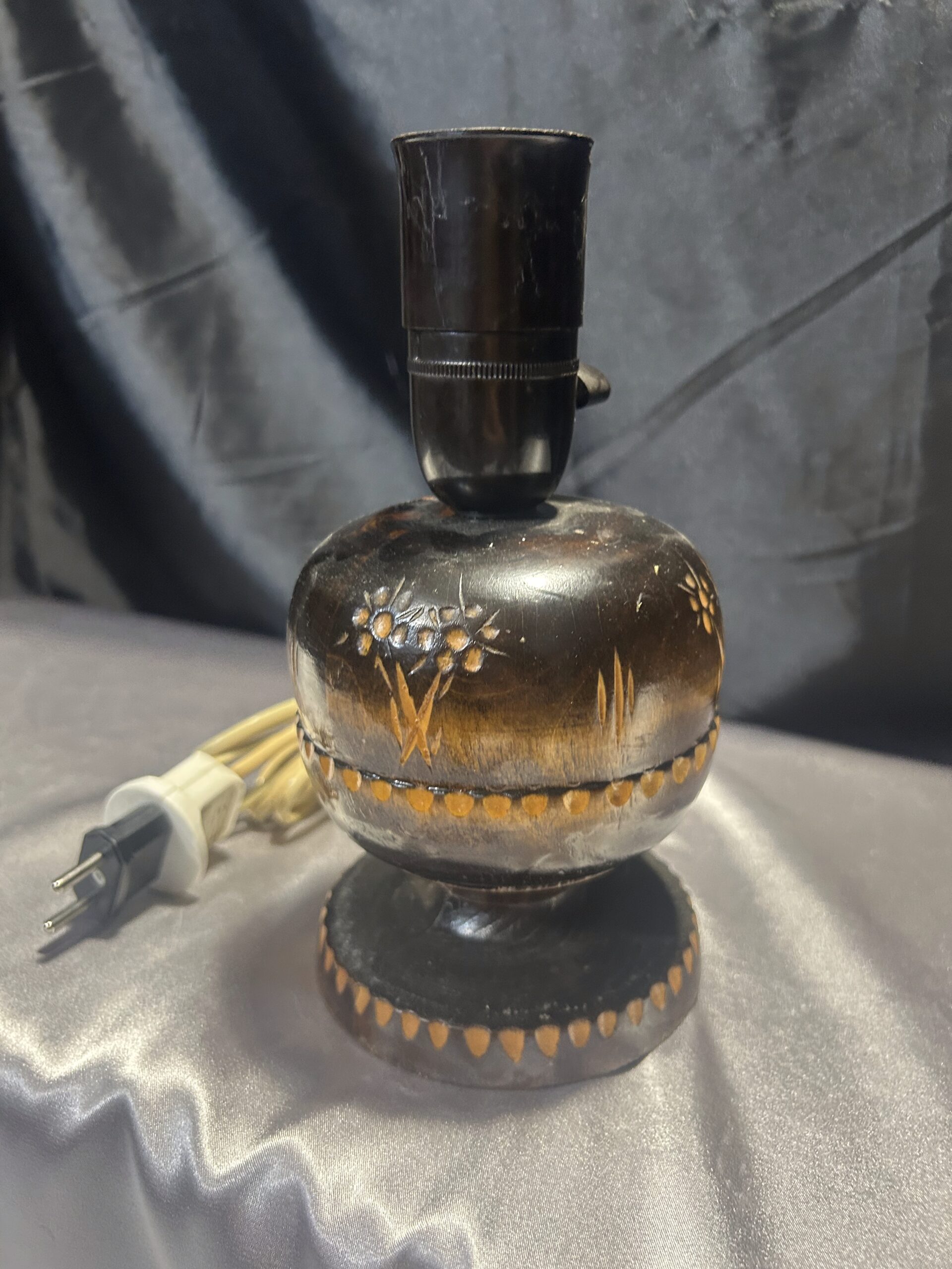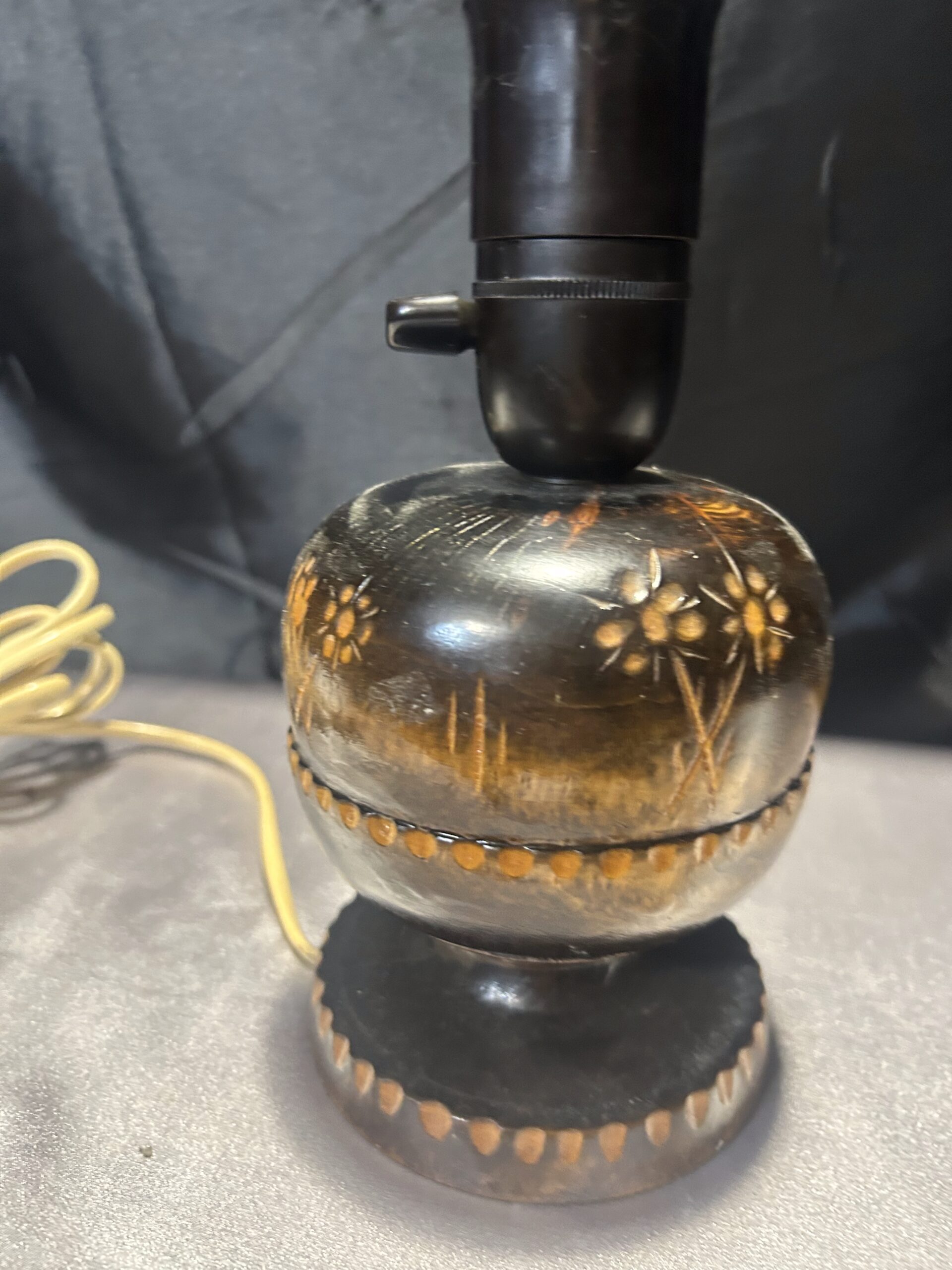 Unikalna lampa stojąca wykonana z drewna, ozdobiona delikatnymi rzeźbieniami i rycinami, które nadają jej wyjątkowego charakteru. Wyposażona w włącznik na lampie, łączy w sobie funkcjonalność i dekoracyjność. Idealna na szafkę, biurko lub komodę, wprowadzając do wnętrza ciepły, naturalny akcent.
