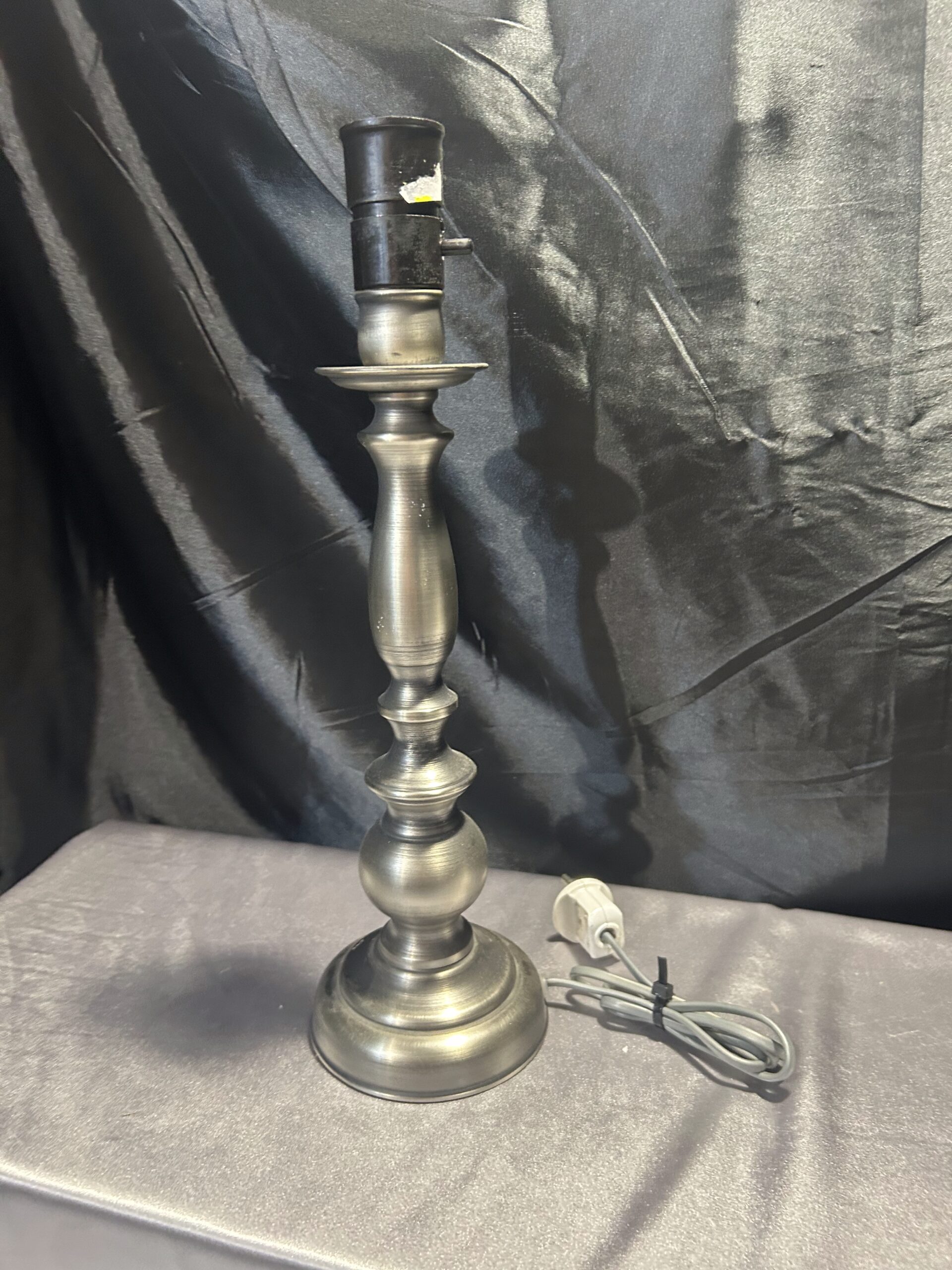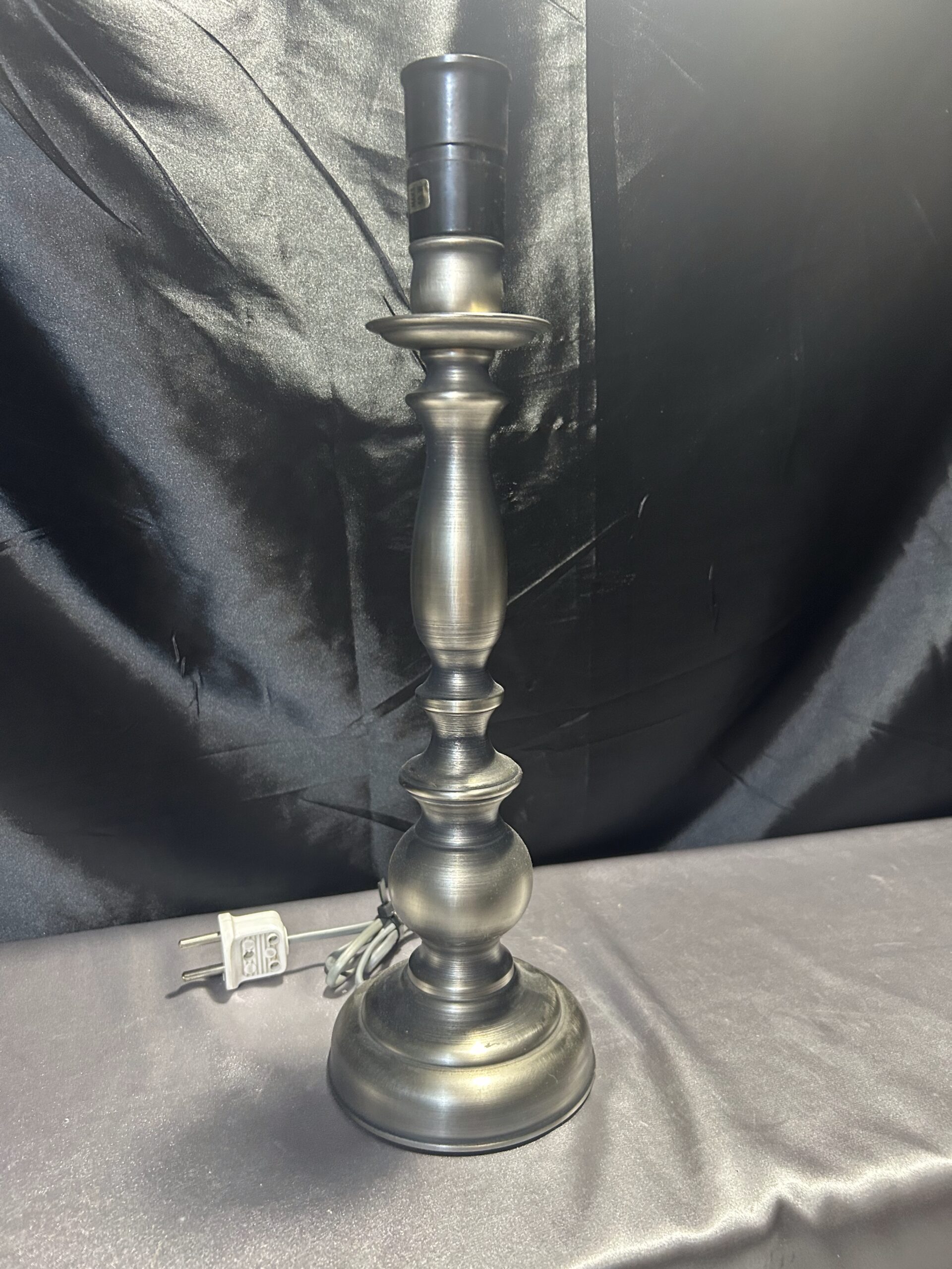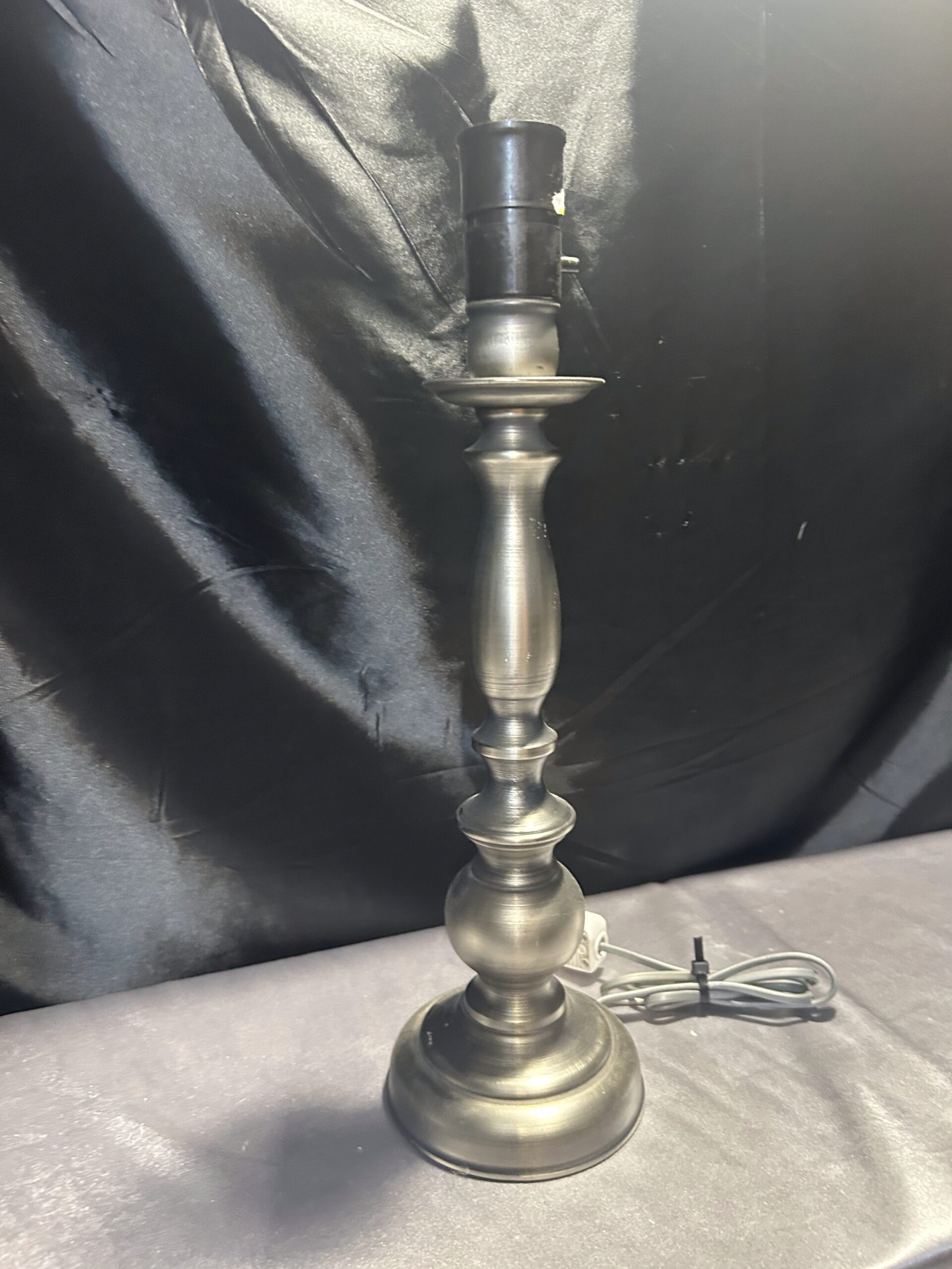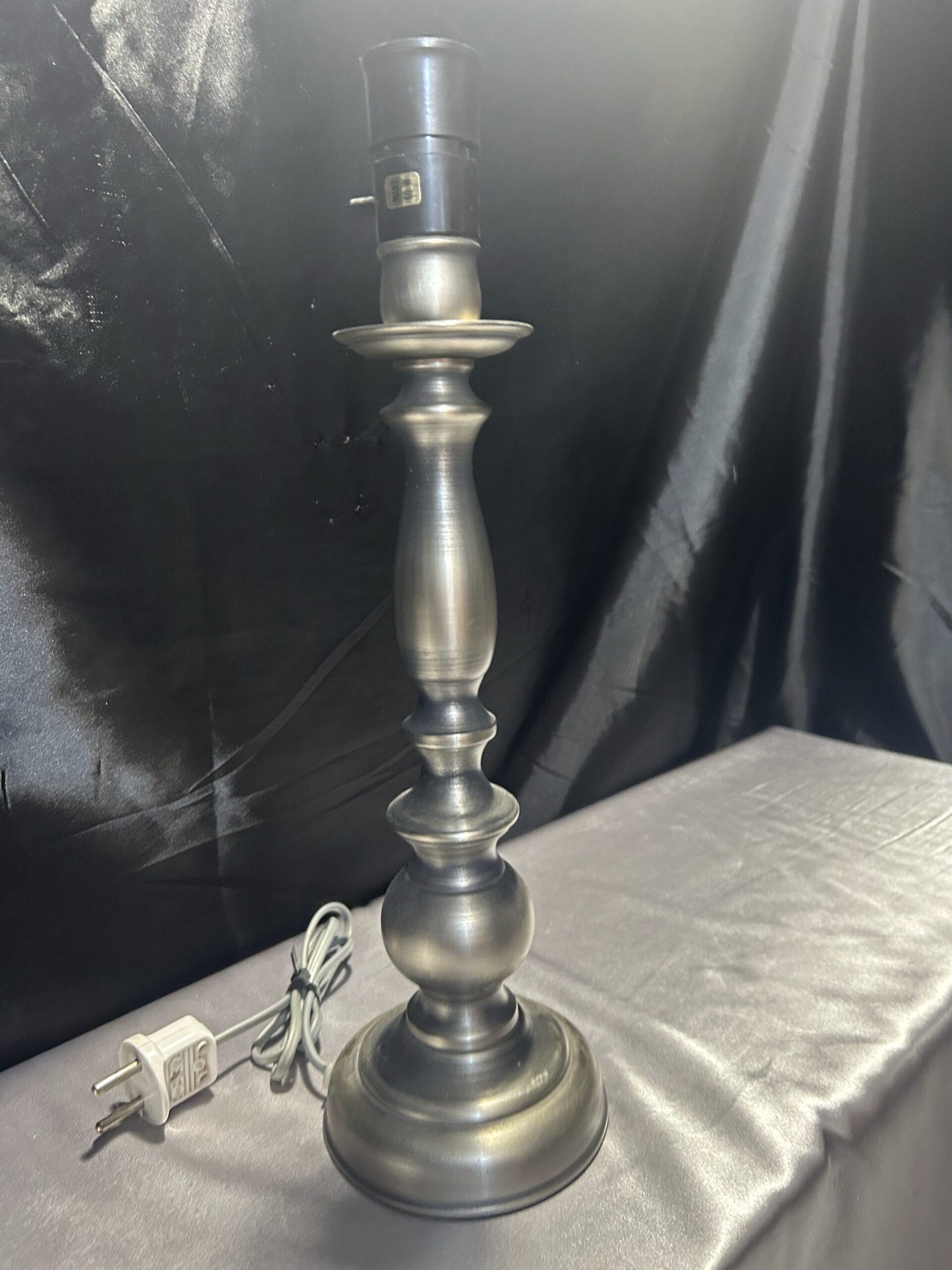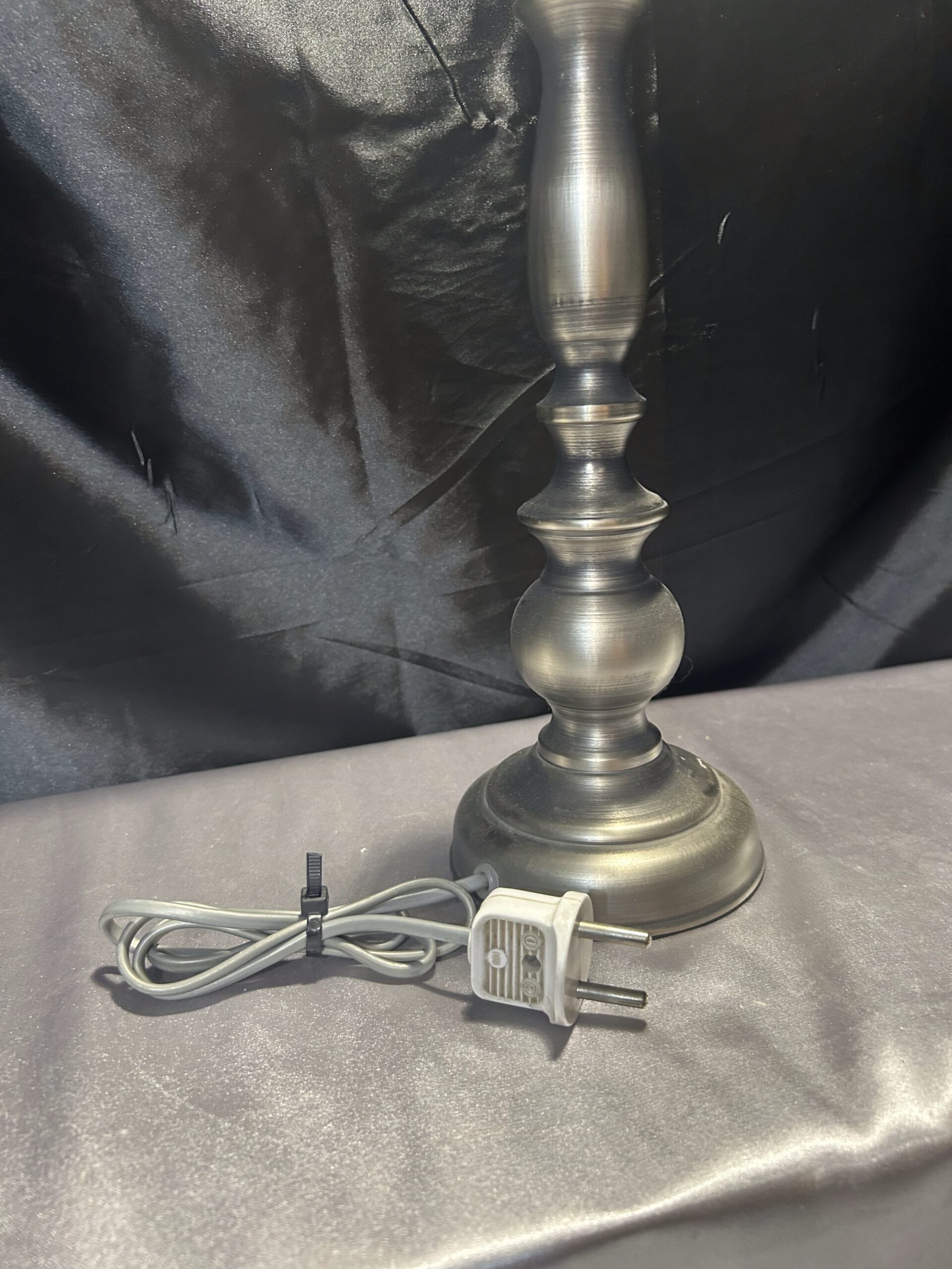 Tagi: 252/24, elegancka lampa, lampa stojąca, lampka na komodę, lampka na szafkę, metalowa lampa, oświetlenie wnętrz, srebrna lampa, toczony kształt