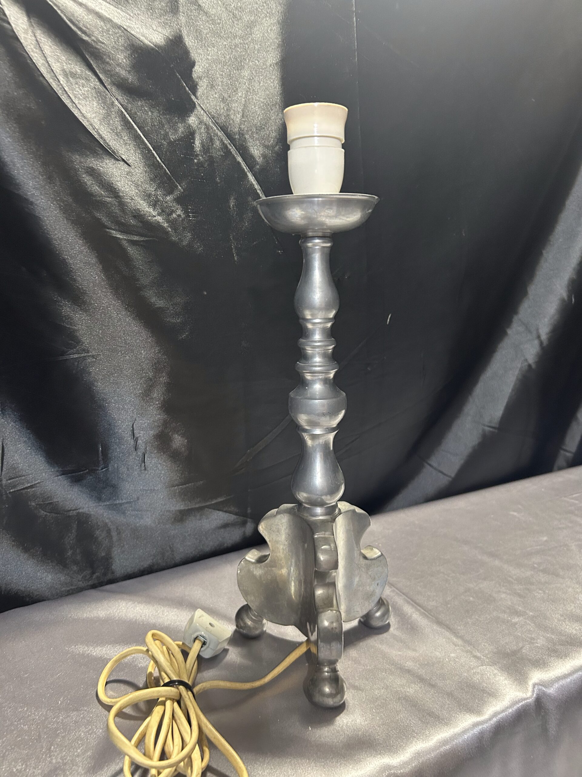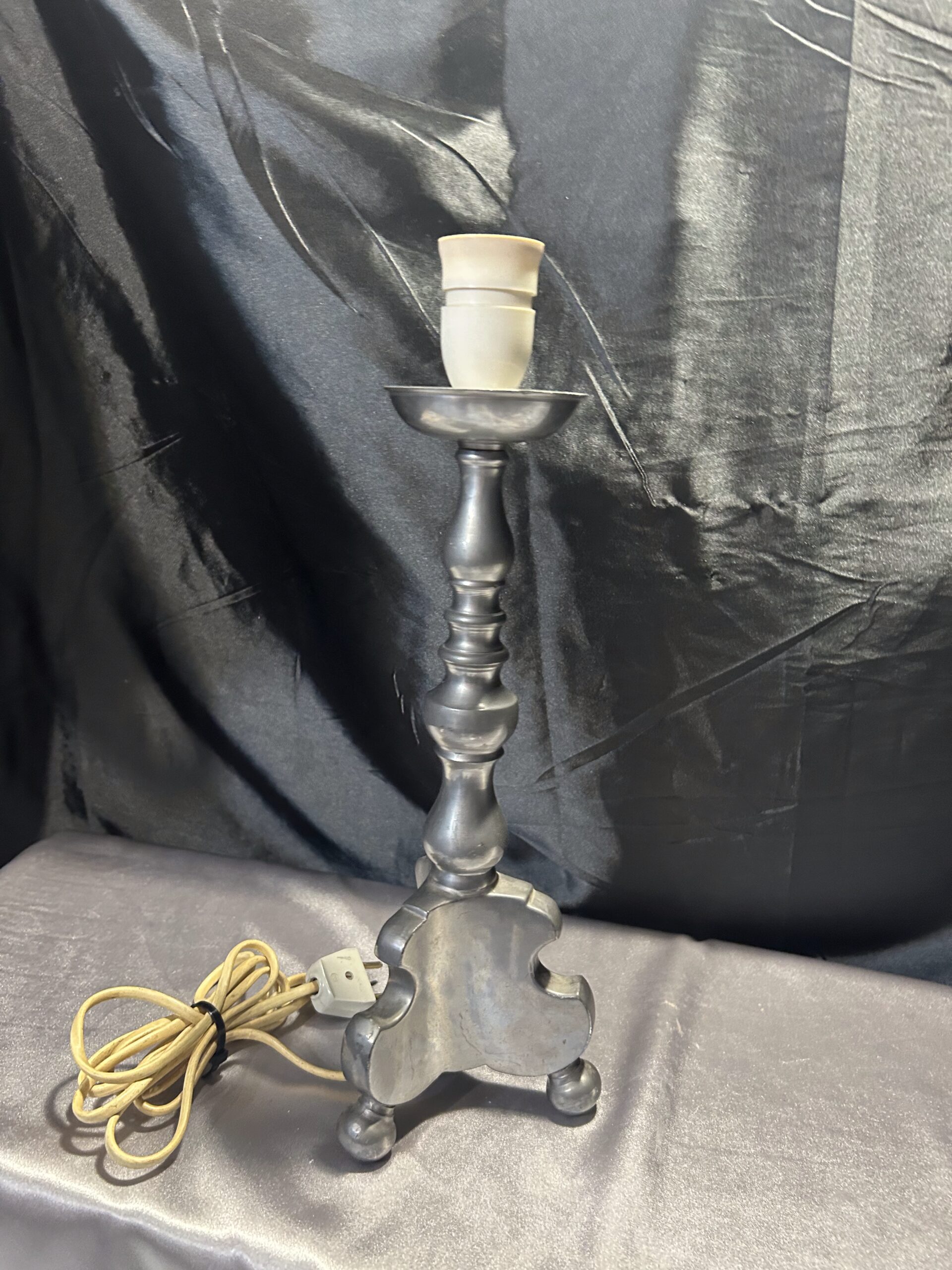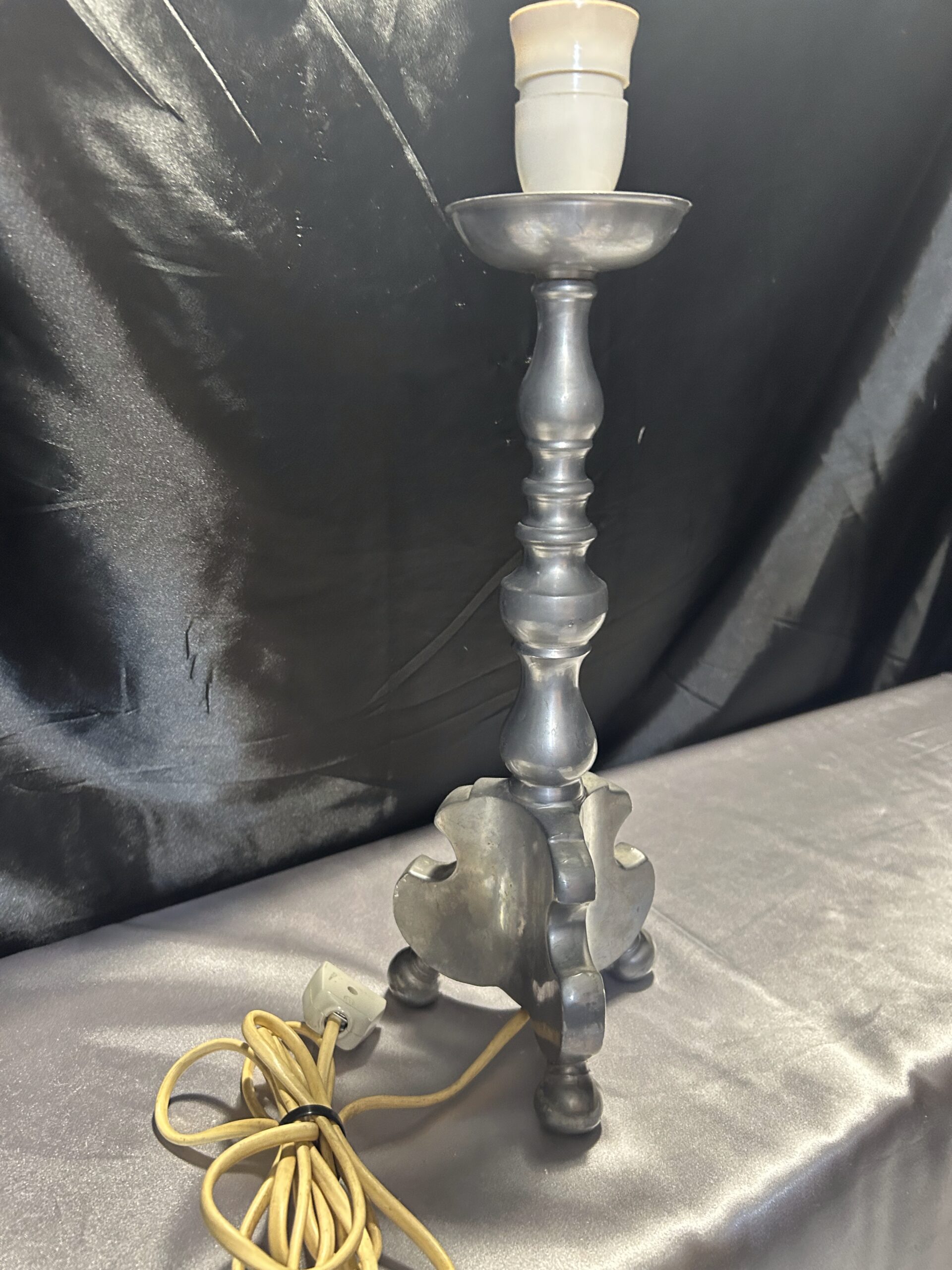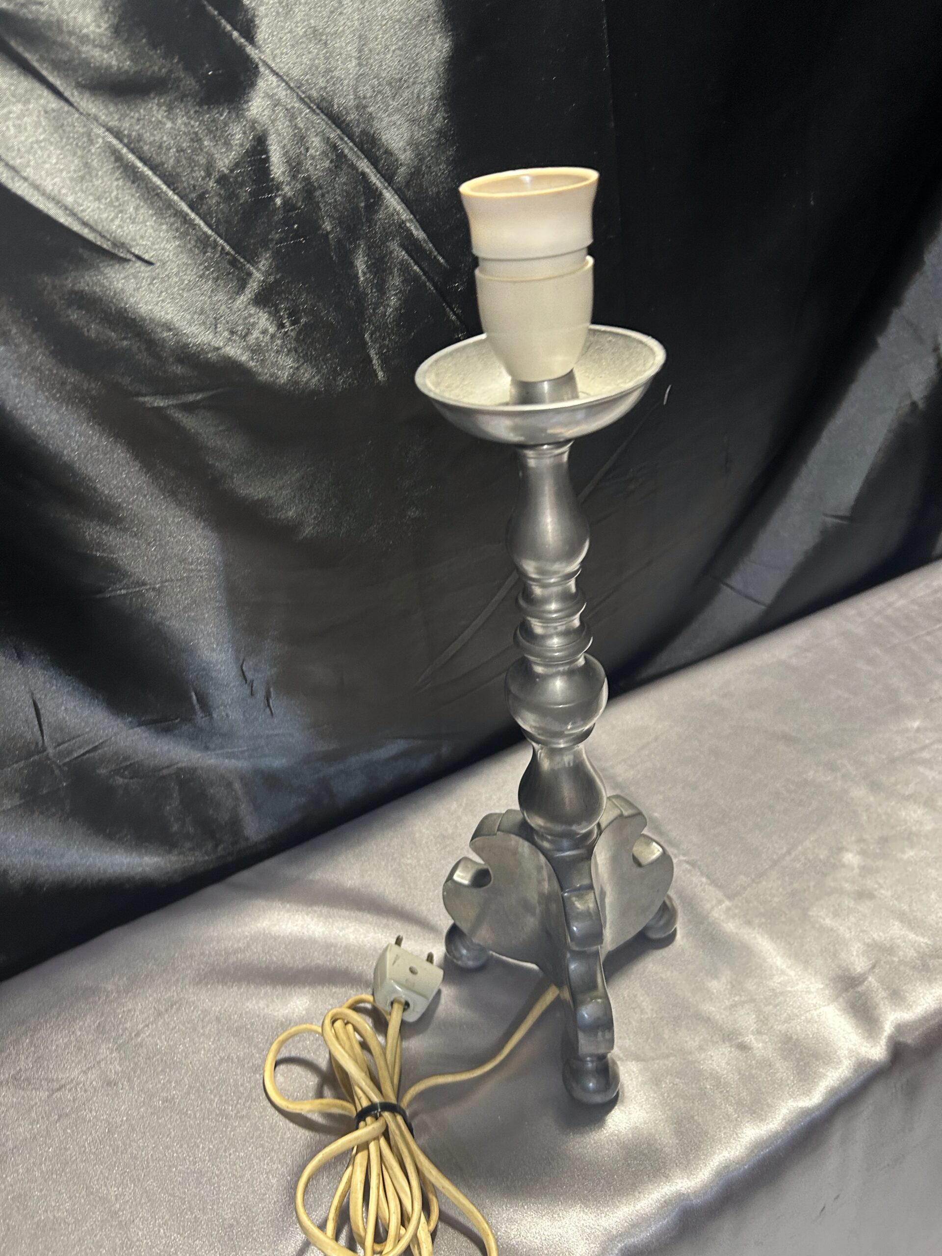 Stylowa lampa stojąca w srebrnym kolorze, wykonana z ołowiu, wyróżniająca się solidnym wykonaniem i stabilną konstrukcją na trzech nogach. Idealna na komodę, szafkę nocną lub parapet, łączy funkcjonalność z klasycznym stylem.