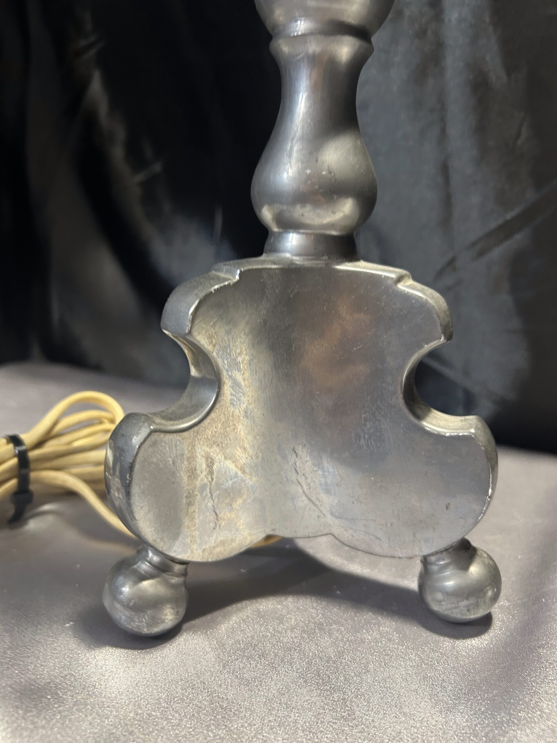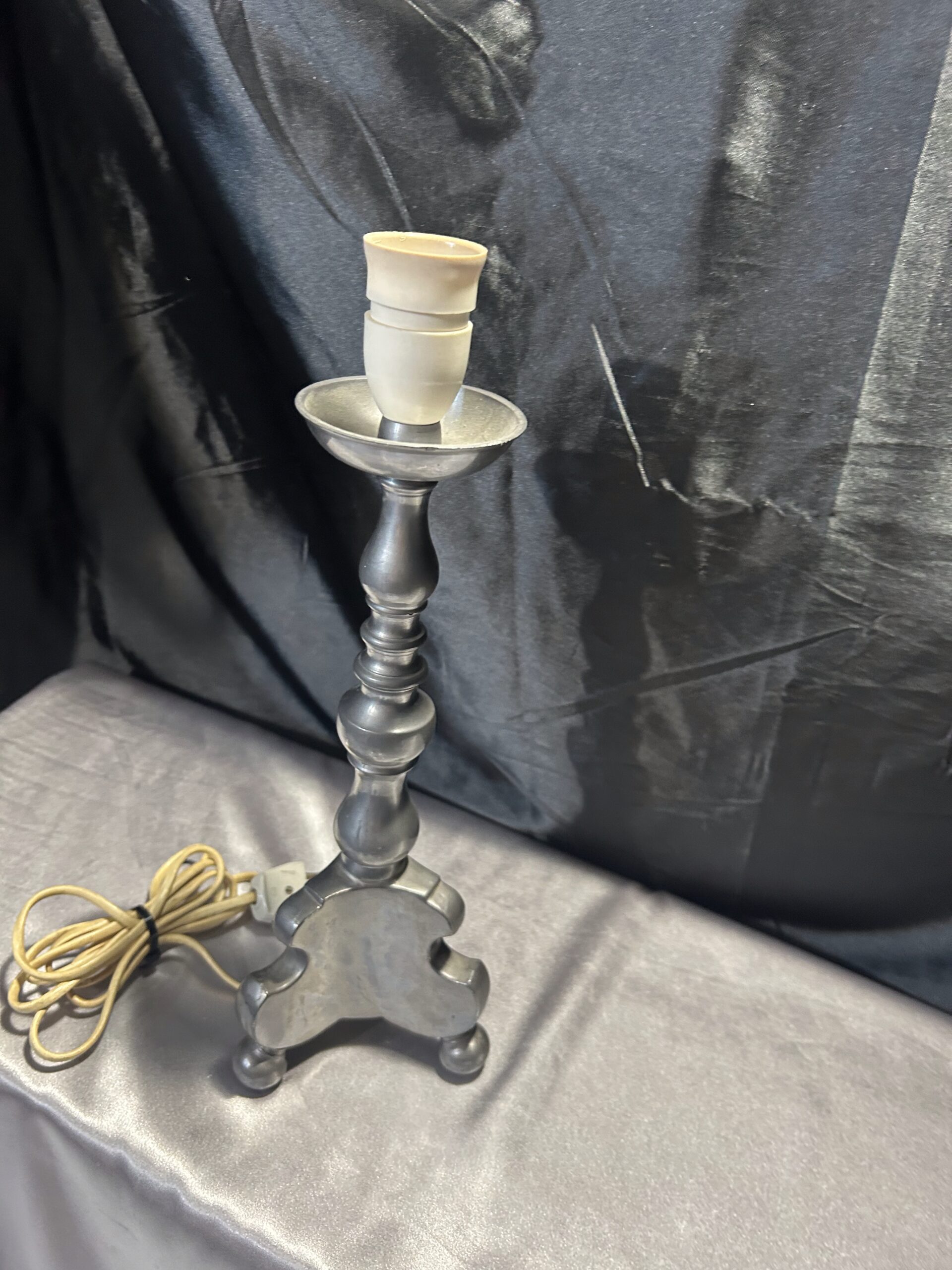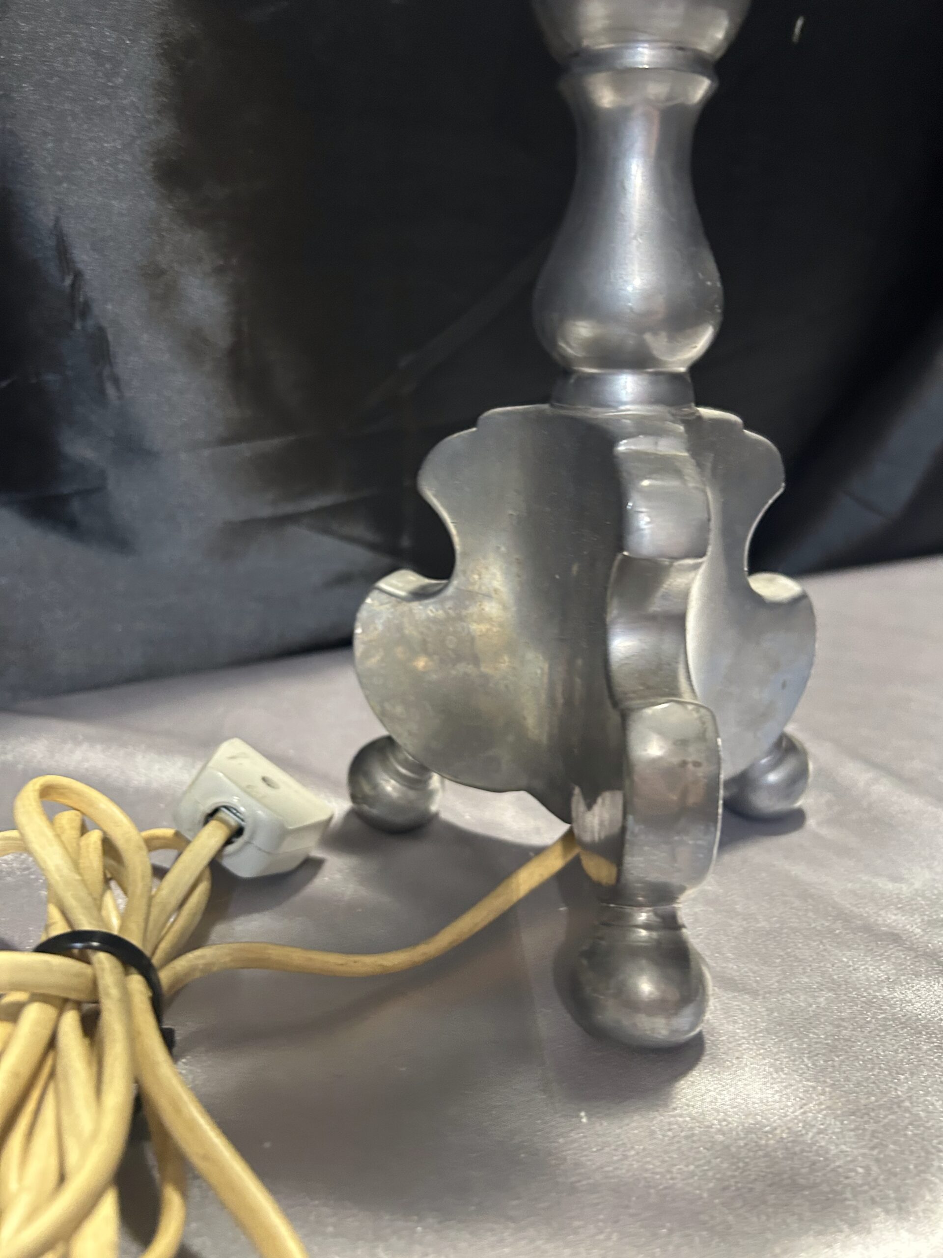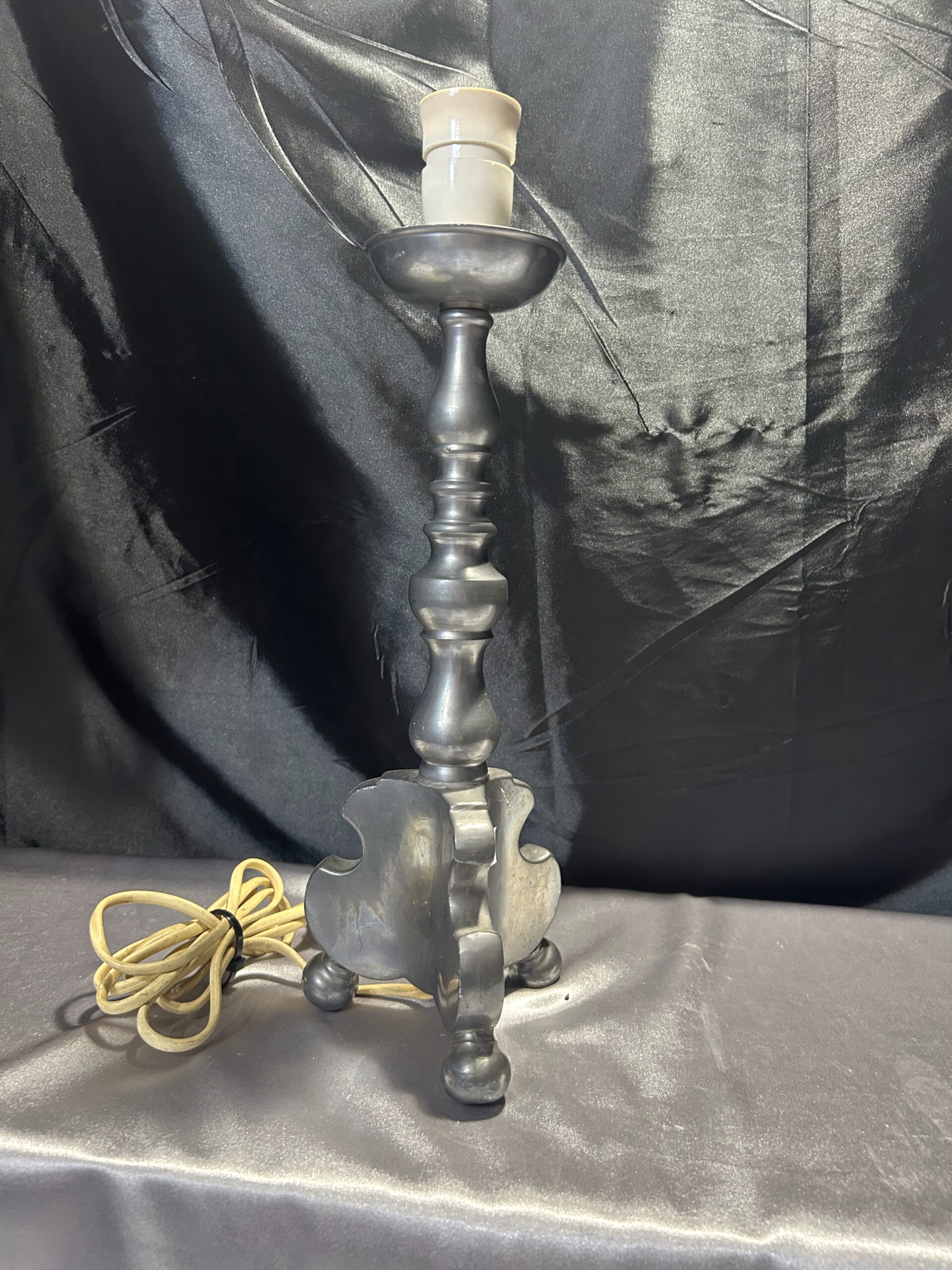 Stylowa lampa stojąca w srebrnym kolorze, wykonana z ołowiu, wyróżniająca się solidnym wykonaniem i stabilną konstrukcją na trzech nogach. Idealna na komodę, szafkę nocną lub parapet, łączy funkcjonalność z klasycznym stylem.