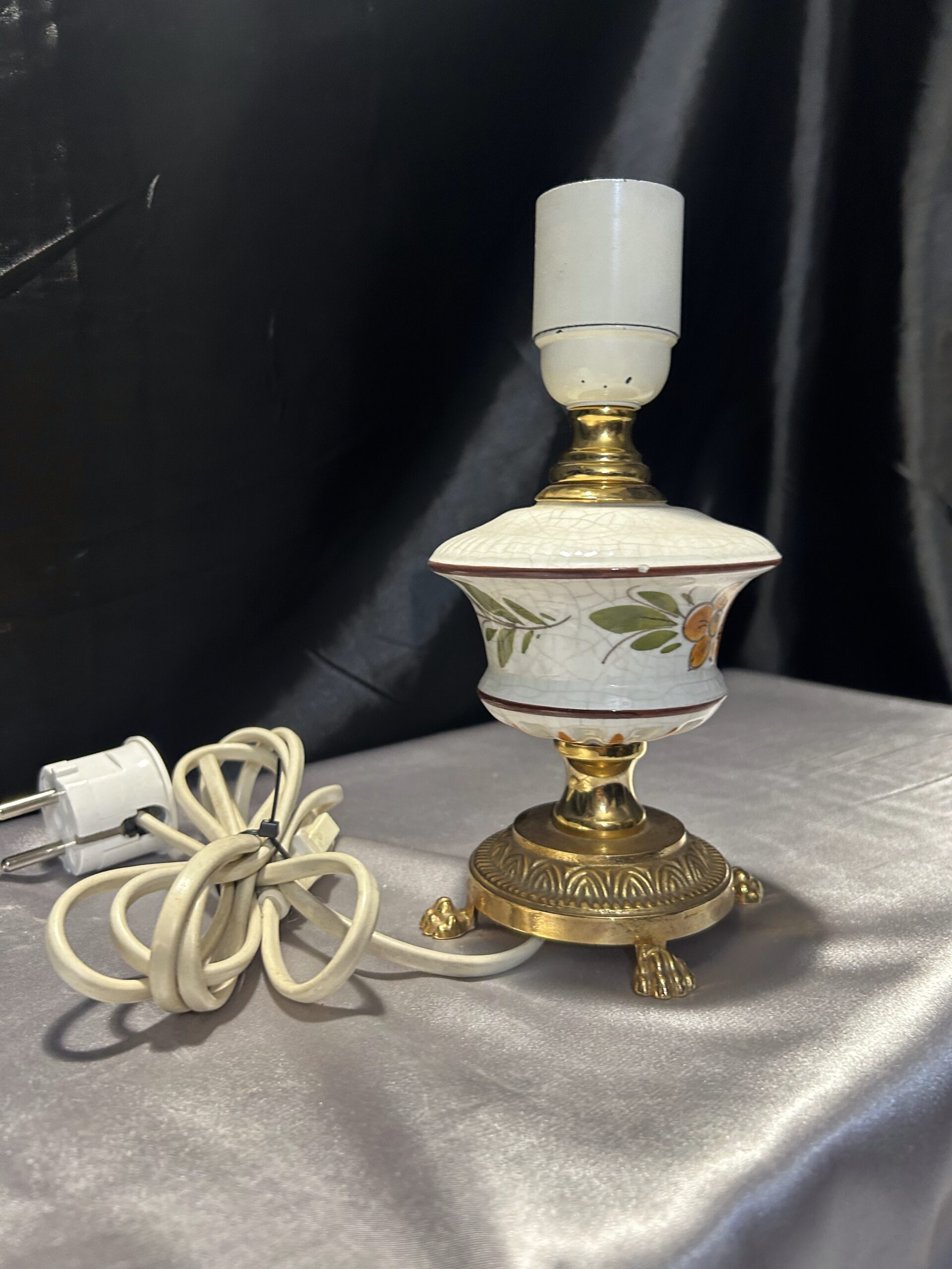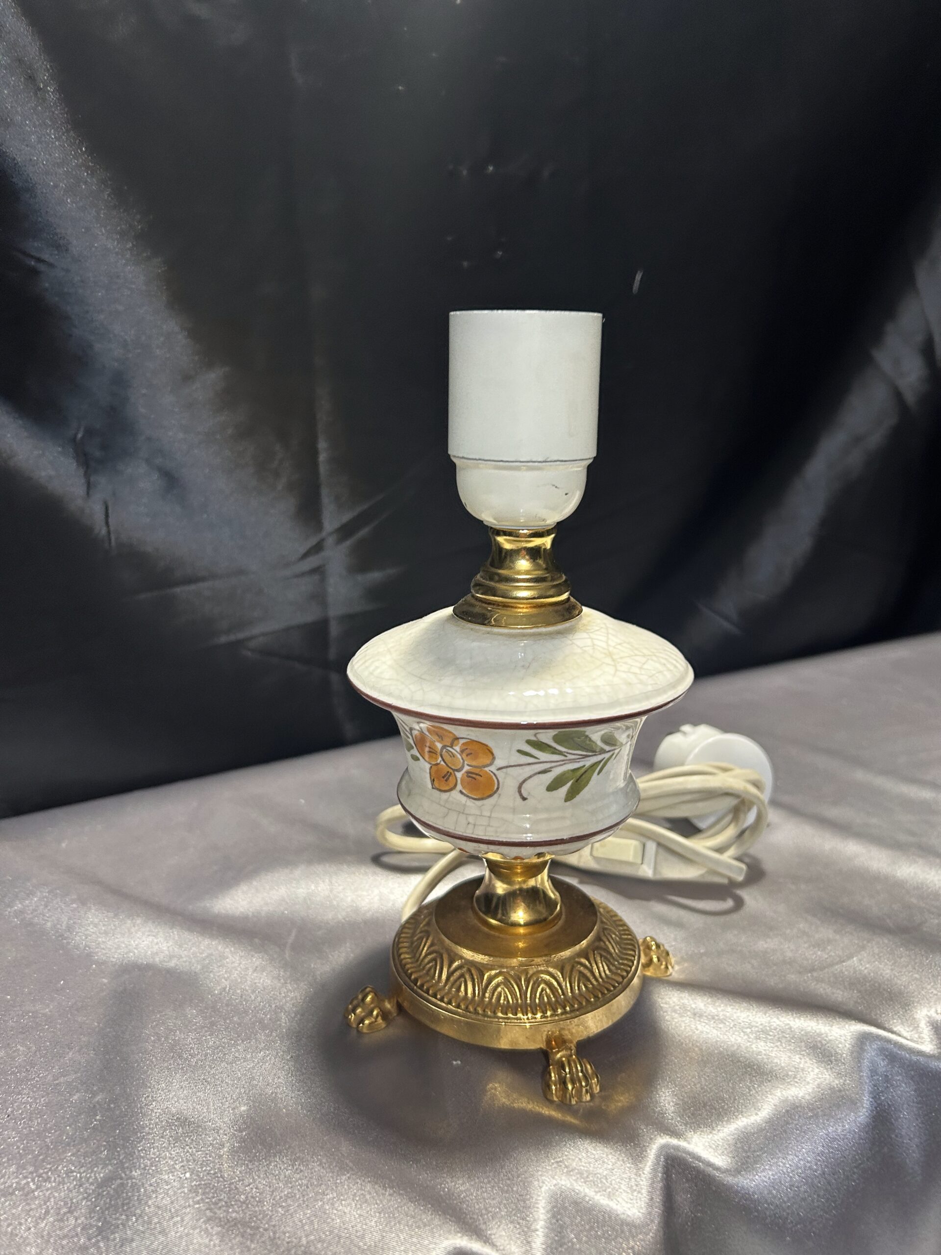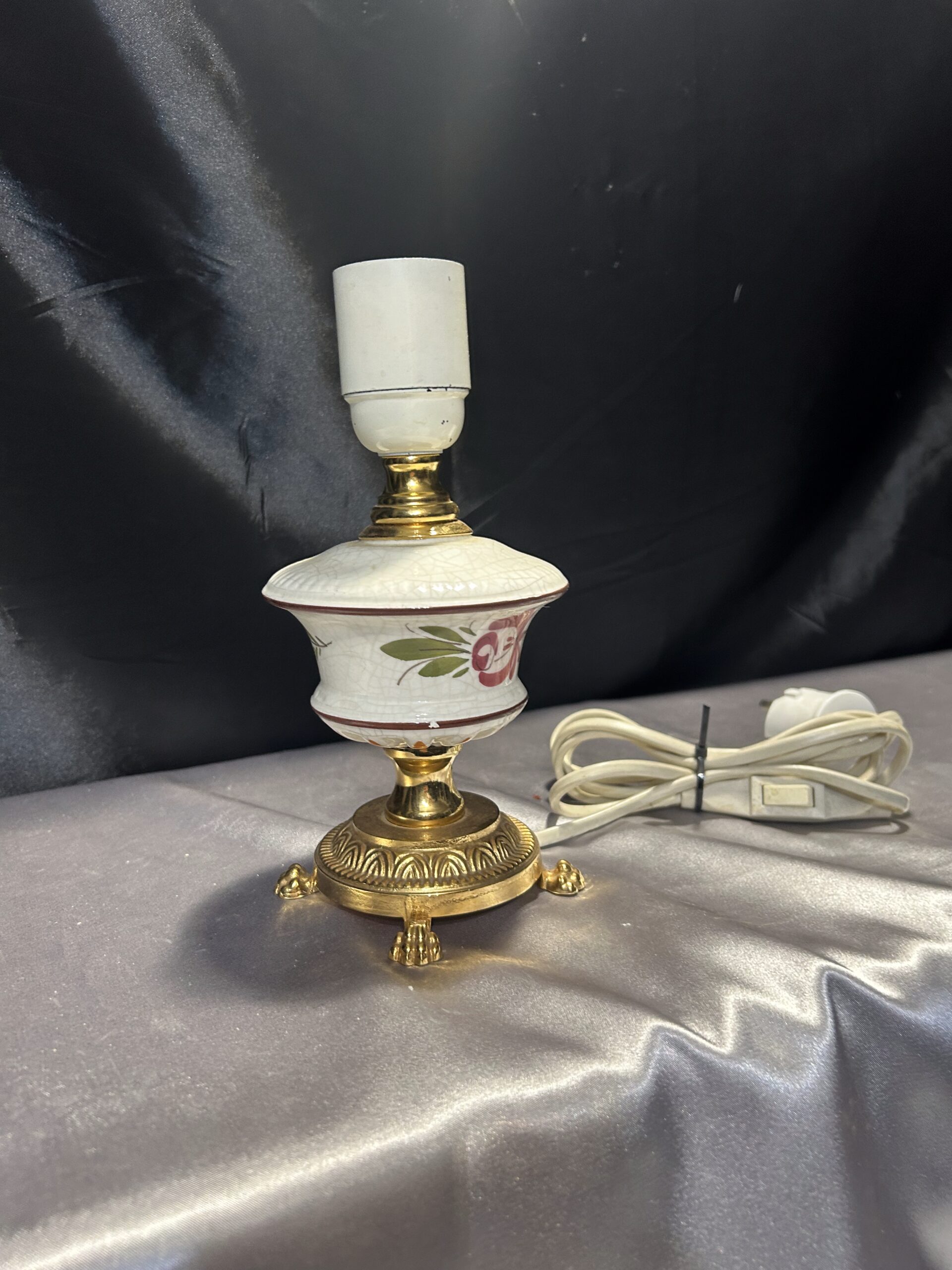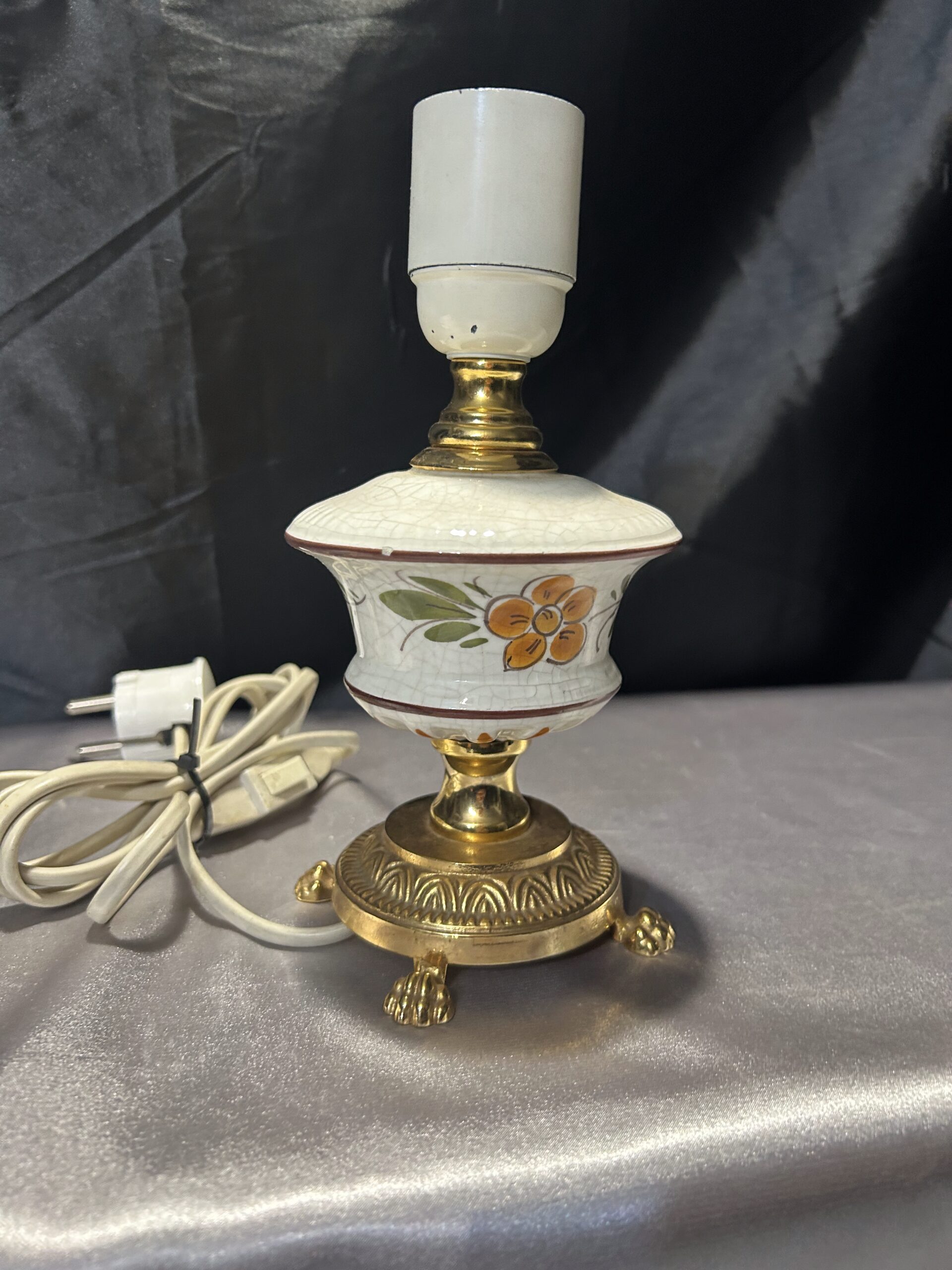 Urocza lampa stojąca wykonana z połączenia mosiądzu i ceramiki, zdobiona malowanym motywem kwiatowym na ceramicznej podstawie. Dzięki kompaktowym wymiarom i eleganckim detalom, takim jak lwie nogi, lampa świetnie sprawdzi się na komodzie, szafce lub parapecie. Włącznik na kablu zapewnia wygodę użytkowania.