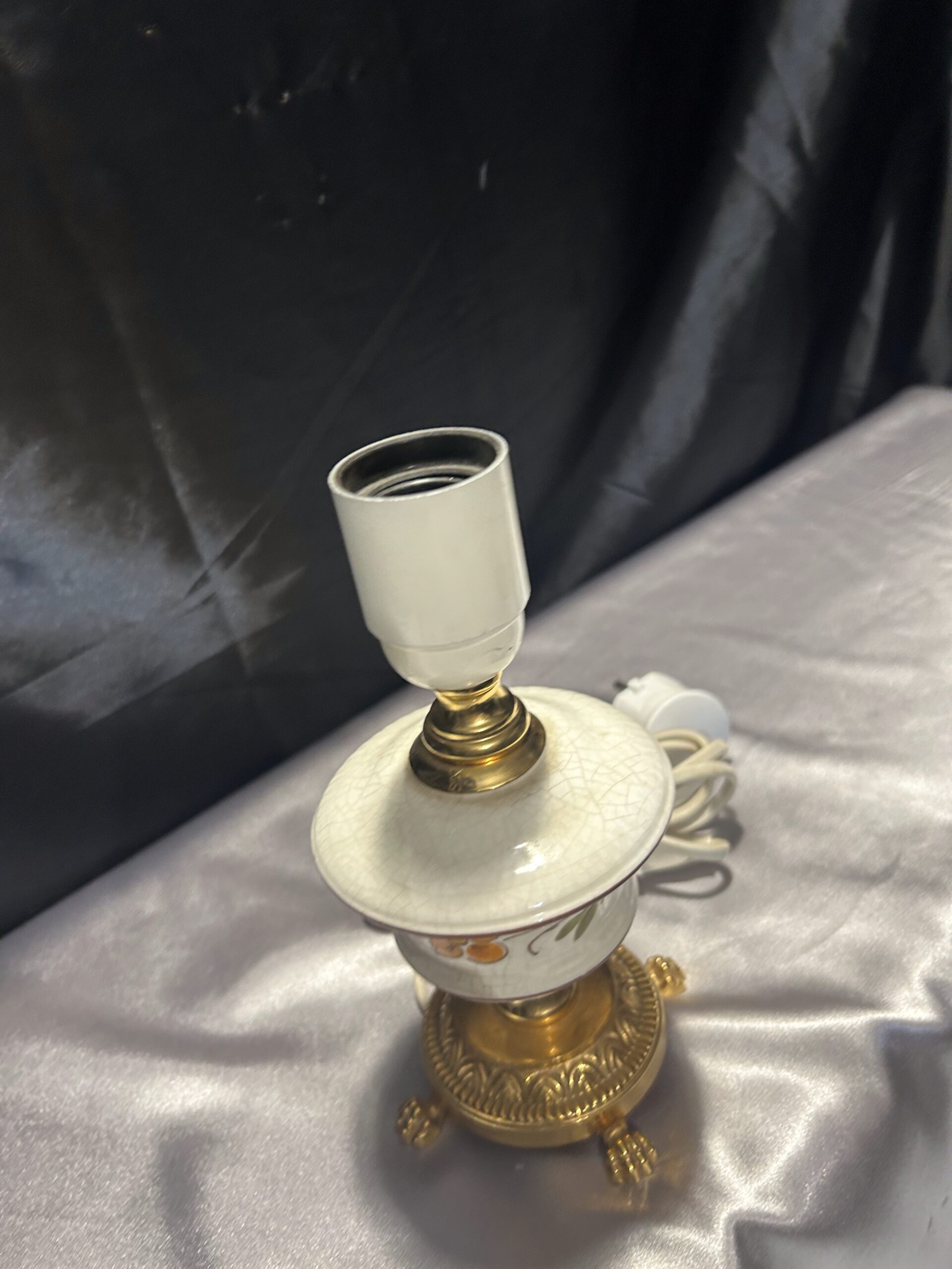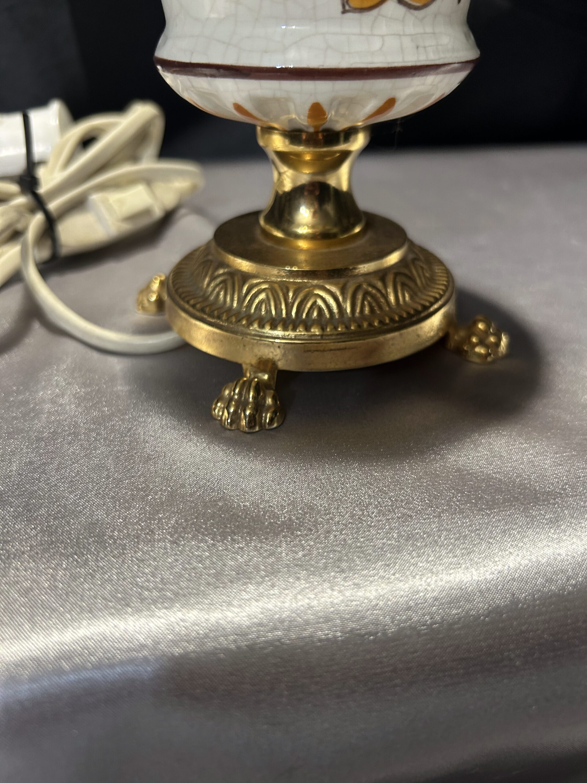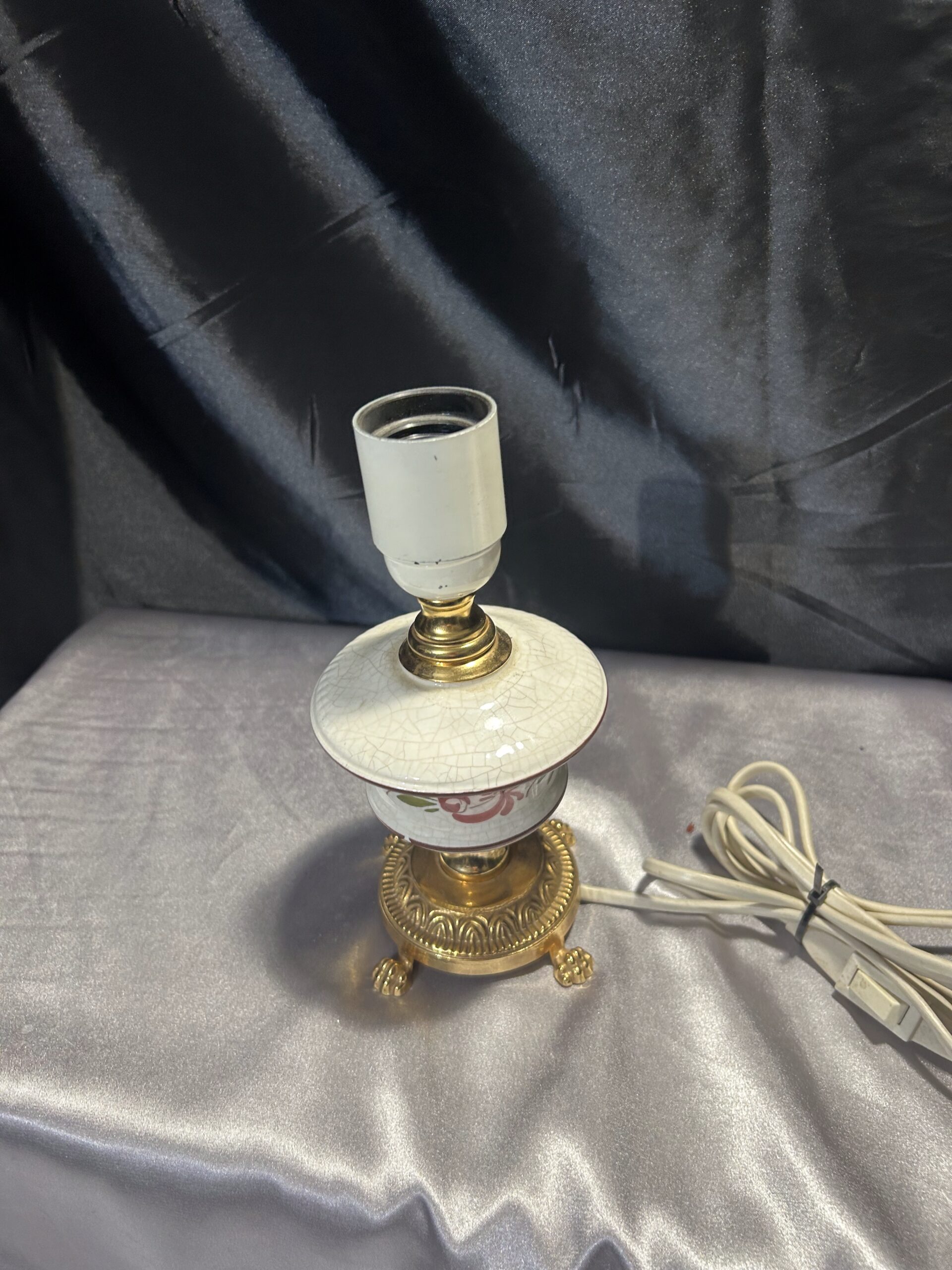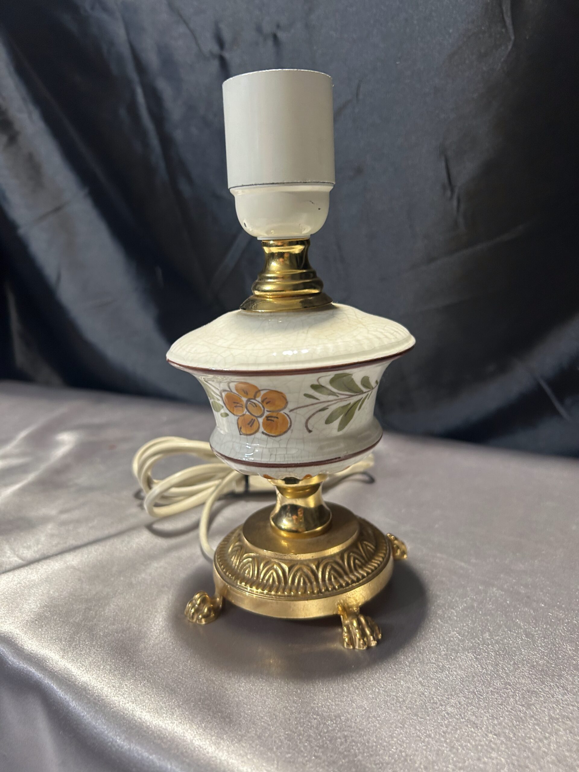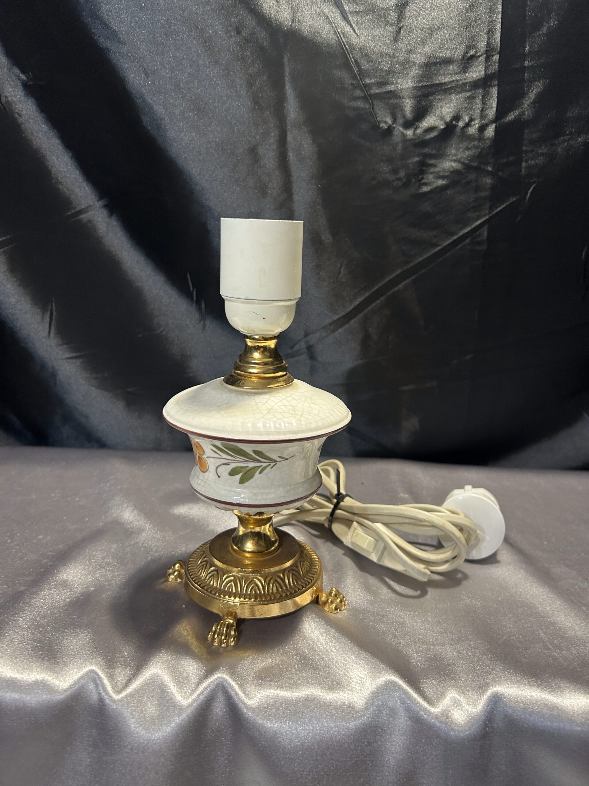 Urocza lampa stojąca wykonana z połączenia mosiądzu i ceramiki, zdobiona malowanym motywem kwiatowym na ceramicznej podstawie. Dzięki kompaktowym wymiarom i eleganckim detalom, takim jak lwie nogi, lampa świetnie sprawdzi się na komodzie, szafce lub parapecie. Włącznik na kablu zapewnia wygodę użytkowania.
