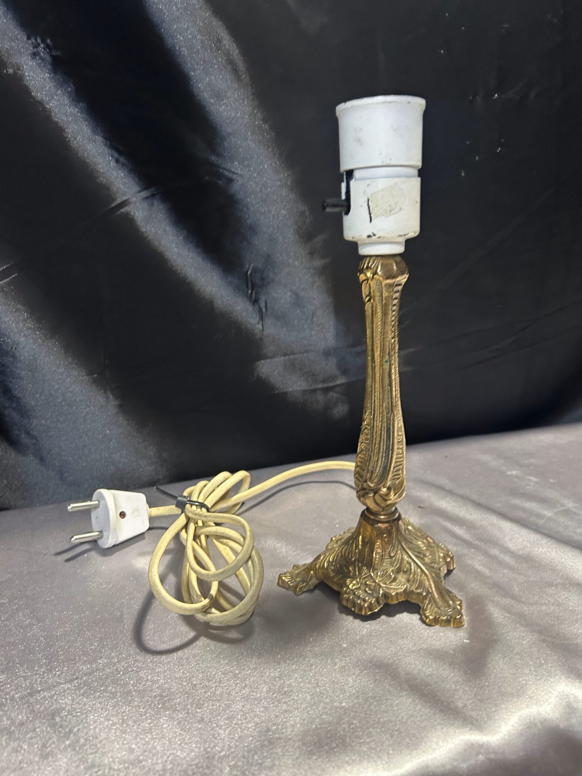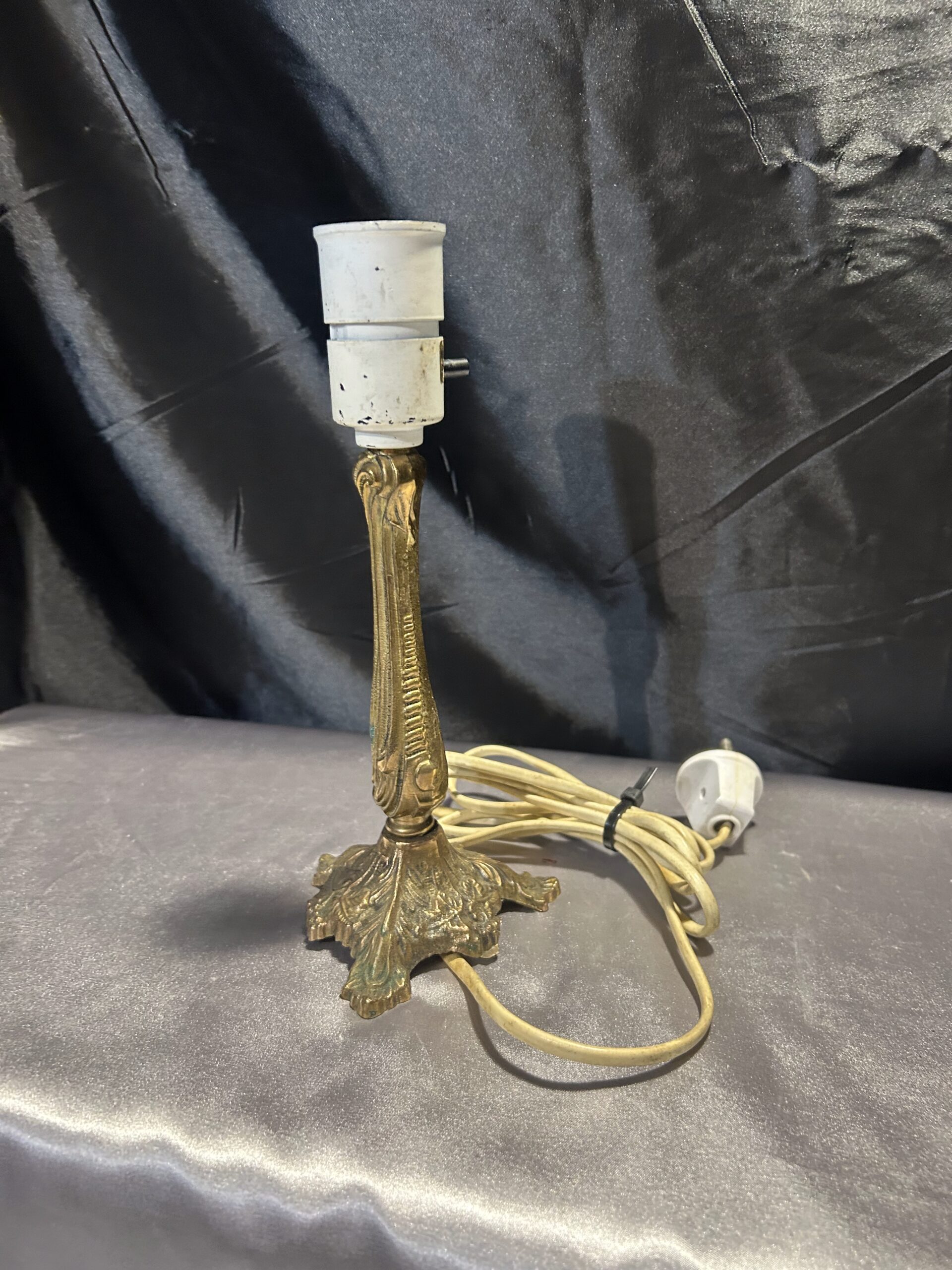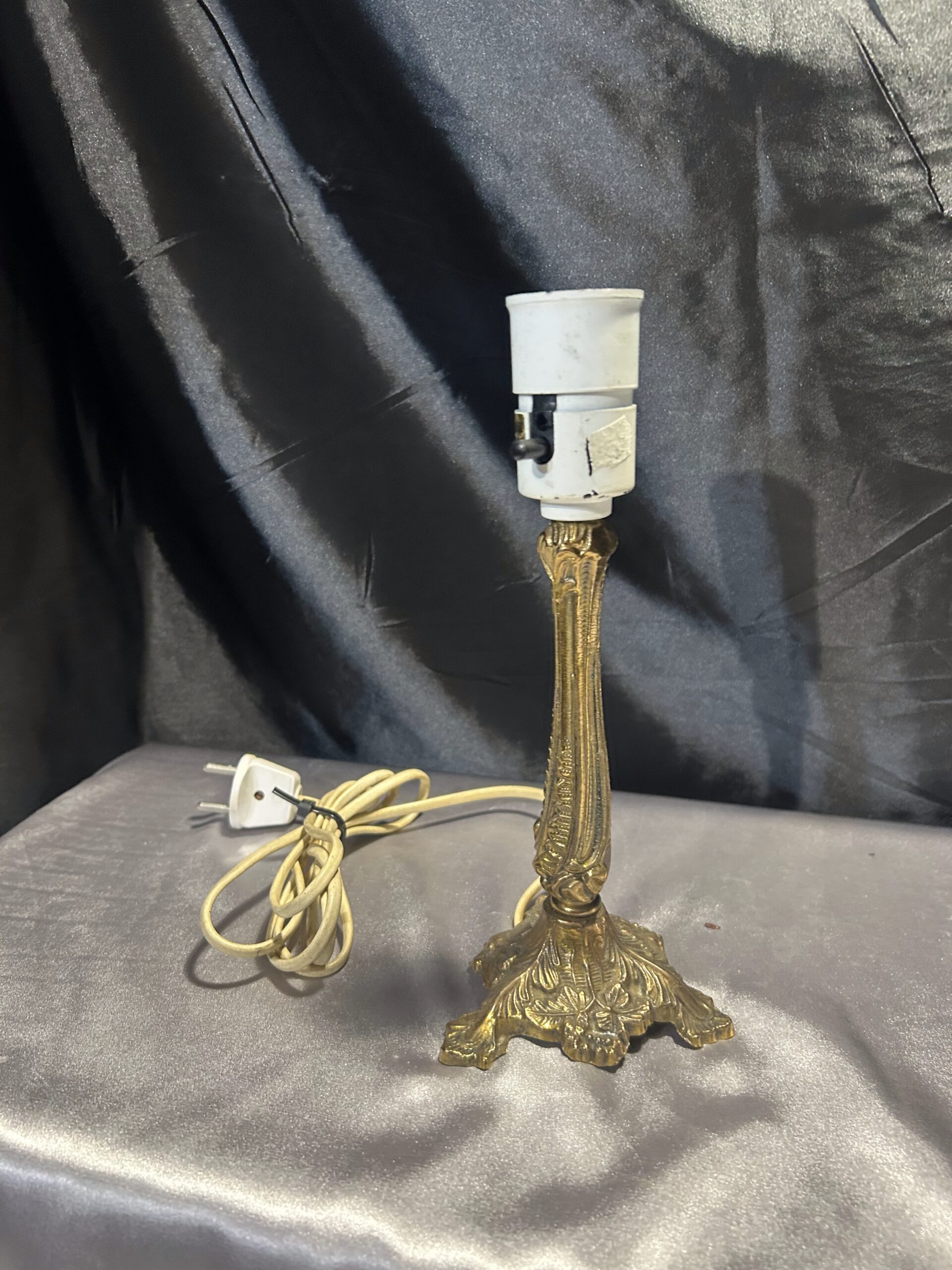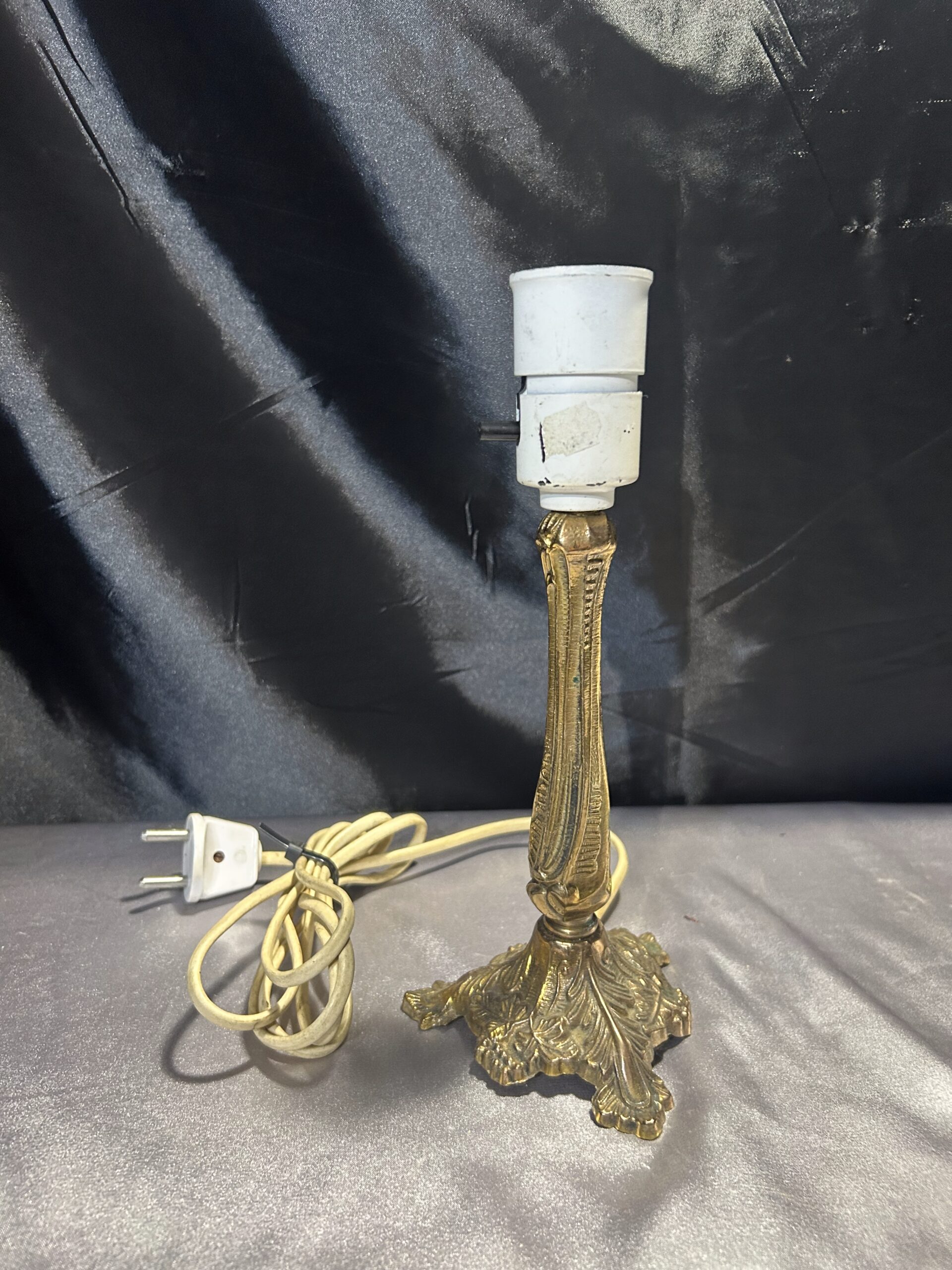 Elegancka lampa stojąca wykonana z mosiądzu, ozdobiona delikatnymi zdobieniami, które nadają jej wyjątkowy charakter. Kompaktowe wymiary oraz włącznik umieszczony na lampie czynią ją praktycznym dodatkiem do każdego wnętrza. Idealna na parapet, komodę lub szafkę.
