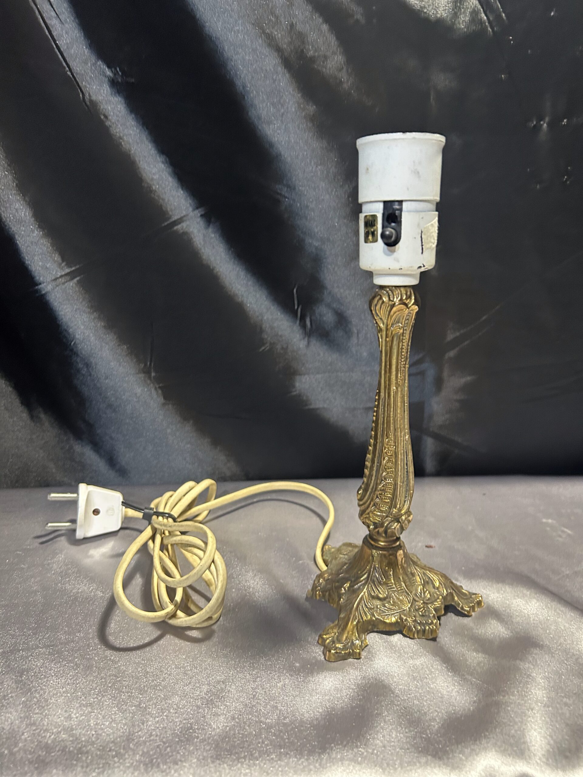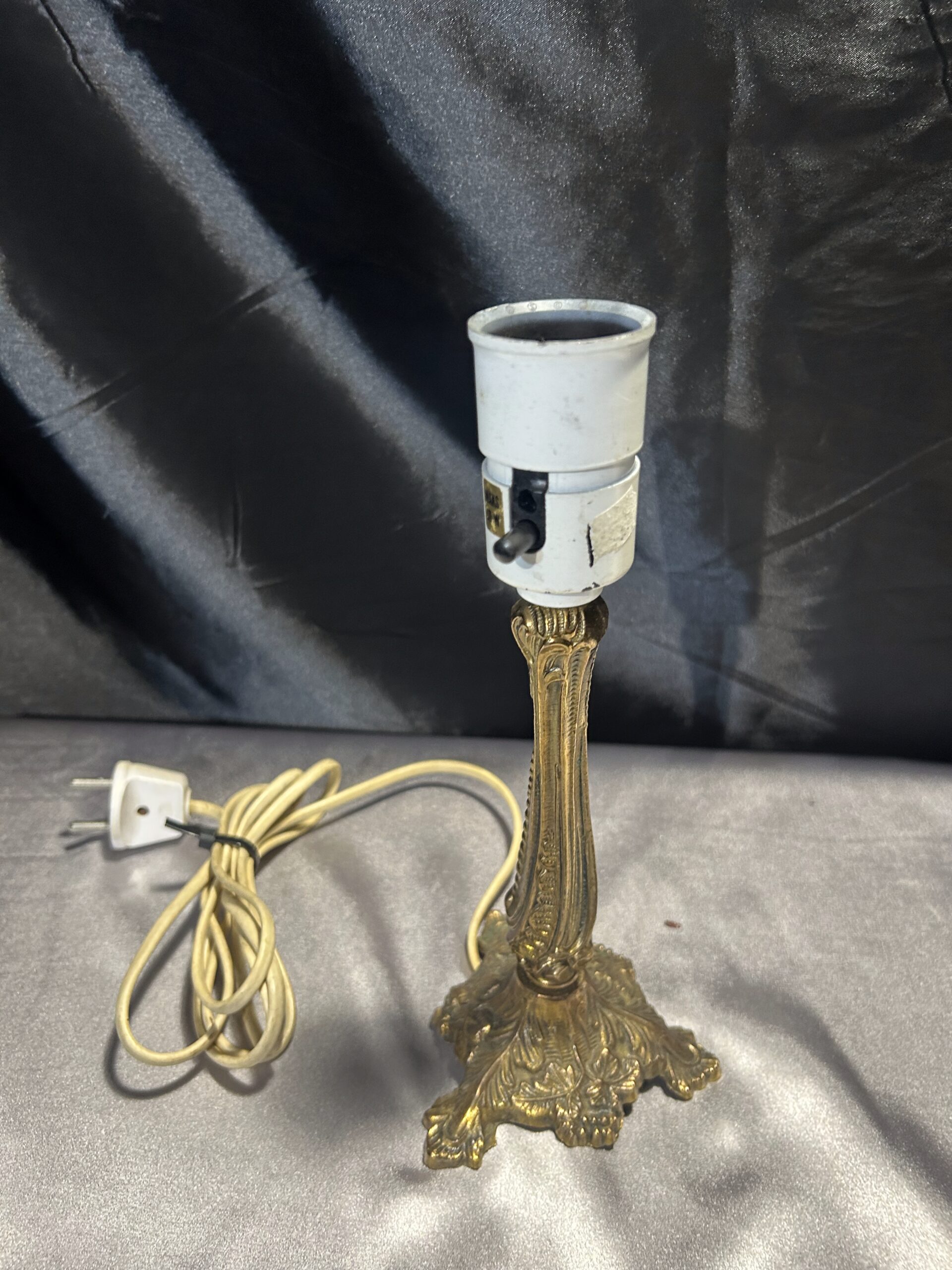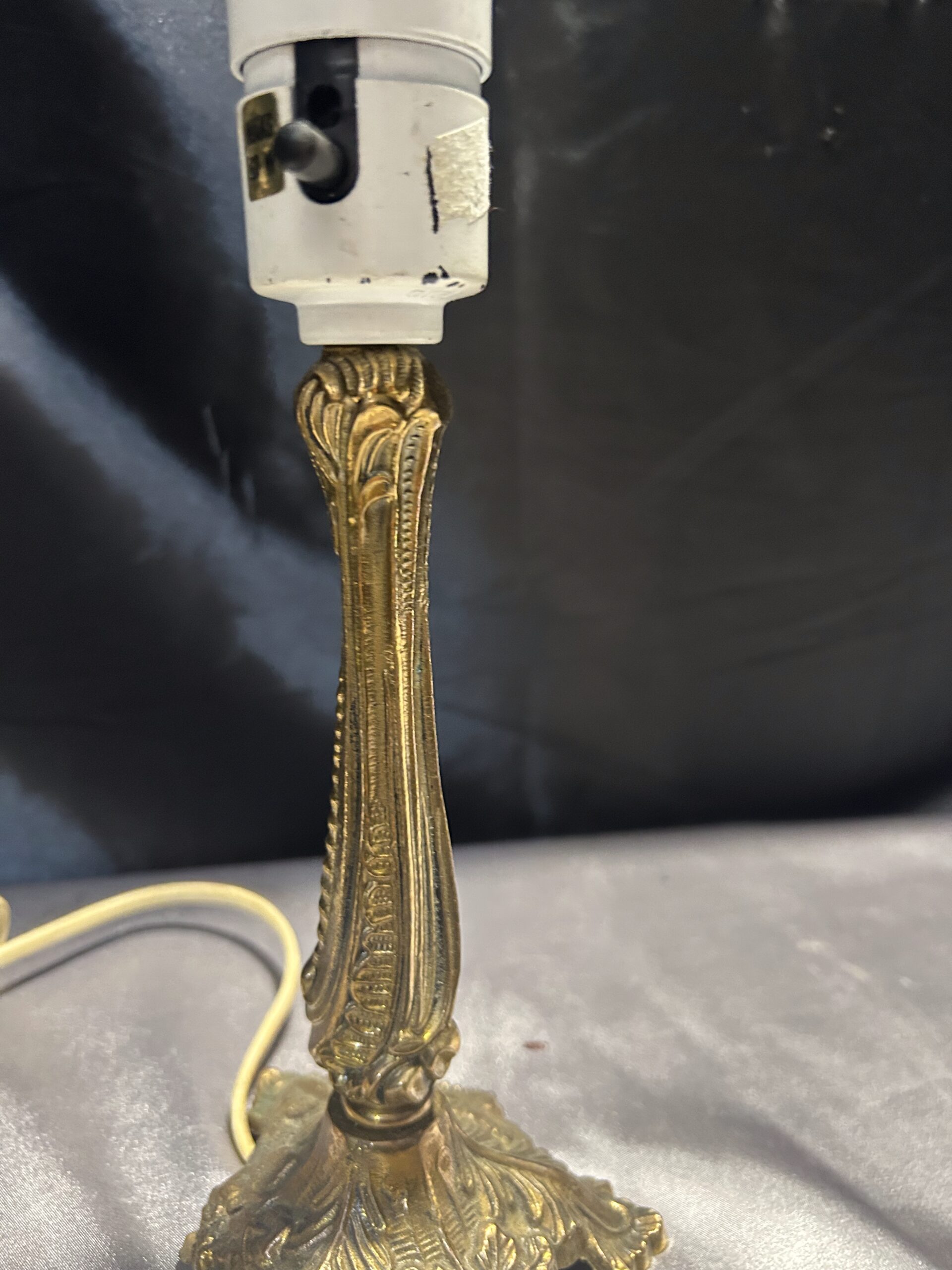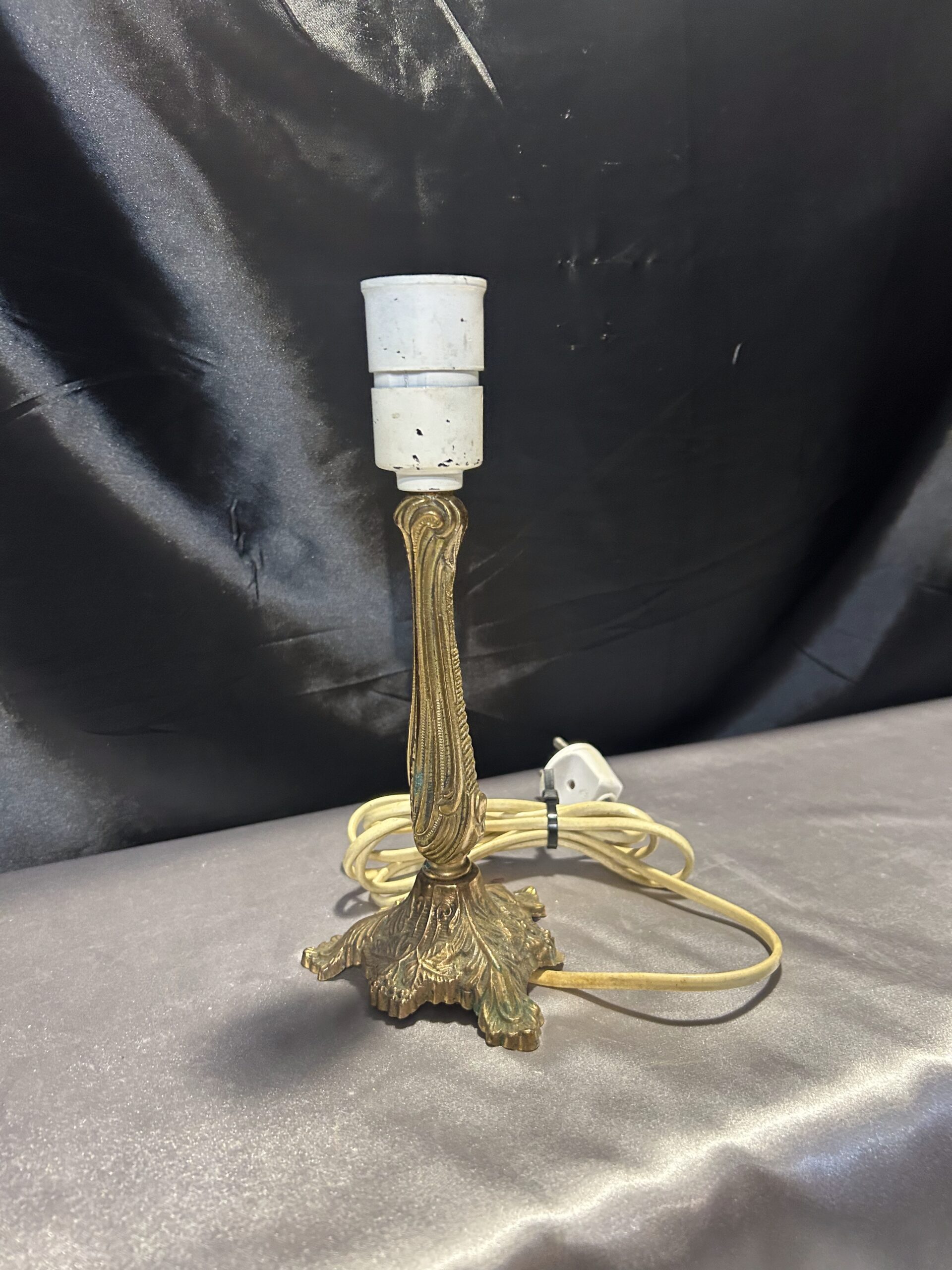 Elegancka lampa stojąca wykonana z mosiądzu, ozdobiona delikatnymi zdobieniami, które nadają jej wyjątkowy charakter. Kompaktowe wymiary oraz włącznik umieszczony na lampie czynią ją praktycznym dodatkiem do każdego wnętrza. Idealna na parapet, komodę lub szafkę.