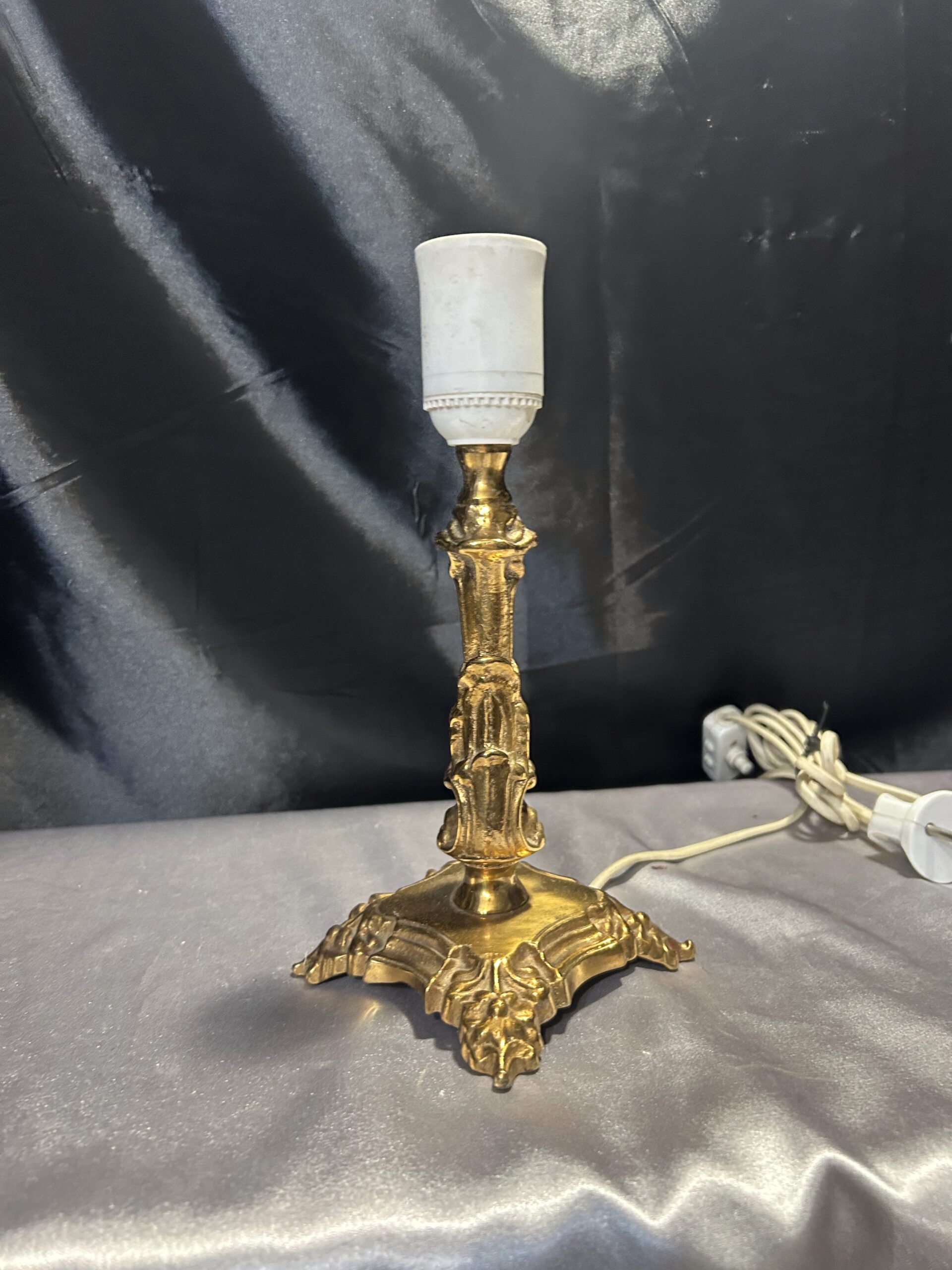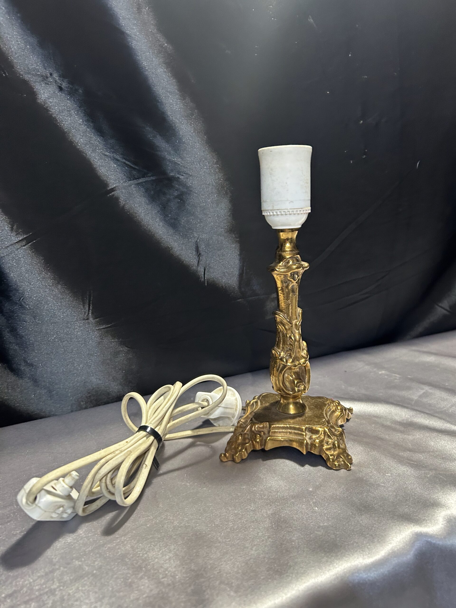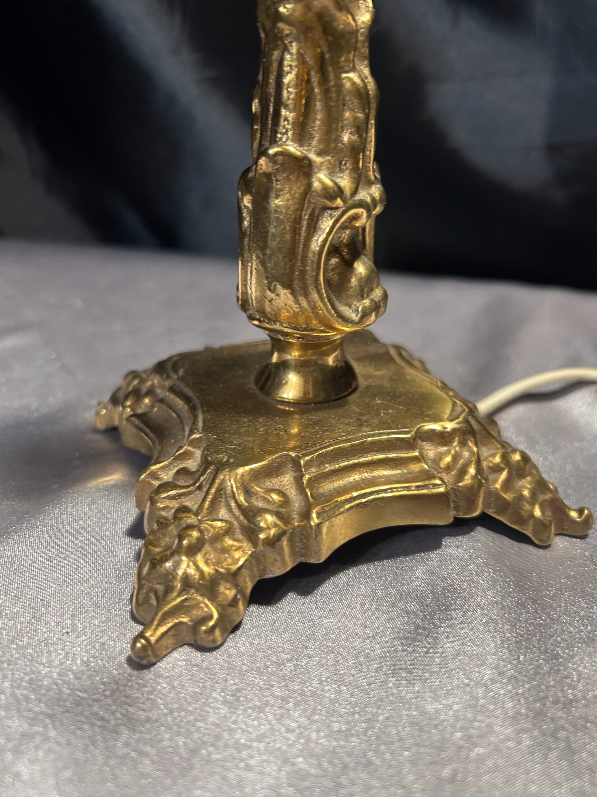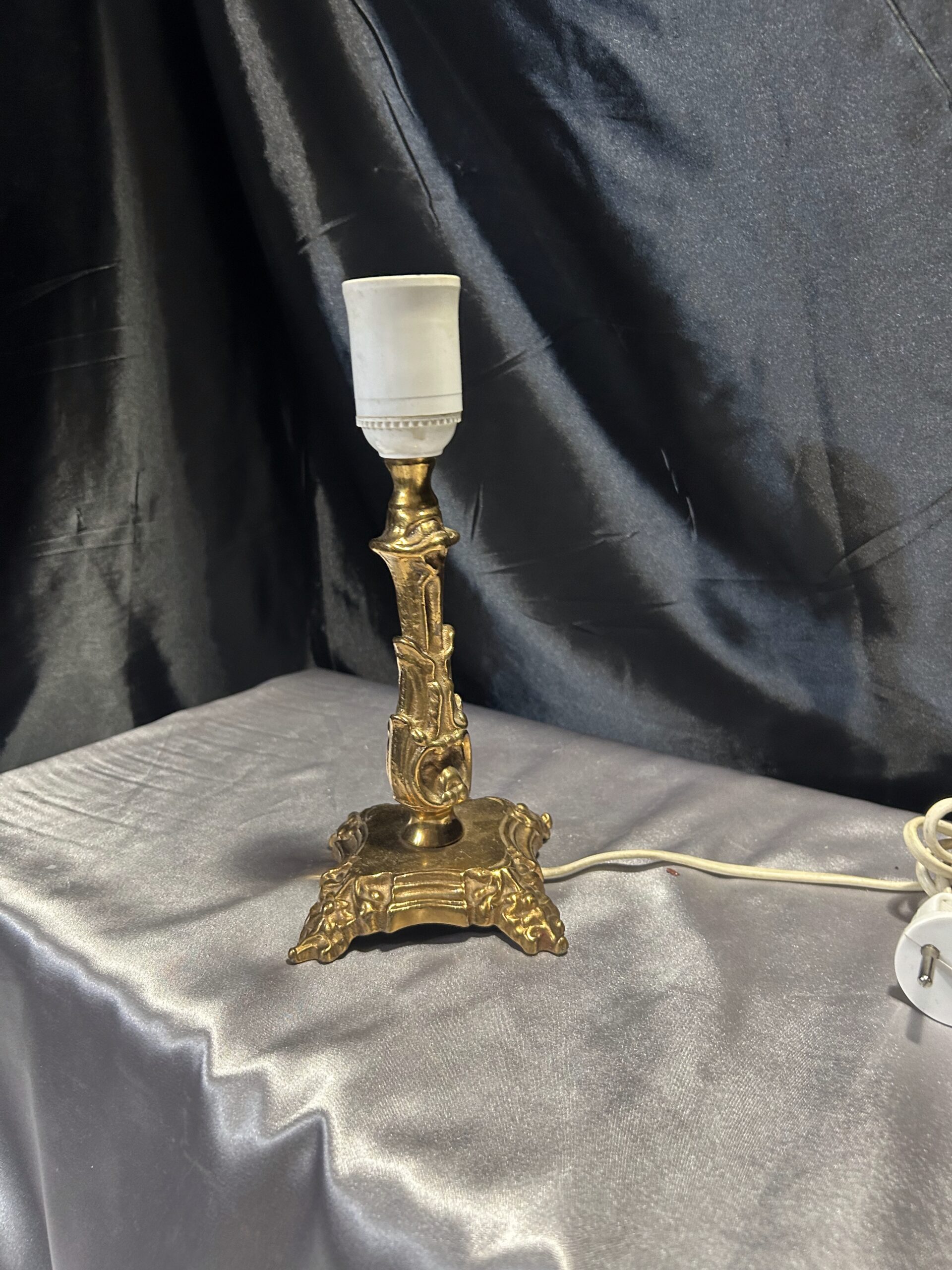 Elegancka i ciężka lampa stojąca wykonana z mosiądzu, ozdobiona subtelnymi zdobieniami, które nadają jej klasyczny charakter. Dzięki kompaktowym wymiarom i solidnej konstrukcji doskonale sprawdzi się jako funkcjonalna dekoracja na szafkę, komodę lub parapet. Wyposażona w włącznik na kablu dla wygody użytkowania.