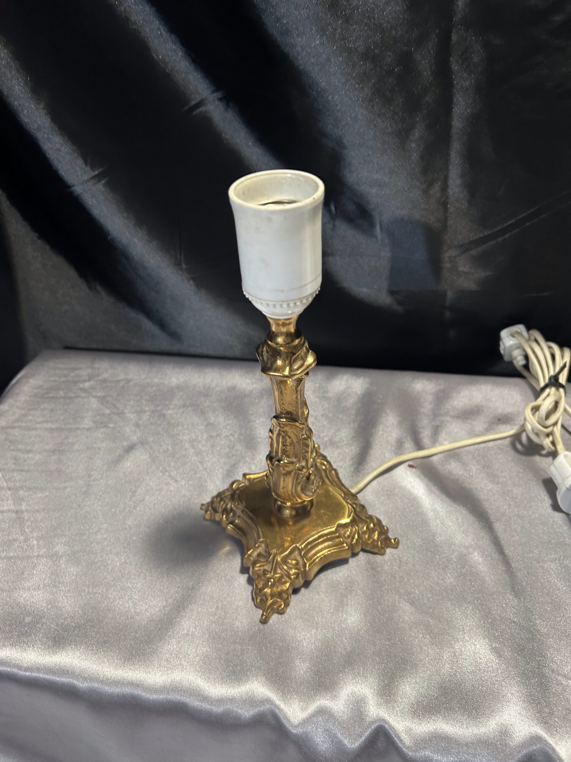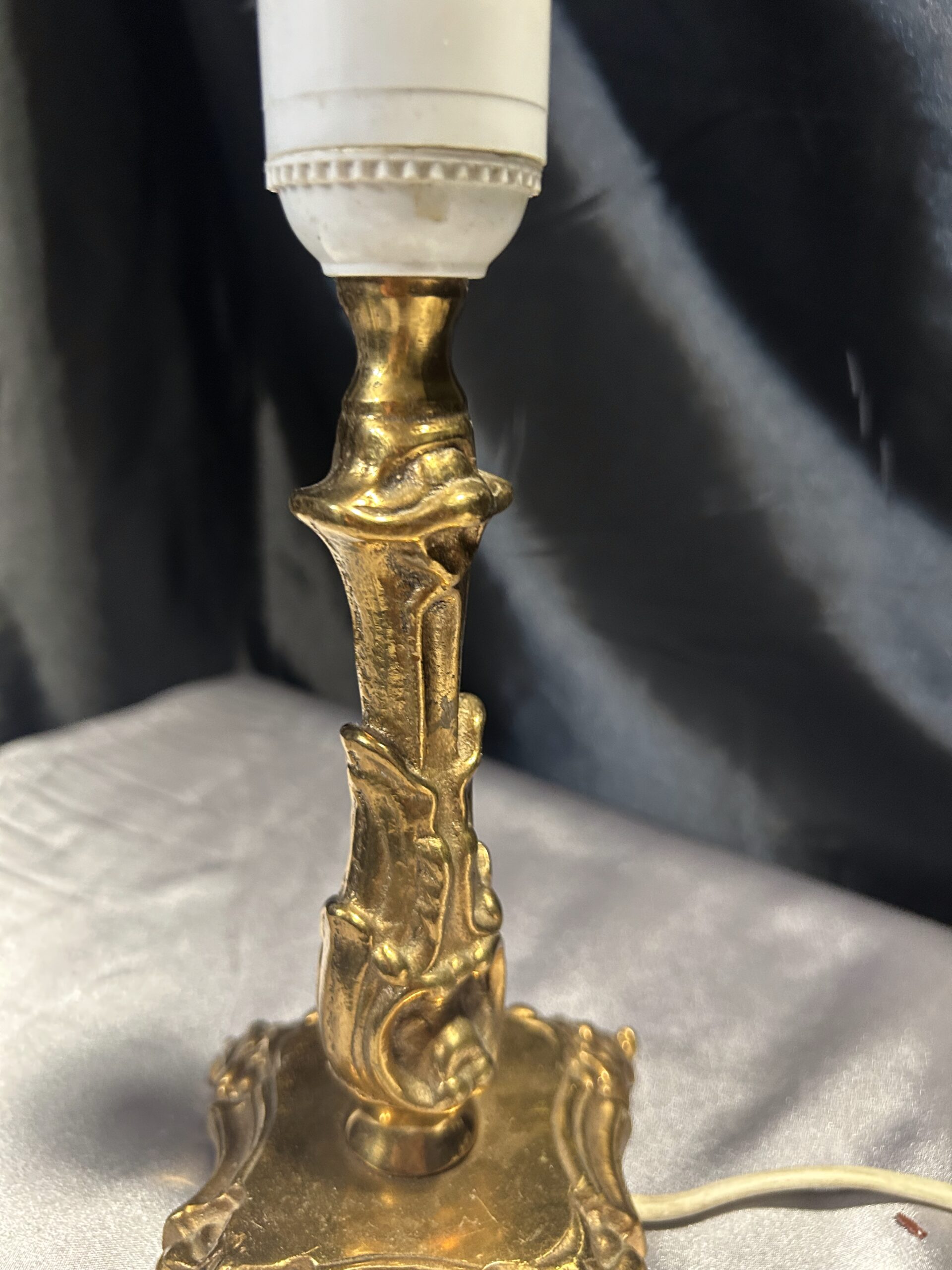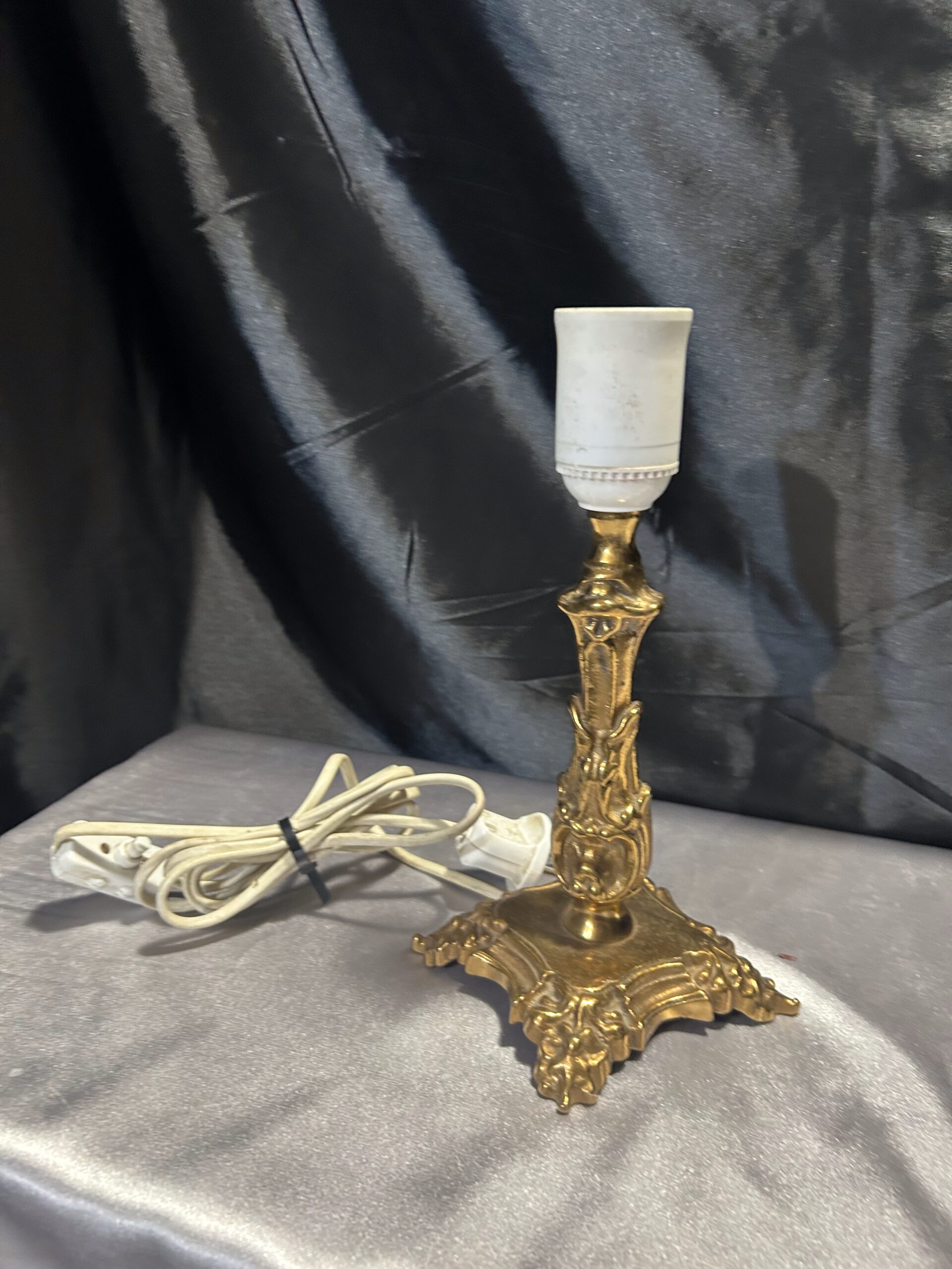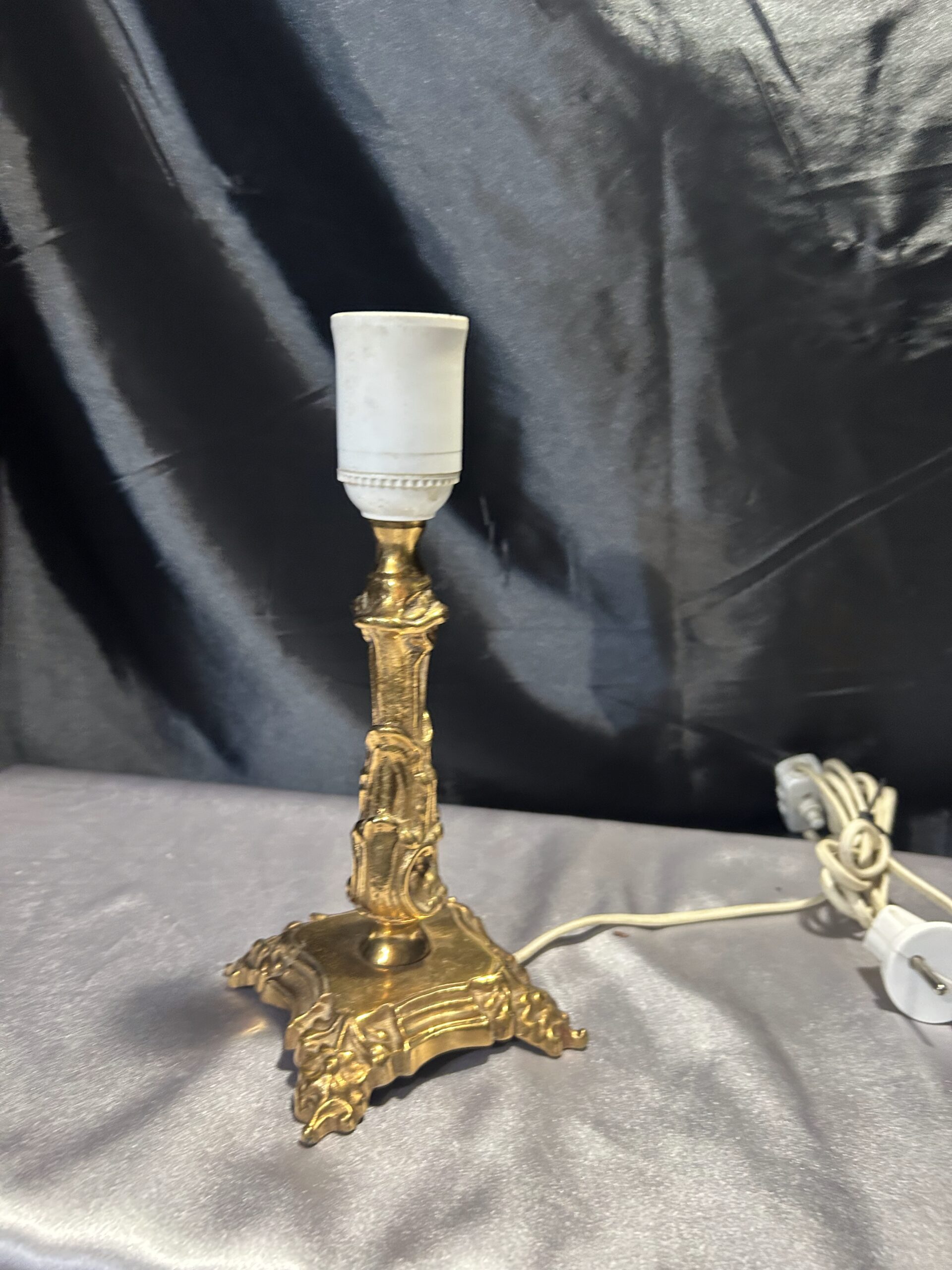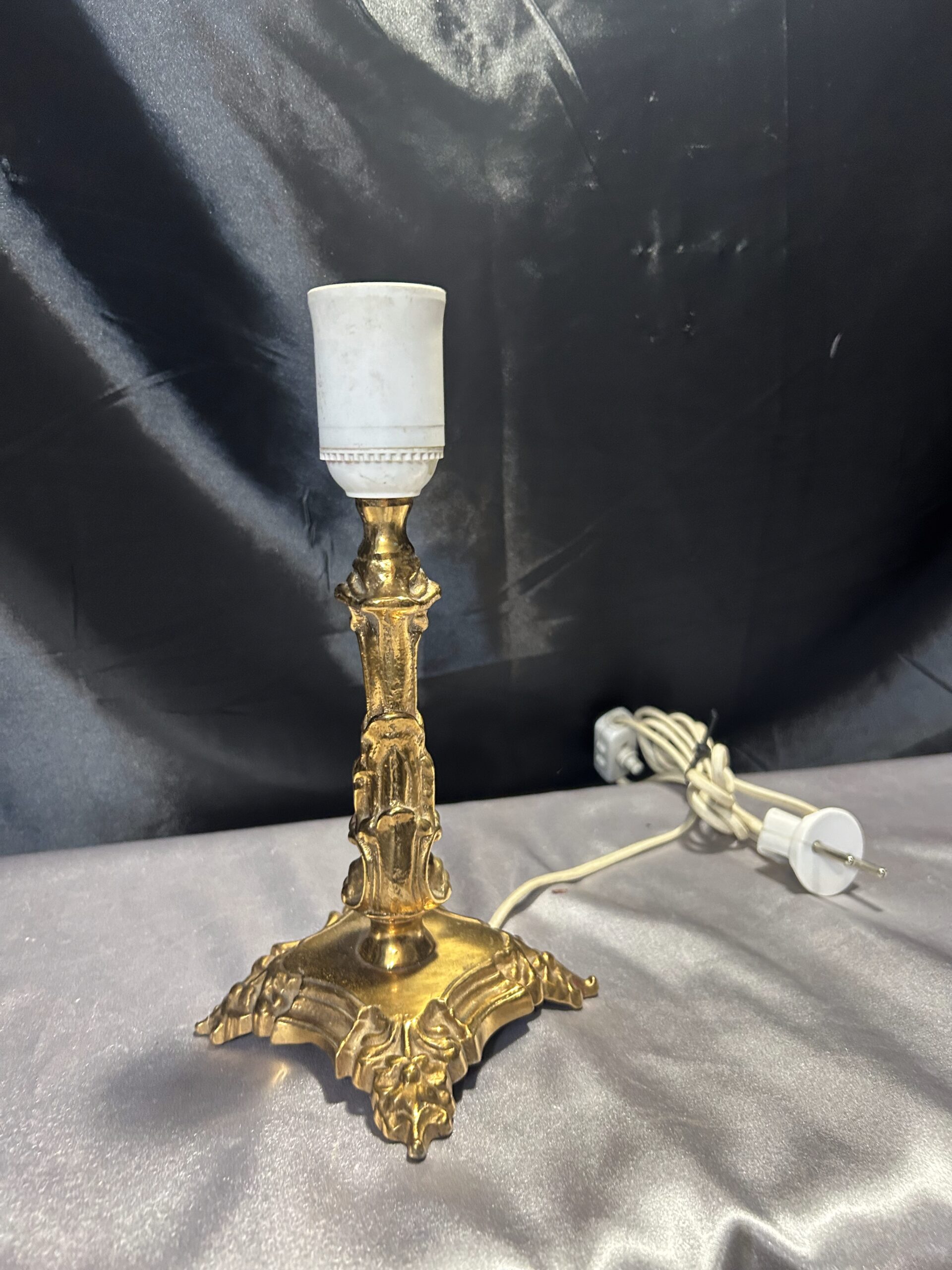 Elegancka i ciężka lampa stojąca wykonana z mosiądzu, ozdobiona subtelnymi zdobieniami, które nadają jej klasyczny charakter. Dzięki kompaktowym wymiarom i solidnej konstrukcji doskonale sprawdzi się jako funkcjonalna dekoracja na szafkę, komodę lub parapet. Wyposażona w włącznik na kablu dla wygody użytkowania.